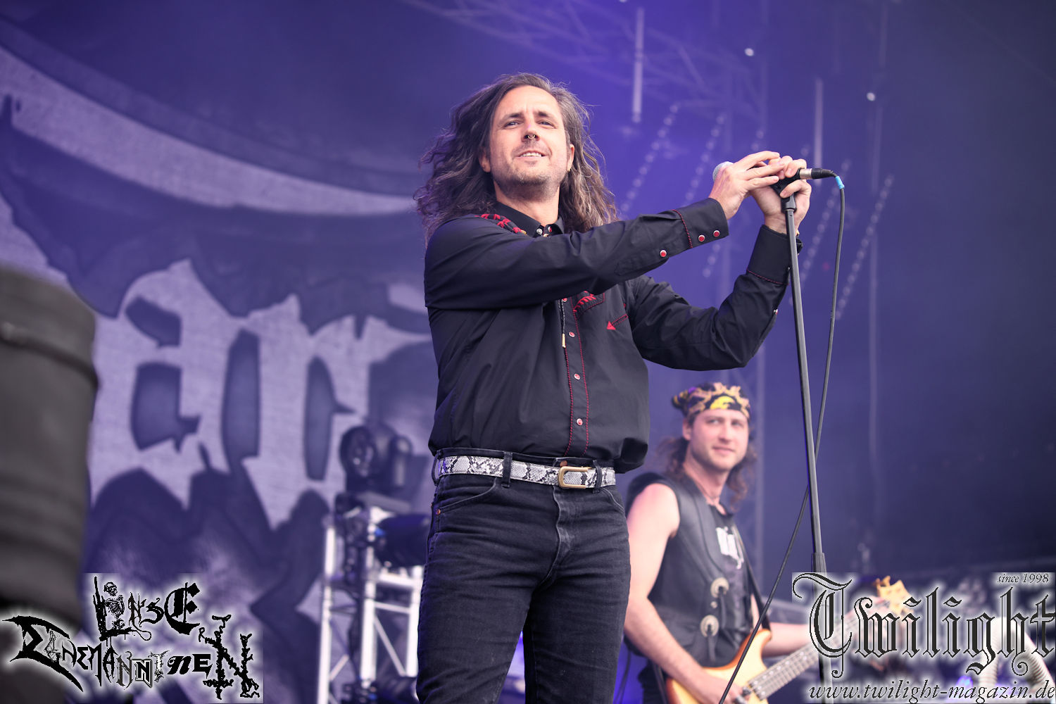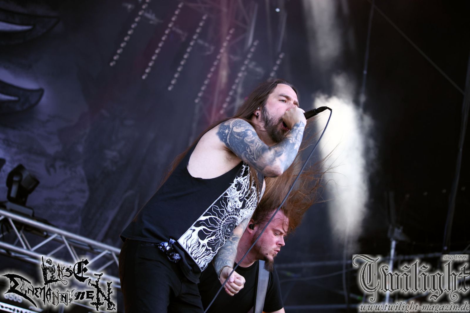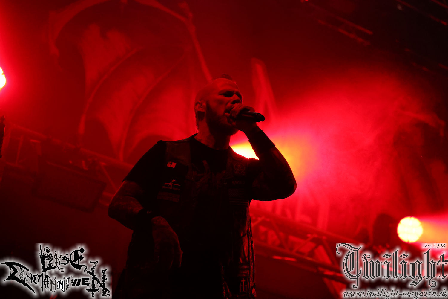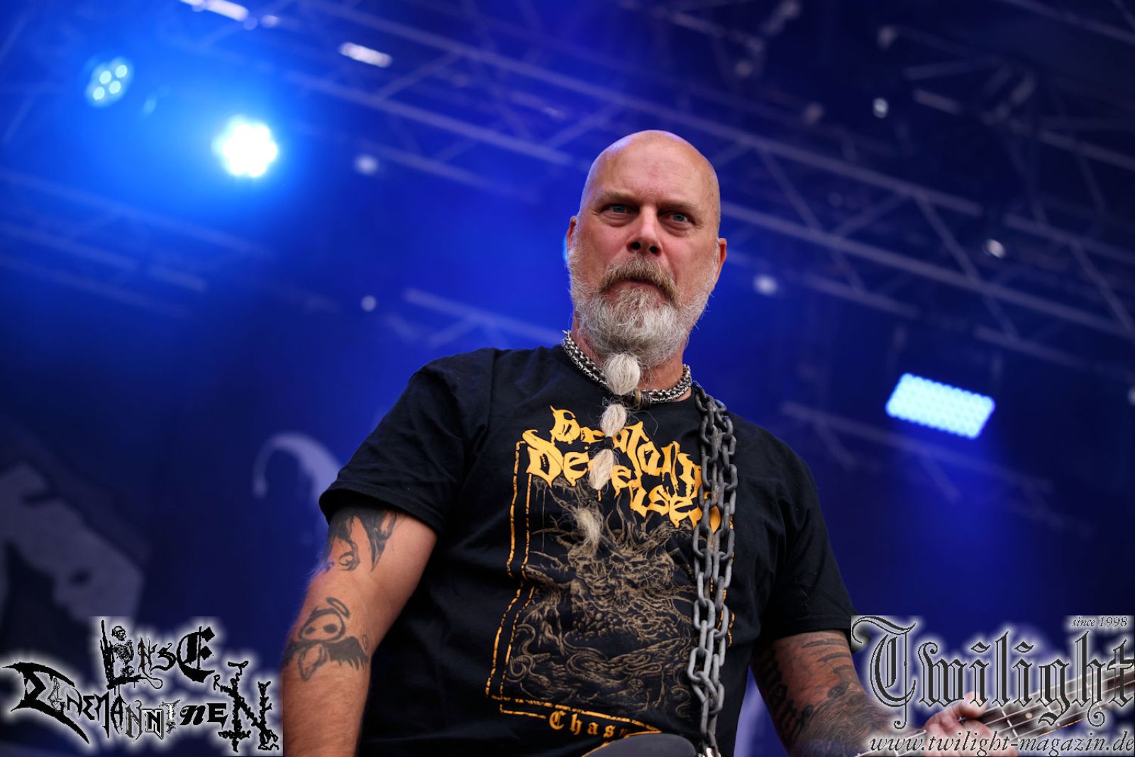 Nachdem ich mich schon die ganze Zeit tierisch darauf gefreut habe, ist es jetzt nun endlich soweit, denn die umwerfenden Night In Gales werden gleich im Zelt loslegen. Ich finde diese Melodic Death Metal - Institution ja wirklich einfach nur genial und ihr Sound ist für mich wunderbar, weshalb ich mich auch erneut mit frischem Bier in der ersten Reihe positioniert habe. Da muss ich einfach ganz vorne mit dabei sein und ich bin echt gespannt, welche Songs sie aus ihrem reichen Fundus wohl spielen werden, immerhin stehen ihnen nur 30 Minuten zur Verfügung. Mein Plan nicht ganz so betrunken zu sein, wie bei ihrem Gig zum 30. Geburtstag von Final Cry in Hannover, ist nicht so ganz aufgegangen, aber immer noch besser als das In Blackest Velvet, Night In Gales, Dew-Scented-Konzert 2001 in Salzgitter im Forellenhof, denn da kann ich mich nur noch teilweise an Dew-Scented erinnern. Egal, denn es geht endlich los und Christian (Gesang), Tobias (Bass), Adriano (Drums) und die Brüder Frank und Jens (beide Gitarre) betreten zu einem schönen Intro sichtlich motiviert die in blaues Licht und Nebel gehüllte sowie jeweils links und rechts von sehr cool aussehenden Sidedrops eingegrenzte Bühne mit dem grandiosen Bandlogo im Hintergrund und legen los. Und zwar mit „Dawnlight Garden“, dem Titelsongs ihres Albums von 2020. Knaller! Gepackt in einen wirklich sehr geilen und fetten Livesound macht sich schon beim ersten Song die große Stärke dieser Band sofort bemerkbar: Umwerfende, packende und emotional sehr mitreißende Melodien gepaart mit bestem Death Metal. Also die ursprüngliche Melo-Death-Schule, so wie ich sie liebe. Anfang der 2000er hatte sich die Band vom Sound her zwar etwas geöffnet, aber für sich festgestellt, dass nur die alte Lehre für sie Sinn macht (nachzulesen im famosen Mørkeskye – Anm. d. Verf.). Das stellen sie mit dem nun folgenden „The Spears Within“ von 2018 mächtig unter Beweis. Wie bereits erwähnt, hat die Band echt Bock, ist bewegungsfreudig und ordentlich am Bangen und Posen, dass es eine wahre Augenfreude ist. Hier wird nicht nur runtergezockt, sondern der eigene Sound erlebt und ausgelebt. Bei solch einer umwerfenden Musik, kann auch keiner unberührt bleiben und um mich herum sehe ich nur strahlende Gesichter und das Zelt ist auch so richtig gut gefüllt. Klasse, das freut mich für die Jungs wirklich sehr. Weiter geht es mit der Hymne „Into The Evergrey“ vom aktuellen Killeralbum „Shadowreaper“. Der Song ist echt sowas von geil, Leute. Als ich das erste Mal das Video sah und hörte, fühlte ich mich sofort in die 90er zurück versetzt, als ich als Teenager vor meiner Anlage saß und mich ergriffen dem Göteborg-Sound hingab. Das ist jetzt nicht anders und ich komme vor Freude gar nicht mehr aus dem Strahlen heraus. Danke dafür Jungs! Kollege Dunemann ist jetzt auch wieder mit dem Fotografieren fertig, hat sich zu mir nach vorne gesellt und mein Vornamensvetter ist ebenfalls anwesend und so feiern wir die Band jetzt gemeinsam ab. „Transition To Doom“ ist dafür auch wie gemacht. Im Rausch der Freude fordern Dunemann und ich den Klassiker „Razor“ und wir haben tatsächlich Glück und nicht nur wir sind entzückt, dass der Song jetzt kommt. Die Stimmung im Zelt kocht und das nicht nur wegen der Hitze. Und dem nicht genug, denn der nächste Klassiker wird uns um unsere Ohren gezimmert, nämlich „Autumn Water“ von „Towards The Twilight“. Wie schön und wenn Night In Gales schon in der alten Schatzkiste kramen, servieren sie uns dann auch noch „Sylphlike“! Ganz grooooßes Kino! Was für ein herrlich intensives und mitreißendes Konzert. Aber auch dieses geht leider irgendwann zu Ende und wird mit einem Klassiker beendet. Aber kein eigener, denn es gibt Iron Maiden ,mit ihrem gleichnamigen Song auf die Ohren und so gehen alle nochmal ordentlich ab und verlassen mehr als zufrieden das Zelt. Danke für dieses tolle Konzert Night In Gales! Ich bin zutiefst zufrieden. Und falls Night In Gales bei euch bisher unter dem Radar liefen und ihr Fans von mitreißenden feurigen, intensiven und von Herzblut angetriebenen Melodic Death Metal der alten Schule seid, ist diese Band für euch Pflicht!