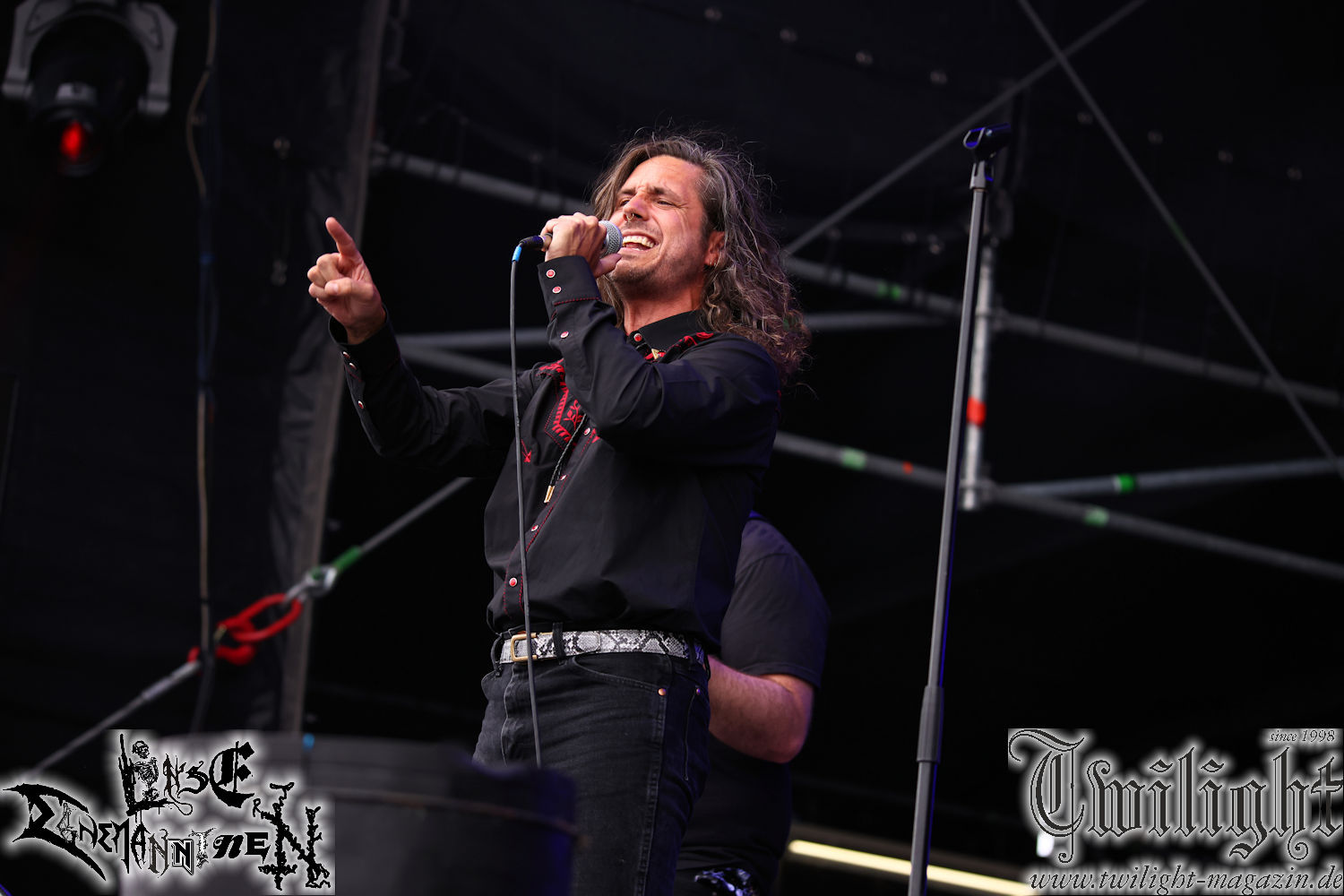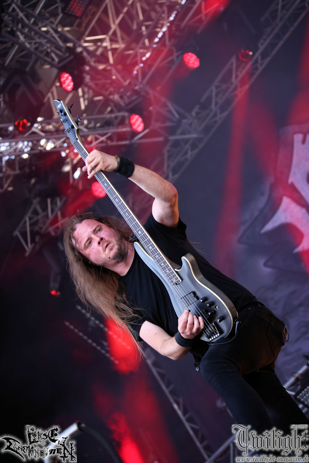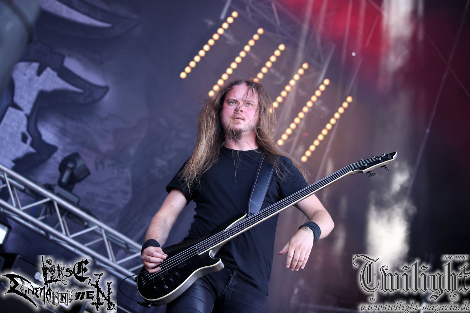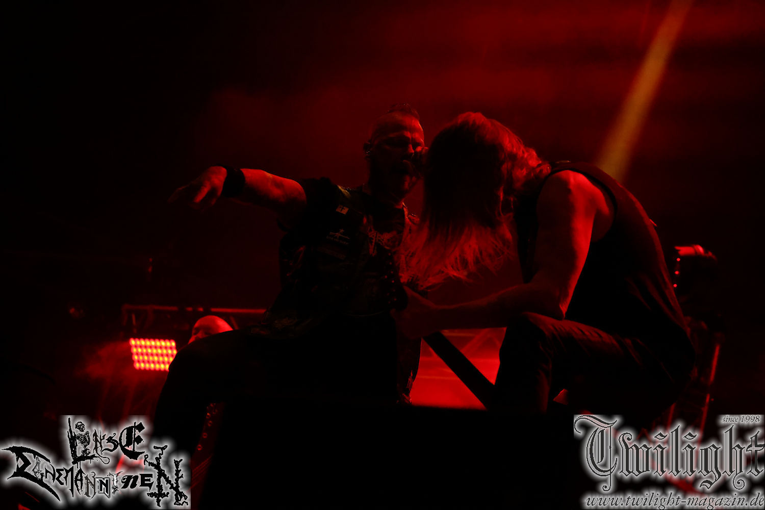 Nachdem ich mich schon die ganze Zeit tierisch darauf gefreut habe, ist es jetzt nun endlich soweit, denn die umwerfenden Night In Gales werden gleich im Zelt loslegen. Ich finde diese Melodic Death Metal - Institution ja wirklich einfach nur genial und ihr Sound ist für mich wunderbar, weshalb ich mich auch erneut mit frischem Bier in der ersten Reihe positioniert habe. Da muss ich einfach ganz vorne mit dabei sein und ich bin echt gespannt, welche Songs sie aus ihrem reichen Fundus wohl spielen werden, immerhin stehen ihnen nur 30 Minuten zur Verfügung. Mein Plan nicht ganz so betrunken zu sein, wie bei ihrem Gig zum 30. Geburtstag von Final Cry in Hannover, ist nicht so ganz aufgegangen, aber immer noch besser als das In Blackest Velvet, Night In Gales, Dew-Scented-Konzert 2001 in Salzgitter im Forellenhof, denn da kann ich mich nur noch teilweise an Dew-Scented erinnern. Egal, denn es geht endlich los und Christian (Gesang), Tobias (Bass), Adriano (Drums) und die Brüder Frank und Jens (beide Gitarre) betreten zu einem schönen Intro sichtlich motiviert die in blaues Licht und Nebel gehüllte sowie jeweils links und rechts von sehr cool aussehenden Sidedrops eingegrenzte Bühne mit dem grandiosen Bandlogo im Hintergrund und legen los. Und zwar mit „Dawnlight Garden“, dem Titelsongs ihres Albums von 2020. Knaller! Gepackt in einen wirklich sehr geilen und fetten Livesound macht sich schon beim ersten Song die große Stärke dieser Band sofort bemerkbar: Umwerfende, packende und emotional sehr mitreißende Melodien gepaart mit bestem Death Metal. Also die ursprüngliche Melo-Death-Schule, so wie ich sie liebe. Anfang der 2000er hatte sich die Band vom Sound her zwar etwas geöffnet, aber für sich festgestellt, dass nur die alte Lehre für sie Sinn macht (nachzulesen im famosen Mørkeskye – Anm. d. Verf.). Das stellen sie mit dem nun folgenden „The Spears Within“ von 2018 mächtig unter Beweis. Wie bereits erwähnt, hat die Band echt Bock, ist bewegungsfreudig und ordentlich am Bangen und Posen, dass es eine wahre Augenfreude ist. Hier wird nicht nur runtergezockt, sondern der eigene Sound erlebt und ausgelebt. Bei solch einer umwerfenden Musik, kann auch keiner unberührt bleiben und um mich herum sehe ich nur strahlende Gesichter und das Zelt ist auch so richtig gut gefüllt. Klasse, das freut mich für die Jungs wirklich sehr. Weiter geht es mit der Hymne „Into The Evergrey“ vom aktuellen Killeralbum „Shadowreaper“. Der Song ist echt sowas von geil, Leute. Als ich das erste Mal das Video sah und hörte, fühlte ich mich sofort in die 90er zurück versetzt, als ich als Teenager vor meiner Anlage saß und mich ergriffen dem Göteborg-Sound hingab. Das ist jetzt nicht anders und ich komme vor Freude gar nicht mehr aus dem Strahlen heraus. Danke dafür Jungs! Kollege Dunemann ist jetzt auch wieder mit dem Fotografieren fertig, hat sich zu mir nach vorne gesellt und mein Vornamensvetter ist ebenfalls anwesend und so feiern wir die Band jetzt gemeinsam ab. „Transition To Doom“ ist dafür auch wie gemacht. Im Rausch der Freude fordern Dunemann und ich den Klassiker „Razor“ und wir haben tatsächlich Glück und nicht nur wir sind entzückt, dass der Song jetzt kommt. Die Stimmung im Zelt kocht und das nicht nur wegen der Hitze. Und dem nicht genug, denn der nächste Klassiker wird uns um unsere Ohren gezimmert, nämlich „Autumn Water“ von „Towards The Twilight“. Wie schön und wenn Night In Gales schon in der alten Schatzkiste kramen, servieren sie uns dann auch noch „Sylphlike“! Ganz grooooßes Kino! Was für ein herrlich intensives und mitreißendes Konzert. Aber auch dieses geht leider irgendwann zu Ende und wird mit einem Klassiker beendet. Aber kein eigener, denn es gibt Iron Maiden ,mit ihrem gleichnamigen Song auf die Ohren und so gehen alle nochmal ordentlich ab und verlassen mehr als zufrieden das Zelt. Danke für dieses tolle Konzert Night In Gales! Ich bin zutiefst zufrieden. Und falls Night In Gales bei euch bisher unter dem Radar liefen und ihr Fans von mitreißenden feurigen, intensiven und von Herzblut angetriebenen Melodic Death Metal der alten Schule seid, ist diese Band für euch Pflicht!