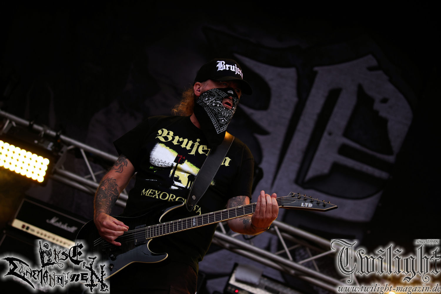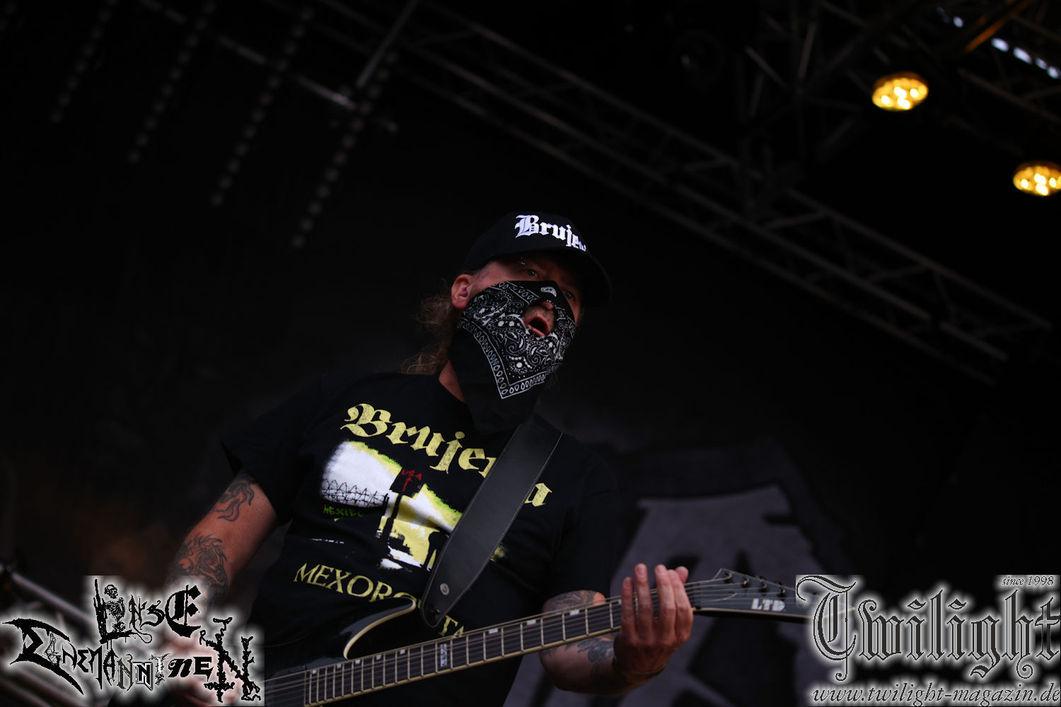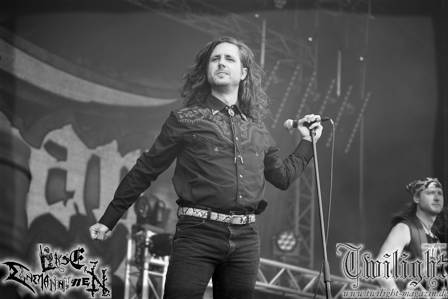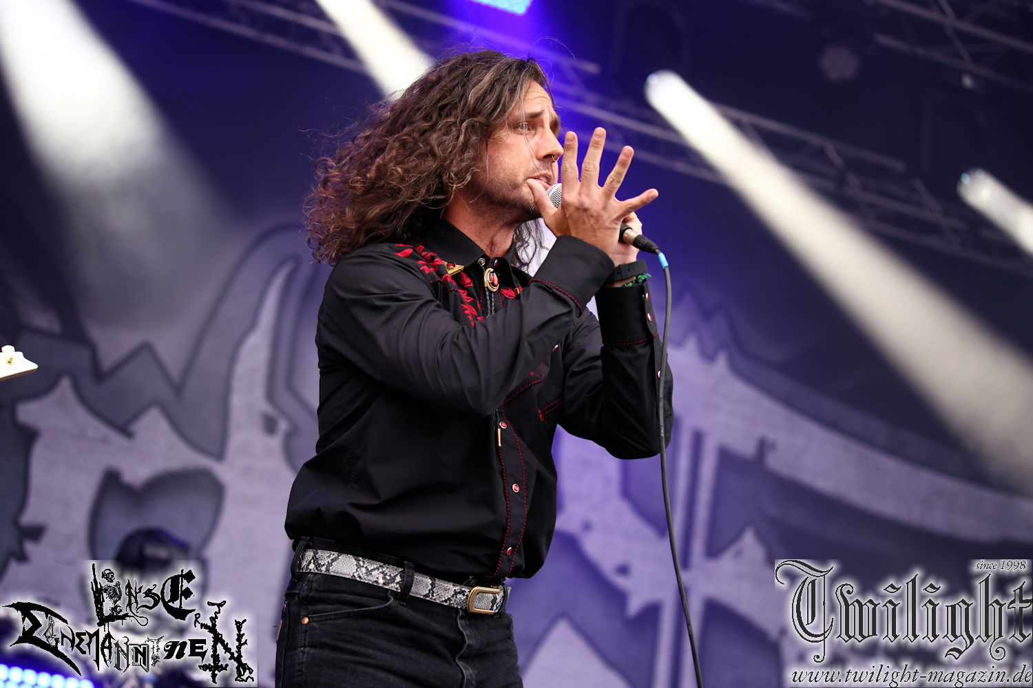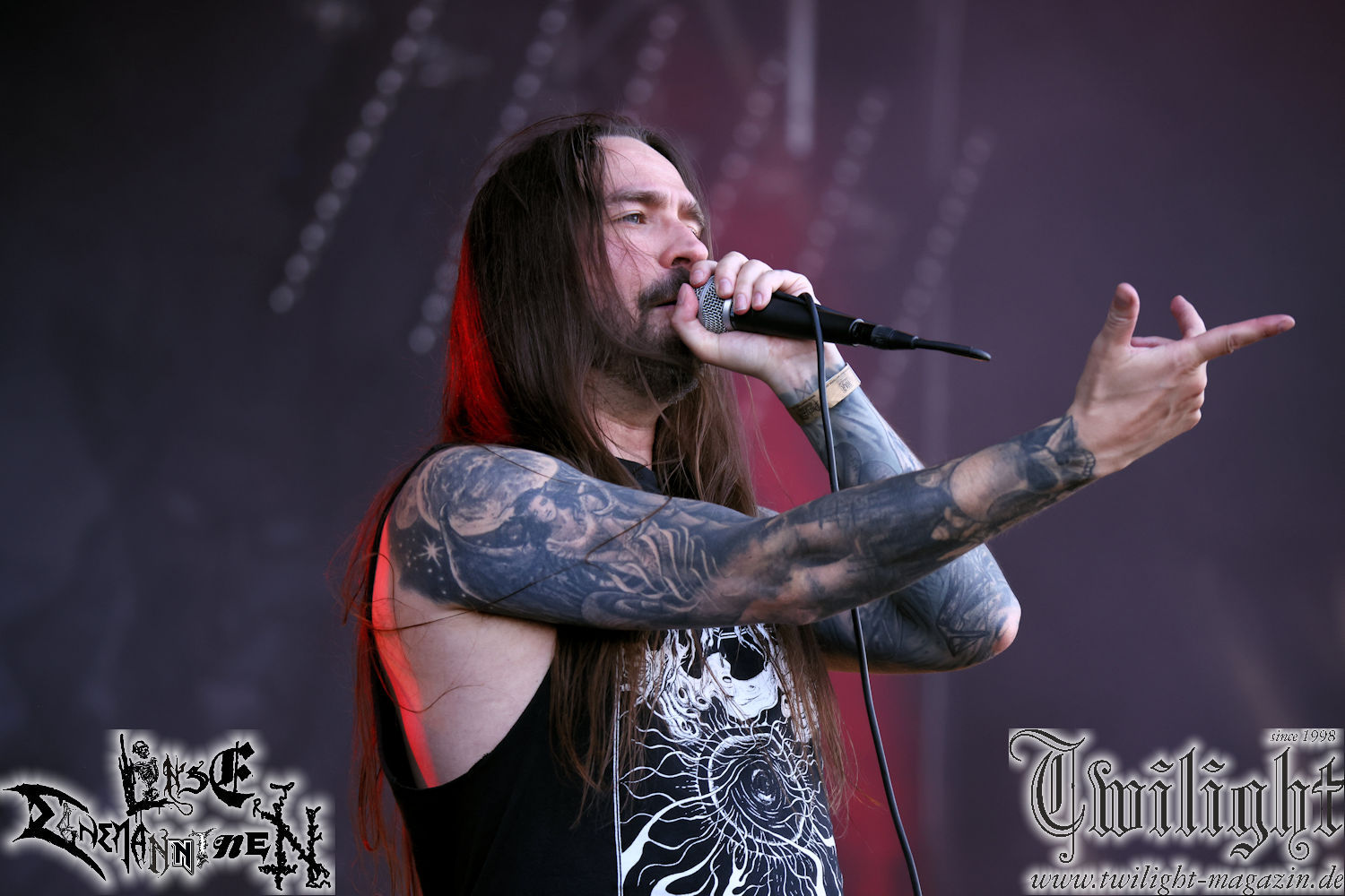 Nachdem ich mich schon die ganze Zeit tierisch darauf gefreut habe, ist es jetzt nun endlich soweit, denn die umwerfenden Night In Gales werden gleich im Zelt loslegen. Ich finde diese Melodic Death Metal - Institution ja wirklich einfach nur genial und ihr Sound ist für mich wunderbar, weshalb ich mich auch erneut mit frischem Bier in der ersten Reihe positioniert habe. Da muss ich einfach ganz vorne mit dabei sein und ich bin echt gespannt, welche Songs sie aus ihrem reichen Fundus wohl spielen werden, immerhin stehen ihnen nur 30 Minuten zur Verfügung. Mein Plan nicht ganz so betrunken zu sein, wie bei ihrem Gig zum 30. Geburtstag von Final Cry in Hannover, ist nicht so ganz aufgegangen, aber immer noch besser als das In Blackest Velvet, Night In Gales, Dew-Scented-Konzert 2001 in Salzgitter im Forellenhof, denn da kann ich mich nur noch teilweise an Dew-Scented erinnern. Egal, denn es geht endlich los und Christian (Gesang), Tobias (Bass), Adriano (Drums) und die Brüder Frank und Jens (beide Gitarre) betreten zu einem schönen Intro sichtlich motiviert die in blaues Licht und Nebel gehüllte sowie jeweils links und rechts von sehr cool aussehenden Sidedrops eingegrenzte Bühne mit dem grandiosen Bandlogo im Hintergrund und legen los. Und zwar mit „Dawnlight Garden“, dem Titelsongs ihres Albums von 2020. Knaller! Gepackt in einen wirklich sehr geilen und fetten Livesound macht sich schon beim ersten Song die große Stärke dieser Band sofort bemerkbar: Umwerfende, packende und emotional sehr mitreißende Melodien gepaart mit bestem Death Metal. Also die ursprüngliche Melo-Death-Schule, so wie ich sie liebe. Anfang der 2000er hatte sich die Band vom Sound her zwar etwas geöffnet, aber für sich festgestellt, dass nur die alte Lehre für sie Sinn macht (nachzulesen im famosen Mørkeskye – Anm. d. Verf.). Das stellen sie mit dem nun folgenden „The Spears Within“ von 2018 mächtig unter Beweis. Wie bereits erwähnt, hat die Band echt Bock, ist bewegungsfreudig und ordentlich am Bangen und Posen, dass es eine wahre Augenfreude ist. Hier wird nicht nur runtergezockt, sondern der eigene Sound erlebt und ausgelebt. Bei solch einer umwerfenden Musik, kann auch keiner unberührt bleiben und um mich herum sehe ich nur strahlende Gesichter und das Zelt ist auch so richtig gut gefüllt. Klasse, das freut mich für die Jungs wirklich sehr. Weiter geht es mit der Hymne „Into The Evergrey“ vom aktuellen Killeralbum „Shadowreaper“. Der Song ist echt sowas von geil, Leute. Als ich das erste Mal das Video sah und hörte, fühlte ich mich sofort in die 90er zurück versetzt, als ich als Teenager vor meiner Anlage saß und mich ergriffen dem Göteborg-Sound hingab. Das ist jetzt nicht anders und ich komme vor Freude gar nicht mehr aus dem Strahlen heraus. Danke dafür Jungs! Kollege Dunemann ist jetzt auch wieder mit dem Fotografieren fertig, hat sich zu mir nach vorne gesellt und mein Vornamensvetter ist ebenfalls anwesend und so feiern wir die Band jetzt gemeinsam ab. „Transition To Doom“ ist dafür auch wie gemacht. Im Rausch der Freude fordern Dunemann und ich den Klassiker „Razor“ und wir haben tatsächlich Glück und nicht nur wir sind entzückt, dass der Song jetzt kommt. Die Stimmung im Zelt kocht und das nicht nur wegen der Hitze. Und dem nicht genug, denn der nächste Klassiker wird uns um unsere Ohren gezimmert, nämlich „Autumn Water“ von „Towards The Twilight“. Wie schön und wenn Night In Gales schon in der alten Schatzkiste kramen, servieren sie uns dann auch noch „Sylphlike“! Ganz grooooßes Kino! Was für ein herrlich intensives und mitreißendes Konzert. Aber auch dieses geht leider irgendwann zu Ende und wird mit einem Klassiker beendet. Aber kein eigener, denn es gibt Iron Maiden ,mit ihrem gleichnamigen Song auf die Ohren und so gehen alle nochmal ordentlich ab und verlassen mehr als zufrieden das Zelt. Danke für dieses tolle Konzert Night In Gales! Ich bin zutiefst zufrieden. Und falls Night In Gales bei euch bisher unter dem Radar liefen und ihr Fans von mitreißenden feurigen, intensiven und von Herzblut angetriebenen Melodic Death Metal der alten Schule seid, ist diese Band für euch Pflicht!