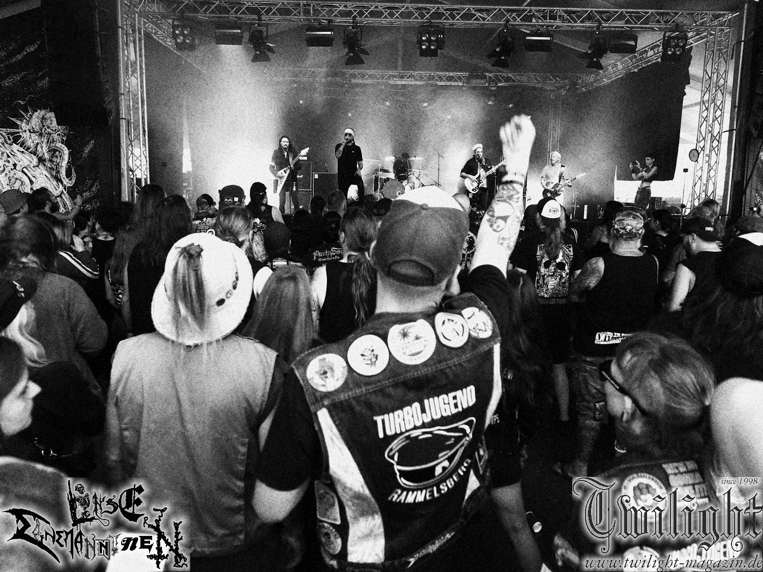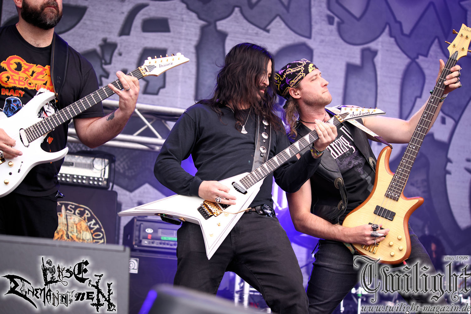 Und nun kommen wir zu einem Konzert, auf das ich mich schon seit dem letzten Party.San freue, als ich las, dass sie dieses Jahr hier spielen. Die Rede ist von den wirklich umwerfenden Death Metallern Nightbearer, die ich ja schon seit Jahren abfeiere, deren Scheiben regelmäßig bei mir laufen und die mit ihrem aktuellen Longplayer „Defiance“ wirklich ein absolutes Meisterwerk abgeliefert haben. Deswegen darf ich natürlich keinen Moment davon im Zelt verpassen. Da sind die angestaute Hitze und die verbrauchte Luft im Zelt nicht von Relevanz und so stehe ich nun mit zwei frisch gezapften Köstritzer, welches mir die immer nette und freundliche Thekencrew (muss ja auch mal erwähnt werden) soeben kredenzte, in der ersten Reihe und freue mich auf das was nun kommen wird, denn ich habe Nightbearer tatsächlich noch nie live gesehen. Mit den Klängen zu „Dust“ betreten Michael Torka (Gesang), Dominik Hellmuth (Leadgitarre), Manuel Lüke (Drums), Florian Böhmfeld (Bass) und Tristan Schubert (Rhythmusgitarre) in blauem Licht gehüllt die Bühne und was dann kommt übertrifft meine kühnsten Erwartungen, denn die kommende halbe Stunde wird einfach nur ein Traum. Ausgestattet mit einem umwerfenden und schön differenzierten Sound reißt die Band sehr präzise eine Lehrstunde im Fach klassischer Old School Death Metal der schwedischen Art und grandiosen Melodien ab, denn nach dem Intro geht es auch gleich wie auf „Defiance“ mit dem umwerfenden „His Dark Materials“ weiter und es ist einfach nur herrlich, das live erleben zu dürfen. Gerade das abschließende Solo mit Blind Guardian-mäßiger Melodie ist einfach nur Gänsehaut pur. Es ist der Band auch eindeutig anzumerken, dass das nicht ihr erstes Konzert ist und so legen sie all ihre Erfahrungen in diesen Gig, denn sie wissen genau, dass das gerade IHR Moment ist, und geben wirklich alles und ich spüre diese Euphorie und Energie eindeutig, lasse mich von ihr anstecken und genieße wirklich jeden Moment dieses absolut grandioses Konzertes. Da stört auch die heftige Hitze und die stickige Luft im Zelt zu keinem Moment. Hier regiert der Death Metal der alten Schule in allerhöchster Qualität, was ich mit akkuratem Abgehen liebend gerne unterstütze. Die Jungs haben echt Bock, bewegen sich ordentlich auf der Bühne und lassen ihre Nackenwirbel gut rotieren. Sowas mag ich ja, wenn die Band nicht nur rumsteht und ihr Set runterzieht, sondern in ihrer Musik aufgeht und auch selber Bock hat, ordentlich abzugehen. Die Euphorie ist auch in Michas Ansagen zu spüren und so führt er uns gut gelaunt durch das Konzert. Als nächstes steht „The Dragon Reborn“ vom Zweitling „Ghosts Of A Darkness To Come“ an der Reihe. Noch so ein geiler Song. Ich komme aus dem Grinsen gar nicht mehr heraus. Zwischendurch drehe ich mich immer wieder mal um und sehe nur strahlende Gesichter in einem zum bersten gefüllten Zelt! Der Hammer und wirklich absolut verdient, denn Nightbearer sind Herzblut pur. Ein breites Grinsen ist auch der Band ins Gesicht gezimmert, die überwältigt von unserer Resonanz sichtlich ergriffen ist. „Lycanthrophic Death Squad“, der Hit des ersten Longplayers „Tales Of Sorcery And Death“ folgen als nächstes und bei diesem Groovemonster gibt es wirklich kein Halten mehr. Killer! Richtig gelungen finde ich auch die Lightshow während des gesamten Konzerts, die die Stimmung toll untermalt und von den Farben her, meiner Meinung nach die dominanten Farbtöne der Artworks ihrer drei Longplayer nutzt. Sieht echt cool aus. Wenn wir schon beim Debüt sind, geht es mit dessen Opener „Beware The Necromancer“ auch gleich weiter. Mittlerweile hat mein Kumpel Dunemann seine Bilder gemacht und sich mit einer lecker Gerstensaftkaltschale zu mir gesellt. Sehr schön, denn mit guten Freunden macht das Abgehen doch am meisten Spaß. Gerade wenn es sich um so geilen Todesblei wie den von Nightbearer handelt. Meine Freude ist wahrlich riesengroß. Was für ein tolles Konzert. Welches ja leider viel zu kurz ist und so wird mit „Dying Knows No Bound“ vom aktuellen Album der leider schon vorletzte Song angekündigt. Wehmut ist hier aber fehl am Platze, denn es heißt bei diesem Brett nochmal die letzten Kraftreserven zu aktivieren. Mittlerweile bestehen meine Klamotten glaube ich auch nur noch aus Schweiß statt aus Stoff! Aber was muss, das muss! Was gibt es besseres, als ein grandioses Konzert mit dem Titelsong des aktuellen Monsteralbums abzuschließen und so wird mit „Defiance“ wirklich nochmal alles in mir motiviert und nach den letzten Tönen des Songs stehe ich einfach nur baff und völlig euphorisiert vor der Bühne und hoffe, dass ich Nightbearer bald mal wieder live sehen kann. Das wäre der Hammer! Zum Schluss gibt es noch eine Gruppenphoto mit allen Fans und so werden wir sehr glücklich in die glühende Sonne entlassen.