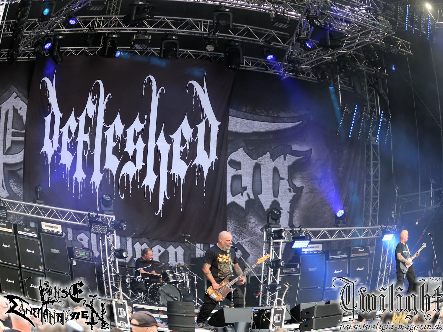 Also schnell noch ein neues Köstritzer auf die Hand als Macbeth fertig sind und rüber zur Hauptbühne, um mir eine Runde erstklassigen Death Metal zu gönnen. Diese Idee hatten nicht gerade wenige und so ist es kurz nach 12:00 schon gut gefüllt. Natürlich lassen es sich die todesbleiernen Kollegen aus Ostwestfalen-Lippe nicht nehmen, ihren Kumpels Tobias (Gitarre), Felix (Gitarre), Niklas (Bass), Moritz (Drums) und Thorsten (Gesang) bei ihrer großen Sause zu zuschauen und so treffe ich auch gleich auf Leute von Wilt und Evoked, zu denen ich mich gerne geselle. Vor drei Jahren spielten Scalpture auf dem Party.San noch im Zelt und nun haben sie die Ehre am Samstag die Hauptbühne zu eröffnen. Nicht nur dass sie dieses Jahr ein sehr beeindruckendes neues Album veröffentlichten, sie haben seit „Feldwärts“ exzessiv in vielen Clubs gespielt haben und wie ich in Göttingen beim Gig mit Carnal Tomb und Purgatory feststellen konnte, ihre Performance nochmal sehr gesteigert. Und was in einem kleinen, schwitzigen Club funktioniert, klappt im Falle dieser Band auch auf einer großen Bühne und zeigt abermals das Potenzial, das in ihr steckt. Versorgt mit einem wirklich tollen und fetten Livesound, der alle Beteiligten top zur Geltung bringt, haben Scalpture wirklich Bock, das Ding zu rocken, denn so eine Möglichkeit ergibt sich ja auch nicht alle Tage. Besonders wenn du selber Fan des Festivals bist. Dementsprechend hochmotiviert zimmern uns die Herren ihren, in der alten Schule wurzelnden, aber nicht mehr alleine darauf festzulegenden Death Metal um unsere Ohren, dass es eine wahre Freude ist. Stillstehen kann ich dabei auf alle Fälle nicht! Scalpture zeigen sich auch sichtlich begeistert, dass die hungrige Meute ihren Sound zu so einer frühen Zeit schon so wohlwollend aufsaugt. Das ist bei den Songs auch kein Wunder. Es wird uns ein Querschnitt ihres bisherigen Schaffens mit Hauptaugenmerk auf den letzten beiden Scheiben geliefert, der es in sich hat. Was kann bei Songs, wie z.B. „Hinterlandsymphonie“, „Schwedentrunk“, „Til Jeret Undergang“ (mit englischer Ansage gegen Krieg und Unterdrückung, damit es auch alles verstehen können) auch schon schief laufen. Was mir neulich schon in Göttingen im kuscheligen Freihafen auffiel, wird auf der großen Bühne, wo die Mitglieder weiter auseinander stehen, noch deutlicher: die Band ist in sich eine absolut verschmolzene, perfekt aufeinander abgestimmte Einheit. Das zeigt sich nicht nur musikalisch, sondern auch optisch. Sehr geile Sache. Es macht auch echt Bock zu sehen, wie Scalpture während der Songs absolut in diese eintauchen, nur um danach freudestrahlend wieder im Hier zu sein, um ihren Moment zu genießen. Freude bringt uns auch der überraschende Schuss von Esmiralda während ihres Songs „Flattened Horizons (Pounding Howitzers)“. Da hat nun wirklich keiner mit gerechnet. Falls ihr Scalpture bisher noch nicht live erlebt habt, solltet ihr das echt nachholen. Anschließend laufen mir noch breit grinsend die werten Herren Raphael und Hendrik vom famosen Amboss Mag über den Weg und wir begeben uns kurz in den Backstage-Bereich, um der Band zu ihrem Hammergig zu gratulieren.
