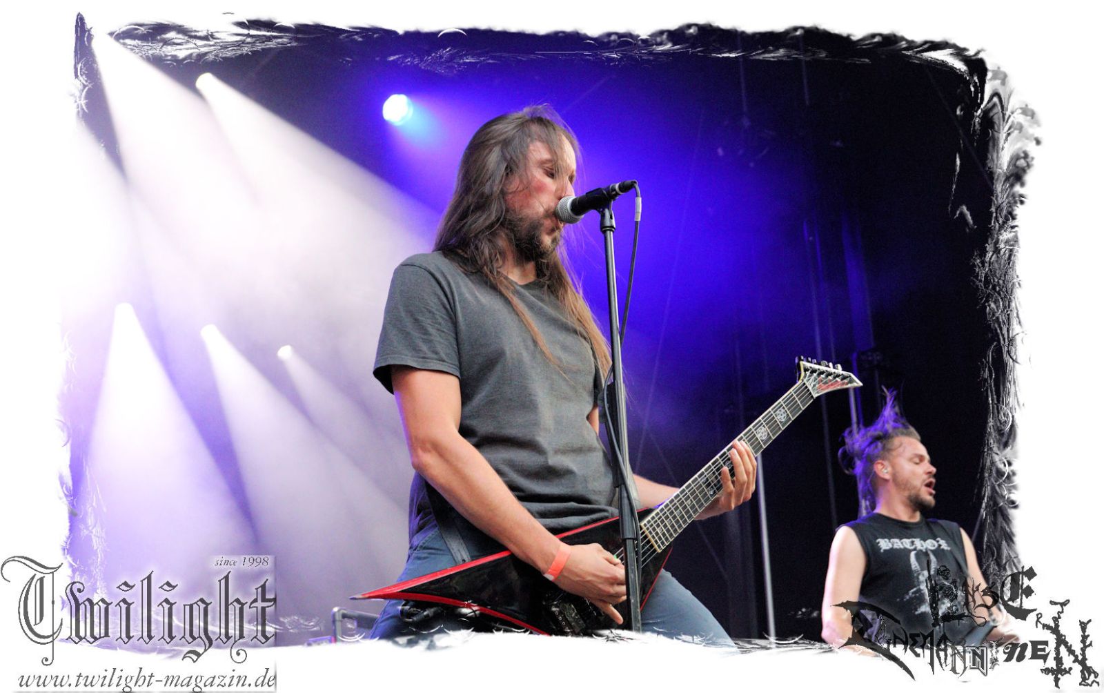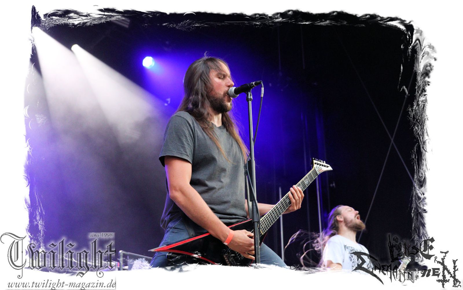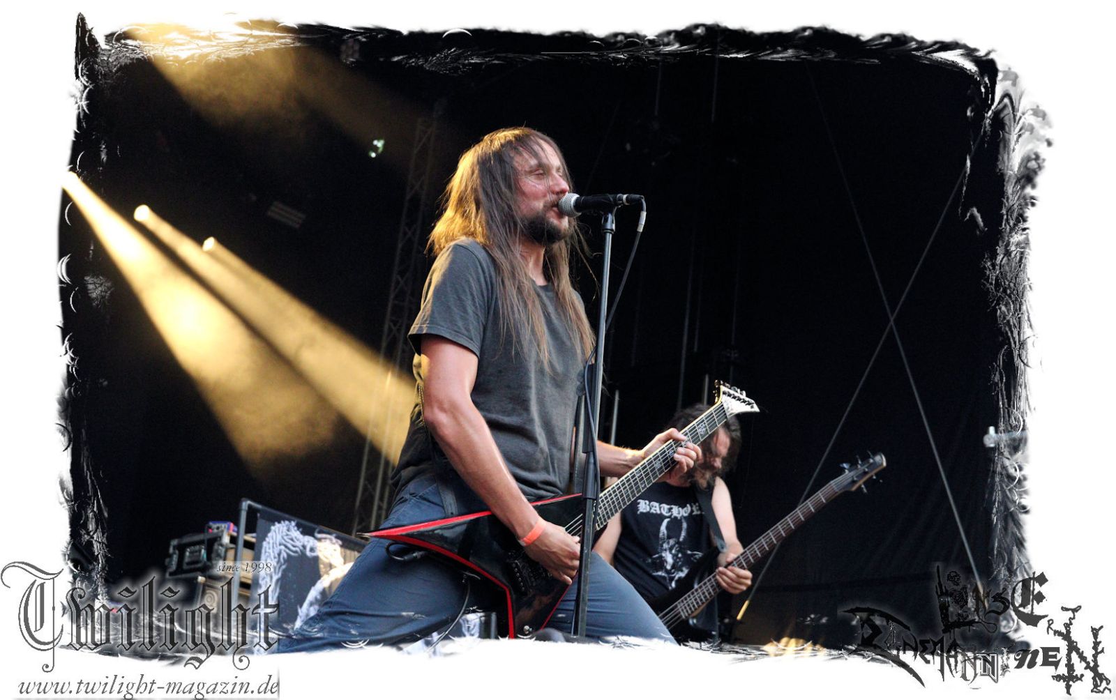 Was danach zum Finale des Abends auf der Bühne passiert lässt sich schlicht und ergreifend mit einem einzigen Wort zusammenfassen: EPISCH!!! Was man bereits auf dem Ultima Ratio – Fest im Herbst erahnen durfte findet am heutigen Abend in der Headliner-Show auf dem ROCK UNTER DEN EICHEN für mich eine eindrucksvolle Bestätigung: Primordial sind live derzeit unbestritten auf dem Zenit ihres Schaffens angelangt. Nemtheanga, Ciáran, Pól und Simon brennen ein derart intensives Feuerwerk ab. Die Live-Alben "All Empires Fall" und "Gods To The Godless" sind Meilensteine aber nichts im Verlgeich zu dem, was die Band inzwischen auf die Bühne zu bringen in der Lage ist. Da hat zweifelsfrei "How It Ends", welches im letzten Jahr veröffentlicht wurde auch seinen Anteil, von dem der Titeltrack und "Victory Has 1000 Fathers, Defeat Is An Orphan" zelebriert werden. Der Einstieg erfolgt mit "As Rome Burns", den krönenden Abschluss bildet "Empire Falls". Der Übersong "To Hell Or The Hangman" darf natürlich nicht fehlen, ebensowenig die Klassiker "The Coffin Ships" sowie "No Grave Deep Enough". Primordial machen immer wieder auf´s Neue sprachlos. Möge ihnen dieser Spirit und diese Intensität niemals ausgehen.