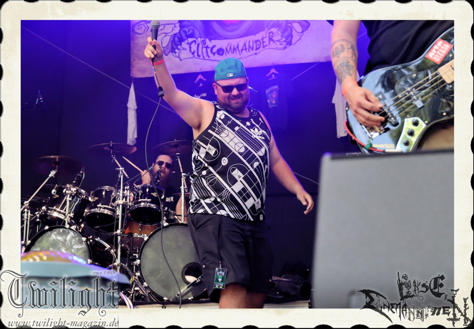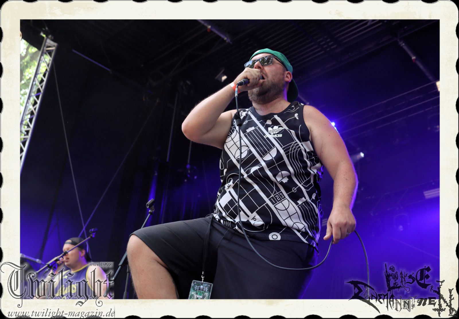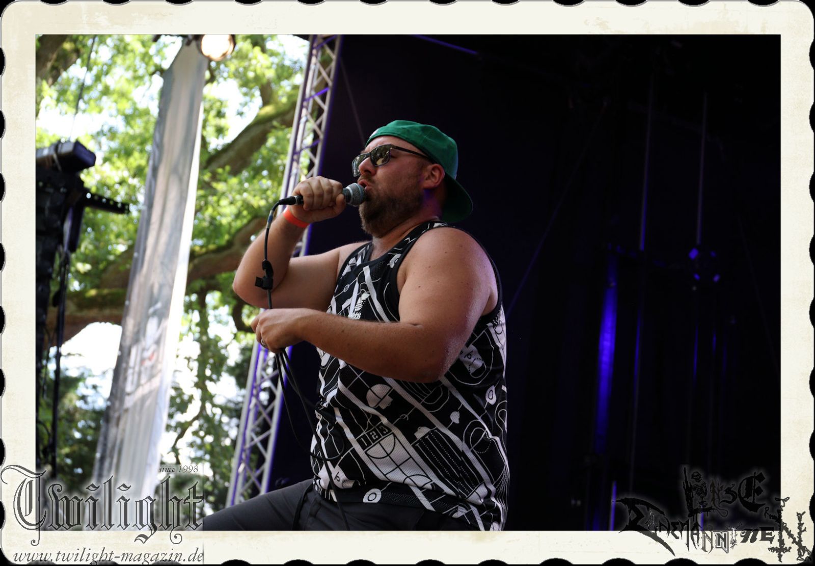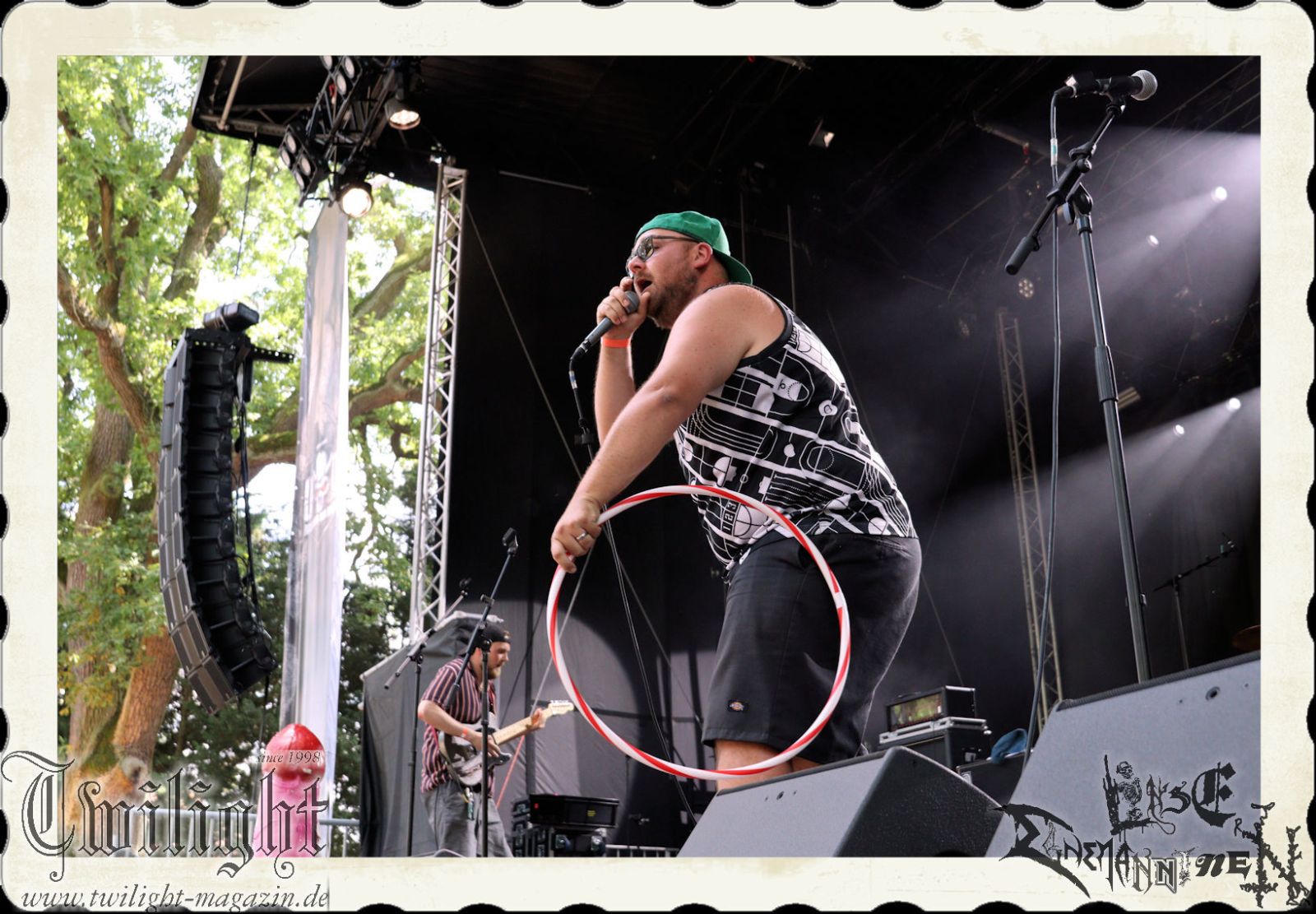 Ganz kurz und nur ganz früh am Morgen scheint es, als hätte die Sonne am heutigen Tage etwas mehr Erbarmen. Letzteres weicht wiederum spätestens ab um zehn Uhr in der Frühe wiederum einer glühenden Oberhitze aus dem Firmament. Schattenplätze sind einmal mehr gefragt, genauso wie Elektrolyte, obwohl diese idealerweise nicht aus Bier und Eierlikör bestehen sollten. Nach einer Stärkung mit einem Schnitzelbrötchen von der Catering-Crew des F-Hauses Jena geht es auch schon wieder weiter auf der Hauptbühne unter den Eichen. Zum Start in den Samstag gibt es mit CLITCOMMANDER, IN DEMONI und BRUTAL SPHINCTER ein infernalisches Grindcore-Trio.