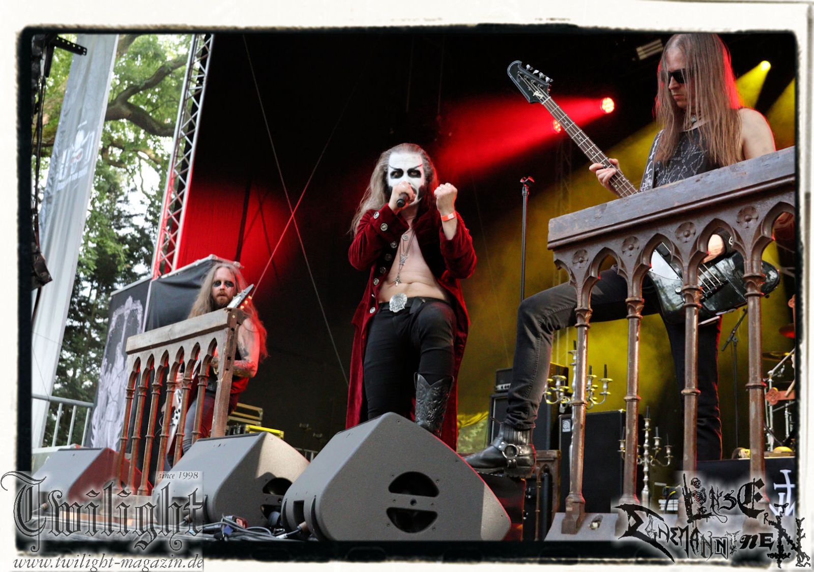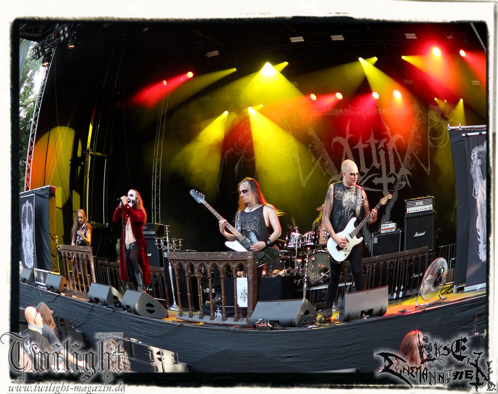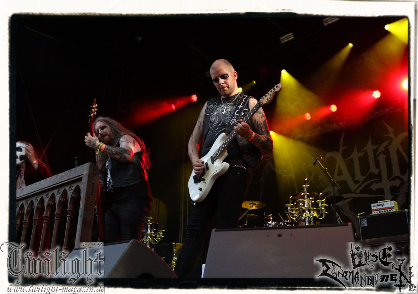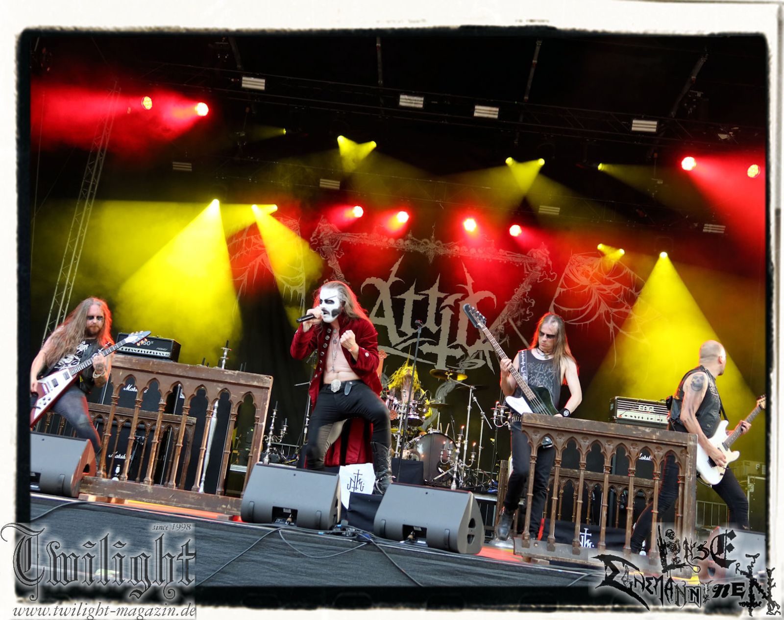 So rein gar nicht meine Baustelle sind die Slam-Deathgrinder von EPICARDIECTOMY. Da kann der Sound noch so fett und die technische Performance noch so fesch sein: Das berührt mich innerlich null. Insofern nutze ich die Zeit, um einen Nachzügler auf dem Zeltplatz in Empfang zu nehmen. Was gibt es schöneres als hier mit einem eiskalten Wolters aus der Löwenstadt begrüßt zu werden? Mit ATTIC beginnt im Anschluss die Crunchtime des ersten Festival-Tages. Heavy Metal – Maximum. Ich war nie ein großer Fan oder Anhänger von King Diamond oder Mercyful Fate und Falsettgesang muss man darüber hinaus mögen. Bei mir ist das gerade auf Tonträger abhängig von der Tagesform. Live ist das Quintett aus Nordrhein-Westfalen um Meister Cagliostro mit seinem unverkennbaren Organ jedoch immer über jeden Zweifel erhaben. Mit "Darkest Rites" vom jüngsten Output "The Return Of The Witchfinder" bis hin zu "The Headless Horseman" zünden Attic die nächste Stufe auf dem ROCK UNTER DEN EICHEN. Musikalisch, visuell und performancetechnisch bietet der Fünfer ganz großes Kino in Sachen klassischem Heavy Metal, Dramatik und Theatralik.