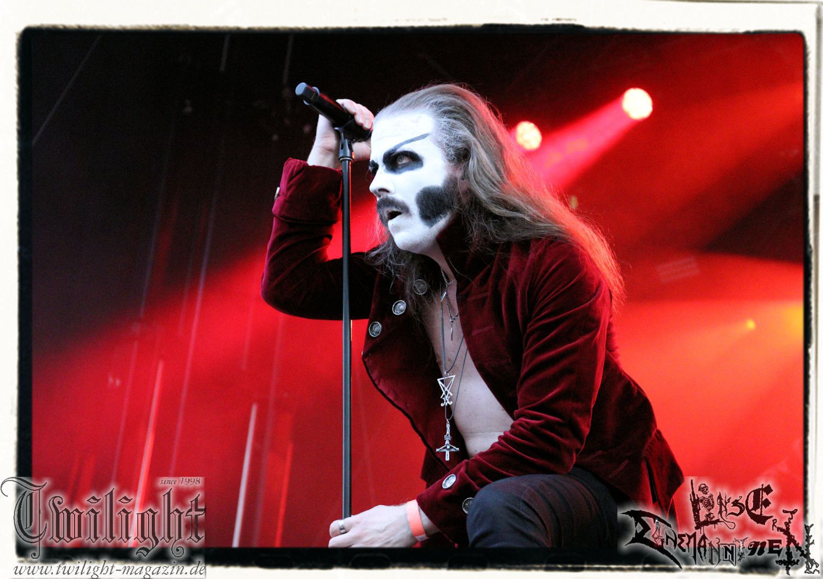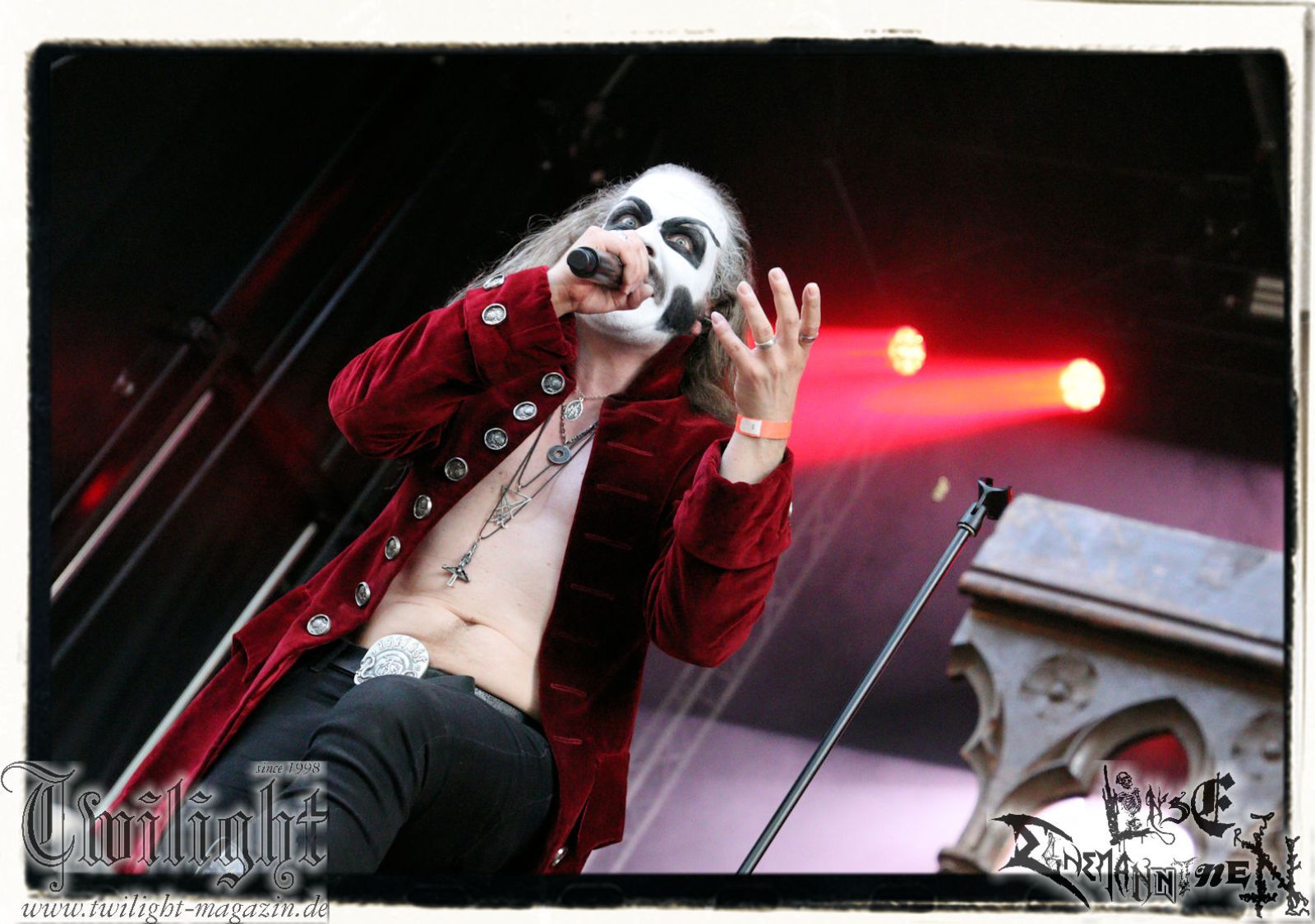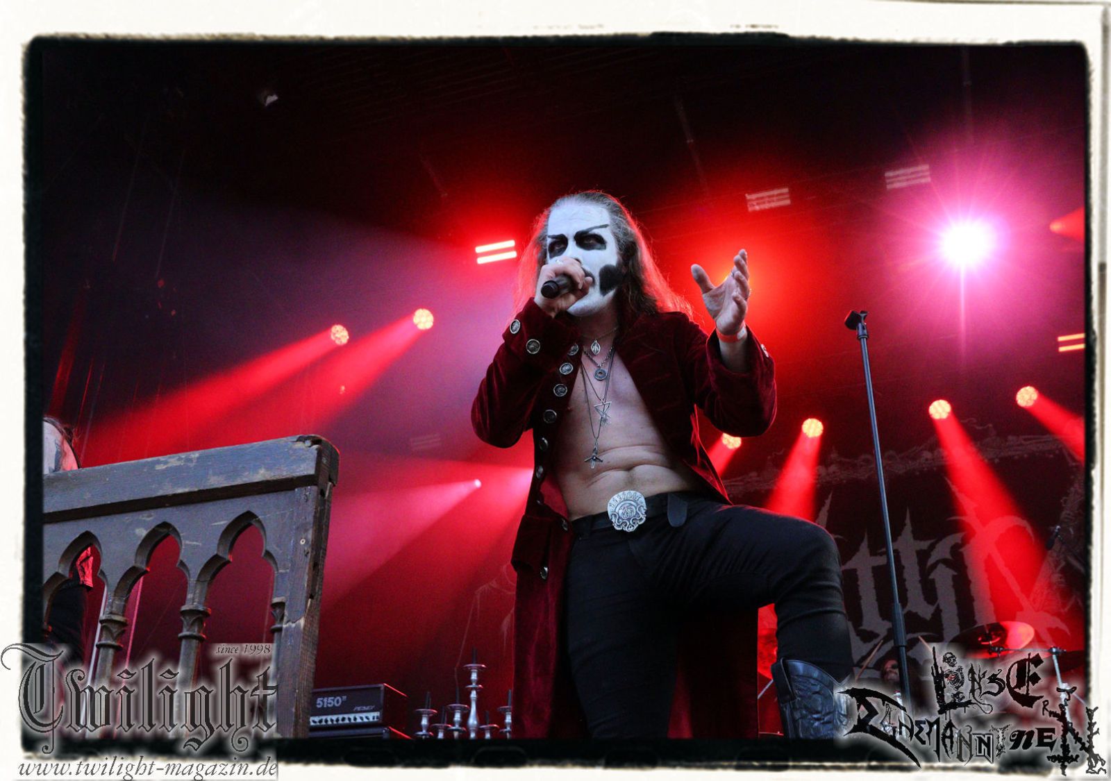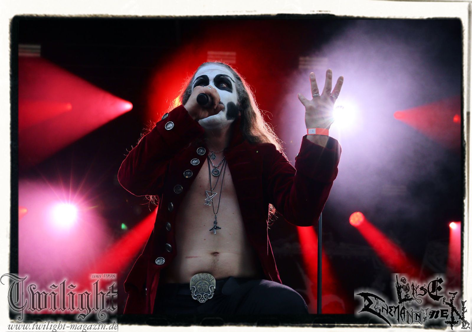 So rein gar nicht meine Baustelle sind die Slam-Deathgrinder von EPICARDIECTOMY. Da kann der Sound noch so fett und die technische Performance noch so fesch sein: Das berührt mich innerlich null. Insofern nutze ich die Zeit, um einen Nachzügler auf dem Zeltplatz in Empfang zu nehmen. Was gibt es schöneres als hier mit einem eiskalten Wolters aus der Löwenstadt begrüßt zu werden? Mit ATTIC beginnt im Anschluss die Crunchtime des ersten Festival-Tages. Heavy Metal – Maximum. Ich war nie ein großer Fan oder Anhänger von King Diamond oder Mercyful Fate und Falsettgesang muss man darüber hinaus mögen. Bei mir ist das gerade auf Tonträger abhängig von der Tagesform. Live ist das Quintett aus Nordrhein-Westfalen um Meister Cagliostro mit seinem unverkennbaren Organ jedoch immer über jeden Zweifel erhaben. Mit "Darkest Rites" vom jüngsten Output "The Return Of The Witchfinder" bis hin zu "The Headless Horseman" zünden Attic die nächste Stufe auf dem ROCK UNTER DEN EICHEN. Musikalisch, visuell und performancetechnisch bietet der Fünfer ganz großes Kino in Sachen klassischem Heavy Metal, Dramatik und Theatralik.