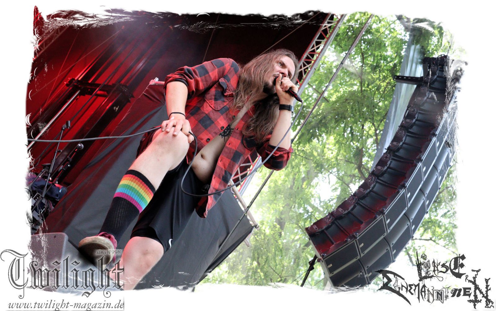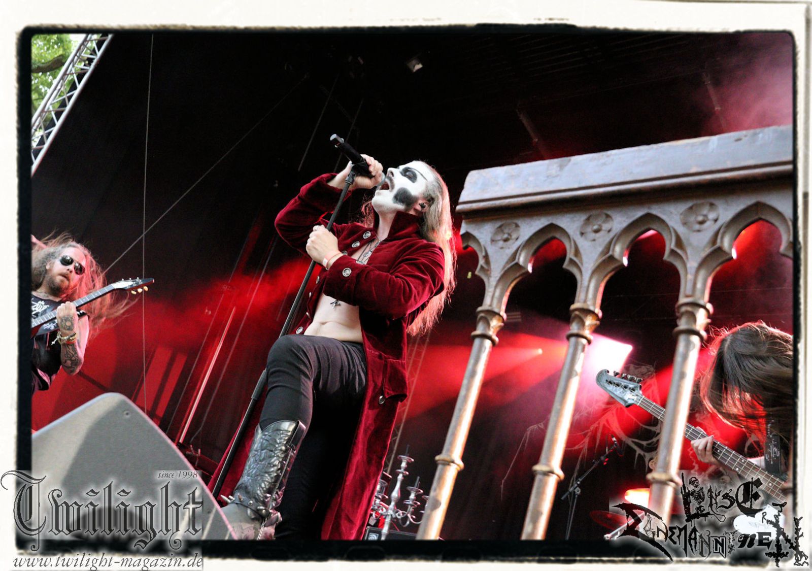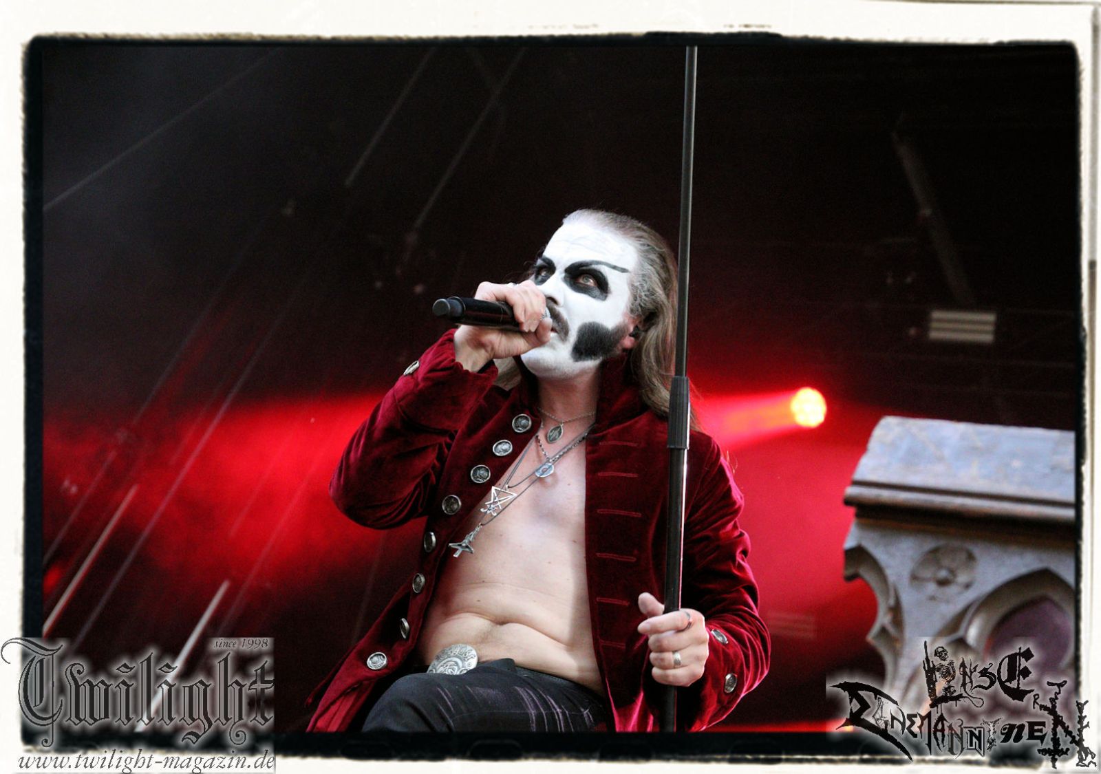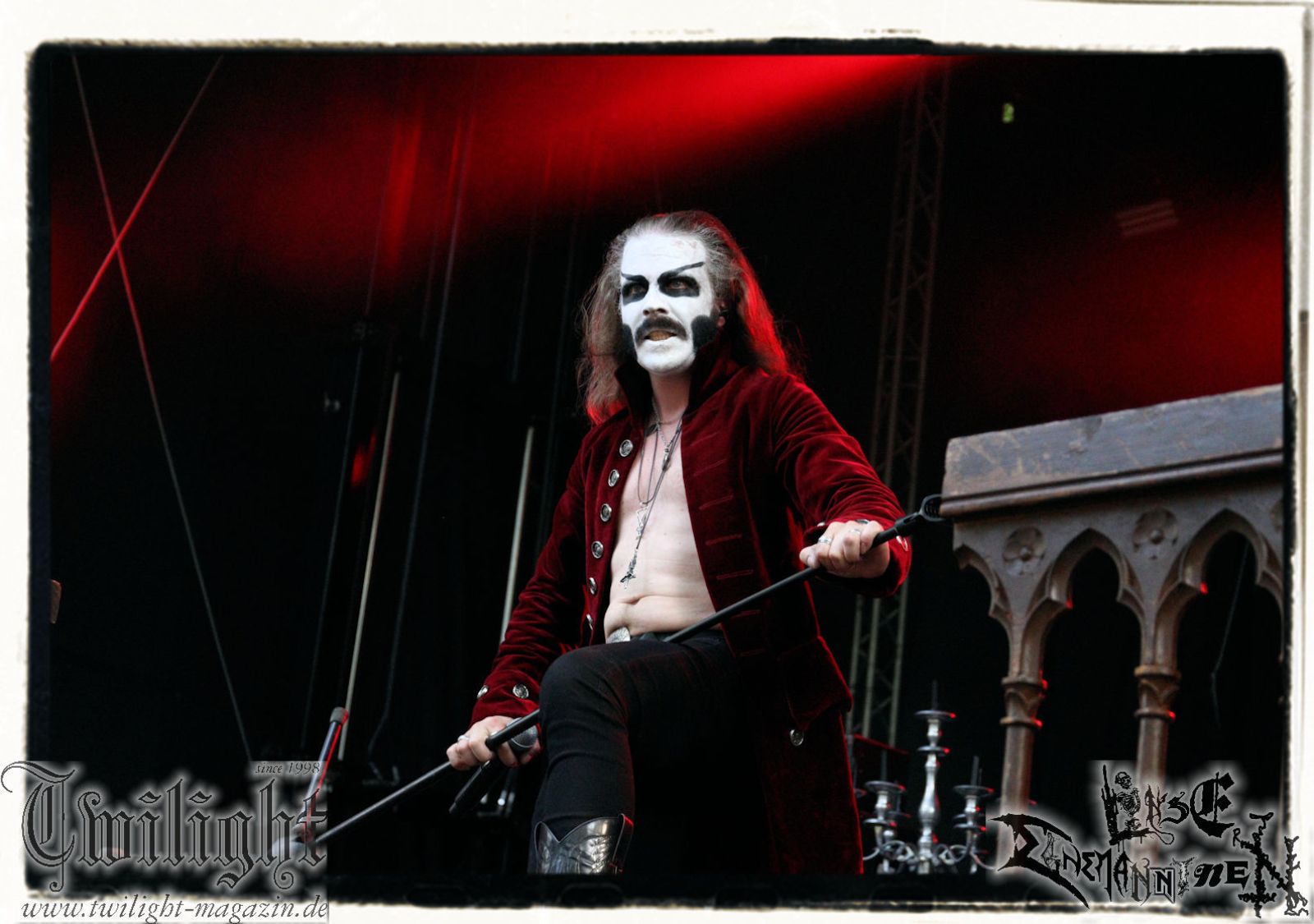 So rein gar nicht meine Baustelle sind die Slam-Deathgrinder von EPICARDIECTOMY. Da kann der Sound noch so fett und die technische Performance noch so fesch sein: Das berührt mich innerlich null. Insofern nutze ich die Zeit, um einen Nachzügler auf dem Zeltplatz in Empfang zu nehmen. Was gibt es schöneres als hier mit einem eiskalten Wolters aus der Löwenstadt begrüßt zu werden? Mit ATTIC beginnt im Anschluss die Crunchtime des ersten Festival-Tages. Heavy Metal – Maximum. Ich war nie ein großer Fan oder Anhänger von King Diamond oder Mercyful Fate und Falsettgesang muss man darüber hinaus mögen. Bei mir ist das gerade auf Tonträger abhängig von der Tagesform. Live ist das Quintett aus Nordrhein-Westfalen um Meister Cagliostro mit seinem unverkennbaren Organ jedoch immer über jeden Zweifel erhaben. Mit "Darkest Rites" vom jüngsten Output "The Return Of The Witchfinder" bis hin zu "The Headless Horseman" zünden Attic die nächste Stufe auf dem ROCK UNTER DEN EICHEN. Musikalisch, visuell und performancetechnisch bietet der Fünfer ganz großes Kino in Sachen klassischem Heavy Metal, Dramatik und Theatralik.