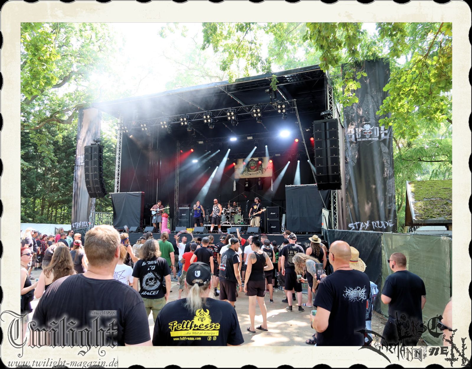 2023 sollte es dann endlich passen. Mit Paradise Lost und Primordial waren nicht nur zwei sehr einflussreiche Bands von den britischen Inseln gebucht, sondern vor allen zwei meiner absoluten Allzeit-Lieblingsbands. Doch die Vorfreude wurde jäh beendet, musste das Festival im vergangenen Jahr relativ kurzfristig aus gesundheitlichen Gründen komplett gecancelt werden. Es war zunächst nicht klar, ob und wie es weiter gehen konnte. Glücklicherweise fügte sich alles zum Guten. 2024 sollte nach einem Jahr Zwangsabstinenz ein neuer Anlauf genommen werden. Die Grundpfeiler im Billing, insbesondere die Headliner Paradise Lost und Primordial konnten in die aktuelle Ausgabe hinübergerettet werden. Für mich der Grund, es zu einem Ende zu bringen und dem muckeligen, kleinen Open Air unter den Eichen des kleinen Dörfchens Bertingen, am Elbe-Radweg gelegen, einen Besuch abzustatten.