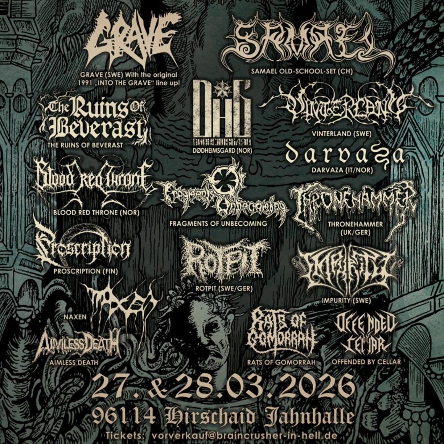 Mit Samael, die einen Old-School-Set liefern werden und Grave im "Into The Grave"-Line-Up hat man nicht nur zwei herausragende Headliner gefunden. Darüber hinaus geben sich die legendären Vinterland aus Schweden ("Welcome To My Last Chapter" 1996) die Ehre. Aber auch DHG bzw. Dodheimsgard, The Ruins Of Beverast, Blood Red Throne, Fragments Of The Unbecoming und nicht zuletzt die Schwedentod-Senkrechtstarter von Impurity können sich sehen und hören lassen.
