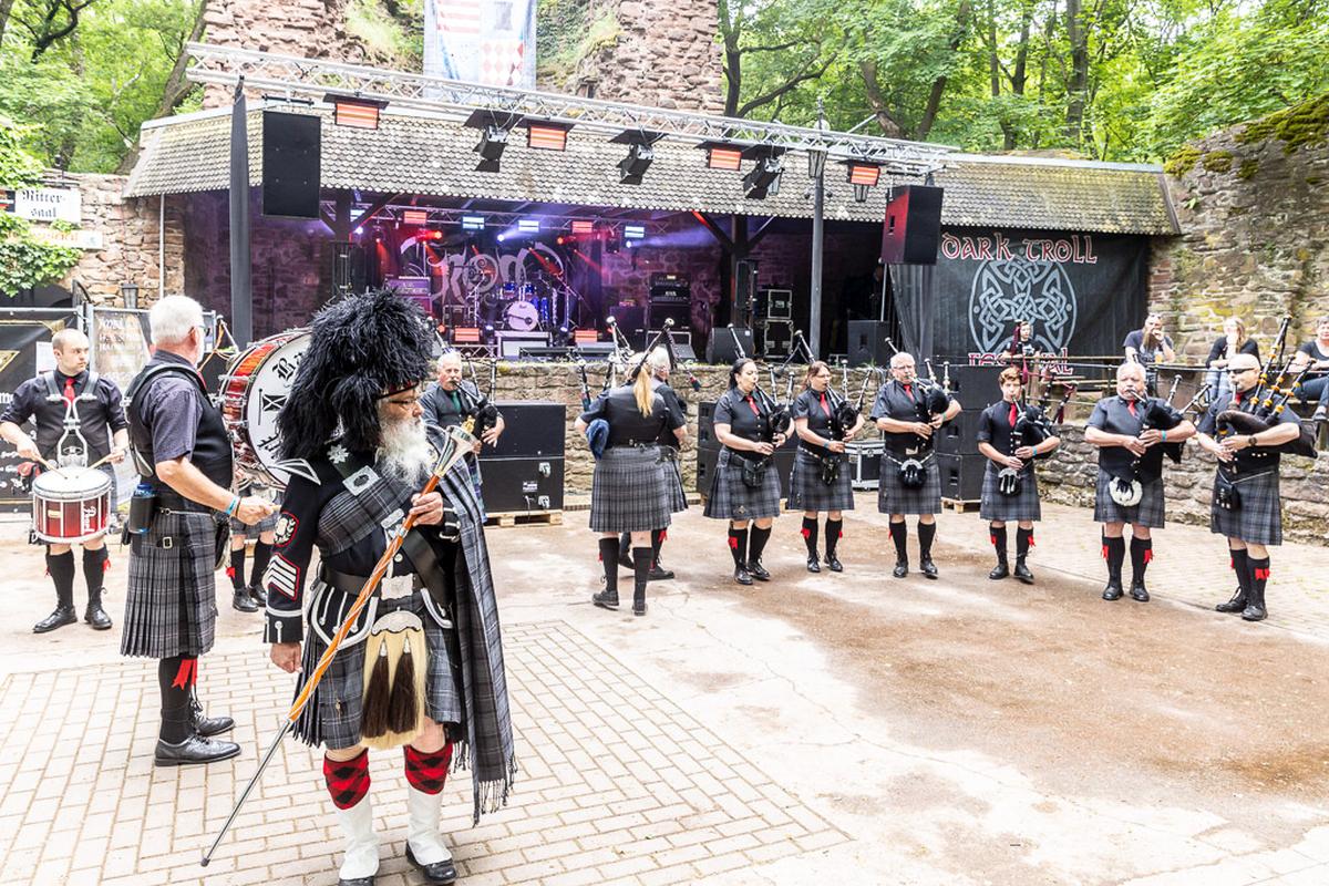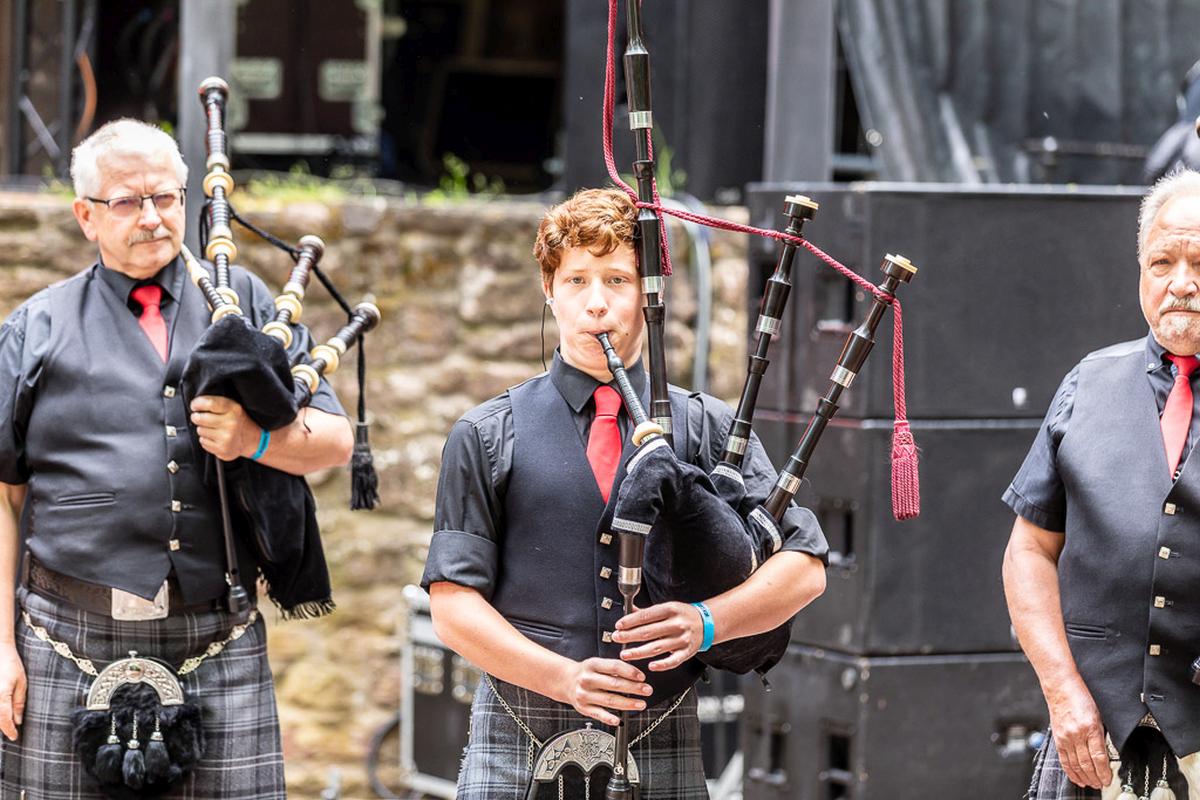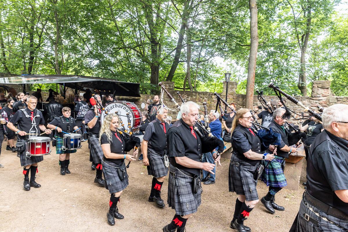 Ich habe Donnerstag Freunde auf dem Campingplatz A besucht und hatte das Glück den ersten musikalischen Auftakt auf dem Festivl miterleben zu dürfen. Eine Handvoll Musiker von der Gruppe Barbarossa Pipes & Drums spielen auf dem Campingplatz ein kurzes Stück und ziehen dann runter zur Bühne. Zusammen mit dem Rest der Gruppe begeben sich die Musiker geschlossen in die Burg. Vor der Bühne stellt sich die Gruppe kurz vor und spielt dann mehrere Stücke als Opener des Festivals. Dabei spielen sie auf den Dudelsäcken althergebrachten Stücke, wie "Flower of Scottland", und moderne Stücke, wie "Smoke on the Water". Manche der modernen Stücke klappen nicht so ganz auf diesem Instrument, aber unterhaltsam ist es allemal und sie ernten eine Menge Applaus dafür. Für mich ein gelungener Auftakt für die nächsten drei Tage.