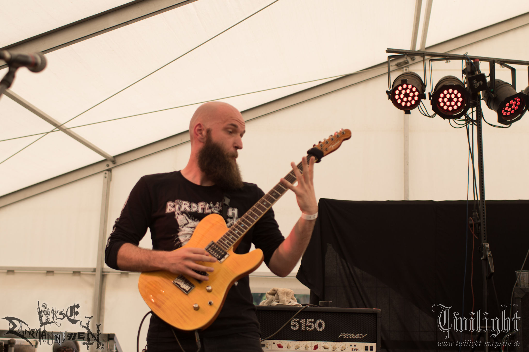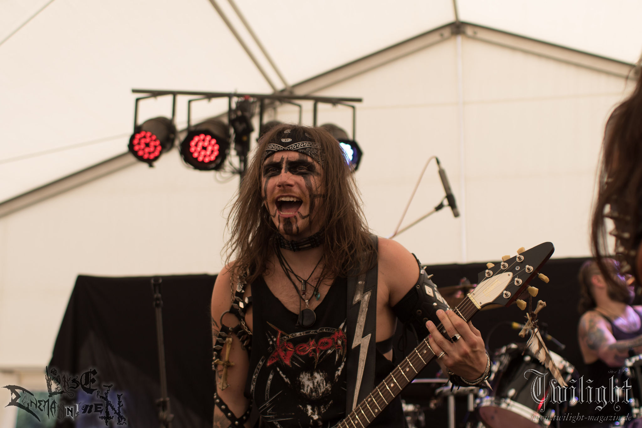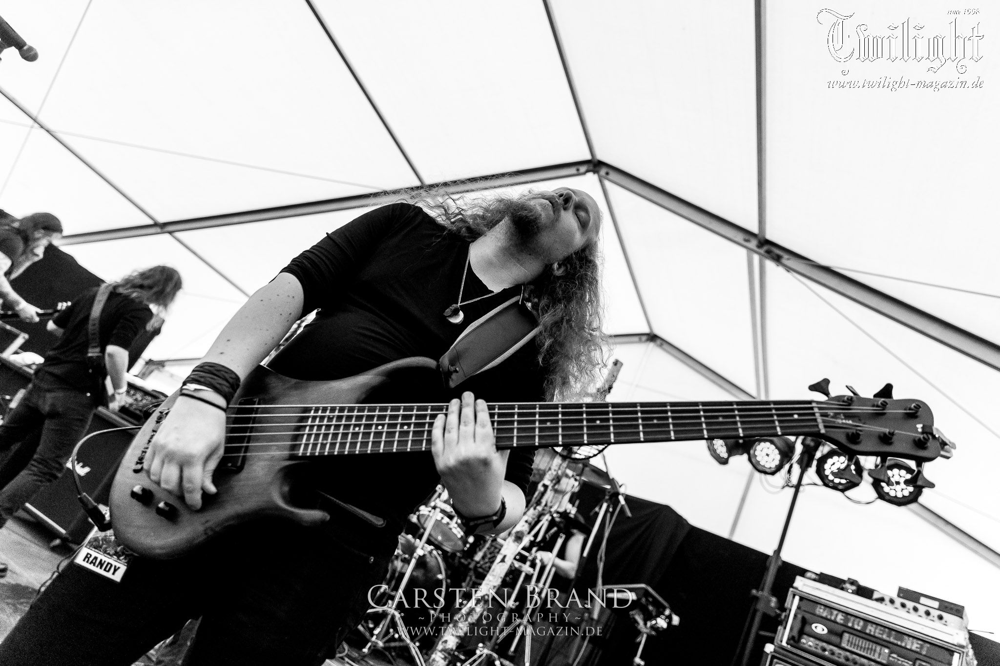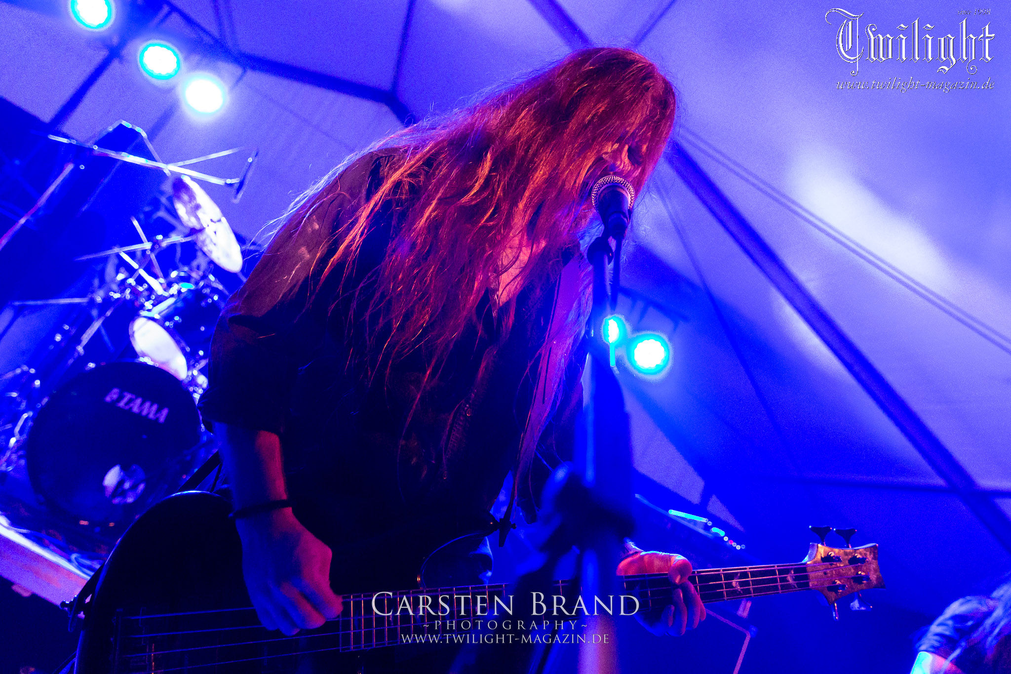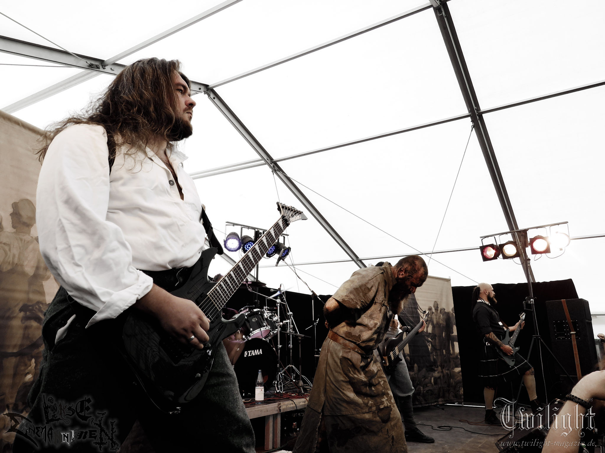 Zeit und Spielplan sind mittlerweile voran geschritten und schließlich wird auf der Hauptbühne mit Dark Sky Choir der Betrieb planmäßig wieder aufgenommen. Was an der einen Stelle für Klarheit sorgt, bedeutet im Zelt Ungewissheit und wirft immer wieder Fragen auf, da eigentlich nur klar ist, dass die Auftritte von SYLVANE und CRYPTS OF DESPAIR in die Timeline der Zeltbühne eingeschoben werden sollen, wobei Wandar wohl ihren Headliner-Status behalten sollen. Eine konkrete, aktualisierte Running Order wird aber weder online veröffentlicht und auch ein Aushang findet sich nirgends. Und das lässt verständlicherweise bei jenen, die sich vor allem auf die Gigs im Zelt gefreut hatten ordentlich Unmut und Ärger aufkommen. Ich nehme es sportlich und konzentriere mich auf die Hauptbühne. Ich bin nicht unbedingt glühender Verehrer von US-Heavy Metal aber DARK SKY CHOIR wissen mich live durchaus mit ihrer Frische, den technischen Finessen und einer ambitionierten Performance zu überzeugen. Die Mucke der Amis klingt modern, heavy und ist dabei teilweise sogar sehr straight und fast tanzbar. Ein leichter Thrash-Einschlag führt zu einer härtetechnischen Aufwertung, genauso wie das Organ von Brian Allen, der nicht nur klare Töne aus seiner Kehle holt, sondern dabei auch herrlich rauh klingen kann. Die Fähigkeiten der Instrumentalfraktion und das Zusammenspiel sind beeindruckend. Über Entertainer-Qualitäten verfügen alle Mitglieder. Eine Scheibe werde ich mir wohl nicht ins Regal stellen aber der Auftritt ist am Ende sehr viel mehr als nur eine Horizonterweiterung.