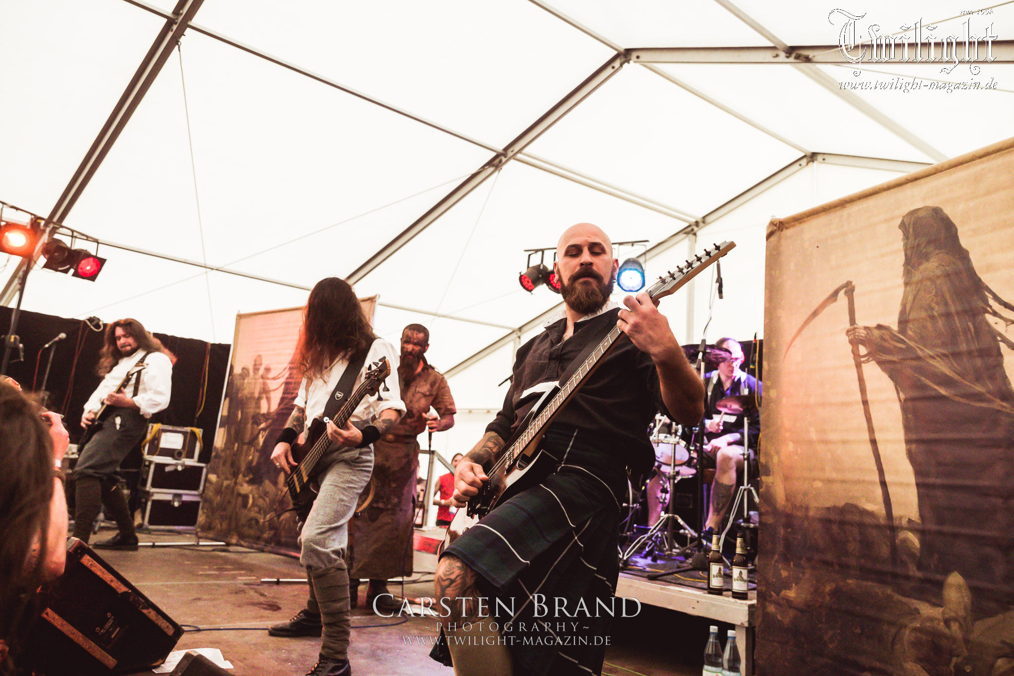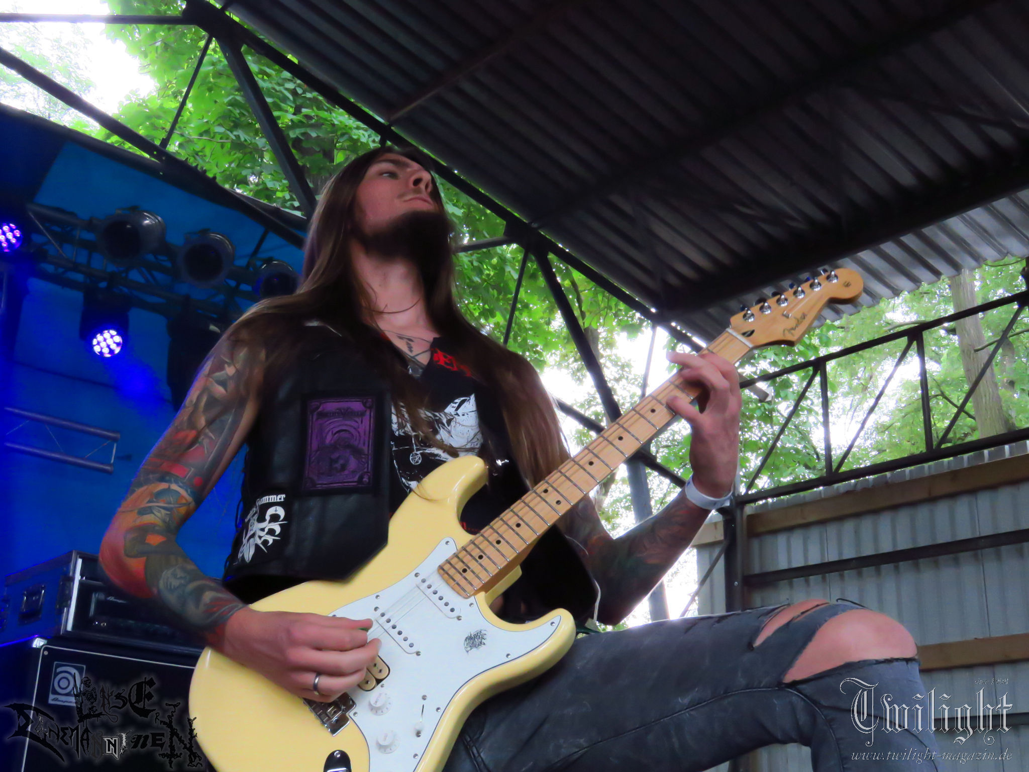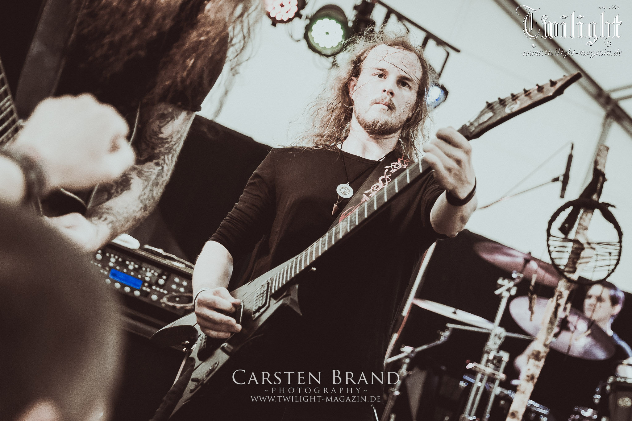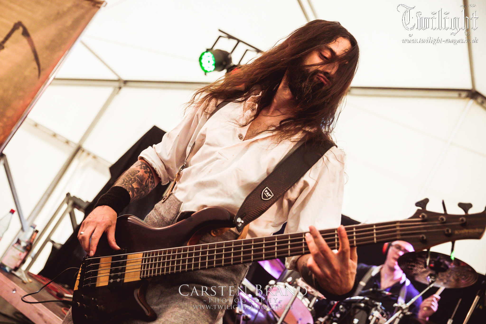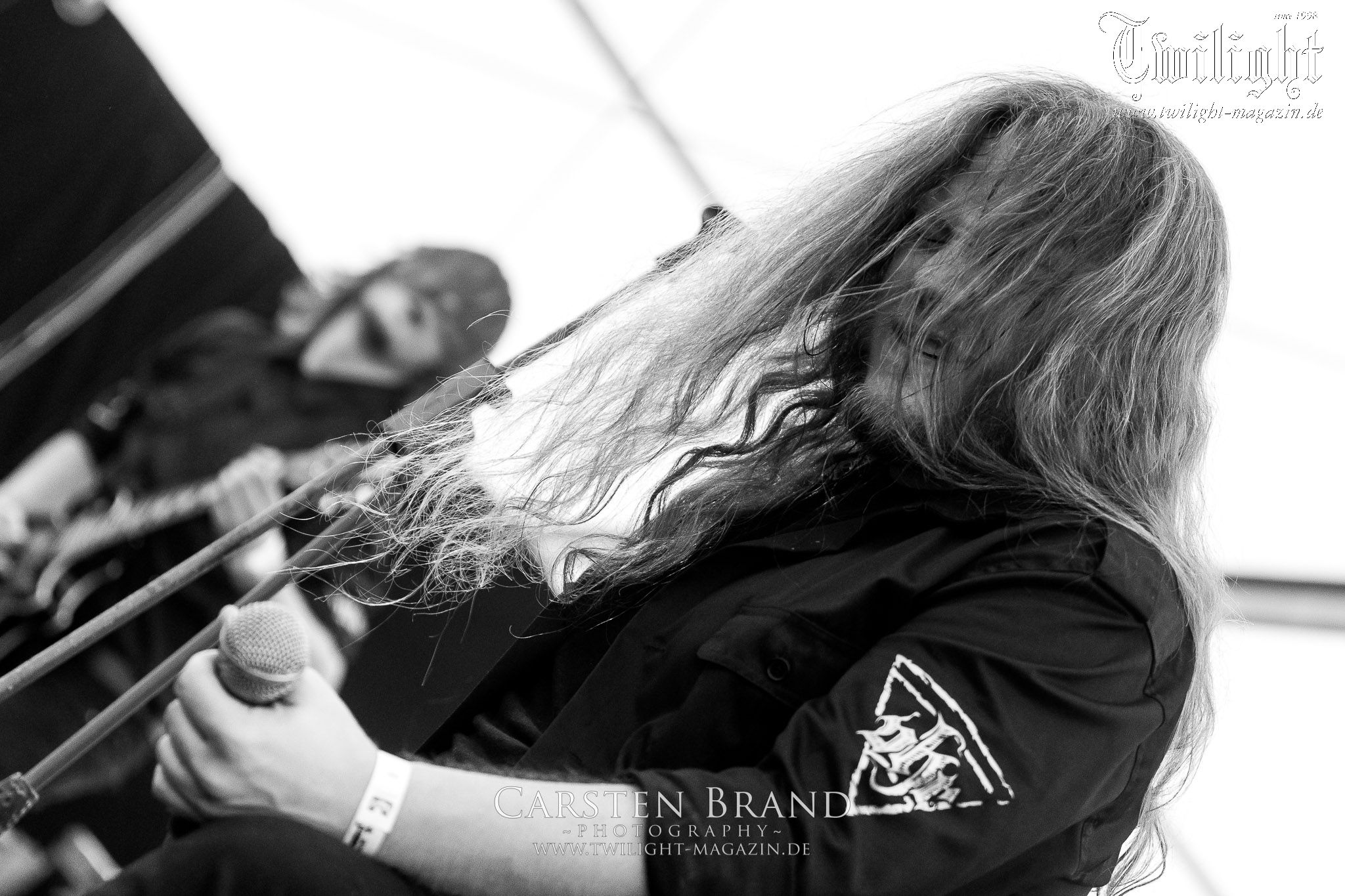 Zeit und Spielplan sind mittlerweile voran geschritten und schließlich wird auf der Hauptbühne mit Dark Sky Choir der Betrieb planmäßig wieder aufgenommen. Was an der einen Stelle für Klarheit sorgt, bedeutet im Zelt Ungewissheit und wirft immer wieder Fragen auf, da eigentlich nur klar ist, dass die Auftritte von SYLVANE und CRYPTS OF DESPAIR in die Timeline der Zeltbühne eingeschoben werden sollen, wobei Wandar wohl ihren Headliner-Status behalten sollen. Eine konkrete, aktualisierte Running Order wird aber weder online veröffentlicht und auch ein Aushang findet sich nirgends. Und das lässt verständlicherweise bei jenen, die sich vor allem auf die Gigs im Zelt gefreut hatten ordentlich Unmut und Ärger aufkommen. Ich nehme es sportlich und konzentriere mich auf die Hauptbühne. Ich bin nicht unbedingt glühender Verehrer von US-Heavy Metal aber DARK SKY CHOIR wissen mich live durchaus mit ihrer Frische, den technischen Finessen und einer ambitionierten Performance zu überzeugen. Die Mucke der Amis klingt modern, heavy und ist dabei teilweise sogar sehr straight und fast tanzbar. Ein leichter Thrash-Einschlag führt zu einer härtetechnischen Aufwertung, genauso wie das Organ von Brian Allen, der nicht nur klare Töne aus seiner Kehle holt, sondern dabei auch herrlich rauh klingen kann. Die Fähigkeiten der Instrumentalfraktion und das Zusammenspiel sind beeindruckend. Über Entertainer-Qualitäten verfügen alle Mitglieder. Eine Scheibe werde ich mir wohl nicht ins Regal stellen aber der Auftritt ist am Ende sehr viel mehr als nur eine Horizonterweiterung.