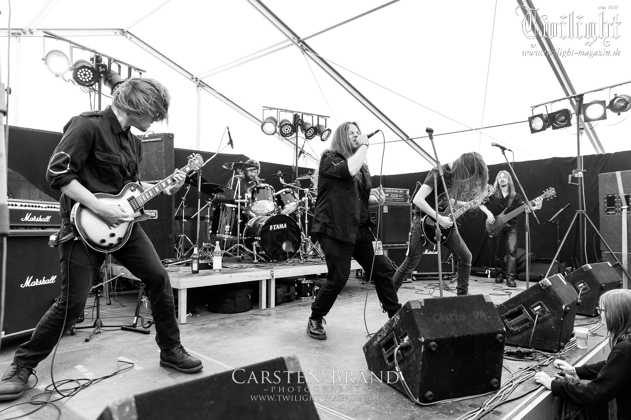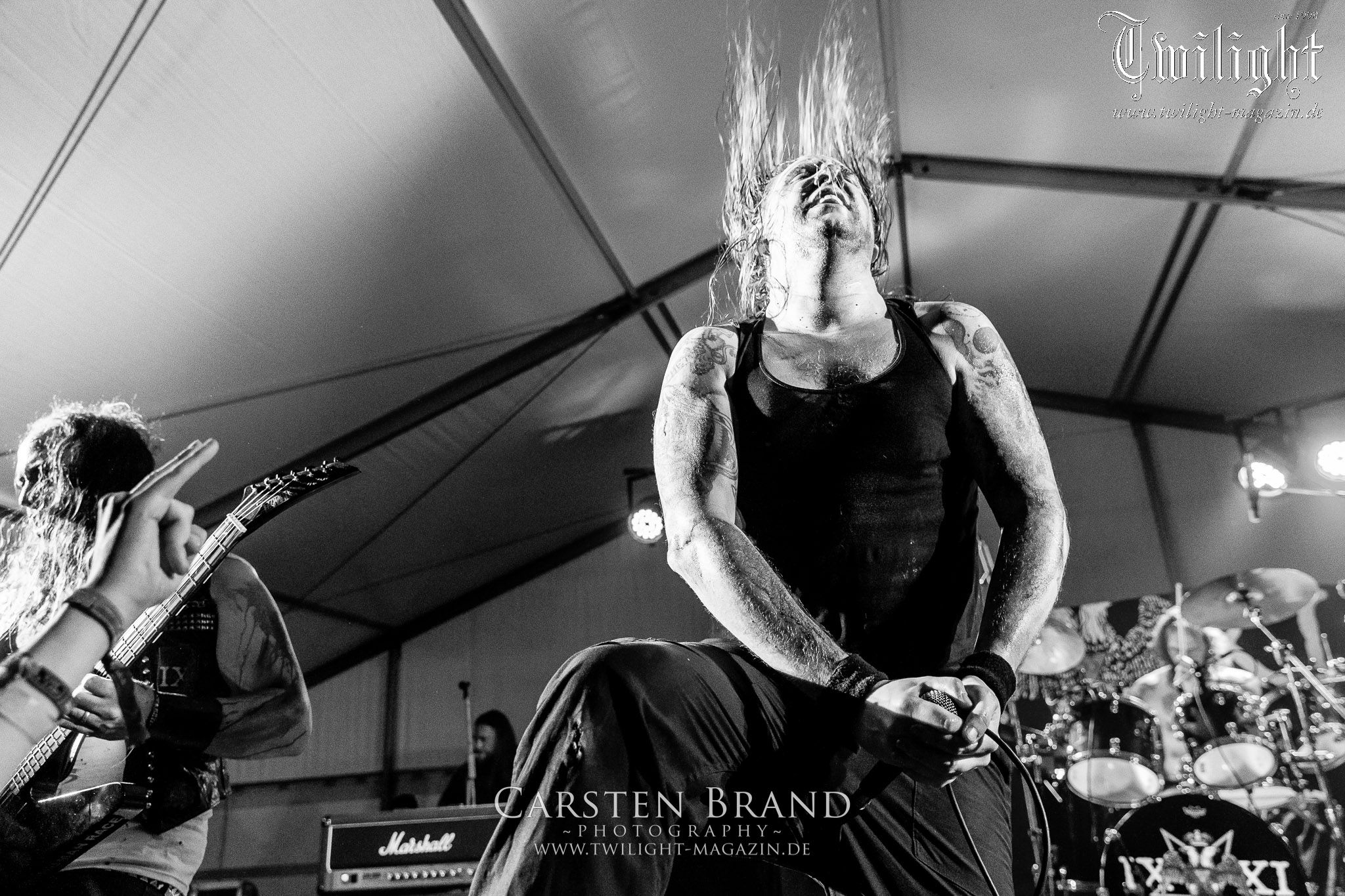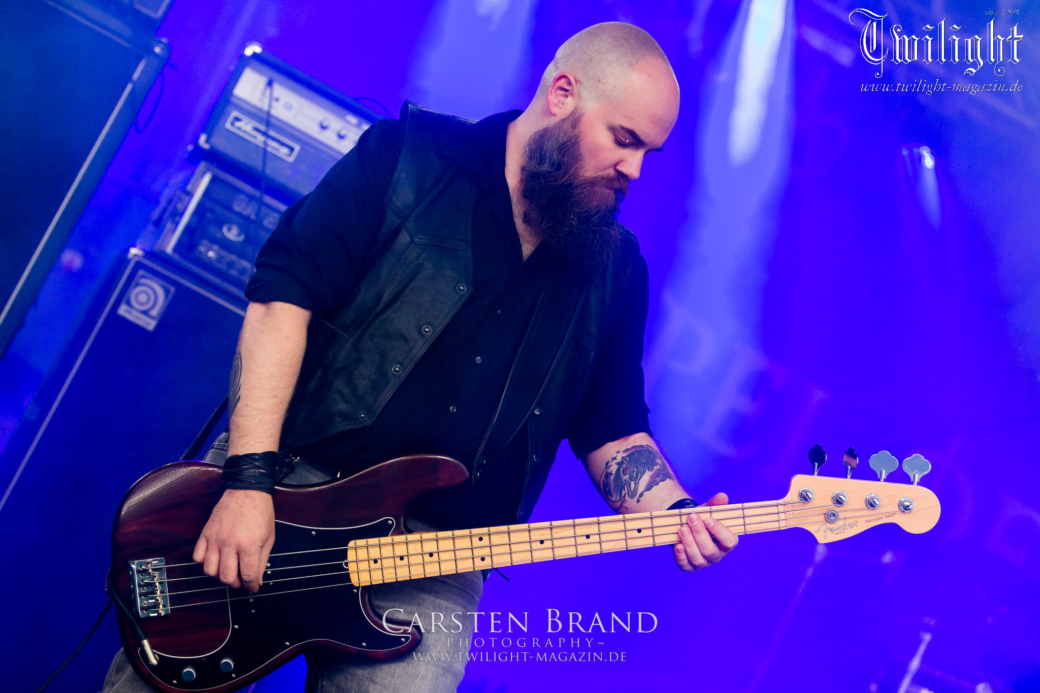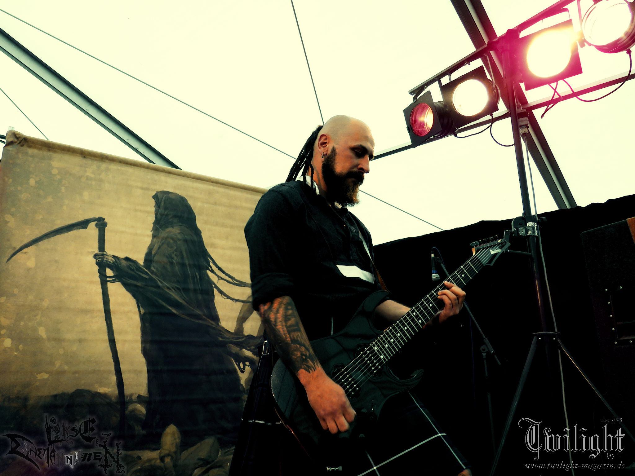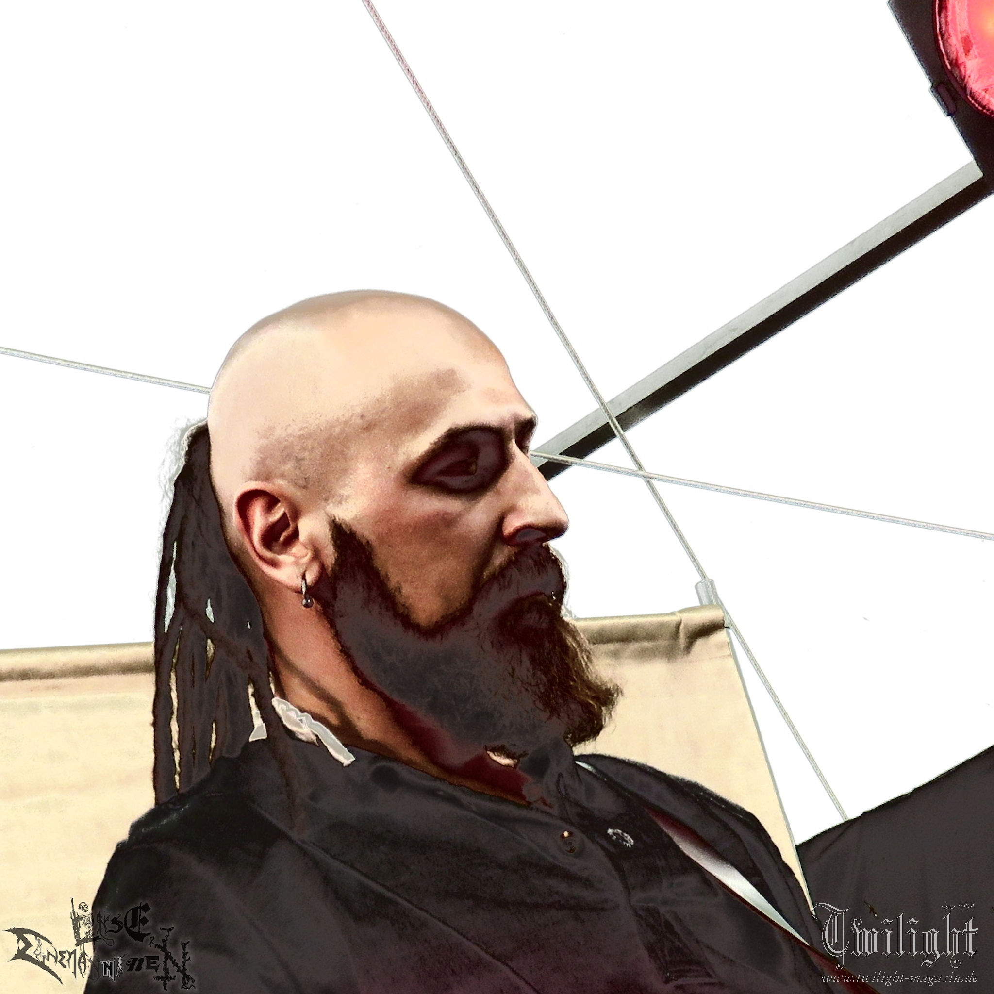 Zeit und Spielplan sind mittlerweile voran geschritten und schließlich wird auf der Hauptbühne mit Dark Sky Choir der Betrieb planmäßig wieder aufgenommen. Was an der einen Stelle für Klarheit sorgt, bedeutet im Zelt Ungewissheit und wirft immer wieder Fragen auf, da eigentlich nur klar ist, dass die Auftritte von SYLVANE und CRYPTS OF DESPAIR in die Timeline der Zeltbühne eingeschoben werden sollen, wobei Wandar wohl ihren Headliner-Status behalten sollen. Eine konkrete, aktualisierte Running Order wird aber weder online veröffentlicht und auch ein Aushang findet sich nirgends. Und das lässt verständlicherweise bei jenen, die sich vor allem auf die Gigs im Zelt gefreut hatten ordentlich Unmut und Ärger aufkommen. Ich nehme es sportlich und konzentriere mich auf die Hauptbühne. Ich bin nicht unbedingt glühender Verehrer von US-Heavy Metal aber DARK SKY CHOIR wissen mich live durchaus mit ihrer Frische, den technischen Finessen und einer ambitionierten Performance zu überzeugen. Die Mucke der Amis klingt modern, heavy und ist dabei teilweise sogar sehr straight und fast tanzbar. Ein leichter Thrash-Einschlag führt zu einer härtetechnischen Aufwertung, genauso wie das Organ von Brian Allen, der nicht nur klare Töne aus seiner Kehle holt, sondern dabei auch herrlich rauh klingen kann. Die Fähigkeiten der Instrumentalfraktion und das Zusammenspiel sind beeindruckend. Über Entertainer-Qualitäten verfügen alle Mitglieder. Eine Scheibe werde ich mir wohl nicht ins Regal stellen aber der Auftritt ist am Ende sehr viel mehr als nur eine Horizonterweiterung.