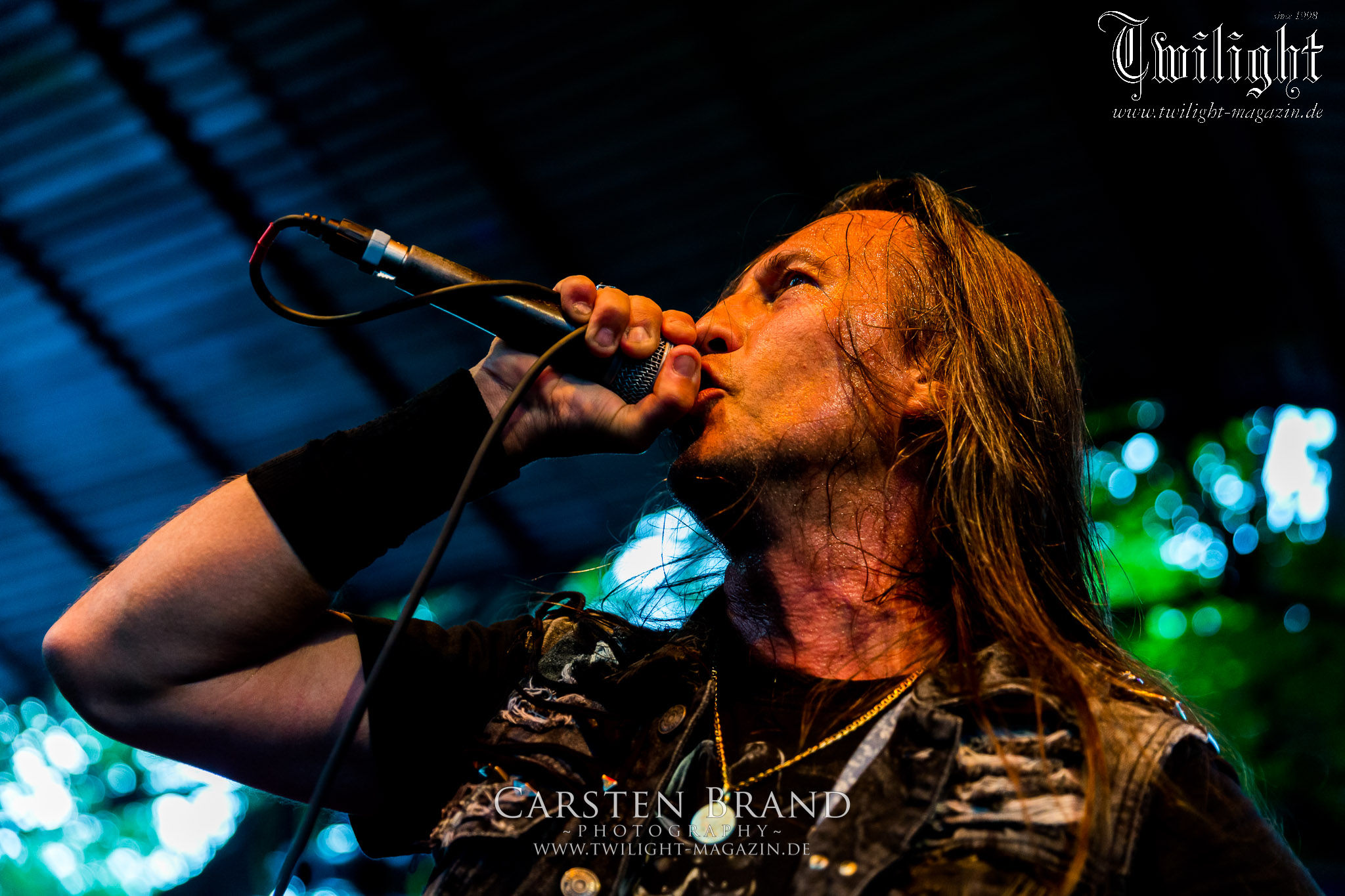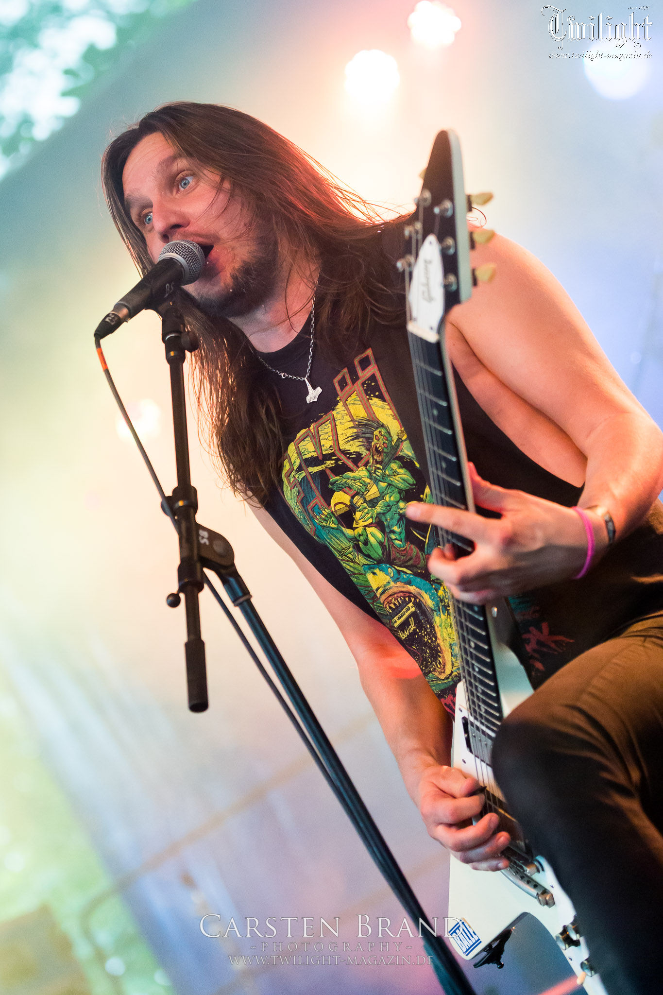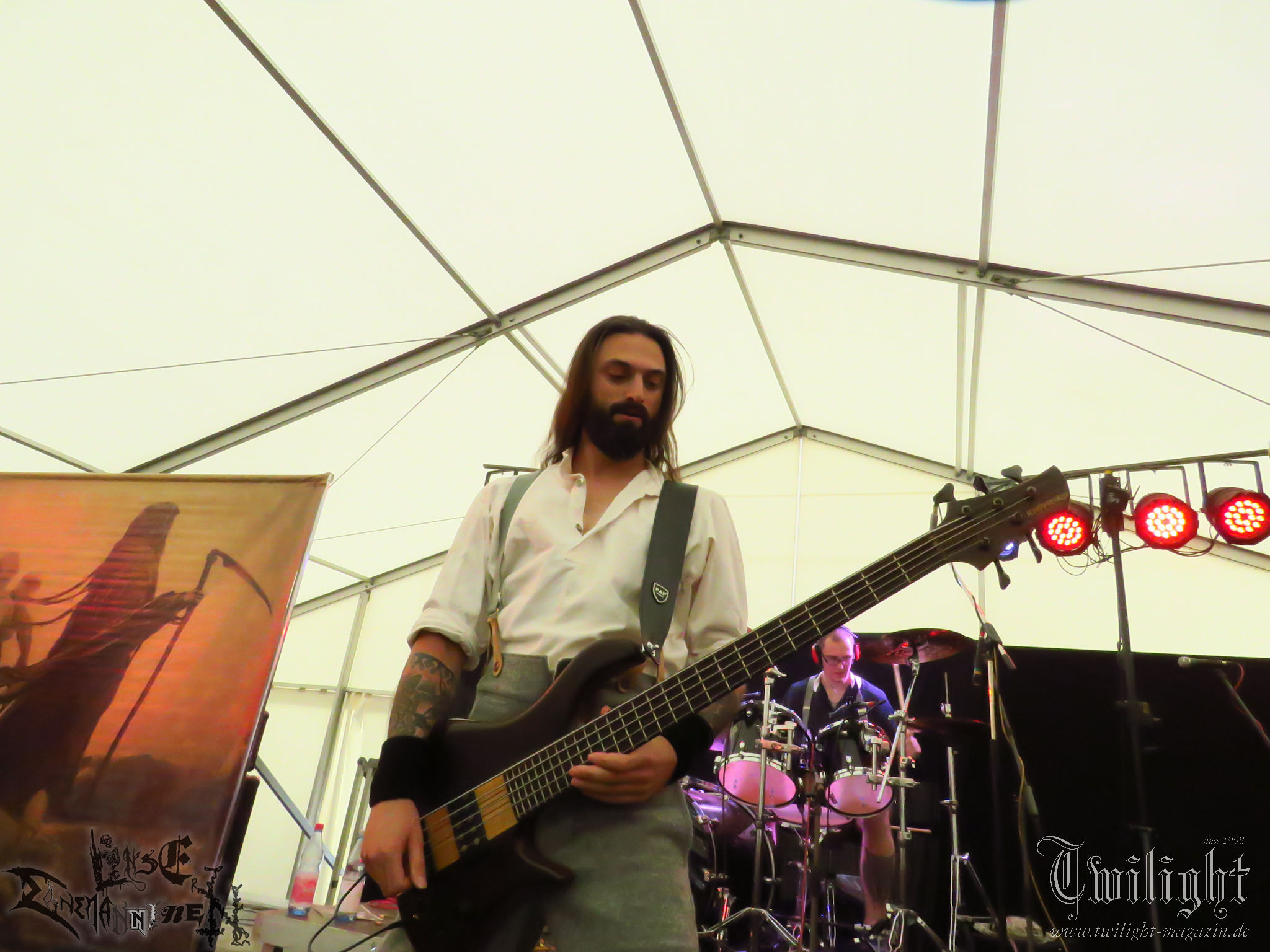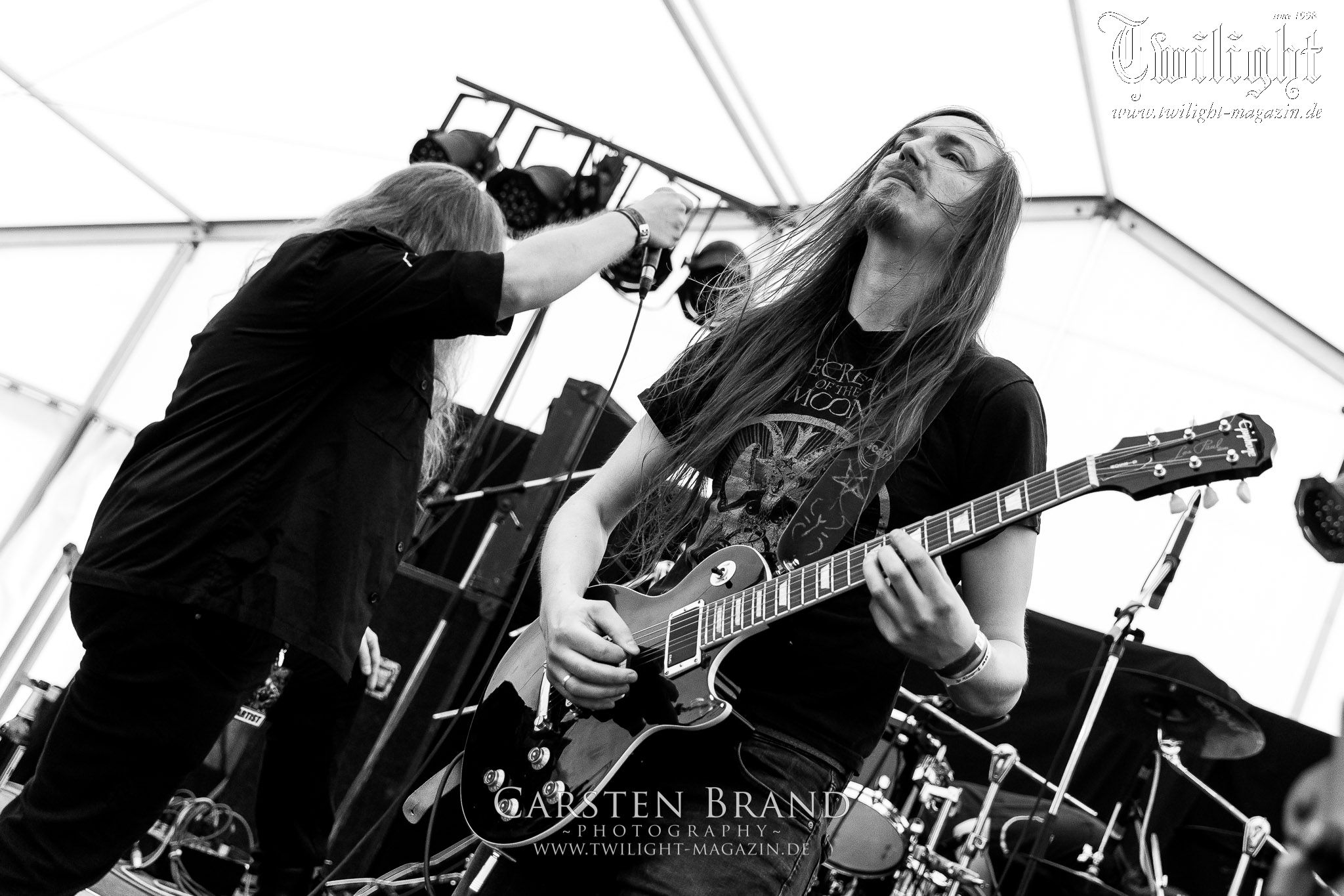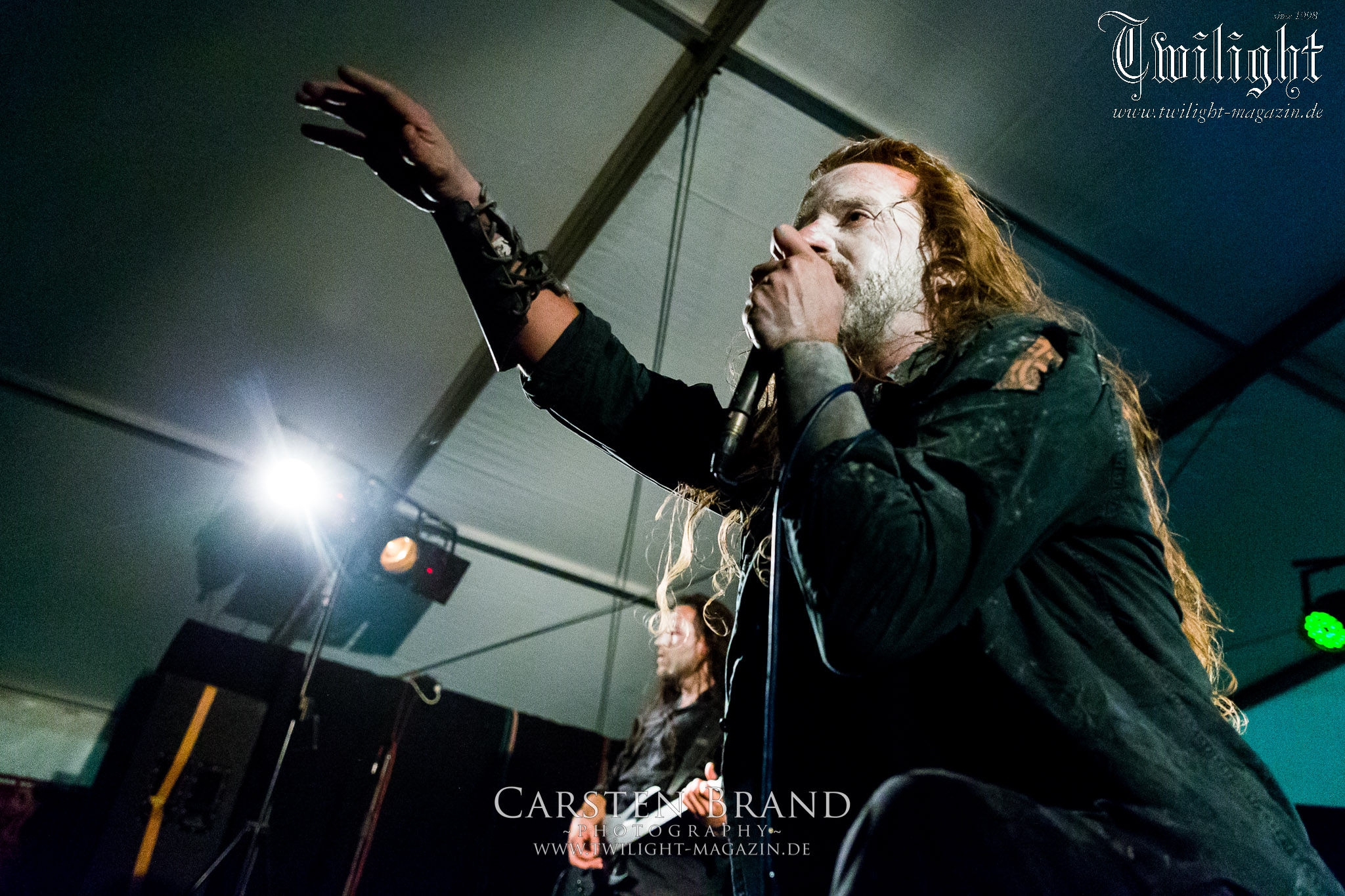 Zeit und Spielplan sind mittlerweile voran geschritten und schließlich wird auf der Hauptbühne mit Dark Sky Choir der Betrieb planmäßig wieder aufgenommen. Was an der einen Stelle für Klarheit sorgt, bedeutet im Zelt Ungewissheit und wirft immer wieder Fragen auf, da eigentlich nur klar ist, dass die Auftritte von SYLVANE und CRYPTS OF DESPAIR in die Timeline der Zeltbühne eingeschoben werden sollen, wobei Wandar wohl ihren Headliner-Status behalten sollen. Eine konkrete, aktualisierte Running Order wird aber weder online veröffentlicht und auch ein Aushang findet sich nirgends. Und das lässt verständlicherweise bei jenen, die sich vor allem auf die Gigs im Zelt gefreut hatten ordentlich Unmut und Ärger aufkommen. Ich nehme es sportlich und konzentriere mich auf die Hauptbühne. Ich bin nicht unbedingt glühender Verehrer von US-Heavy Metal aber DARK SKY CHOIR wissen mich live durchaus mit ihrer Frische, den technischen Finessen und einer ambitionierten Performance zu überzeugen. Die Mucke der Amis klingt modern, heavy und ist dabei teilweise sogar sehr straight und fast tanzbar. Ein leichter Thrash-Einschlag führt zu einer härtetechnischen Aufwertung, genauso wie das Organ von Brian Allen, der nicht nur klare Töne aus seiner Kehle holt, sondern dabei auch herrlich rauh klingen kann. Die Fähigkeiten der Instrumentalfraktion und das Zusammenspiel sind beeindruckend. Über Entertainer-Qualitäten verfügen alle Mitglieder. Eine Scheibe werde ich mir wohl nicht ins Regal stellen aber der Auftritt ist am Ende sehr viel mehr als nur eine Horizonterweiterung.