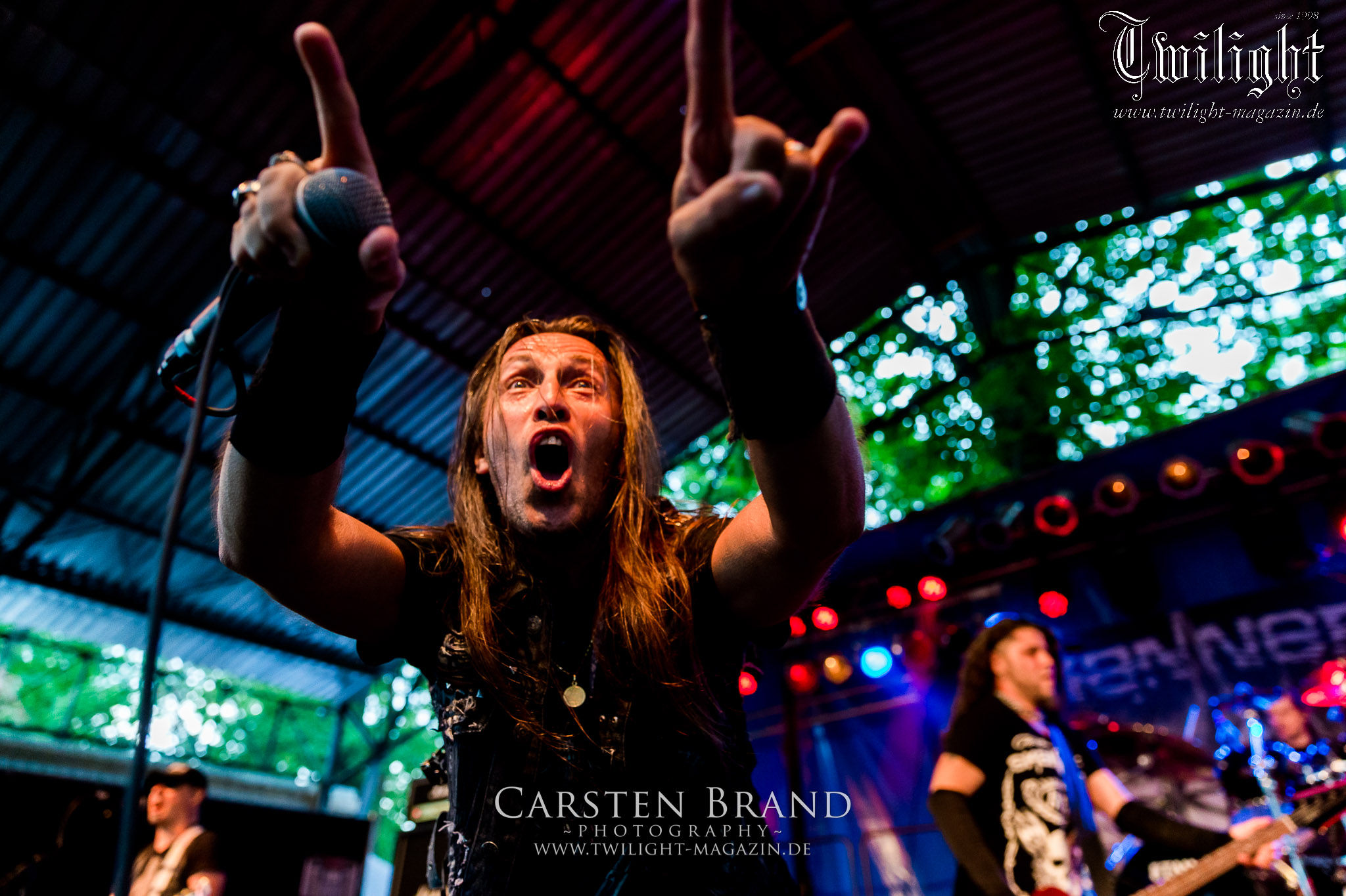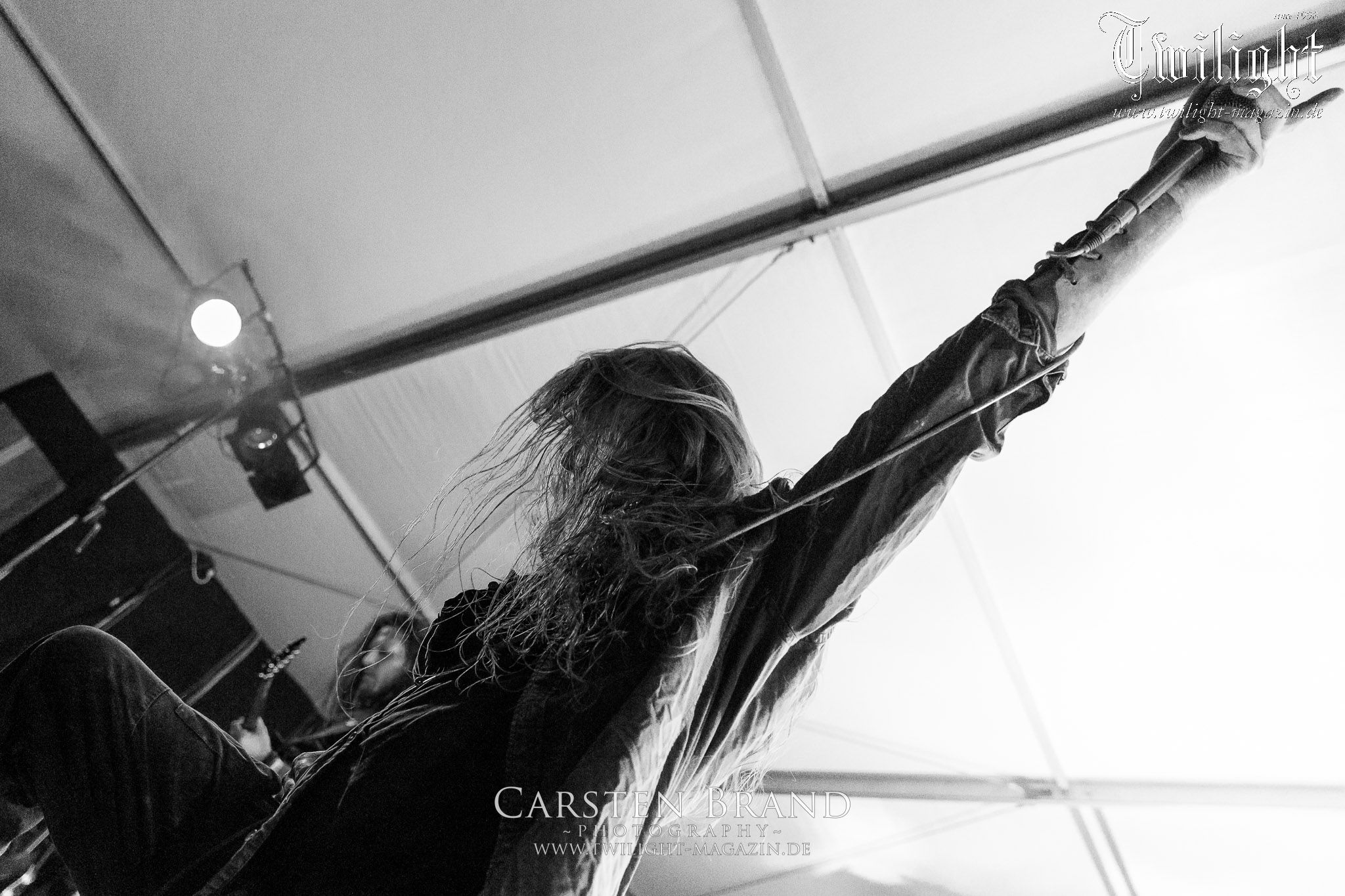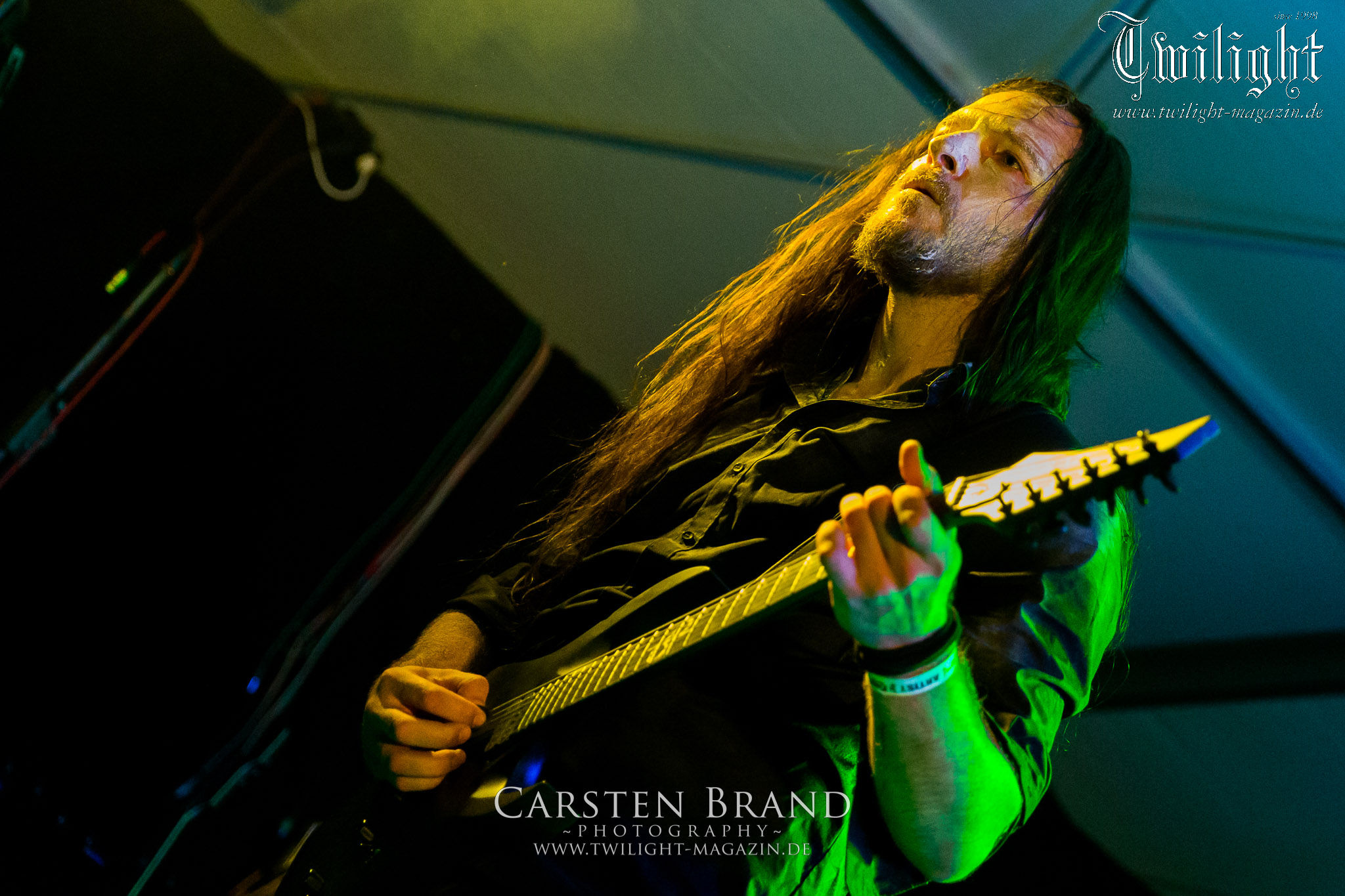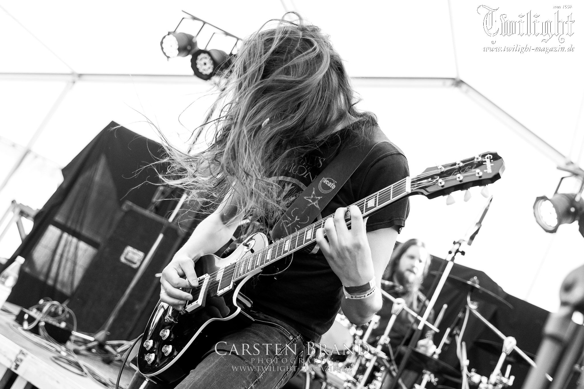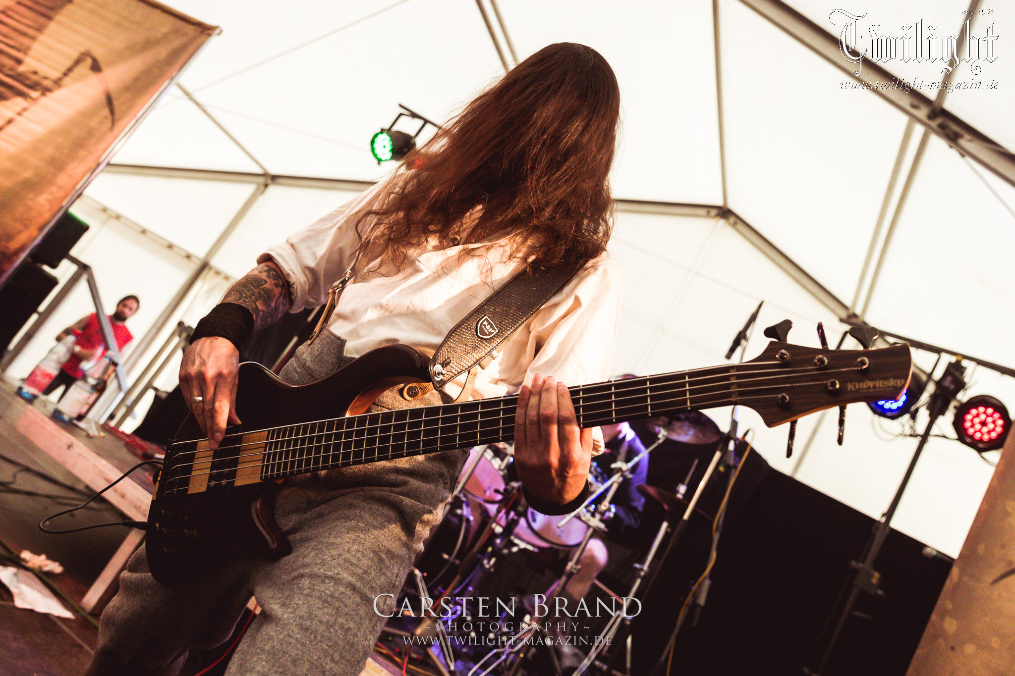 Zeit und Spielplan sind mittlerweile voran geschritten und schließlich wird auf der Hauptbühne mit Dark Sky Choir der Betrieb planmäßig wieder aufgenommen. Was an der einen Stelle für Klarheit sorgt, bedeutet im Zelt Ungewissheit und wirft immer wieder Fragen auf, da eigentlich nur klar ist, dass die Auftritte von SYLVANE und CRYPTS OF DESPAIR in die Timeline der Zeltbühne eingeschoben werden sollen, wobei Wandar wohl ihren Headliner-Status behalten sollen. Eine konkrete, aktualisierte Running Order wird aber weder online veröffentlicht und auch ein Aushang findet sich nirgends. Und das lässt verständlicherweise bei jenen, die sich vor allem auf die Gigs im Zelt gefreut hatten ordentlich Unmut und Ärger aufkommen. Ich nehme es sportlich und konzentriere mich auf die Hauptbühne. Ich bin nicht unbedingt glühender Verehrer von US-Heavy Metal aber DARK SKY CHOIR wissen mich live durchaus mit ihrer Frische, den technischen Finessen und einer ambitionierten Performance zu überzeugen. Die Mucke der Amis klingt modern, heavy und ist dabei teilweise sogar sehr straight und fast tanzbar. Ein leichter Thrash-Einschlag führt zu einer härtetechnischen Aufwertung, genauso wie das Organ von Brian Allen, der nicht nur klare Töne aus seiner Kehle holt, sondern dabei auch herrlich rauh klingen kann. Die Fähigkeiten der Instrumentalfraktion und das Zusammenspiel sind beeindruckend. Über Entertainer-Qualitäten verfügen alle Mitglieder. Eine Scheibe werde ich mir wohl nicht ins Regal stellen aber der Auftritt ist am Ende sehr viel mehr als nur eine Horizonterweiterung.