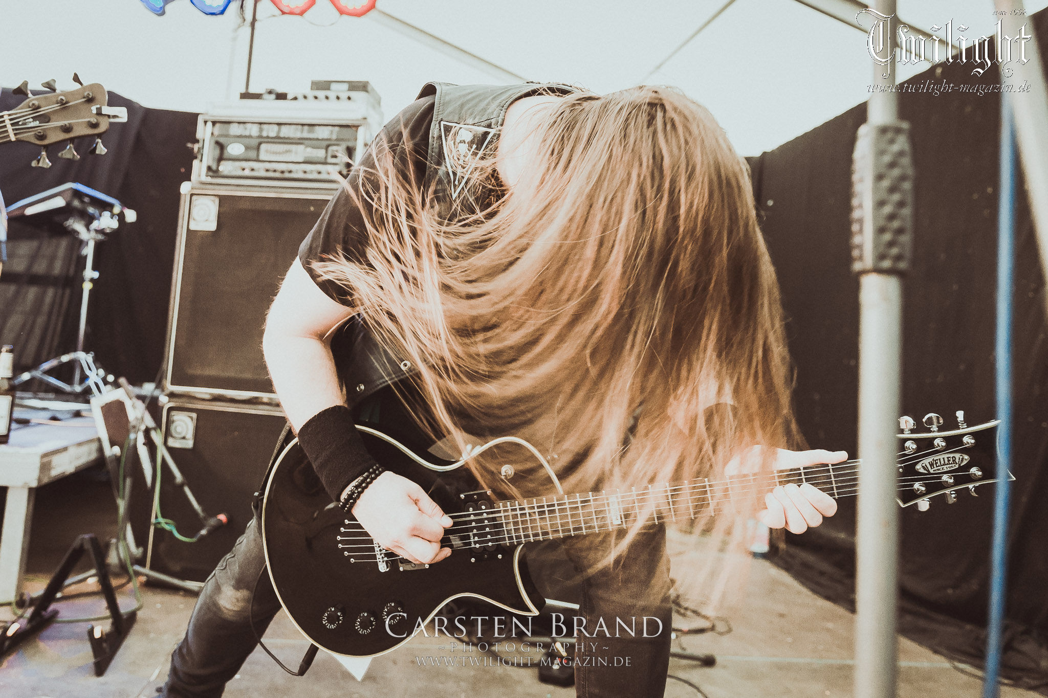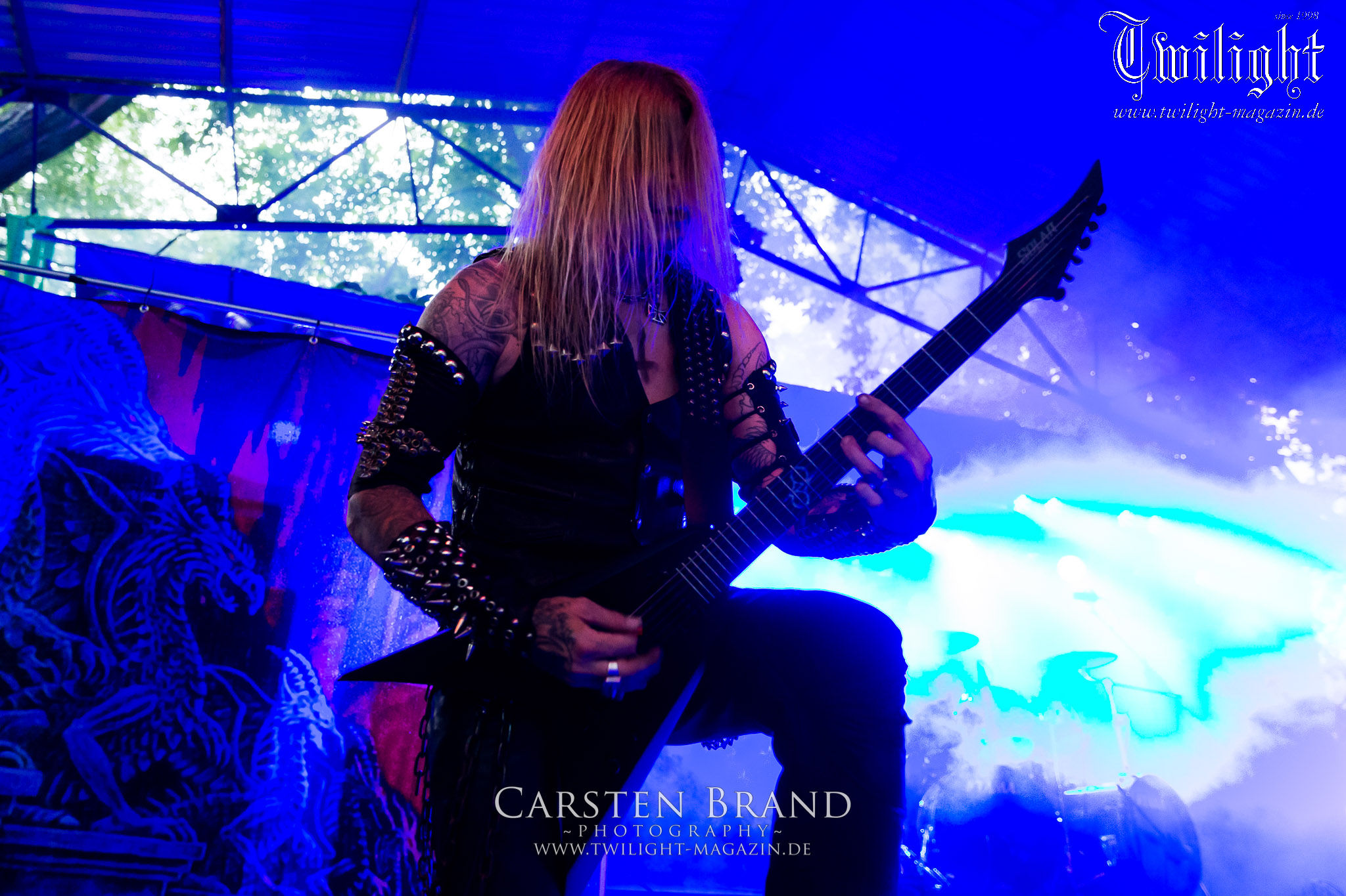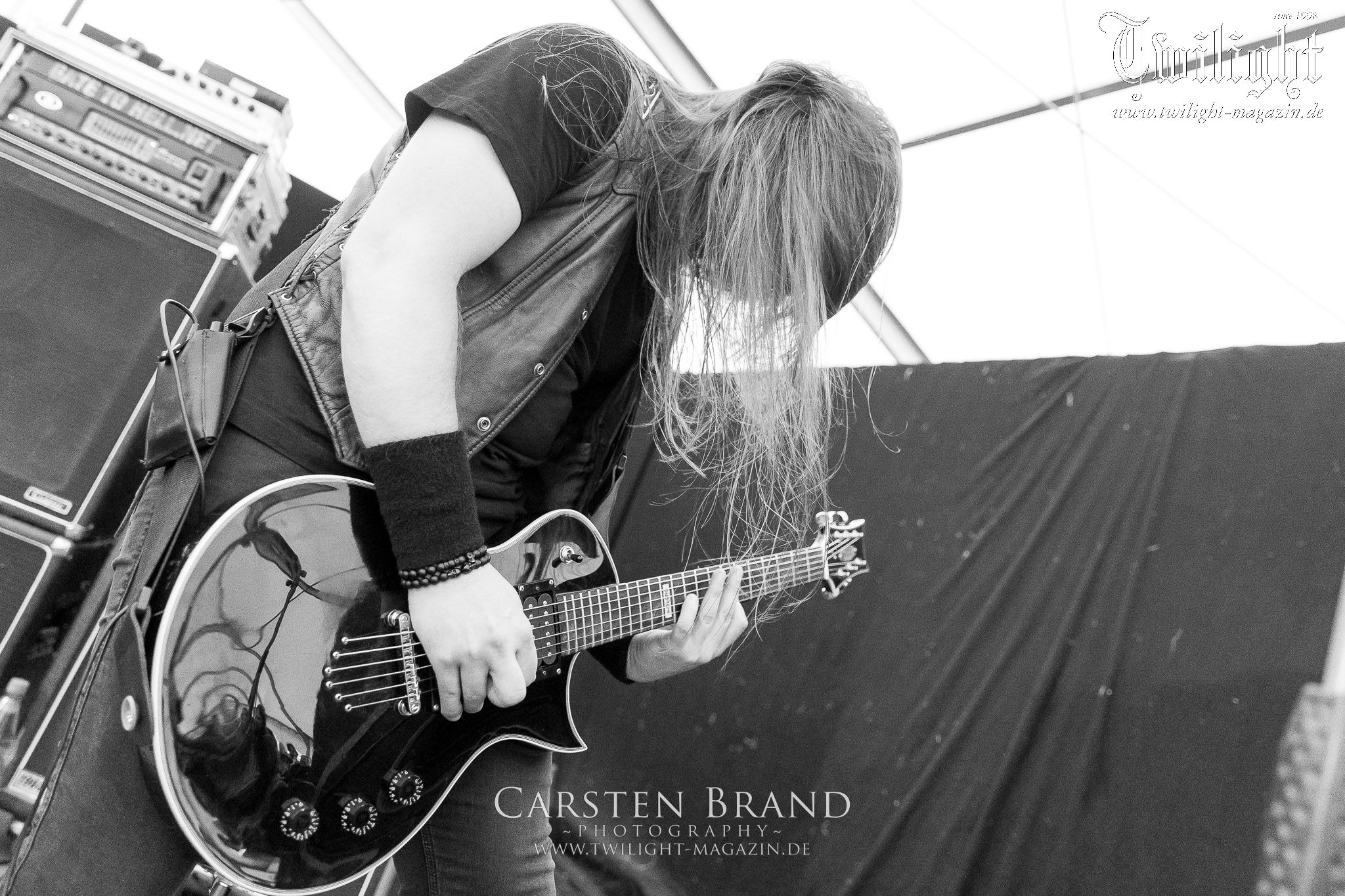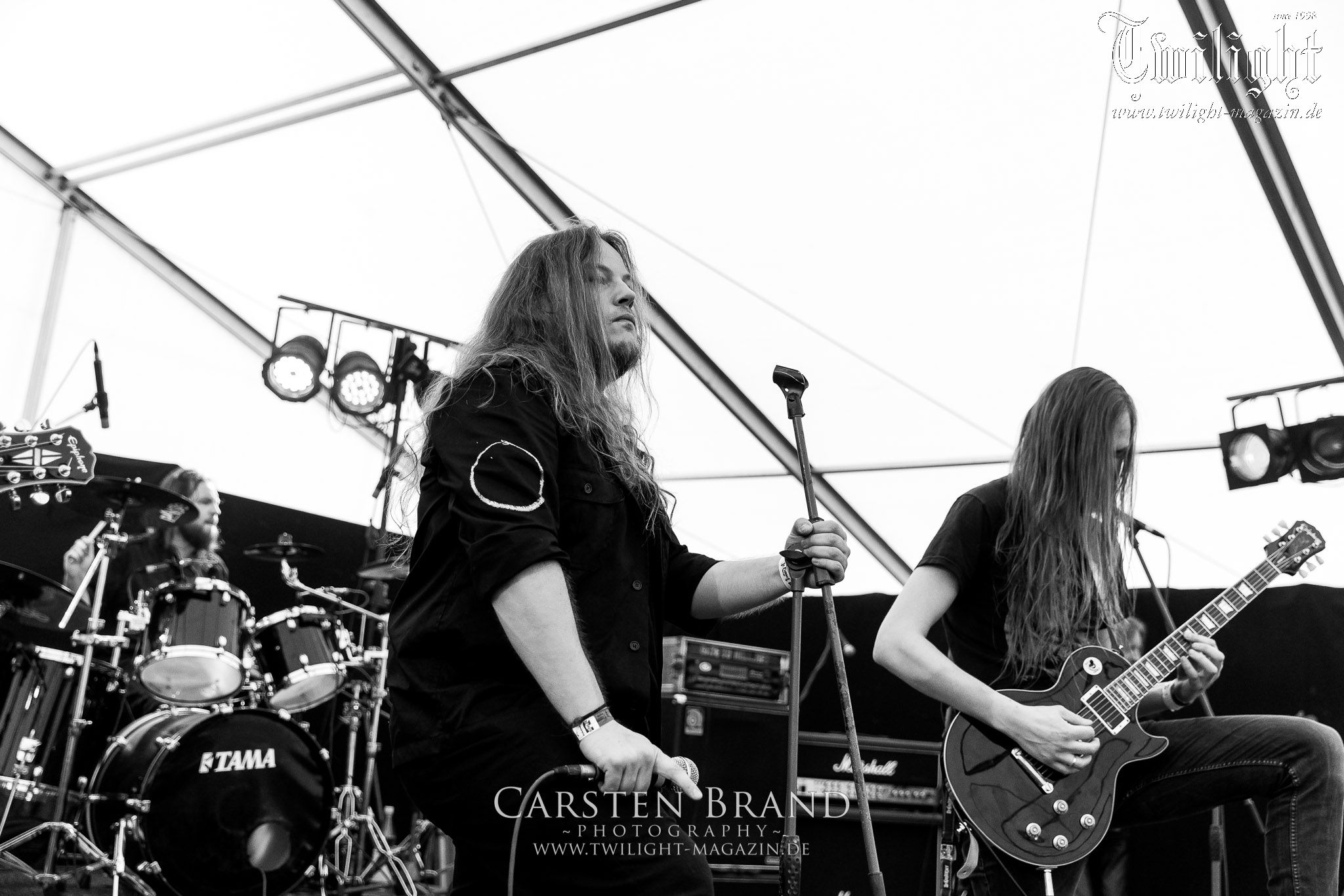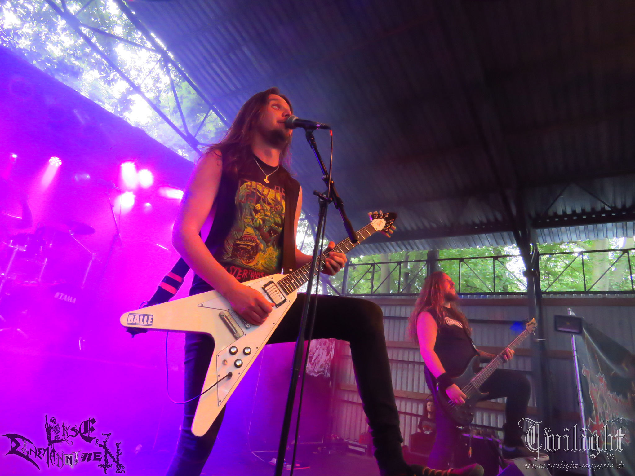 Zeit und Spielplan sind mittlerweile voran geschritten und schließlich wird auf der Hauptbühne mit Dark Sky Choir der Betrieb planmäßig wieder aufgenommen. Was an der einen Stelle für Klarheit sorgt, bedeutet im Zelt Ungewissheit und wirft immer wieder Fragen auf, da eigentlich nur klar ist, dass die Auftritte von SYLVANE und CRYPTS OF DESPAIR in die Timeline der Zeltbühne eingeschoben werden sollen, wobei Wandar wohl ihren Headliner-Status behalten sollen. Eine konkrete, aktualisierte Running Order wird aber weder online veröffentlicht und auch ein Aushang findet sich nirgends. Und das lässt verständlicherweise bei jenen, die sich vor allem auf die Gigs im Zelt gefreut hatten ordentlich Unmut und Ärger aufkommen. Ich nehme es sportlich und konzentriere mich auf die Hauptbühne. Ich bin nicht unbedingt glühender Verehrer von US-Heavy Metal aber DARK SKY CHOIR wissen mich live durchaus mit ihrer Frische, den technischen Finessen und einer ambitionierten Performance zu überzeugen. Die Mucke der Amis klingt modern, heavy und ist dabei teilweise sogar sehr straight und fast tanzbar. Ein leichter Thrash-Einschlag führt zu einer härtetechnischen Aufwertung, genauso wie das Organ von Brian Allen, der nicht nur klare Töne aus seiner Kehle holt, sondern dabei auch herrlich rauh klingen kann. Die Fähigkeiten der Instrumentalfraktion und das Zusammenspiel sind beeindruckend. Über Entertainer-Qualitäten verfügen alle Mitglieder. Eine Scheibe werde ich mir wohl nicht ins Regal stellen aber der Auftritt ist am Ende sehr viel mehr als nur eine Horizonterweiterung.