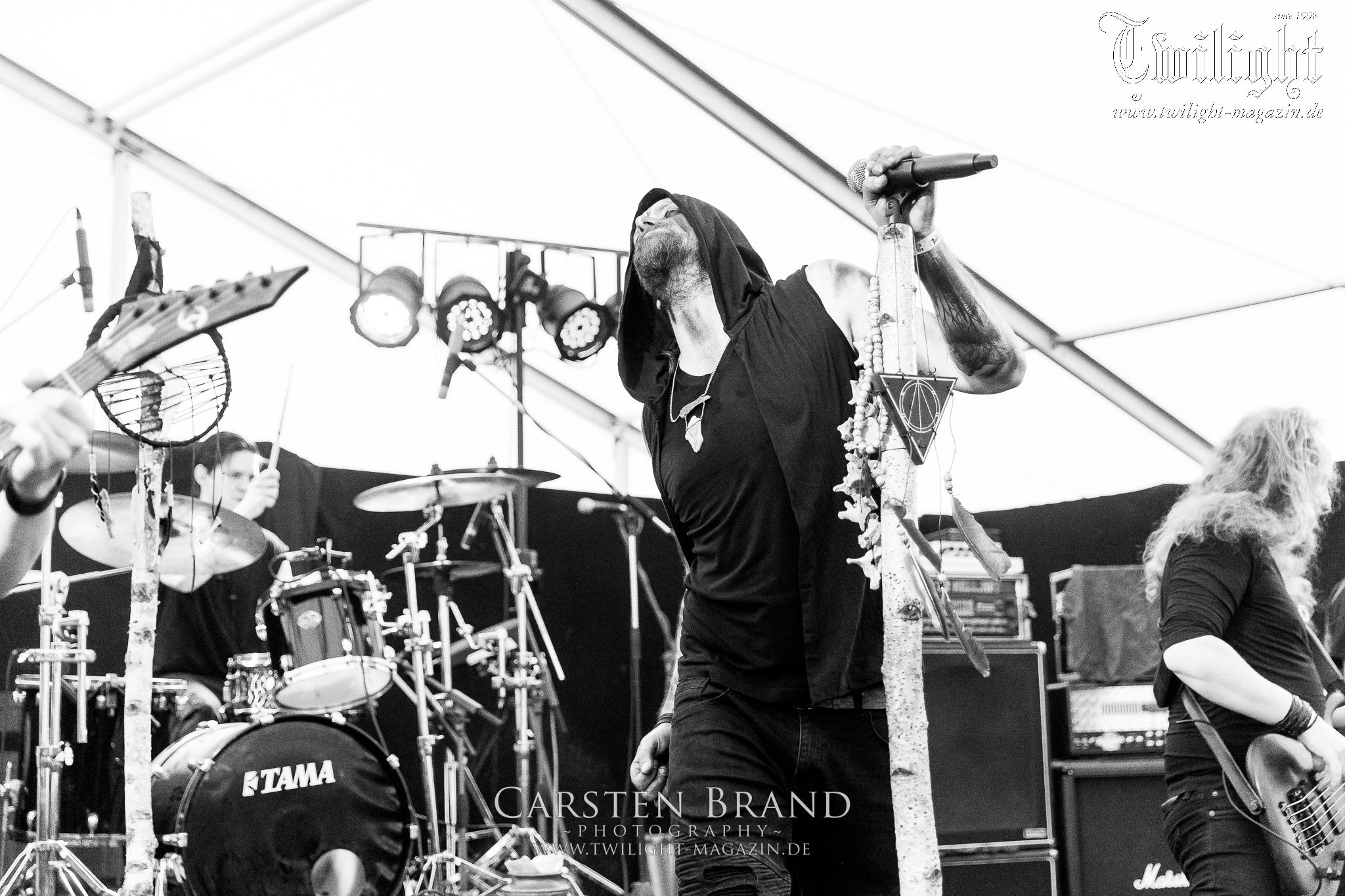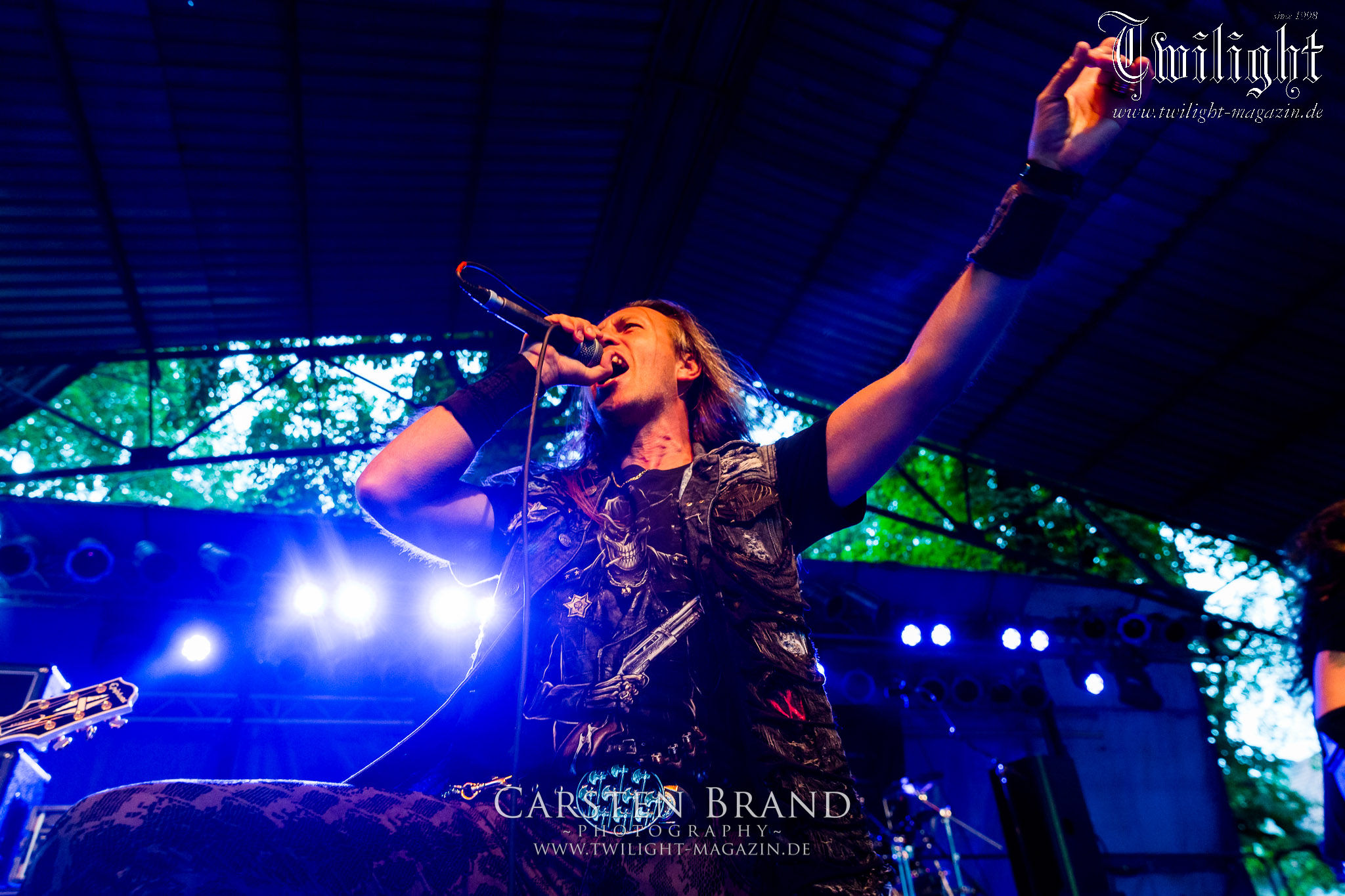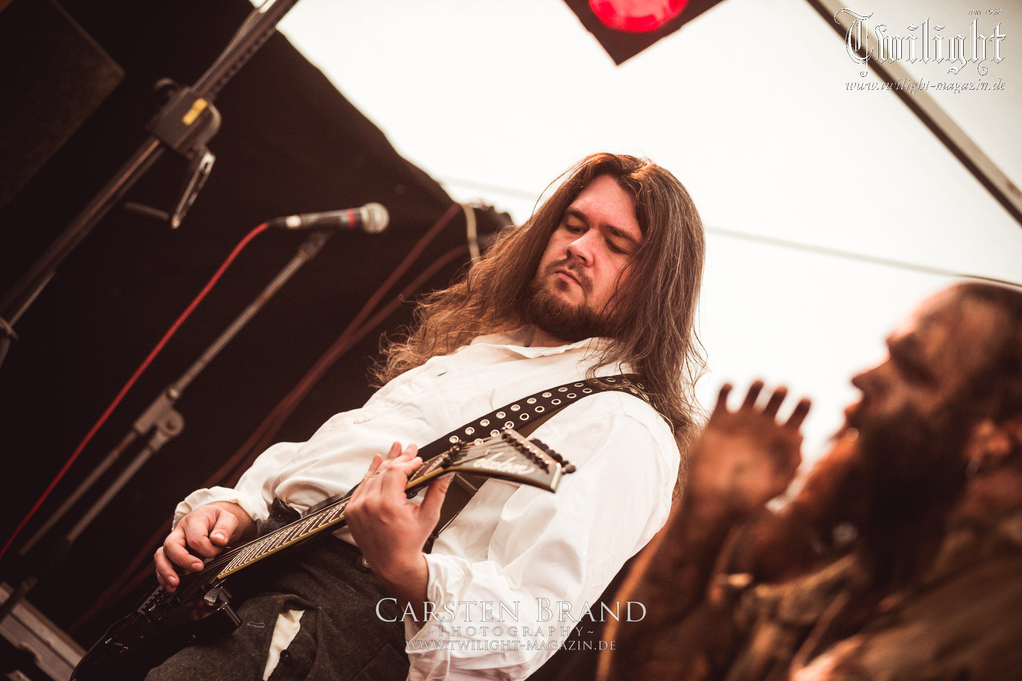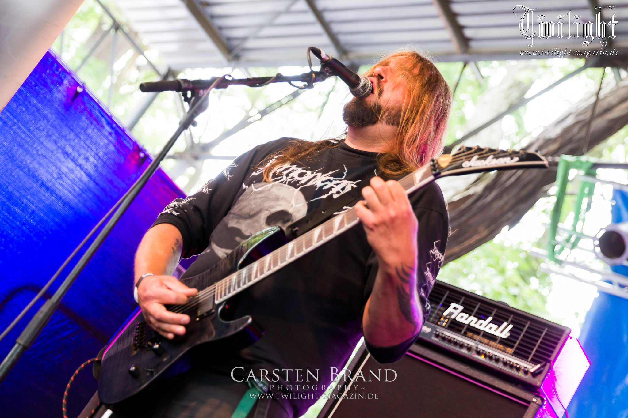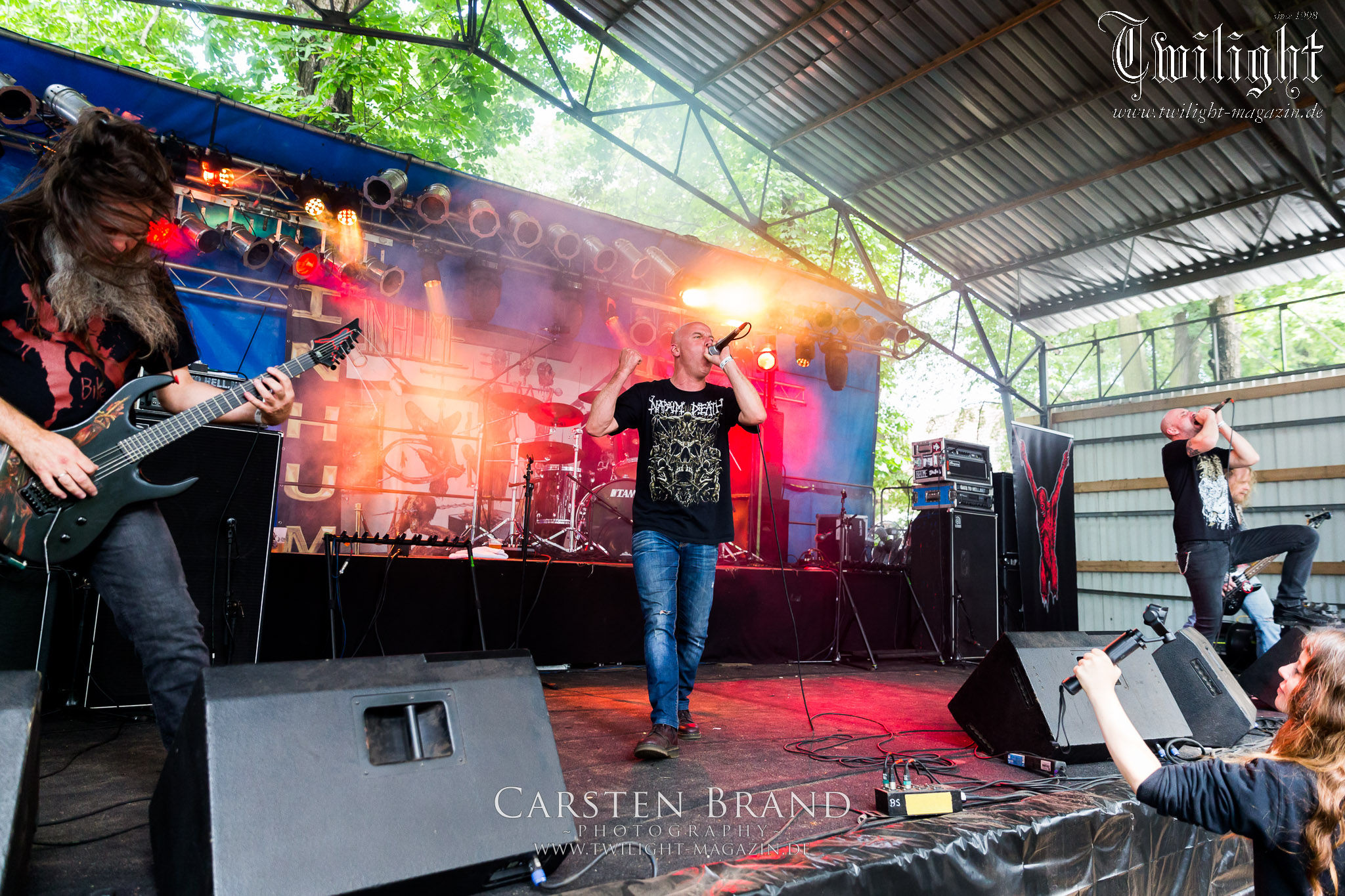 Zeit und Spielplan sind mittlerweile voran geschritten und schließlich wird auf der Hauptbühne mit Dark Sky Choir der Betrieb planmäßig wieder aufgenommen. Was an der einen Stelle für Klarheit sorgt, bedeutet im Zelt Ungewissheit und wirft immer wieder Fragen auf, da eigentlich nur klar ist, dass die Auftritte von SYLVANE und CRYPTS OF DESPAIR in die Timeline der Zeltbühne eingeschoben werden sollen, wobei Wandar wohl ihren Headliner-Status behalten sollen. Eine konkrete, aktualisierte Running Order wird aber weder online veröffentlicht und auch ein Aushang findet sich nirgends. Und das lässt verständlicherweise bei jenen, die sich vor allem auf die Gigs im Zelt gefreut hatten ordentlich Unmut und Ärger aufkommen. Ich nehme es sportlich und konzentriere mich auf die Hauptbühne. Ich bin nicht unbedingt glühender Verehrer von US-Heavy Metal aber DARK SKY CHOIR wissen mich live durchaus mit ihrer Frische, den technischen Finessen und einer ambitionierten Performance zu überzeugen. Die Mucke der Amis klingt modern, heavy und ist dabei teilweise sogar sehr straight und fast tanzbar. Ein leichter Thrash-Einschlag führt zu einer härtetechnischen Aufwertung, genauso wie das Organ von Brian Allen, der nicht nur klare Töne aus seiner Kehle holt, sondern dabei auch herrlich rauh klingen kann. Die Fähigkeiten der Instrumentalfraktion und das Zusammenspiel sind beeindruckend. Über Entertainer-Qualitäten verfügen alle Mitglieder. Eine Scheibe werde ich mir wohl nicht ins Regal stellen aber der Auftritt ist am Ende sehr viel mehr als nur eine Horizonterweiterung.