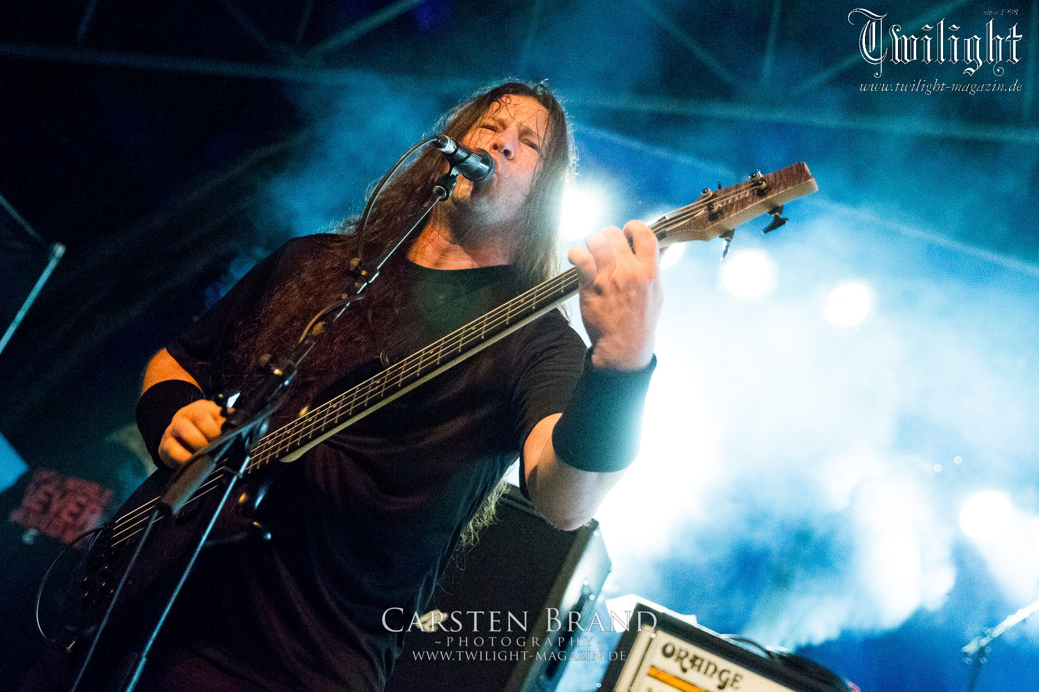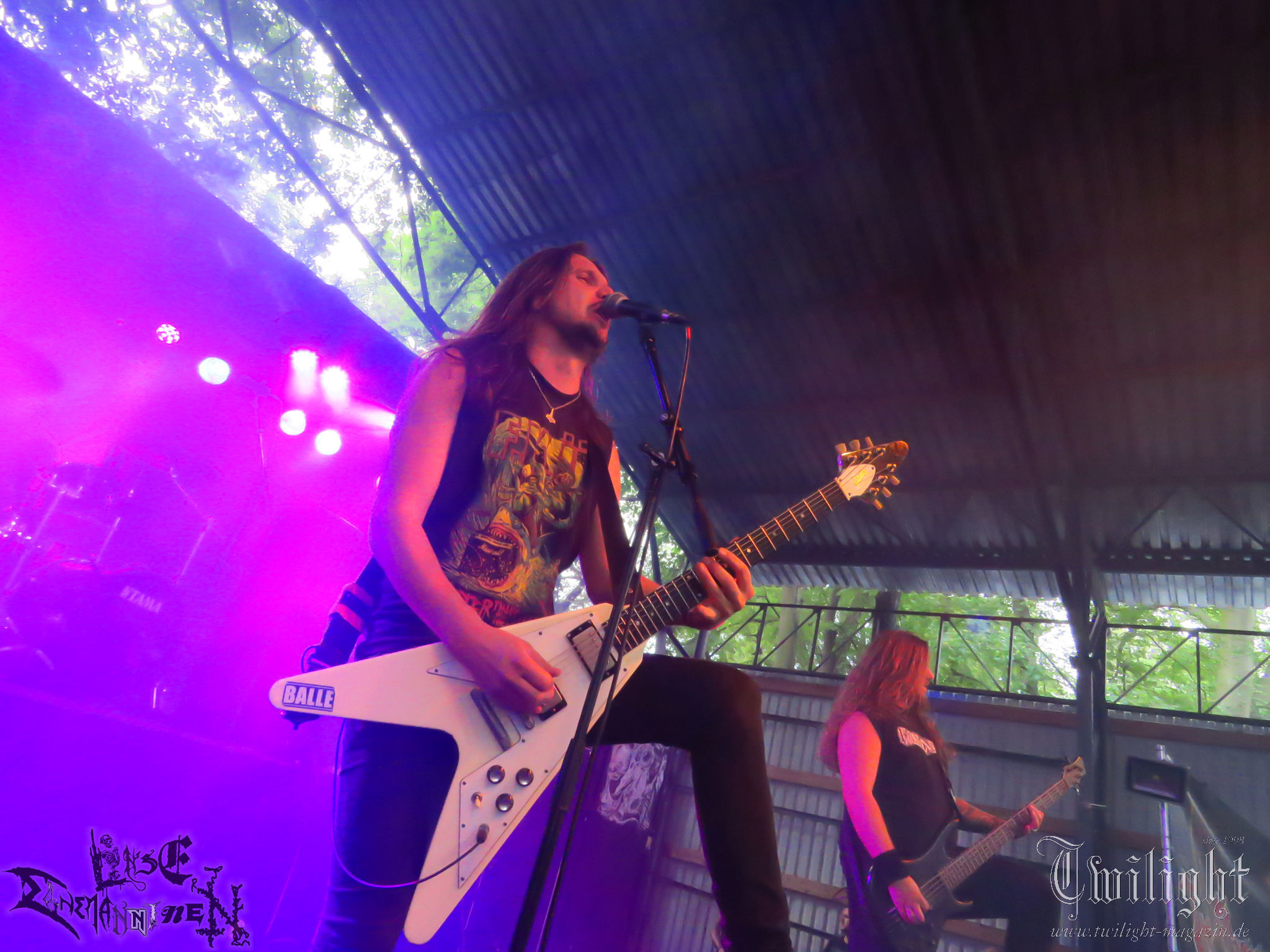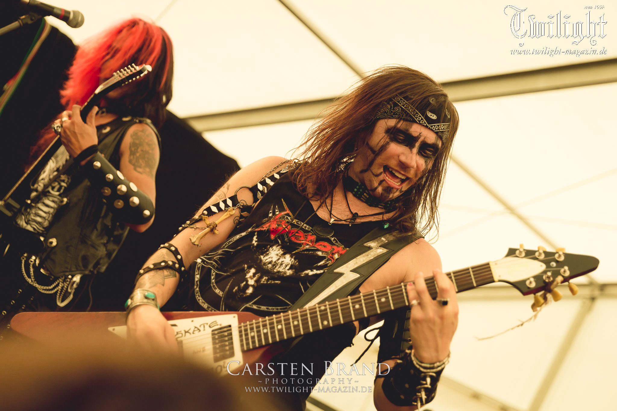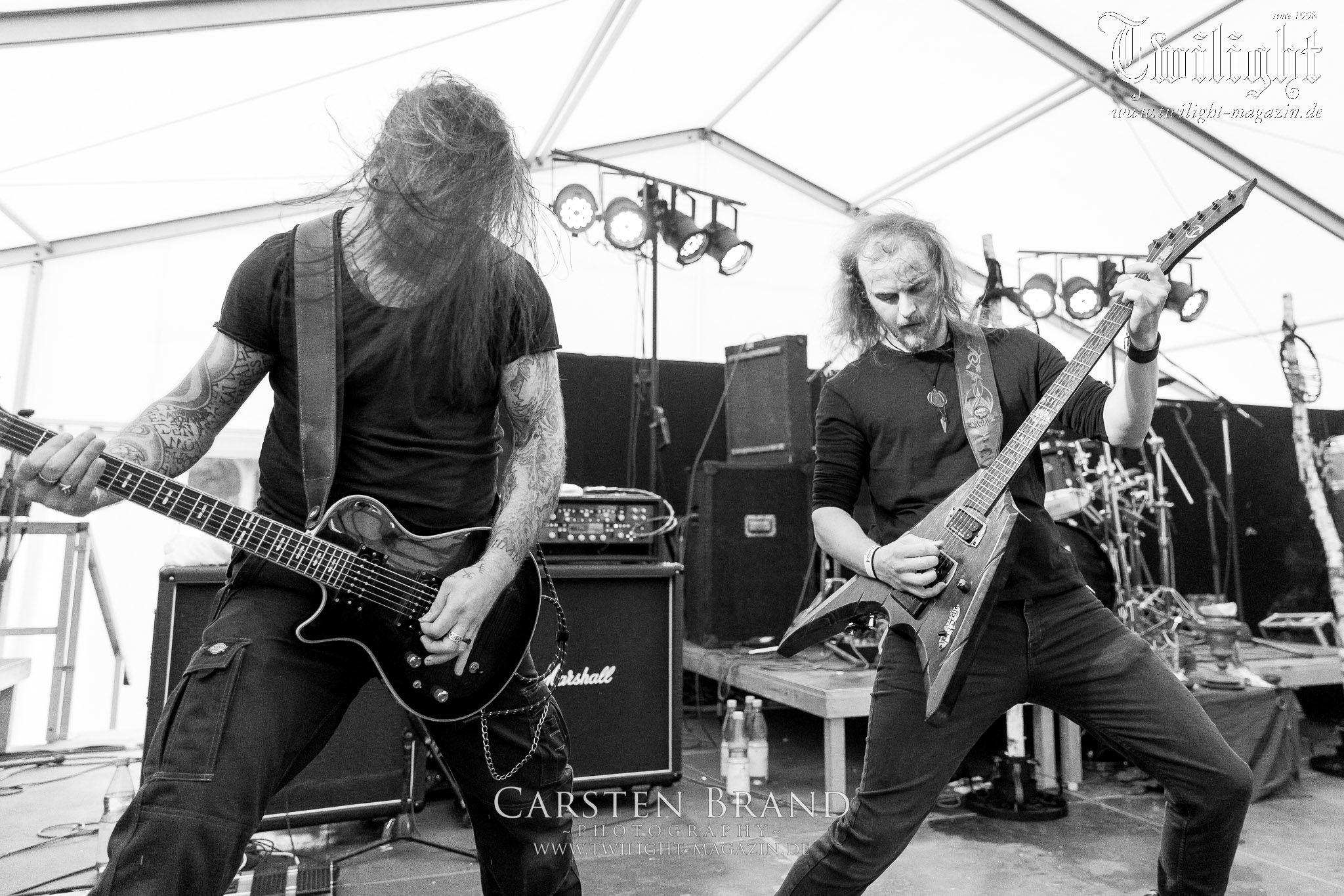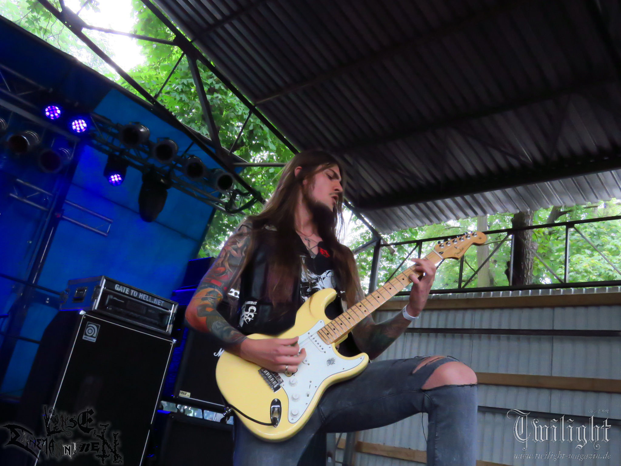 Zeit und Spielplan sind mittlerweile voran geschritten und schließlich wird auf der Hauptbühne mit Dark Sky Choir der Betrieb planmäßig wieder aufgenommen. Was an der einen Stelle für Klarheit sorgt, bedeutet im Zelt Ungewissheit und wirft immer wieder Fragen auf, da eigentlich nur klar ist, dass die Auftritte von SYLVANE und CRYPTS OF DESPAIR in die Timeline der Zeltbühne eingeschoben werden sollen, wobei Wandar wohl ihren Headliner-Status behalten sollen. Eine konkrete, aktualisierte Running Order wird aber weder online veröffentlicht und auch ein Aushang findet sich nirgends. Und das lässt verständlicherweise bei jenen, die sich vor allem auf die Gigs im Zelt gefreut hatten ordentlich Unmut und Ärger aufkommen. Ich nehme es sportlich und konzentriere mich auf die Hauptbühne. Ich bin nicht unbedingt glühender Verehrer von US-Heavy Metal aber DARK SKY CHOIR wissen mich live durchaus mit ihrer Frische, den technischen Finessen und einer ambitionierten Performance zu überzeugen. Die Mucke der Amis klingt modern, heavy und ist dabei teilweise sogar sehr straight und fast tanzbar. Ein leichter Thrash-Einschlag führt zu einer härtetechnischen Aufwertung, genauso wie das Organ von Brian Allen, der nicht nur klare Töne aus seiner Kehle holt, sondern dabei auch herrlich rauh klingen kann. Die Fähigkeiten der Instrumentalfraktion und das Zusammenspiel sind beeindruckend. Über Entertainer-Qualitäten verfügen alle Mitglieder. Eine Scheibe werde ich mir wohl nicht ins Regal stellen aber der Auftritt ist am Ende sehr viel mehr als nur eine Horizonterweiterung.