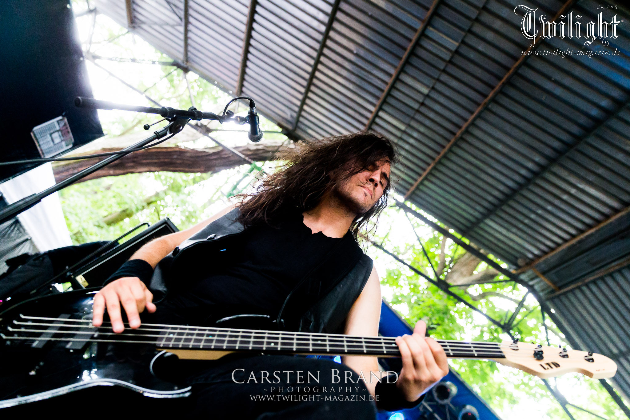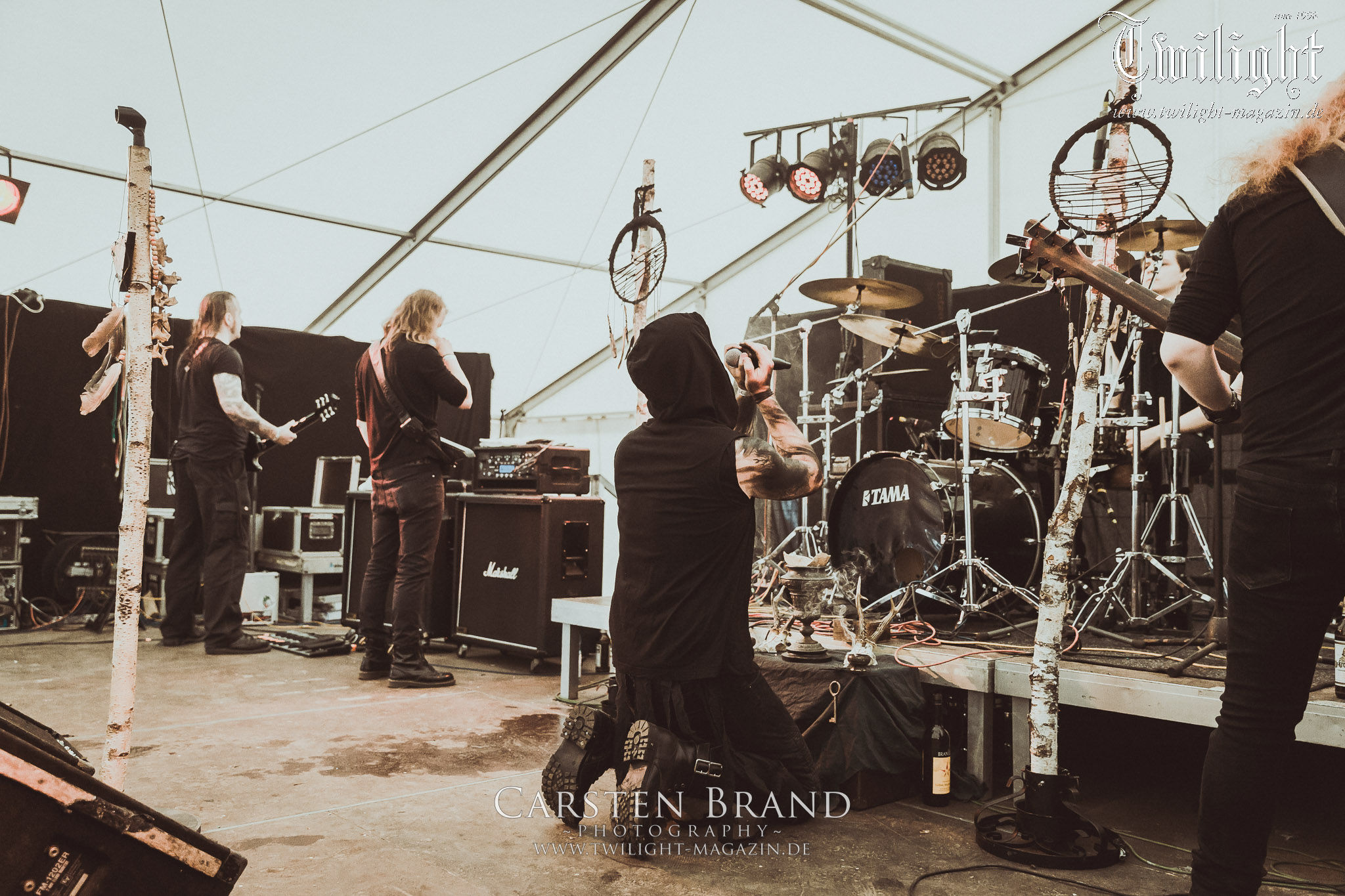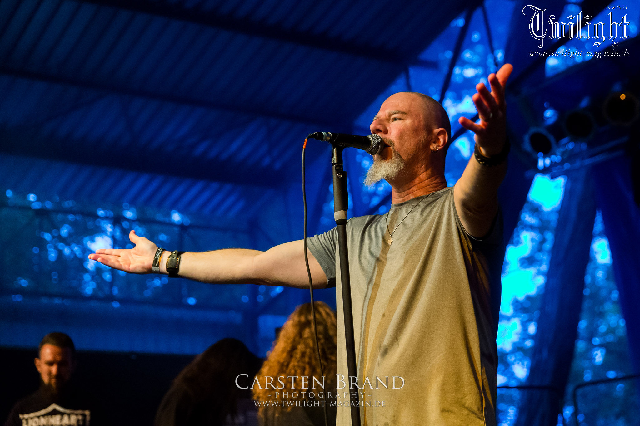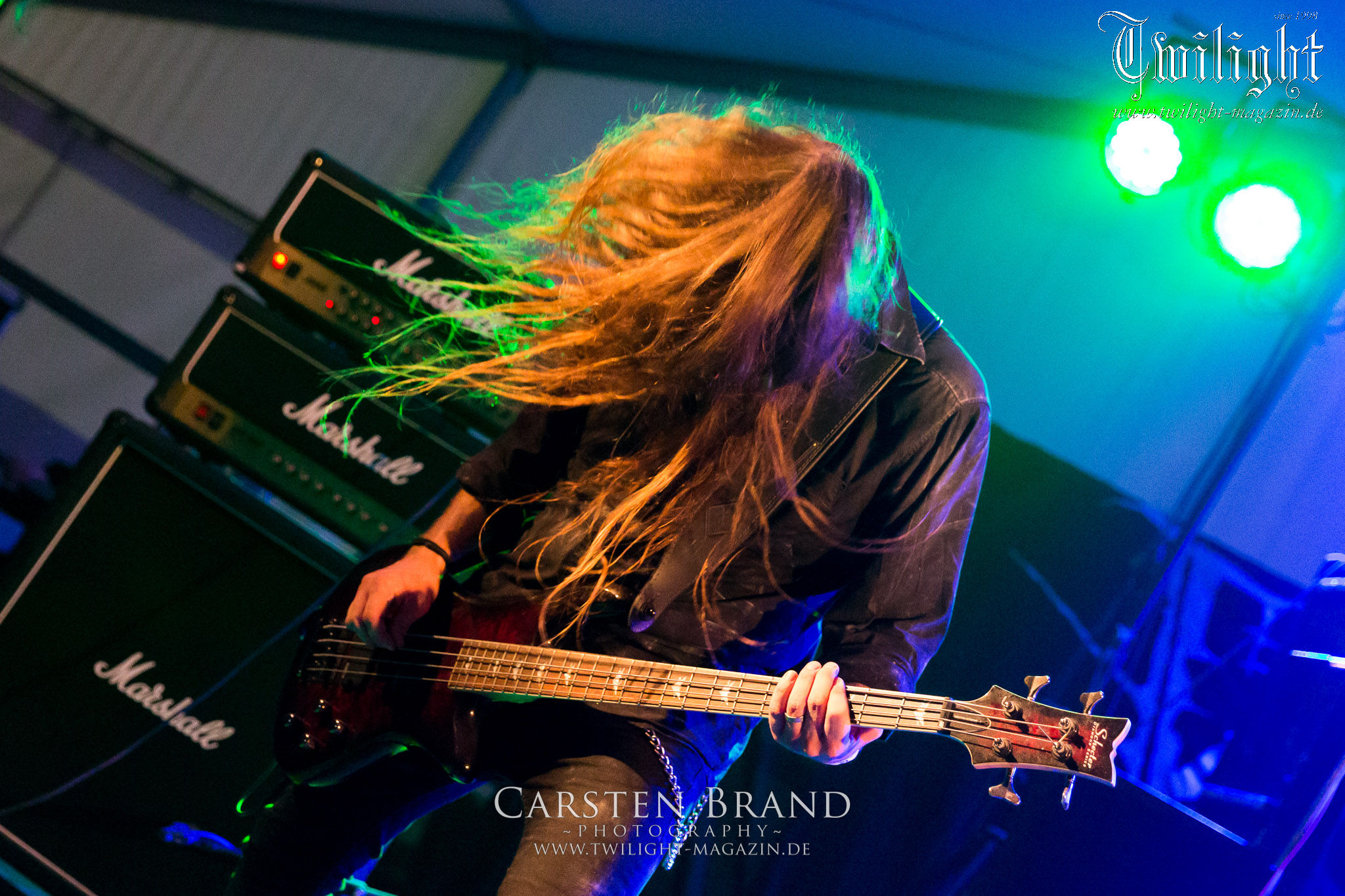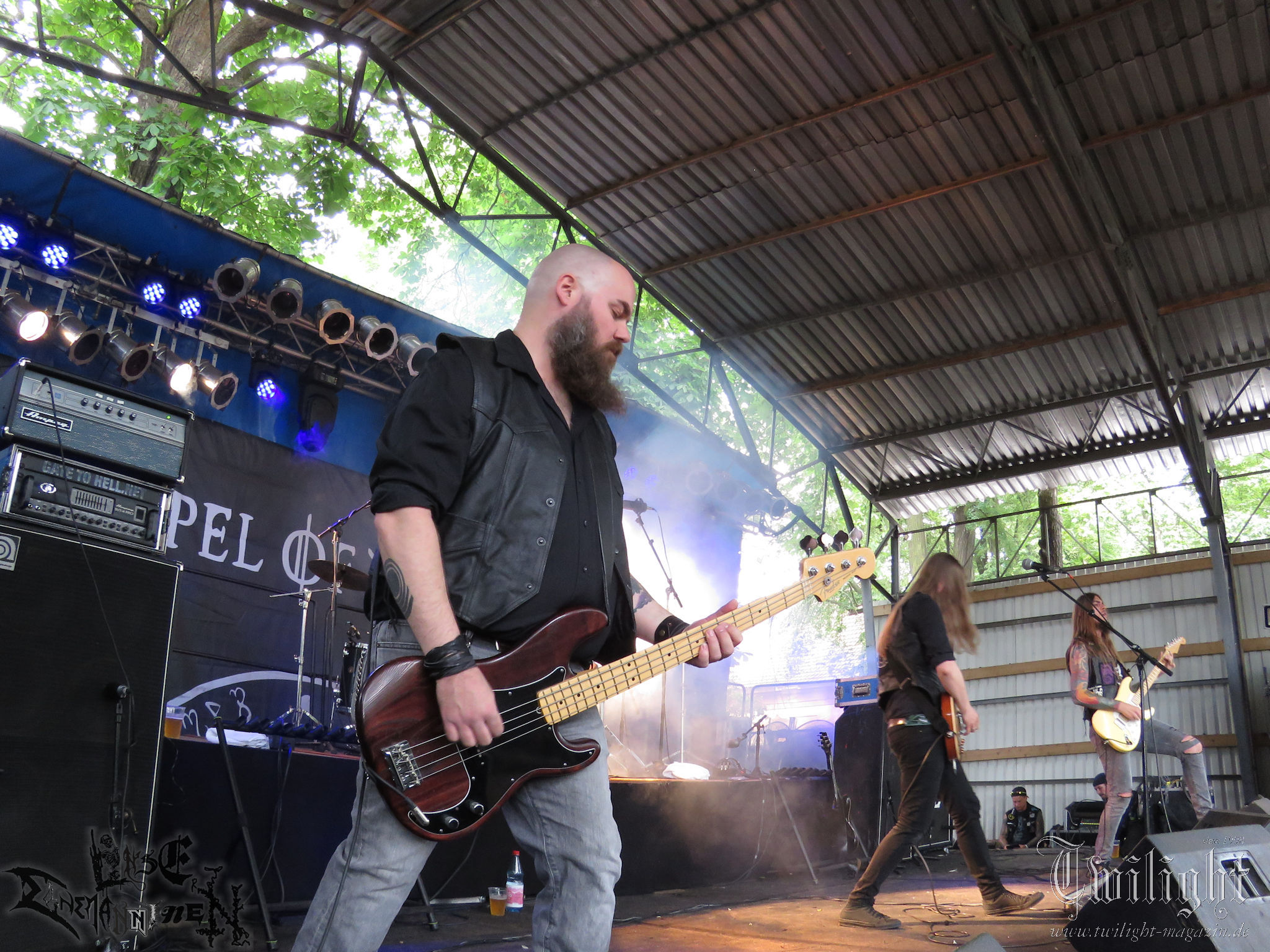 Zeit und Spielplan sind mittlerweile voran geschritten und schließlich wird auf der Hauptbühne mit Dark Sky Choir der Betrieb planmäßig wieder aufgenommen. Was an der einen Stelle für Klarheit sorgt, bedeutet im Zelt Ungewissheit und wirft immer wieder Fragen auf, da eigentlich nur klar ist, dass die Auftritte von SYLVANE und CRYPTS OF DESPAIR in die Timeline der Zeltbühne eingeschoben werden sollen, wobei Wandar wohl ihren Headliner-Status behalten sollen. Eine konkrete, aktualisierte Running Order wird aber weder online veröffentlicht und auch ein Aushang findet sich nirgends. Und das lässt verständlicherweise bei jenen, die sich vor allem auf die Gigs im Zelt gefreut hatten ordentlich Unmut und Ärger aufkommen. Ich nehme es sportlich und konzentriere mich auf die Hauptbühne. Ich bin nicht unbedingt glühender Verehrer von US-Heavy Metal aber DARK SKY CHOIR wissen mich live durchaus mit ihrer Frische, den technischen Finessen und einer ambitionierten Performance zu überzeugen. Die Mucke der Amis klingt modern, heavy und ist dabei teilweise sogar sehr straight und fast tanzbar. Ein leichter Thrash-Einschlag führt zu einer härtetechnischen Aufwertung, genauso wie das Organ von Brian Allen, der nicht nur klare Töne aus seiner Kehle holt, sondern dabei auch herrlich rauh klingen kann. Die Fähigkeiten der Instrumentalfraktion und das Zusammenspiel sind beeindruckend. Über Entertainer-Qualitäten verfügen alle Mitglieder. Eine Scheibe werde ich mir wohl nicht ins Regal stellen aber der Auftritt ist am Ende sehr viel mehr als nur eine Horizonterweiterung.