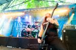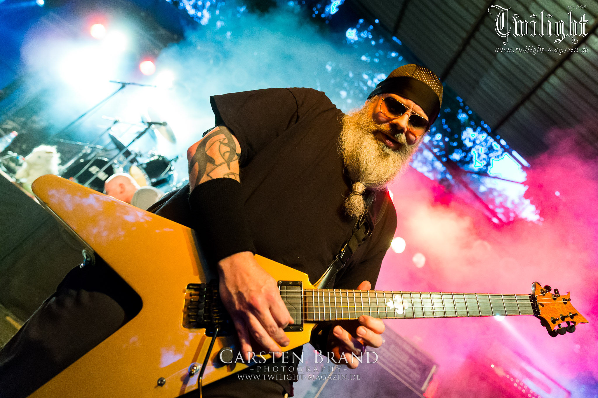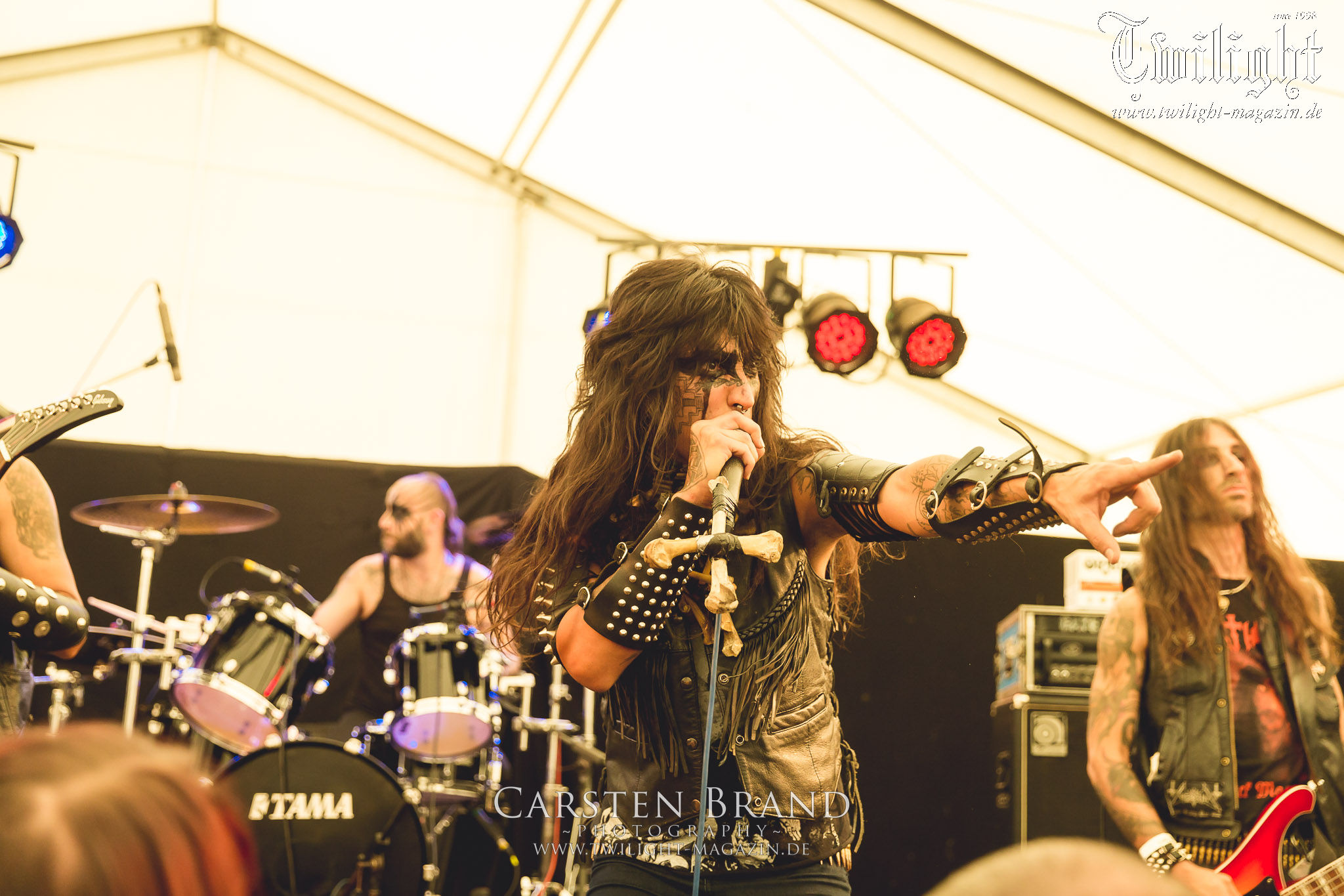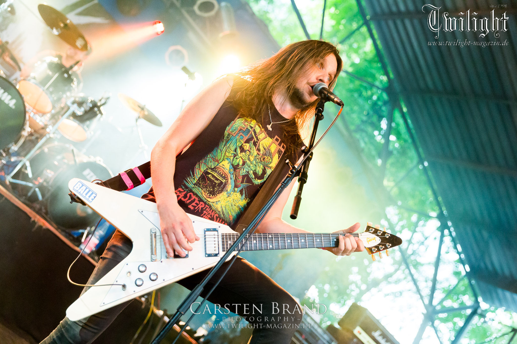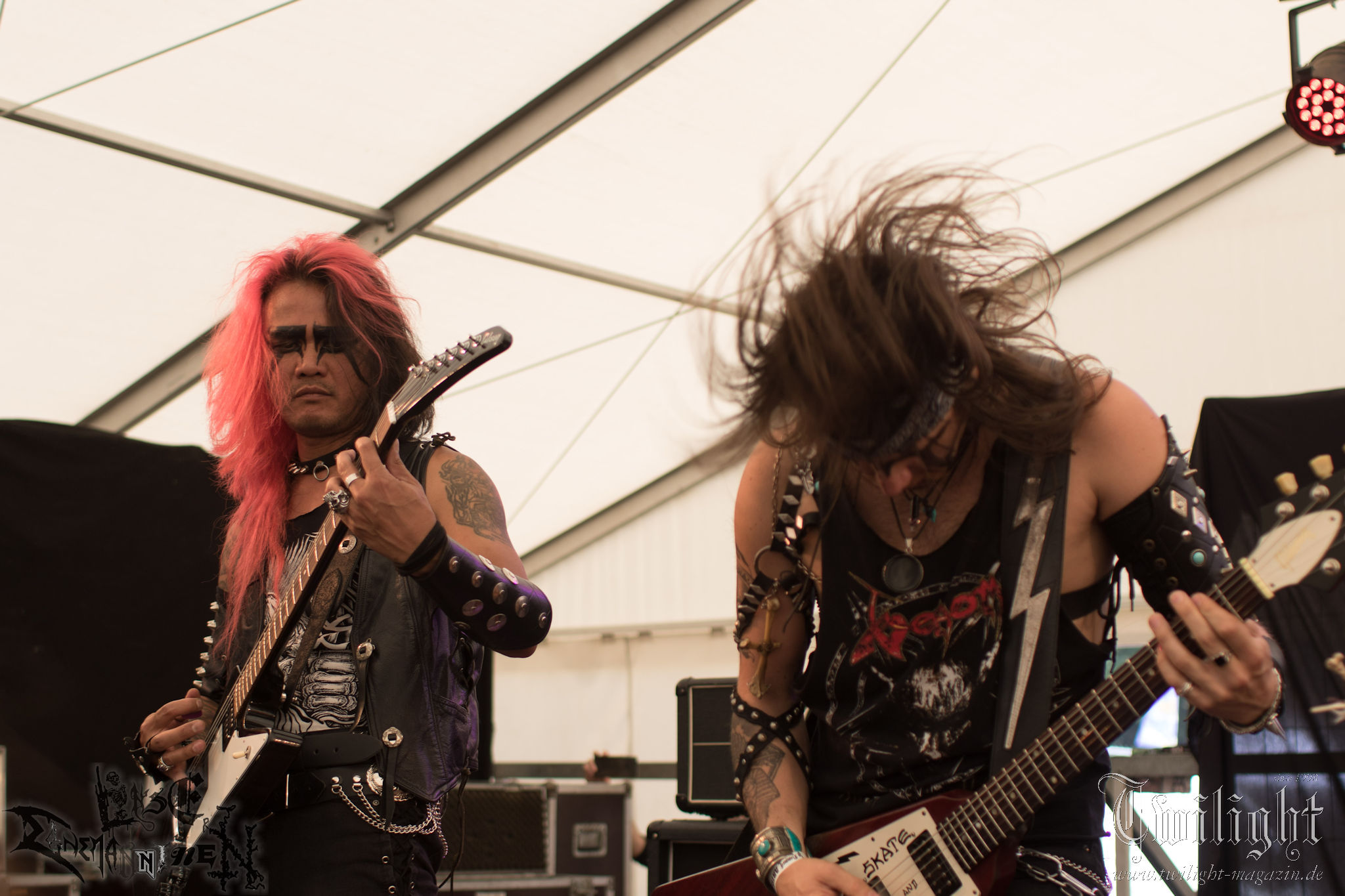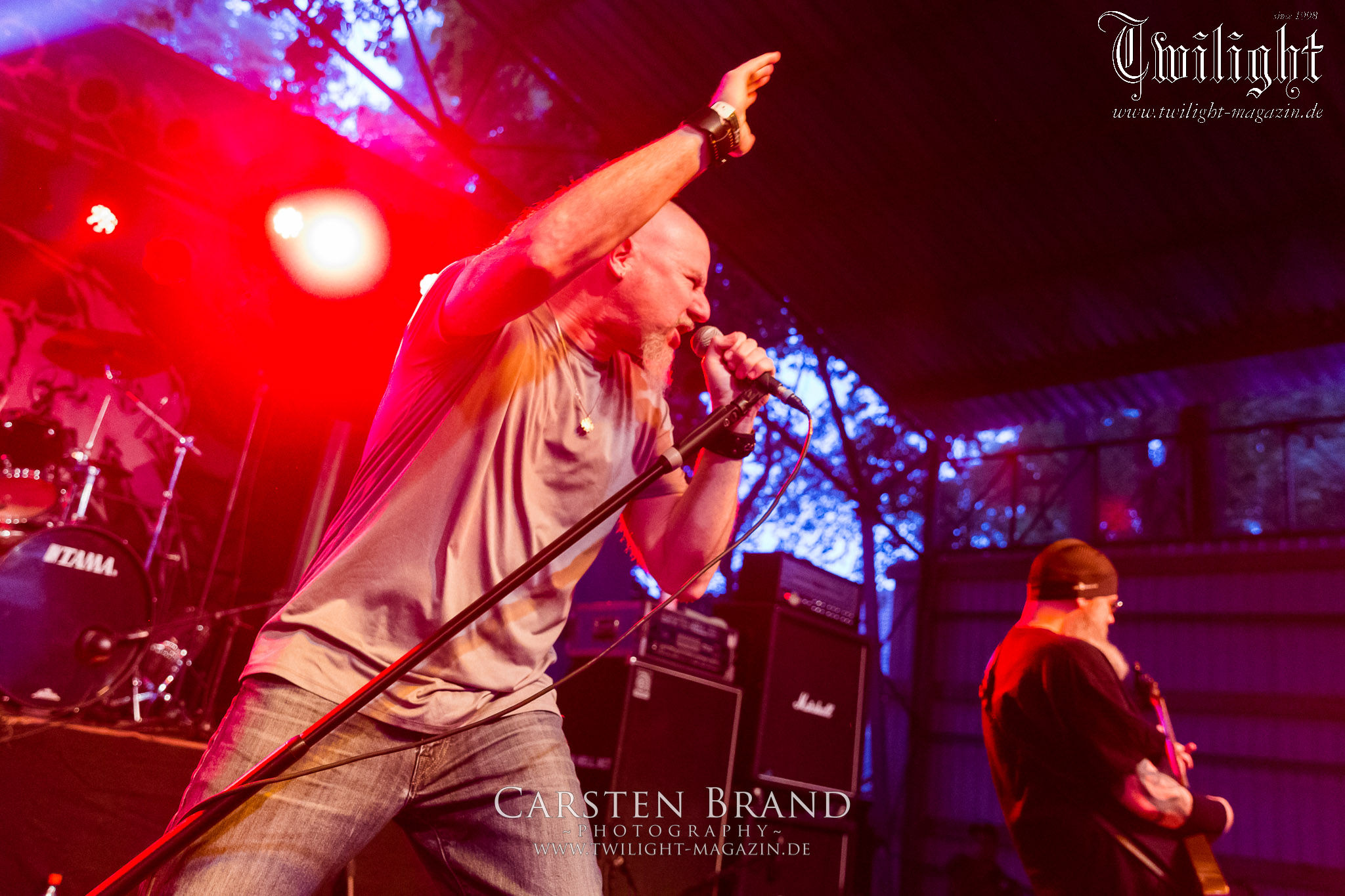 Zeit und Spielplan sind mittlerweile voran geschritten und schließlich wird auf der Hauptbühne mit Dark Sky Choir der Betrieb planmäßig wieder aufgenommen. Was an der einen Stelle für Klarheit sorgt, bedeutet im Zelt Ungewissheit und wirft immer wieder Fragen auf, da eigentlich nur klar ist, dass die Auftritte von SYLVANE und CRYPTS OF DESPAIR in die Timeline der Zeltbühne eingeschoben werden sollen, wobei Wandar wohl ihren Headliner-Status behalten sollen. Eine konkrete, aktualisierte Running Order wird aber weder online veröffentlicht und auch ein Aushang findet sich nirgends. Und das lässt verständlicherweise bei jenen, die sich vor allem auf die Gigs im Zelt gefreut hatten ordentlich Unmut und Ärger aufkommen. Ich nehme es sportlich und konzentriere mich auf die Hauptbühne. Ich bin nicht unbedingt glühender Verehrer von US-Heavy Metal aber DARK SKY CHOIR wissen mich live durchaus mit ihrer Frische, den technischen Finessen und einer ambitionierten Performance zu überzeugen. Die Mucke der Amis klingt modern, heavy und ist dabei teilweise sogar sehr straight und fast tanzbar. Ein leichter Thrash-Einschlag führt zu einer härtetechnischen Aufwertung, genauso wie das Organ von Brian Allen, der nicht nur klare Töne aus seiner Kehle holt, sondern dabei auch herrlich rauh klingen kann. Die Fähigkeiten der Instrumentalfraktion und das Zusammenspiel sind beeindruckend. Über Entertainer-Qualitäten verfügen alle Mitglieder. Eine Scheibe werde ich mir wohl nicht ins Regal stellen aber der Auftritt ist am Ende sehr viel mehr als nur eine Horizonterweiterung.
