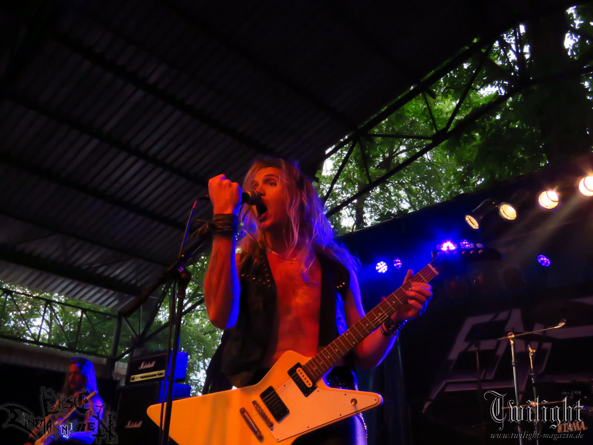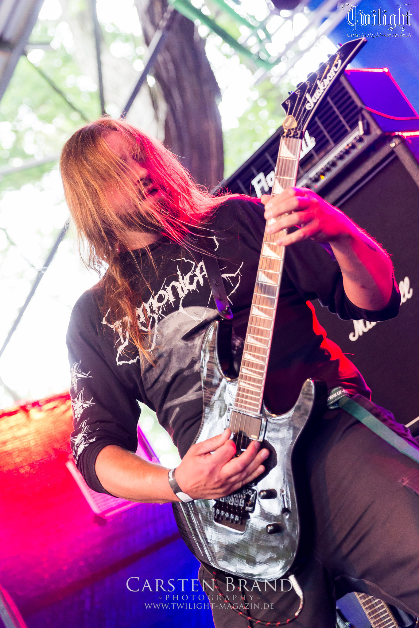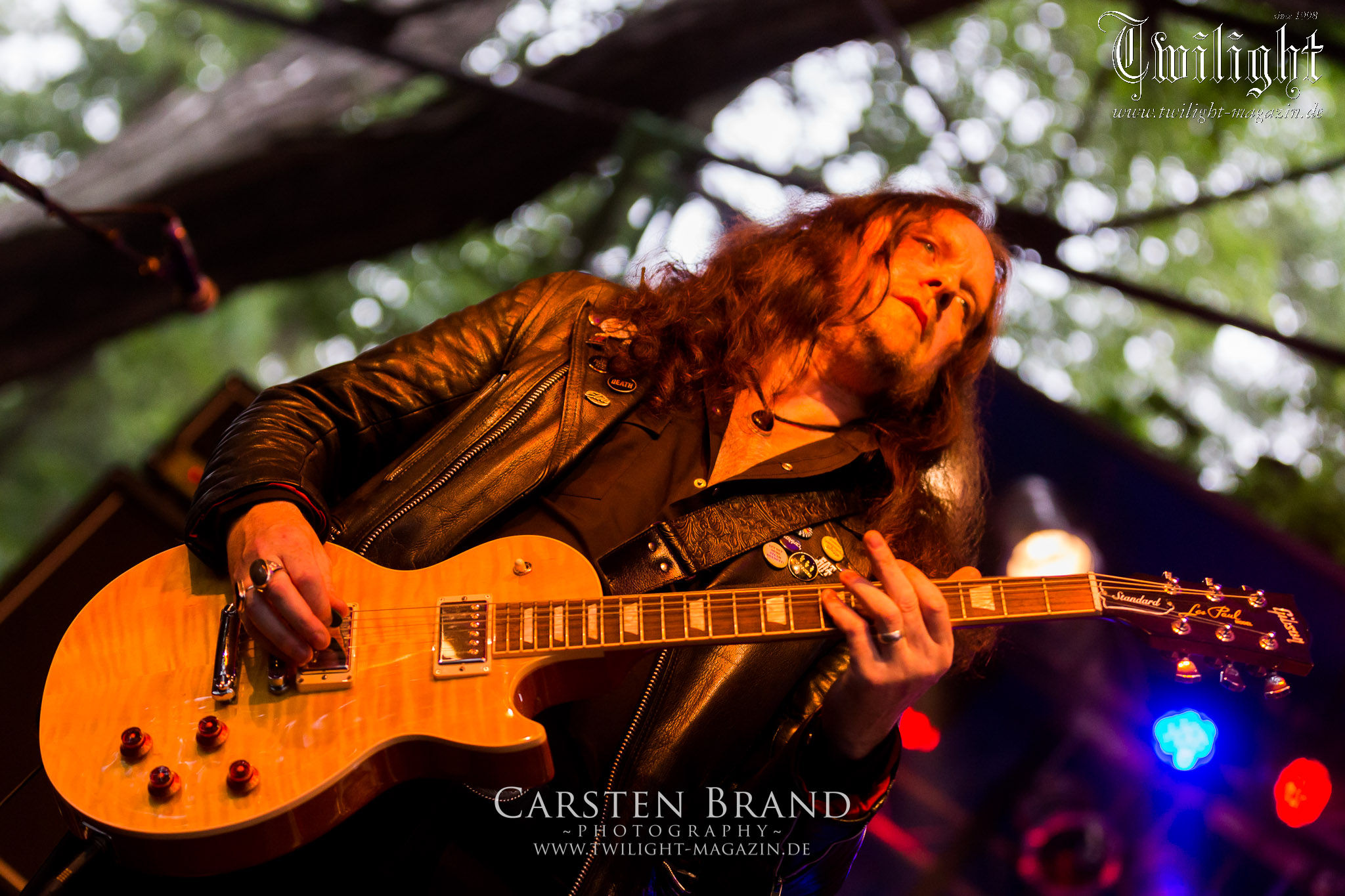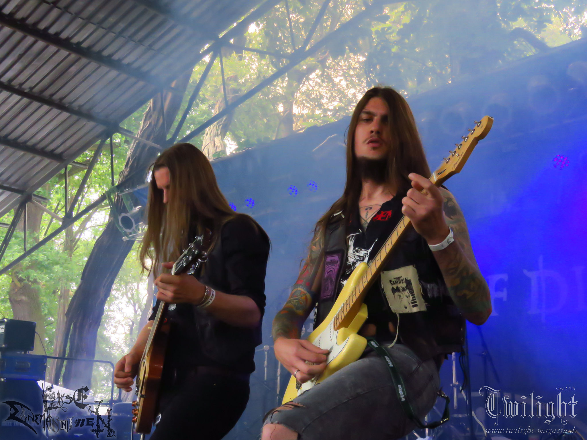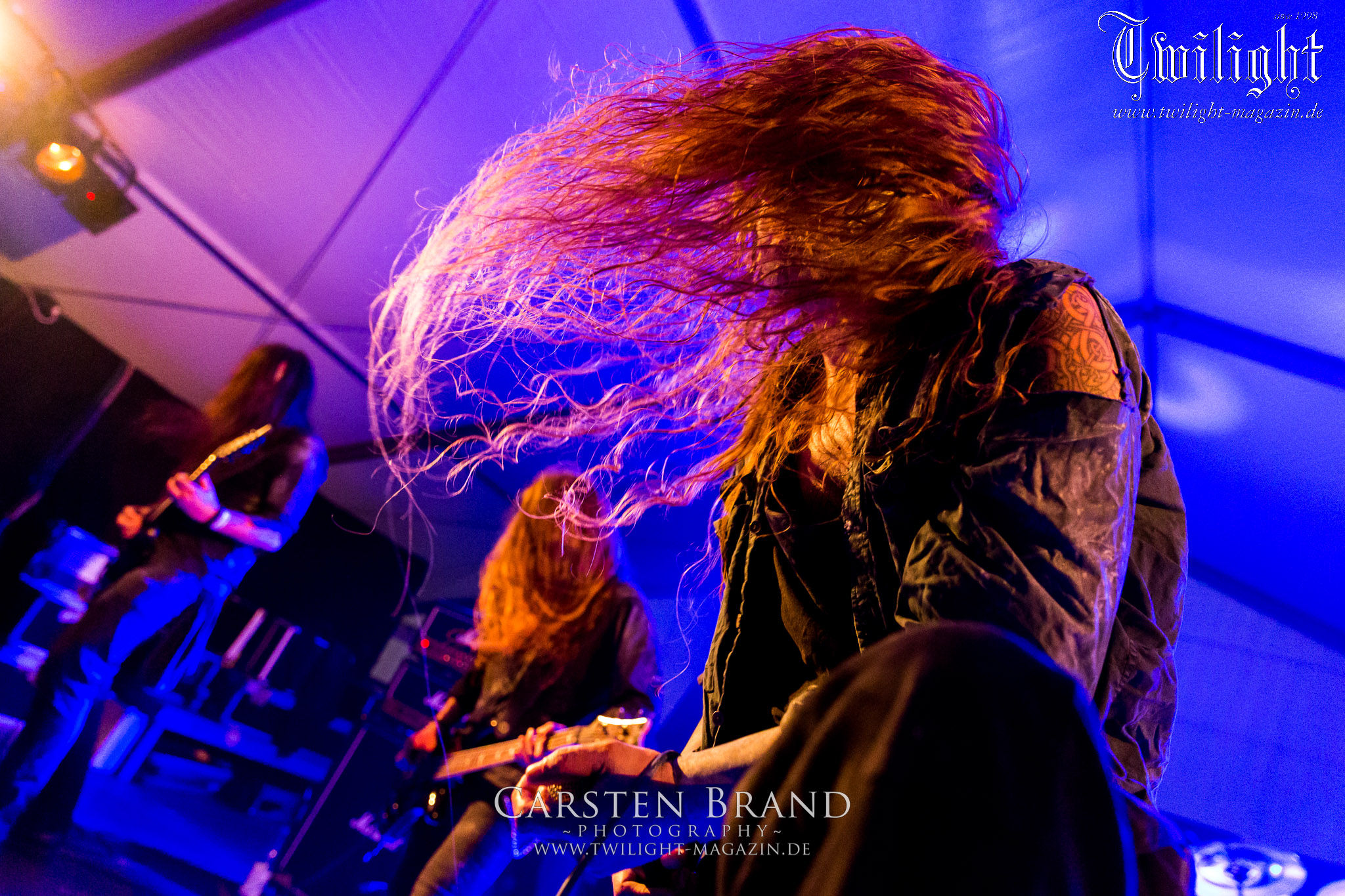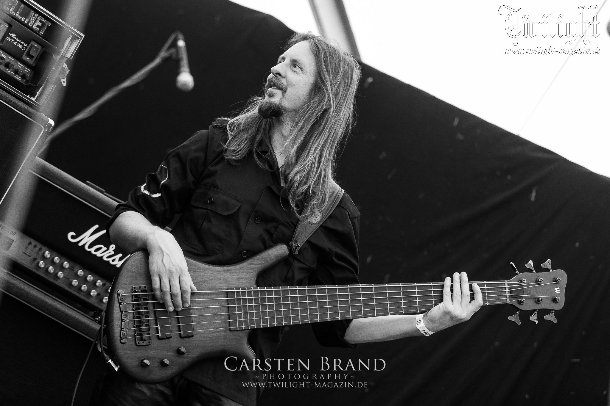 Zeit und Spielplan sind mittlerweile voran geschritten und schließlich wird auf der Hauptbühne mit Dark Sky Choir der Betrieb planmäßig wieder aufgenommen. Was an der einen Stelle für Klarheit sorgt, bedeutet im Zelt Ungewissheit und wirft immer wieder Fragen auf, da eigentlich nur klar ist, dass die Auftritte von SYLVANE und CRYPTS OF DESPAIR in die Timeline der Zeltbühne eingeschoben werden sollen, wobei Wandar wohl ihren Headliner-Status behalten sollen. Eine konkrete, aktualisierte Running Order wird aber weder online veröffentlicht und auch ein Aushang findet sich nirgends. Und das lässt verständlicherweise bei jenen, die sich vor allem auf die Gigs im Zelt gefreut hatten ordentlich Unmut und Ärger aufkommen. Ich nehme es sportlich und konzentriere mich auf die Hauptbühne. Ich bin nicht unbedingt glühender Verehrer von US-Heavy Metal aber DARK SKY CHOIR wissen mich live durchaus mit ihrer Frische, den technischen Finessen und einer ambitionierten Performance zu überzeugen. Die Mucke der Amis klingt modern, heavy und ist dabei teilweise sogar sehr straight und fast tanzbar. Ein leichter Thrash-Einschlag führt zu einer härtetechnischen Aufwertung, genauso wie das Organ von Brian Allen, der nicht nur klare Töne aus seiner Kehle holt, sondern dabei auch herrlich rauh klingen kann. Die Fähigkeiten der Instrumentalfraktion und das Zusammenspiel sind beeindruckend. Über Entertainer-Qualitäten verfügen alle Mitglieder. Eine Scheibe werde ich mir wohl nicht ins Regal stellen aber der Auftritt ist am Ende sehr viel mehr als nur eine Horizonterweiterung.