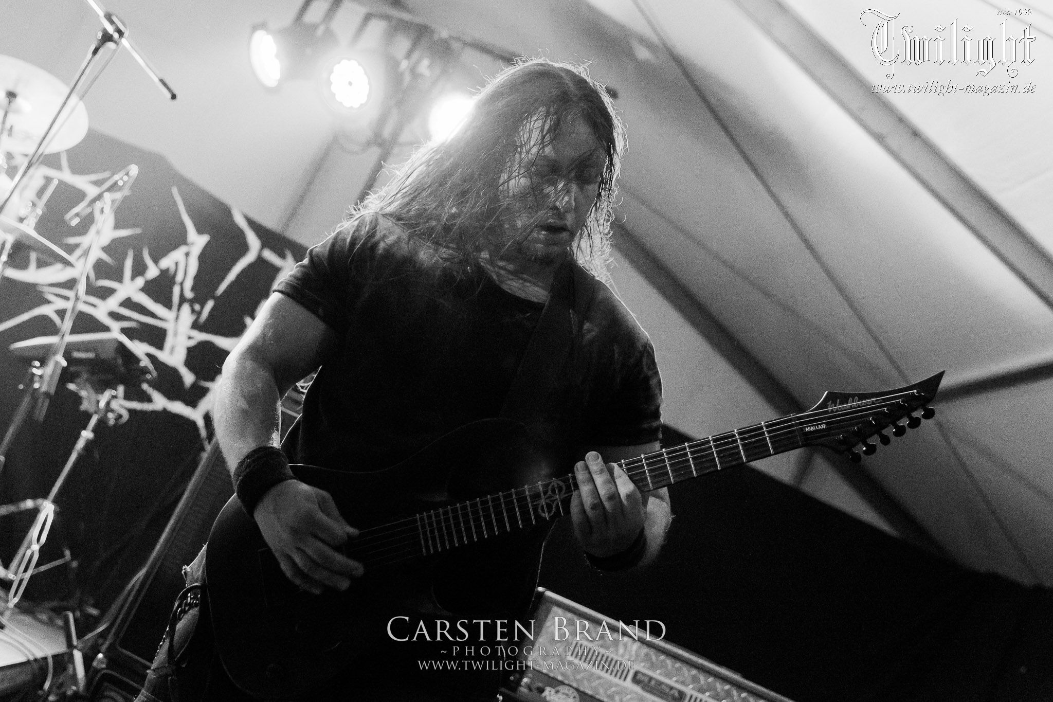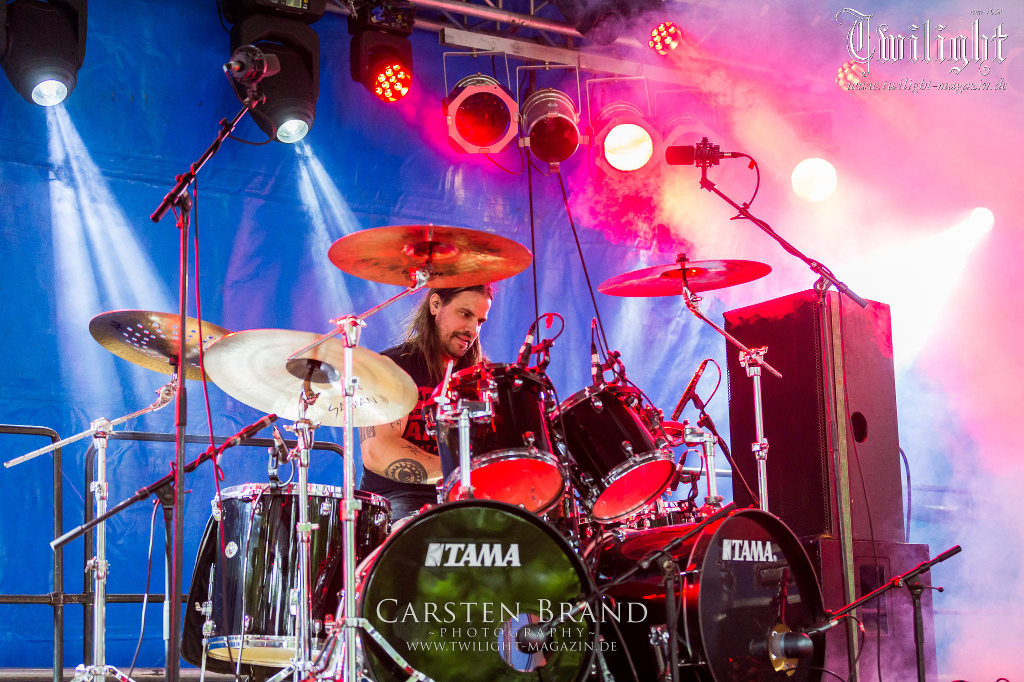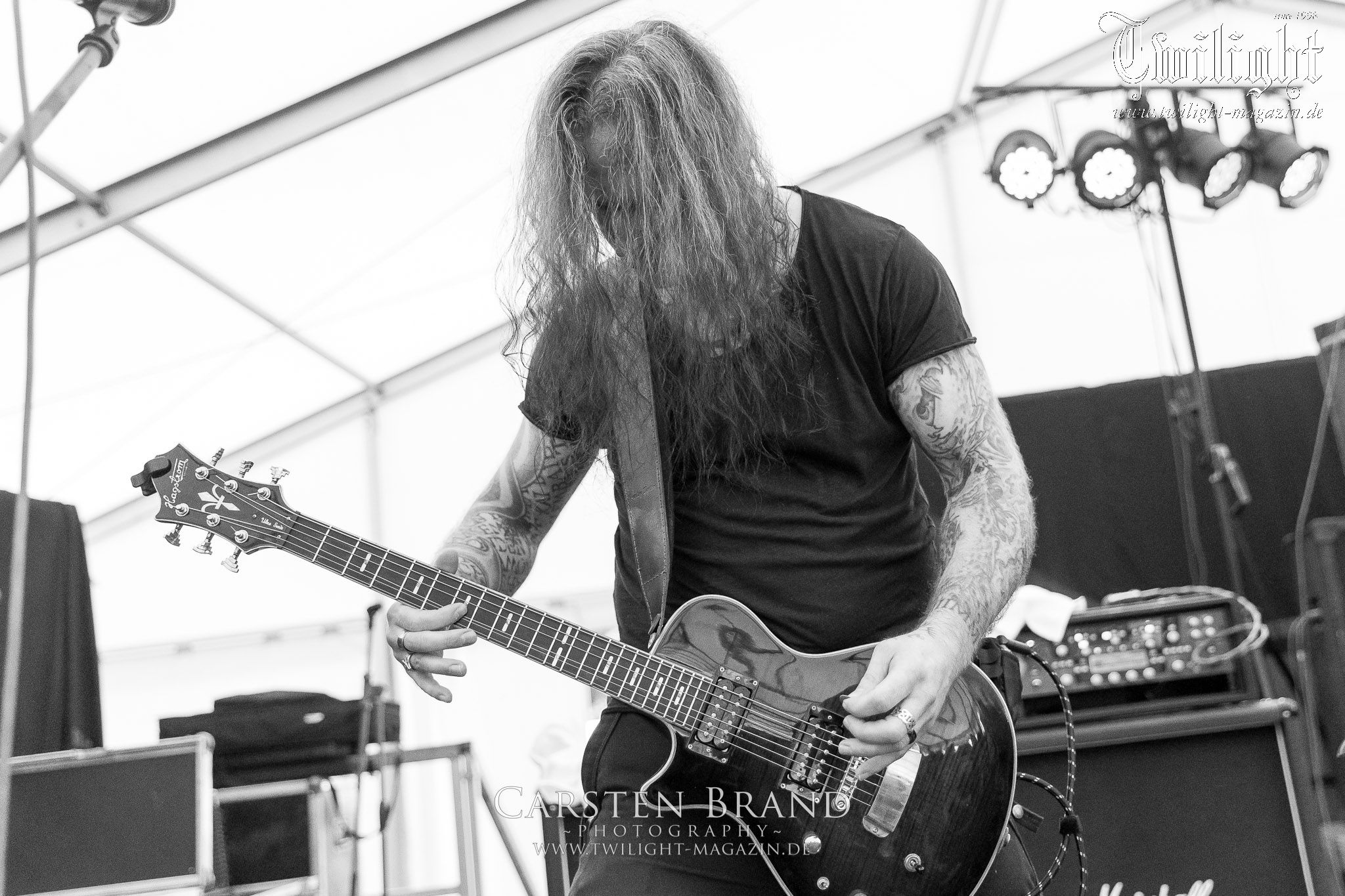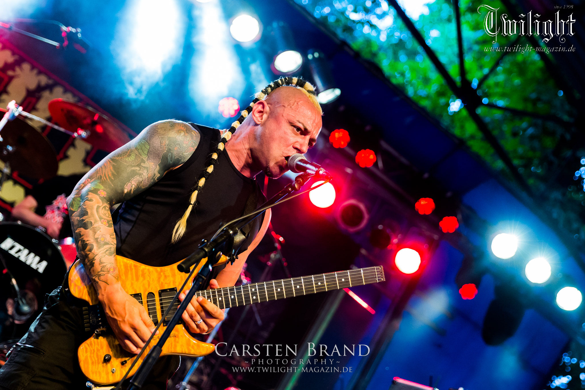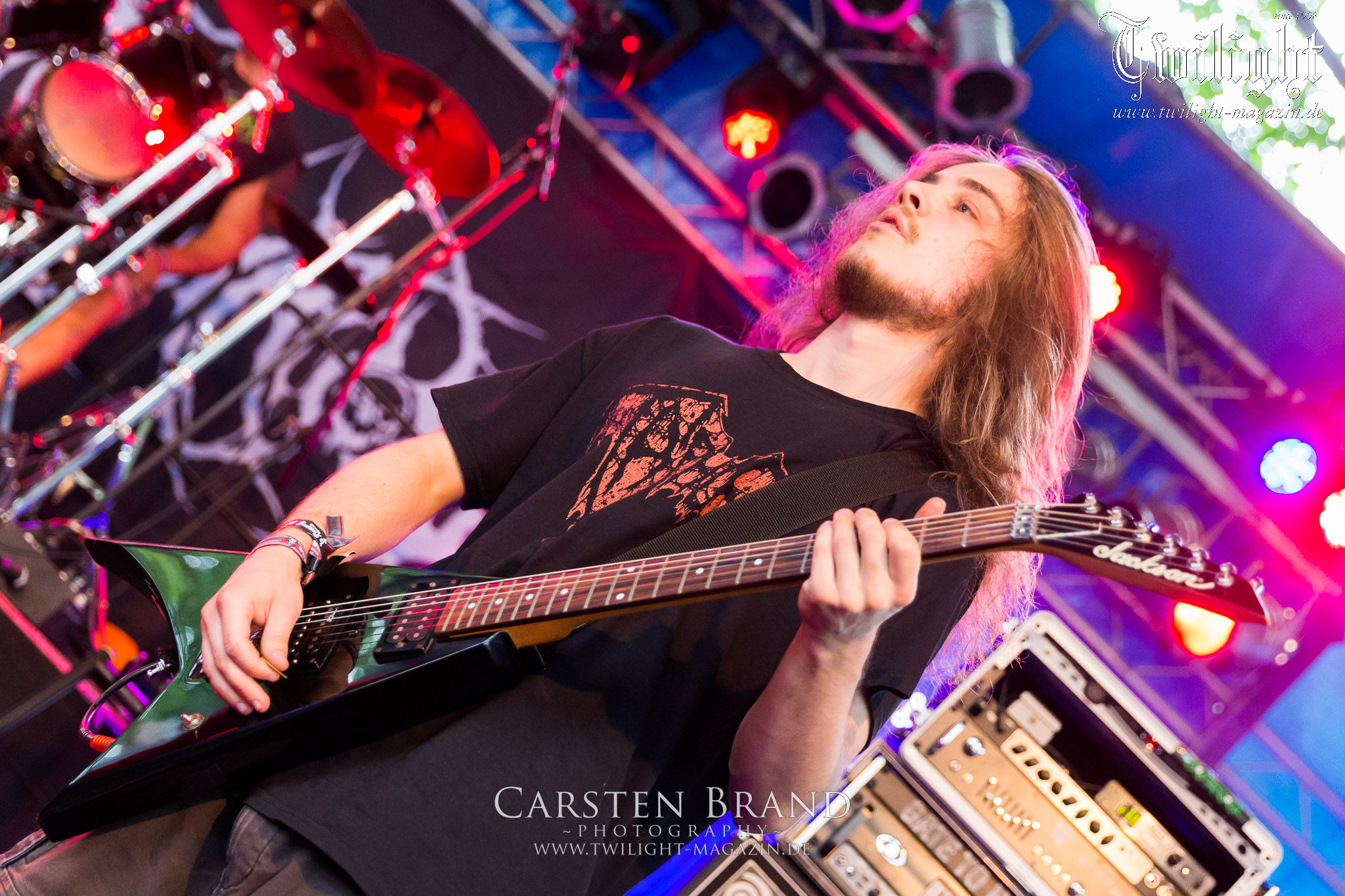 Zeit und Spielplan sind mittlerweile voran geschritten und schließlich wird auf der Hauptbühne mit Dark Sky Choir der Betrieb planmäßig wieder aufgenommen. Was an der einen Stelle für Klarheit sorgt, bedeutet im Zelt Ungewissheit und wirft immer wieder Fragen auf, da eigentlich nur klar ist, dass die Auftritte von SYLVANE und CRYPTS OF DESPAIR in die Timeline der Zeltbühne eingeschoben werden sollen, wobei Wandar wohl ihren Headliner-Status behalten sollen. Eine konkrete, aktualisierte Running Order wird aber weder online veröffentlicht und auch ein Aushang findet sich nirgends. Und das lässt verständlicherweise bei jenen, die sich vor allem auf die Gigs im Zelt gefreut hatten ordentlich Unmut und Ärger aufkommen. Ich nehme es sportlich und konzentriere mich auf die Hauptbühne. Ich bin nicht unbedingt glühender Verehrer von US-Heavy Metal aber DARK SKY CHOIR wissen mich live durchaus mit ihrer Frische, den technischen Finessen und einer ambitionierten Performance zu überzeugen. Die Mucke der Amis klingt modern, heavy und ist dabei teilweise sogar sehr straight und fast tanzbar. Ein leichter Thrash-Einschlag führt zu einer härtetechnischen Aufwertung, genauso wie das Organ von Brian Allen, der nicht nur klare Töne aus seiner Kehle holt, sondern dabei auch herrlich rauh klingen kann. Die Fähigkeiten der Instrumentalfraktion und das Zusammenspiel sind beeindruckend. Über Entertainer-Qualitäten verfügen alle Mitglieder. Eine Scheibe werde ich mir wohl nicht ins Regal stellen aber der Auftritt ist am Ende sehr viel mehr als nur eine Horizonterweiterung.