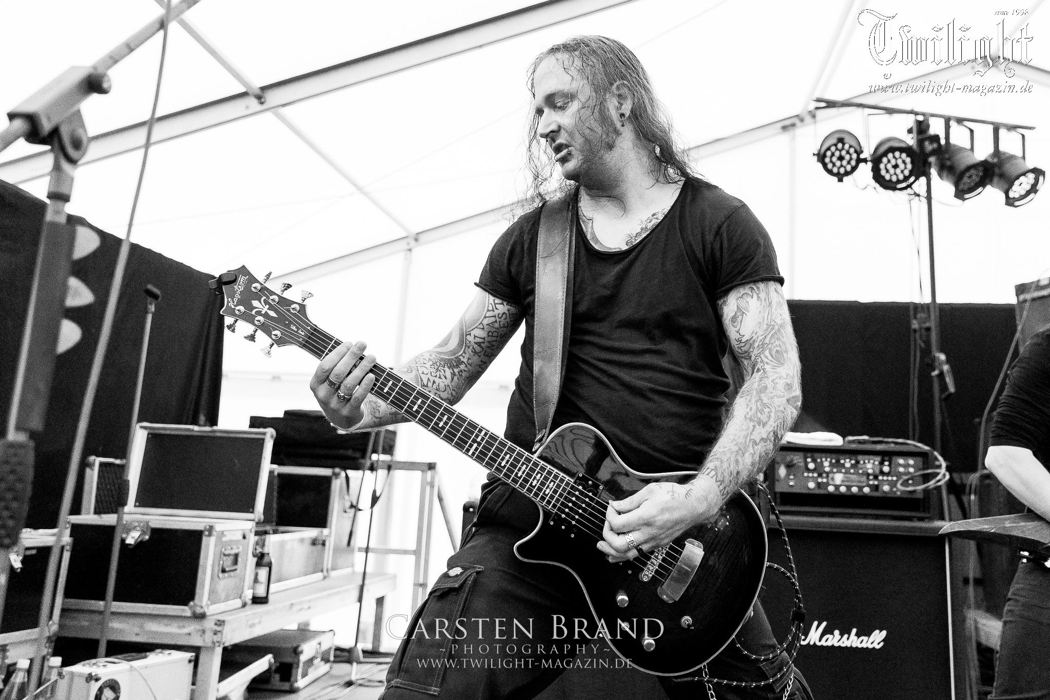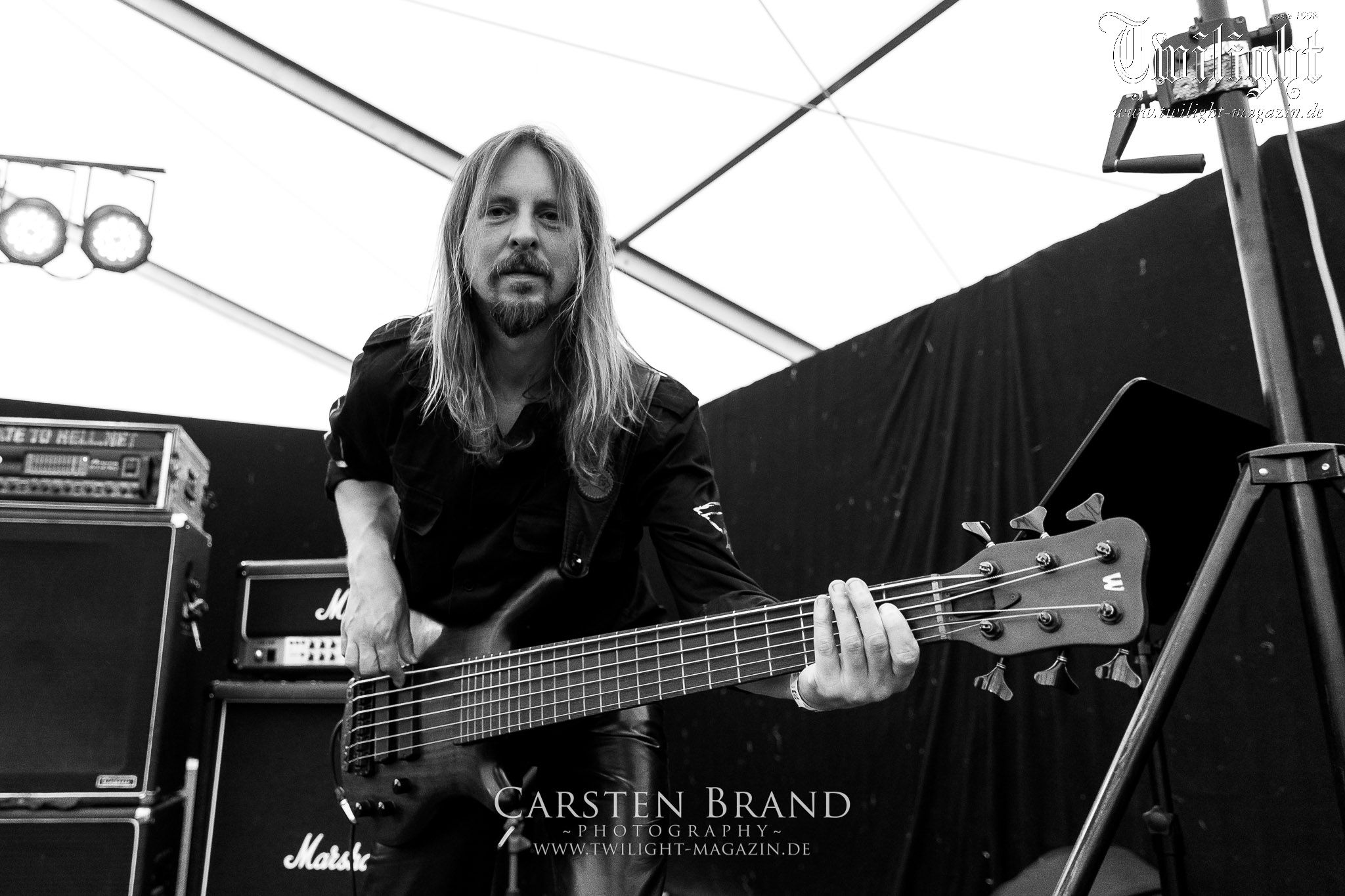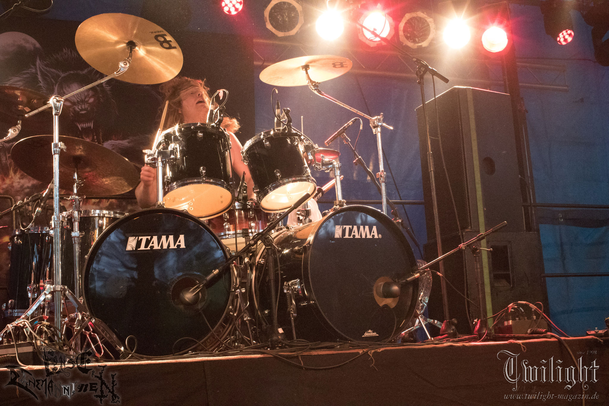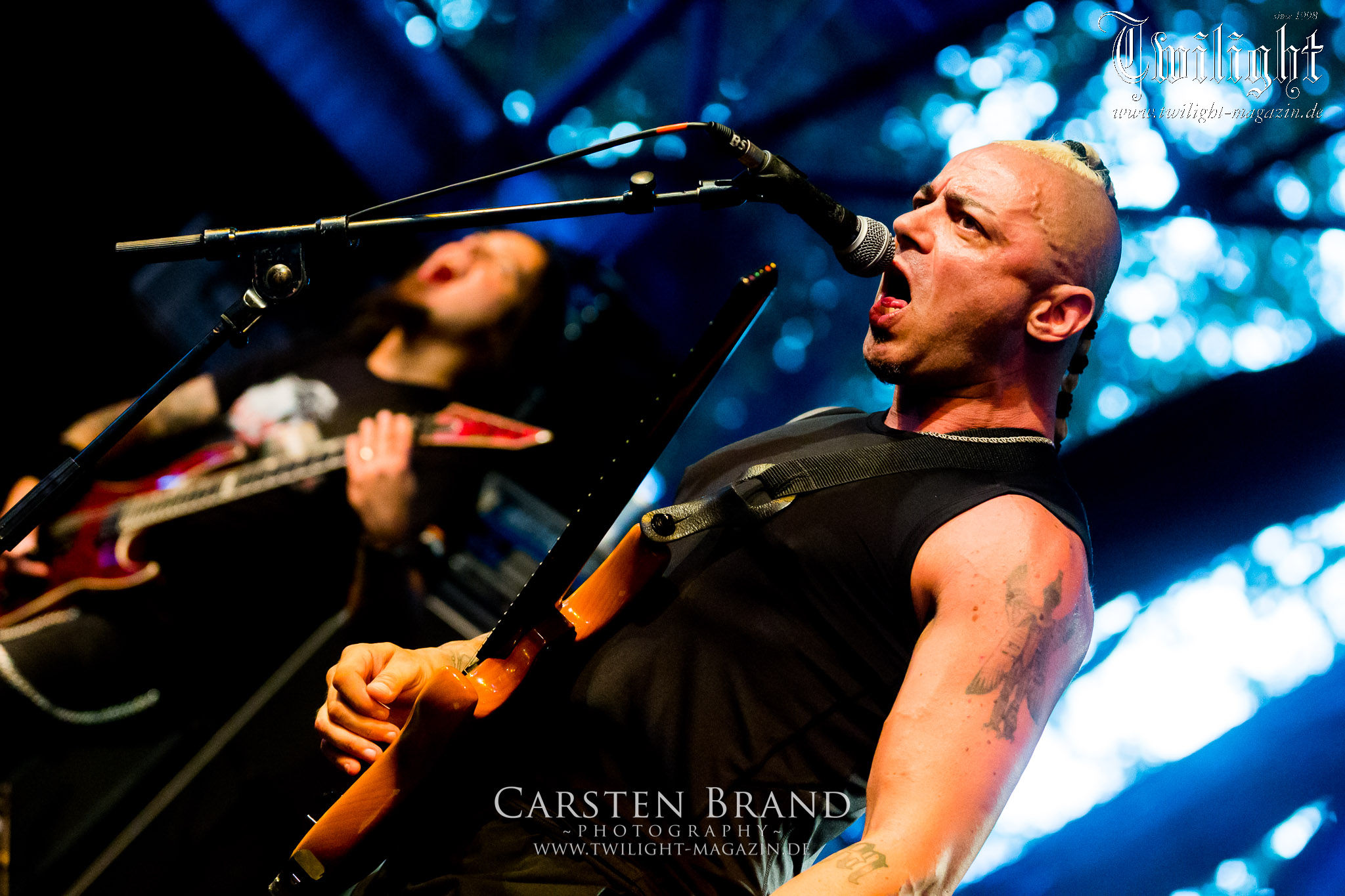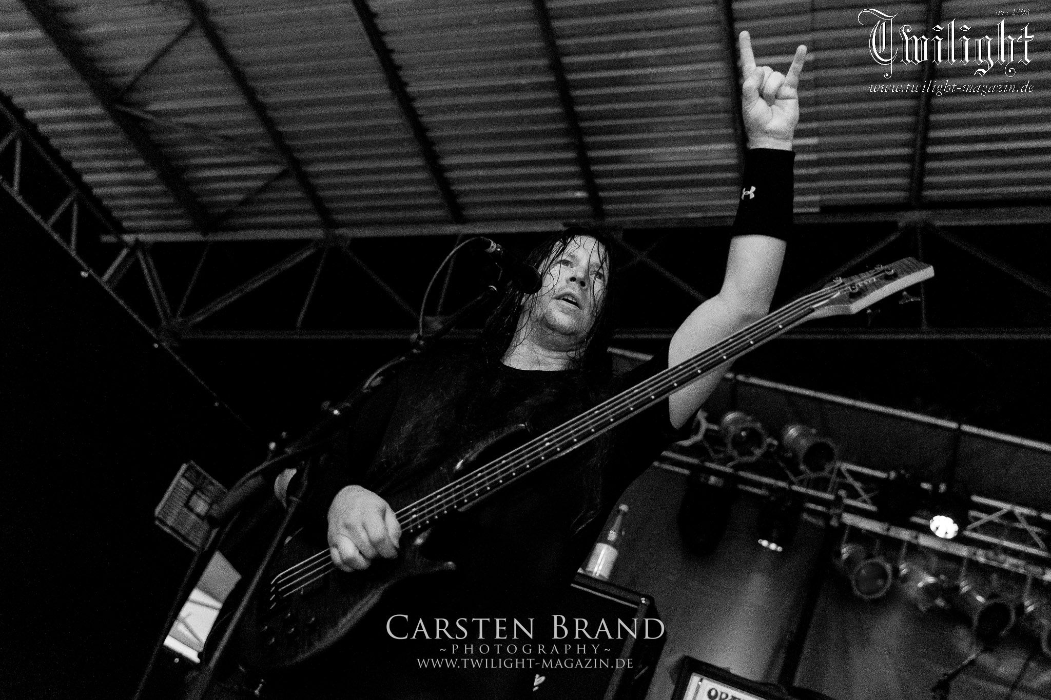 Zeit und Spielplan sind mittlerweile voran geschritten und schließlich wird auf der Hauptbühne mit Dark Sky Choir der Betrieb planmäßig wieder aufgenommen. Was an der einen Stelle für Klarheit sorgt, bedeutet im Zelt Ungewissheit und wirft immer wieder Fragen auf, da eigentlich nur klar ist, dass die Auftritte von SYLVANE und CRYPTS OF DESPAIR in die Timeline der Zeltbühne eingeschoben werden sollen, wobei Wandar wohl ihren Headliner-Status behalten sollen. Eine konkrete, aktualisierte Running Order wird aber weder online veröffentlicht und auch ein Aushang findet sich nirgends. Und das lässt verständlicherweise bei jenen, die sich vor allem auf die Gigs im Zelt gefreut hatten ordentlich Unmut und Ärger aufkommen. Ich nehme es sportlich und konzentriere mich auf die Hauptbühne. Ich bin nicht unbedingt glühender Verehrer von US-Heavy Metal aber DARK SKY CHOIR wissen mich live durchaus mit ihrer Frische, den technischen Finessen und einer ambitionierten Performance zu überzeugen. Die Mucke der Amis klingt modern, heavy und ist dabei teilweise sogar sehr straight und fast tanzbar. Ein leichter Thrash-Einschlag führt zu einer härtetechnischen Aufwertung, genauso wie das Organ von Brian Allen, der nicht nur klare Töne aus seiner Kehle holt, sondern dabei auch herrlich rauh klingen kann. Die Fähigkeiten der Instrumentalfraktion und das Zusammenspiel sind beeindruckend. Über Entertainer-Qualitäten verfügen alle Mitglieder. Eine Scheibe werde ich mir wohl nicht ins Regal stellen aber der Auftritt ist am Ende sehr viel mehr als nur eine Horizonterweiterung.