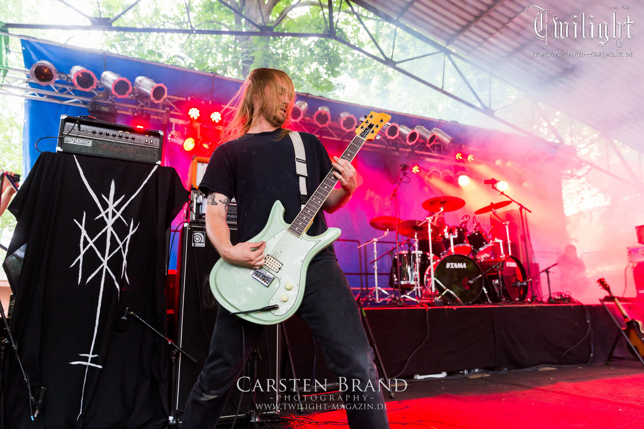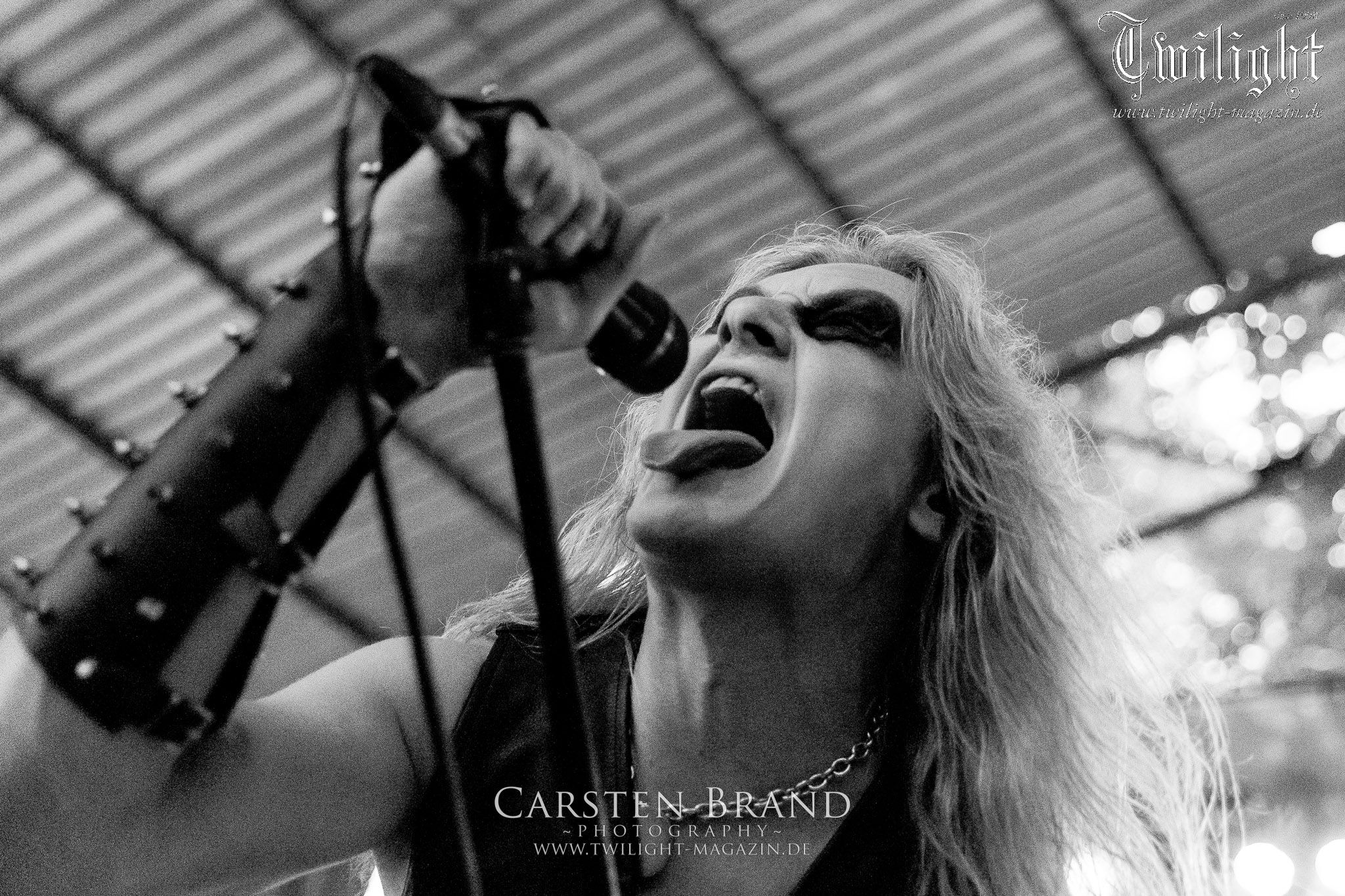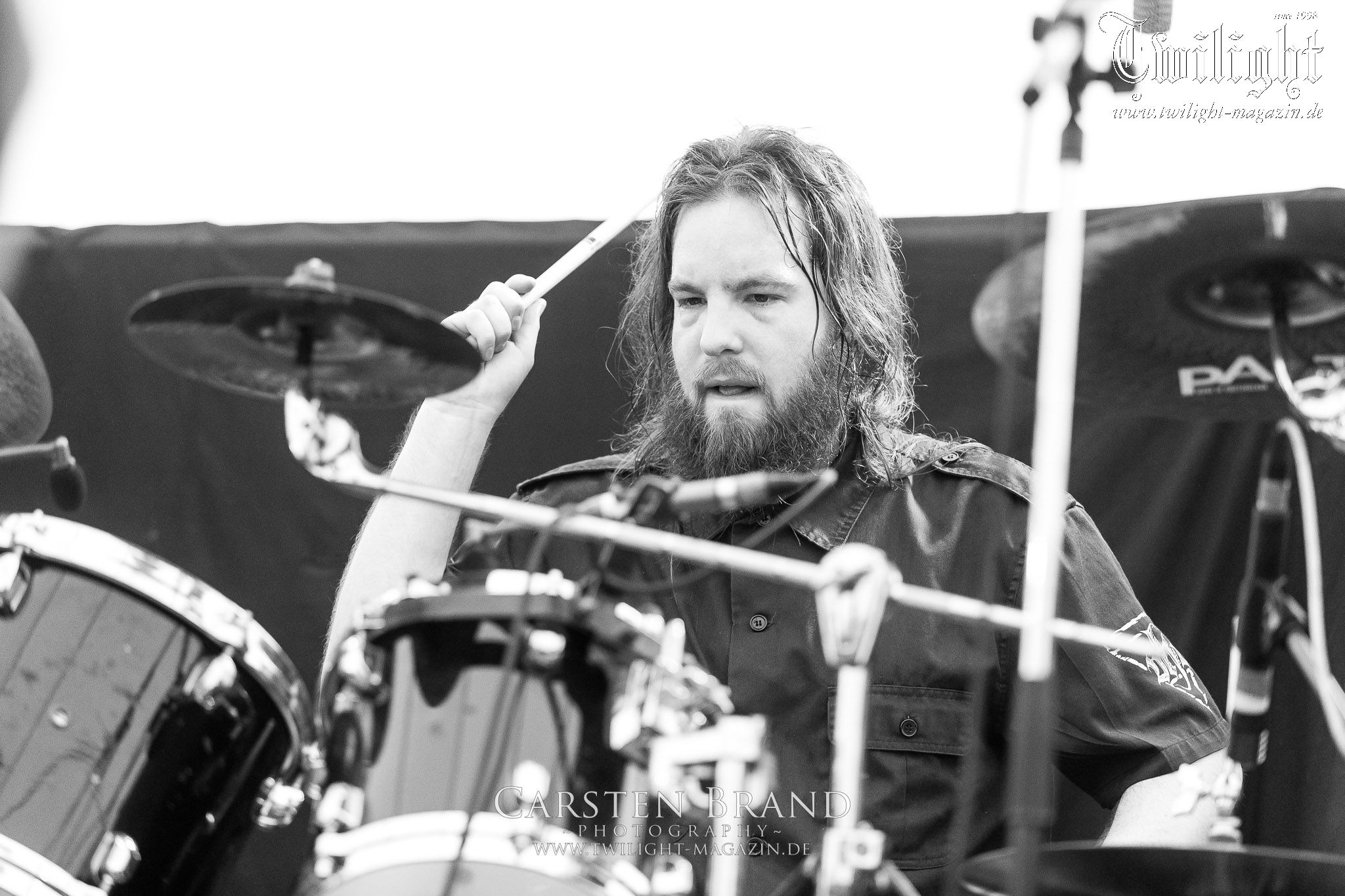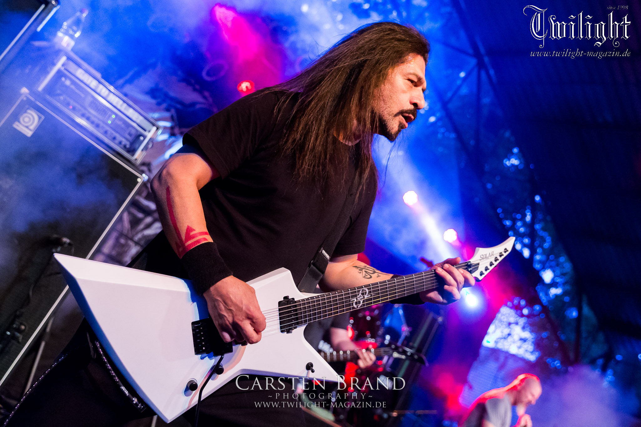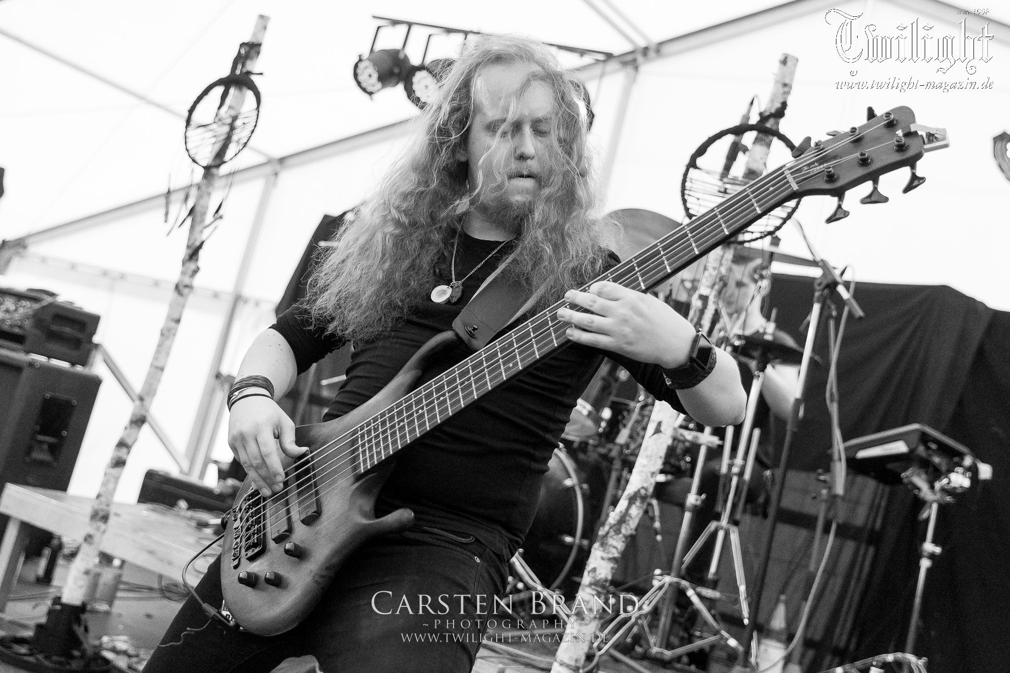 Zeit und Spielplan sind mittlerweile voran geschritten und schließlich wird auf der Hauptbühne mit Dark Sky Choir der Betrieb planmäßig wieder aufgenommen. Was an der einen Stelle für Klarheit sorgt, bedeutet im Zelt Ungewissheit und wirft immer wieder Fragen auf, da eigentlich nur klar ist, dass die Auftritte von SYLVANE und CRYPTS OF DESPAIR in die Timeline der Zeltbühne eingeschoben werden sollen, wobei Wandar wohl ihren Headliner-Status behalten sollen. Eine konkrete, aktualisierte Running Order wird aber weder online veröffentlicht und auch ein Aushang findet sich nirgends. Und das lässt verständlicherweise bei jenen, die sich vor allem auf die Gigs im Zelt gefreut hatten ordentlich Unmut und Ärger aufkommen. Ich nehme es sportlich und konzentriere mich auf die Hauptbühne. Ich bin nicht unbedingt glühender Verehrer von US-Heavy Metal aber DARK SKY CHOIR wissen mich live durchaus mit ihrer Frische, den technischen Finessen und einer ambitionierten Performance zu überzeugen. Die Mucke der Amis klingt modern, heavy und ist dabei teilweise sogar sehr straight und fast tanzbar. Ein leichter Thrash-Einschlag führt zu einer härtetechnischen Aufwertung, genauso wie das Organ von Brian Allen, der nicht nur klare Töne aus seiner Kehle holt, sondern dabei auch herrlich rauh klingen kann. Die Fähigkeiten der Instrumentalfraktion und das Zusammenspiel sind beeindruckend. Über Entertainer-Qualitäten verfügen alle Mitglieder. Eine Scheibe werde ich mir wohl nicht ins Regal stellen aber der Auftritt ist am Ende sehr viel mehr als nur eine Horizonterweiterung.