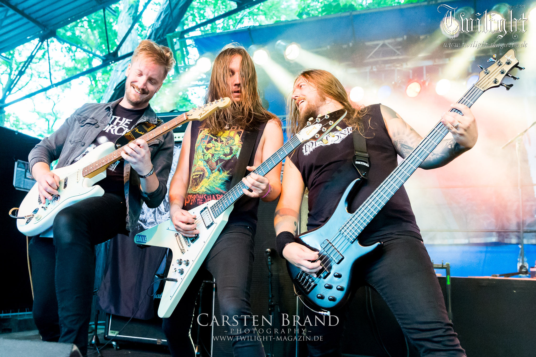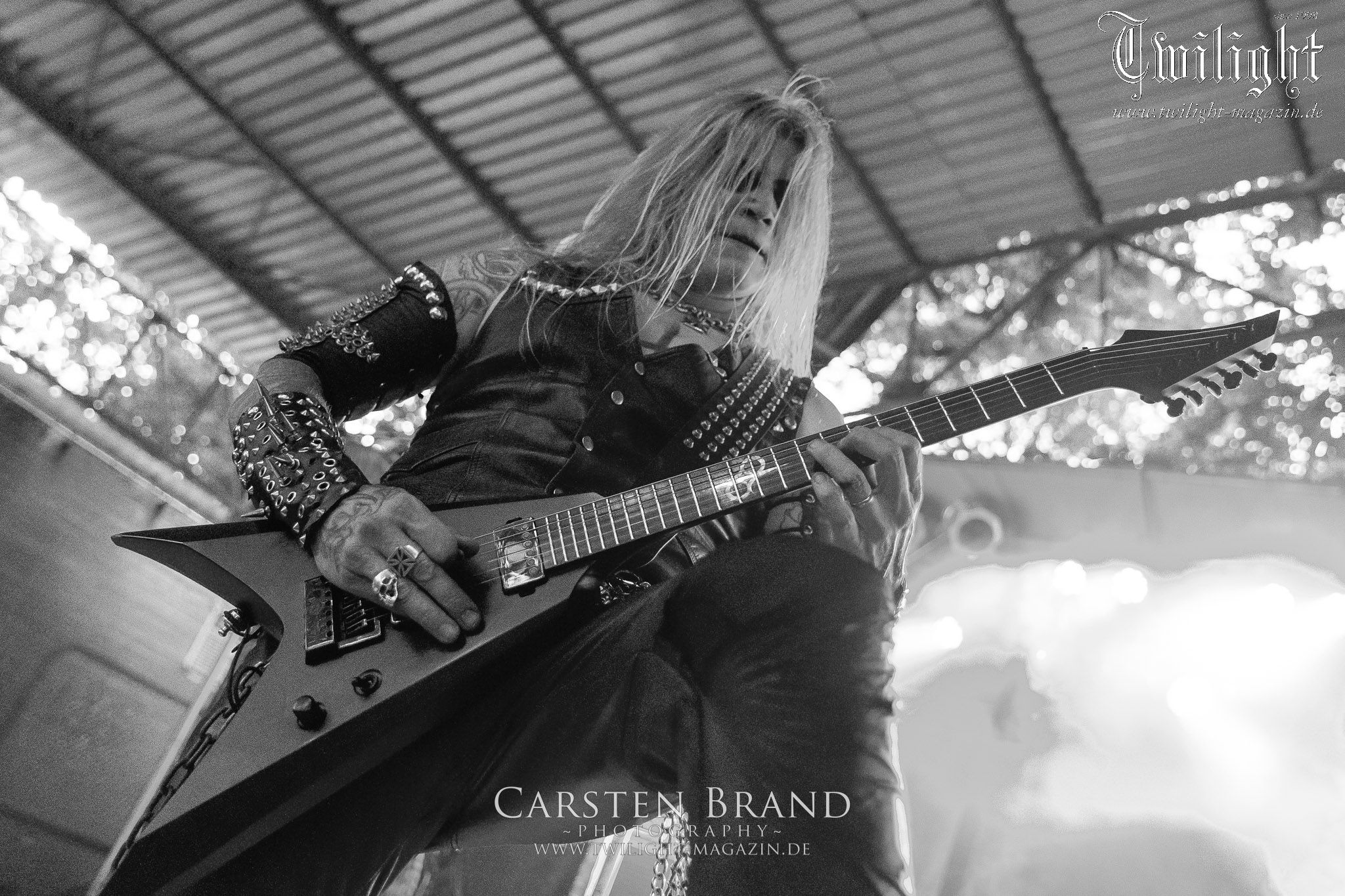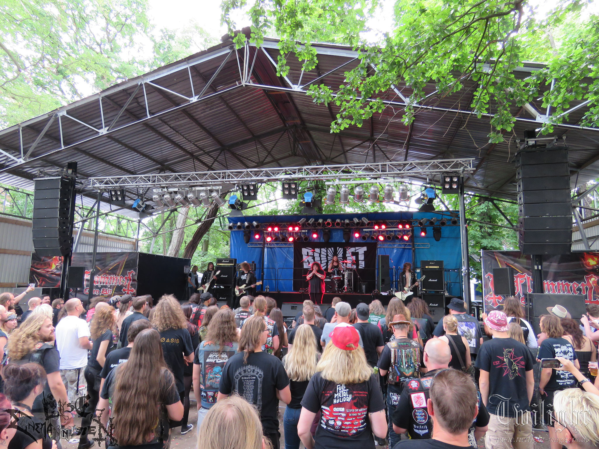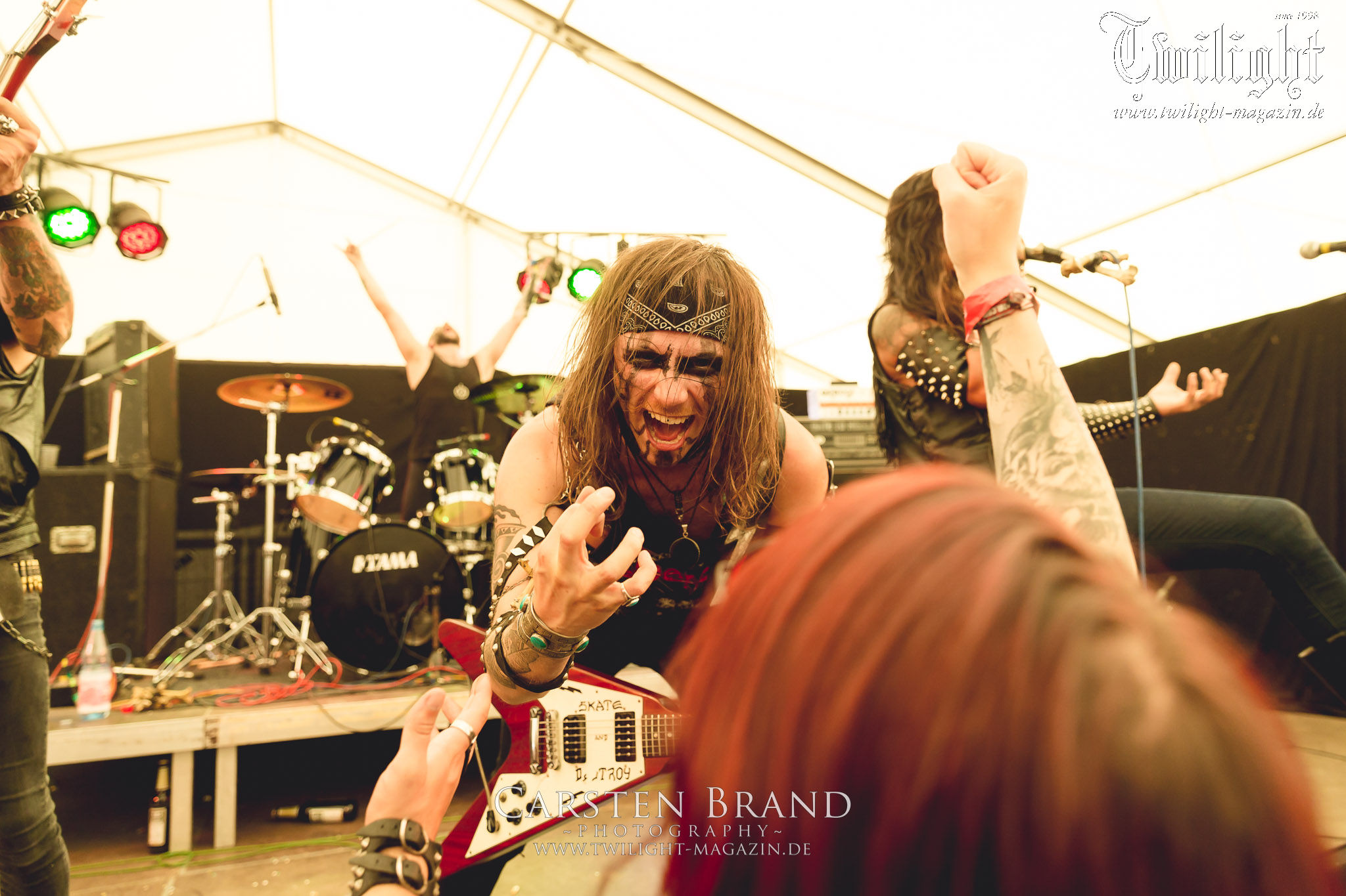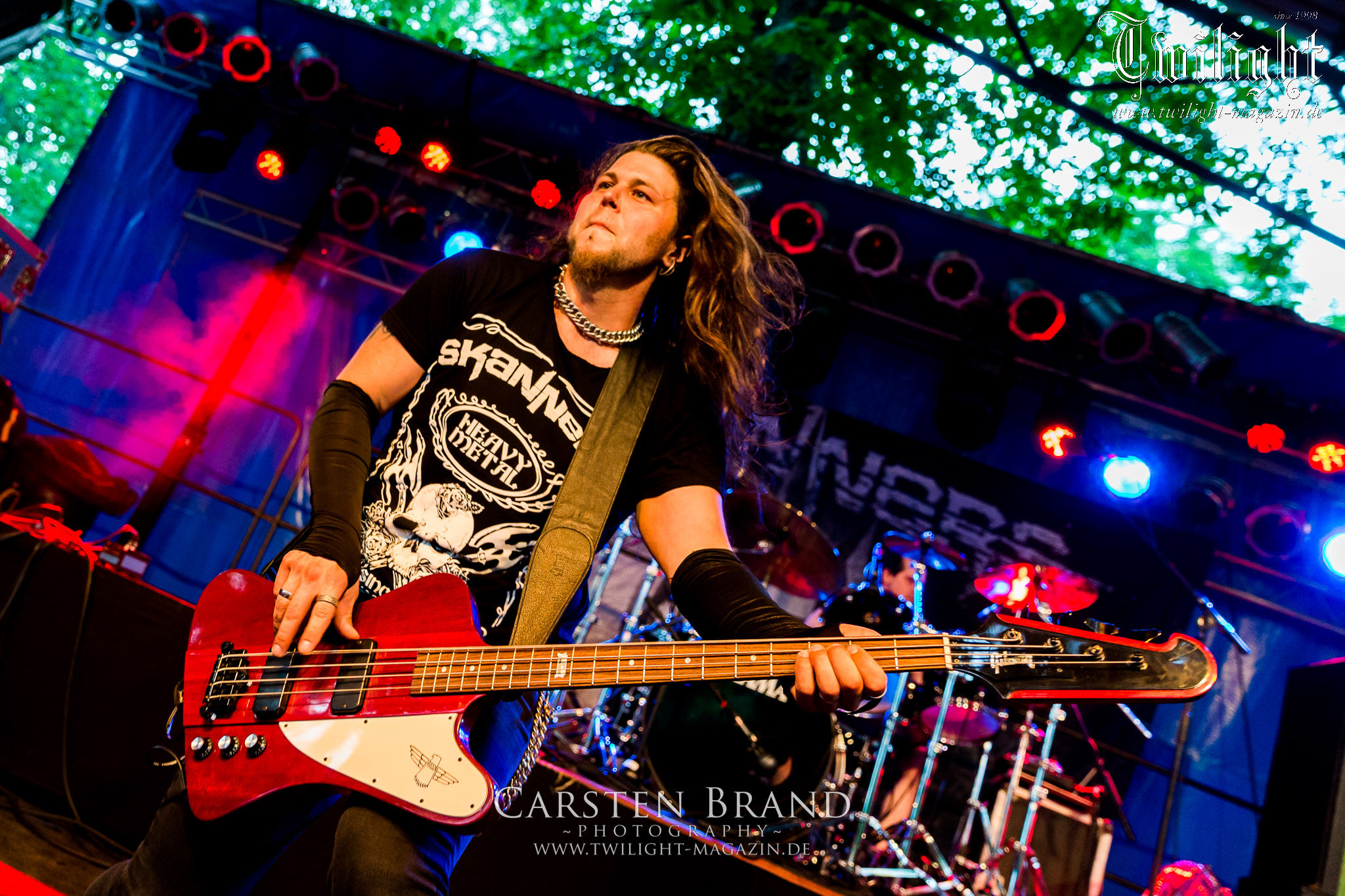Zeit und Spielplan sind mittlerweile voran geschritten und schließlich wird auf der Hauptbühne mit Dark Sky Choir der Betrieb planmäßig wieder aufgenommen. Was an der einen Stelle für Klarheit sorgt, bedeutet im Zelt Ungewissheit und wirft immer wieder Fragen auf, da eigentlich nur klar ist, dass die Auftritte von SYLVANE und CRYPTS OF DESPAIR in die Timeline der Zeltbühne eingeschoben werden sollen, wobei Wandar wohl ihren Headliner-Status behalten sollen. Eine konkrete, aktualisierte Running Order wird aber weder online veröffentlicht und auch ein Aushang findet sich nirgends. Und das lässt verständlicherweise bei jenen, die sich vor allem auf die Gigs im Zelt gefreut hatten ordentlich Unmut und Ärger aufkommen. Ich nehme es sportlich und konzentriere mich auf die Hauptbühne. Ich bin nicht unbedingt glühender Verehrer von US-Heavy Metal aber DARK SKY CHOIR wissen mich live durchaus mit ihrer Frische, den technischen Finessen und einer ambitionierten Performance zu überzeugen. Die Mucke der Amis klingt modern, heavy und ist dabei teilweise sogar sehr straight und fast tanzbar. Ein leichter Thrash-Einschlag führt zu einer härtetechnischen Aufwertung, genauso wie das Organ von Brian Allen, der nicht nur klare Töne aus seiner Kehle holt, sondern dabei auch herrlich rauh klingen kann. Die Fähigkeiten der Instrumentalfraktion und das Zusammenspiel sind beeindruckend. Über Entertainer-Qualitäten verfügen alle Mitglieder. Eine Scheibe werde ich mir wohl nicht ins Regal stellen aber der Auftritt ist am Ende sehr viel mehr als nur eine Horizonterweiterung.