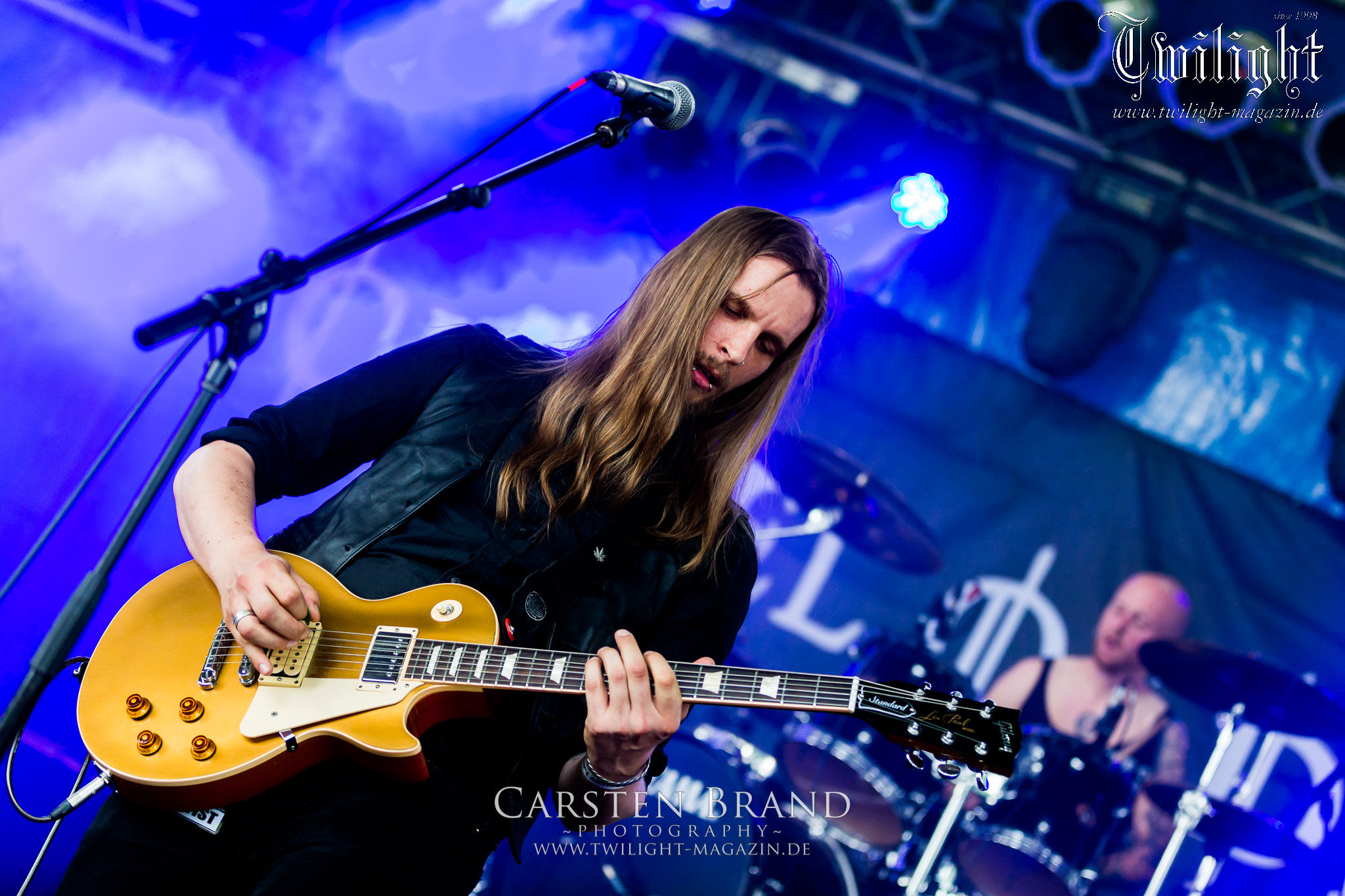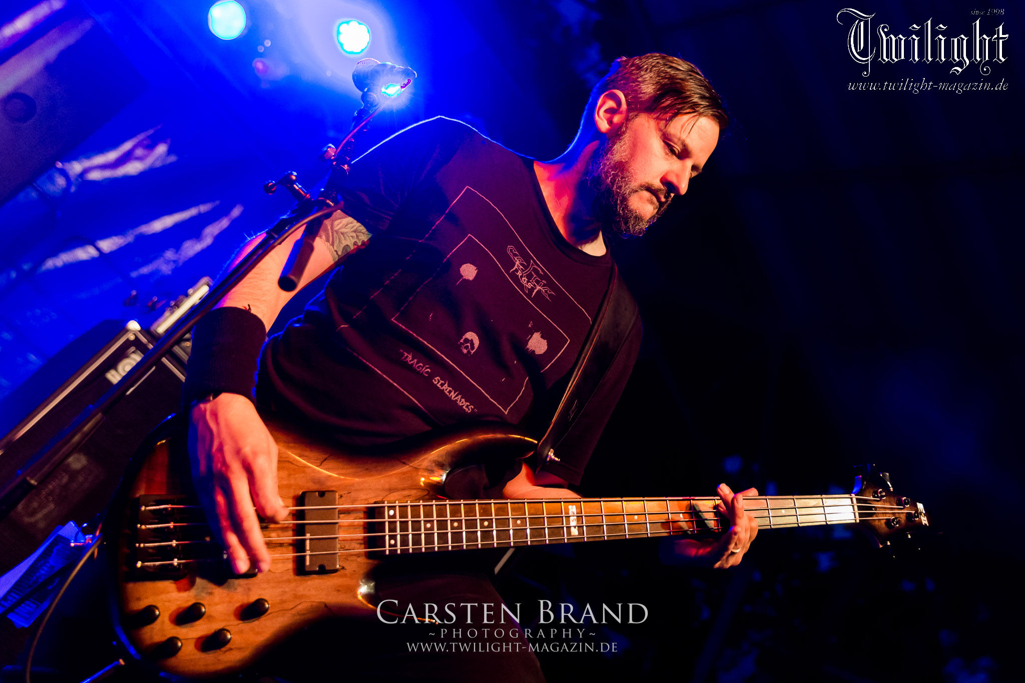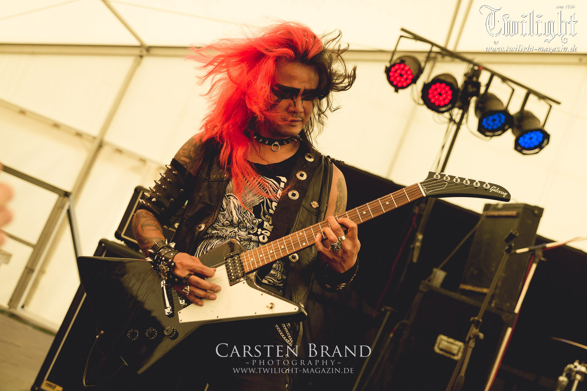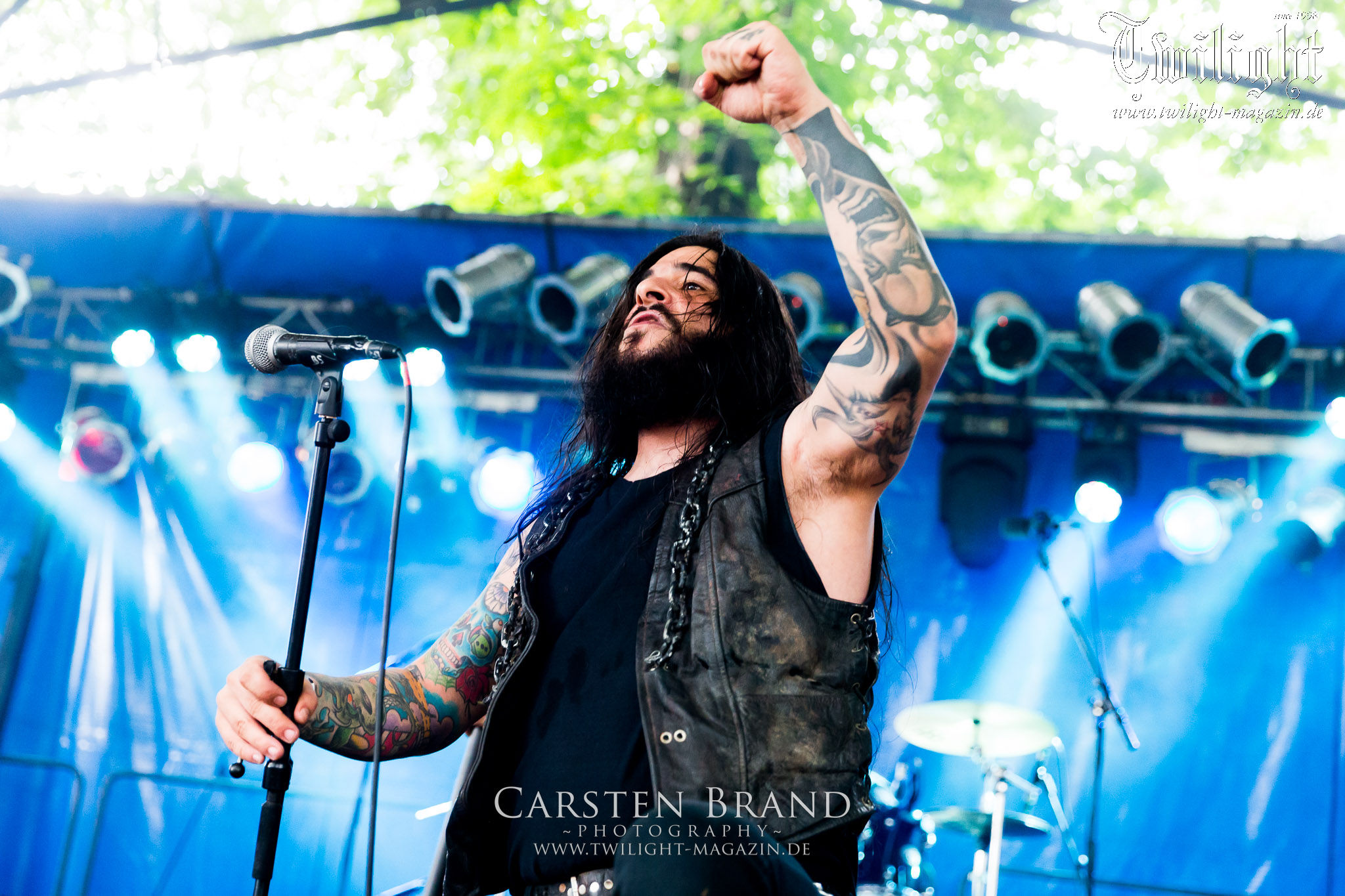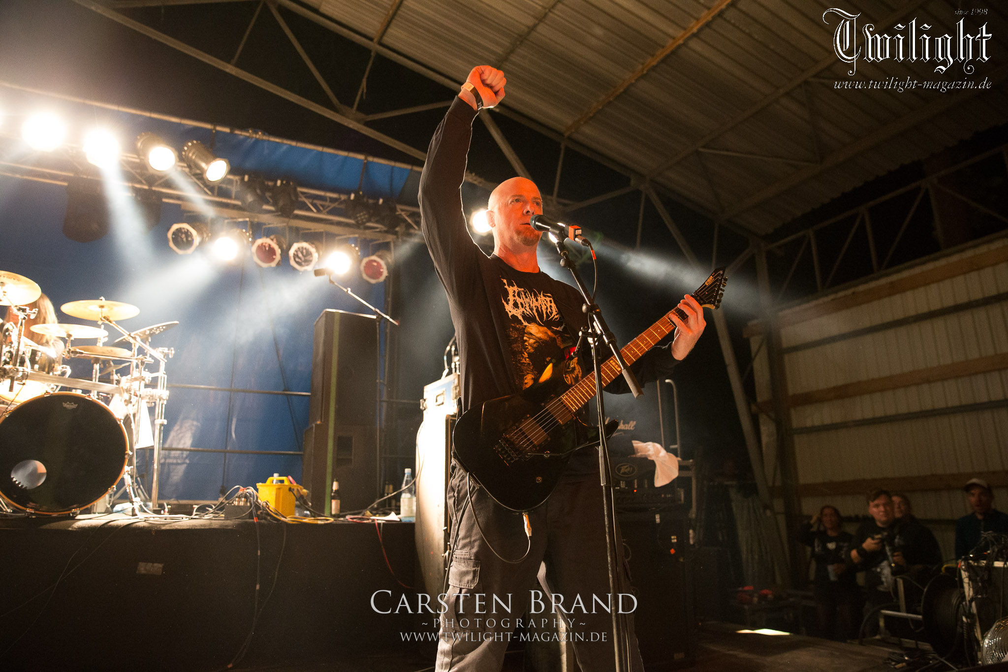 Zeit und Spielplan sind mittlerweile voran geschritten und schließlich wird auf der Hauptbühne mit Dark Sky Choir der Betrieb planmäßig wieder aufgenommen. Was an der einen Stelle für Klarheit sorgt, bedeutet im Zelt Ungewissheit und wirft immer wieder Fragen auf, da eigentlich nur klar ist, dass die Auftritte von SYLVANE und CRYPTS OF DESPAIR in die Timeline der Zeltbühne eingeschoben werden sollen, wobei Wandar wohl ihren Headliner-Status behalten sollen. Eine konkrete, aktualisierte Running Order wird aber weder online veröffentlicht und auch ein Aushang findet sich nirgends. Und das lässt verständlicherweise bei jenen, die sich vor allem auf die Gigs im Zelt gefreut hatten ordentlich Unmut und Ärger aufkommen. Ich nehme es sportlich und konzentriere mich auf die Hauptbühne. Ich bin nicht unbedingt glühender Verehrer von US-Heavy Metal aber DARK SKY CHOIR wissen mich live durchaus mit ihrer Frische, den technischen Finessen und einer ambitionierten Performance zu überzeugen. Die Mucke der Amis klingt modern, heavy und ist dabei teilweise sogar sehr straight und fast tanzbar. Ein leichter Thrash-Einschlag führt zu einer härtetechnischen Aufwertung, genauso wie das Organ von Brian Allen, der nicht nur klare Töne aus seiner Kehle holt, sondern dabei auch herrlich rauh klingen kann. Die Fähigkeiten der Instrumentalfraktion und das Zusammenspiel sind beeindruckend. Über Entertainer-Qualitäten verfügen alle Mitglieder. Eine Scheibe werde ich mir wohl nicht ins Regal stellen aber der Auftritt ist am Ende sehr viel mehr als nur eine Horizonterweiterung.