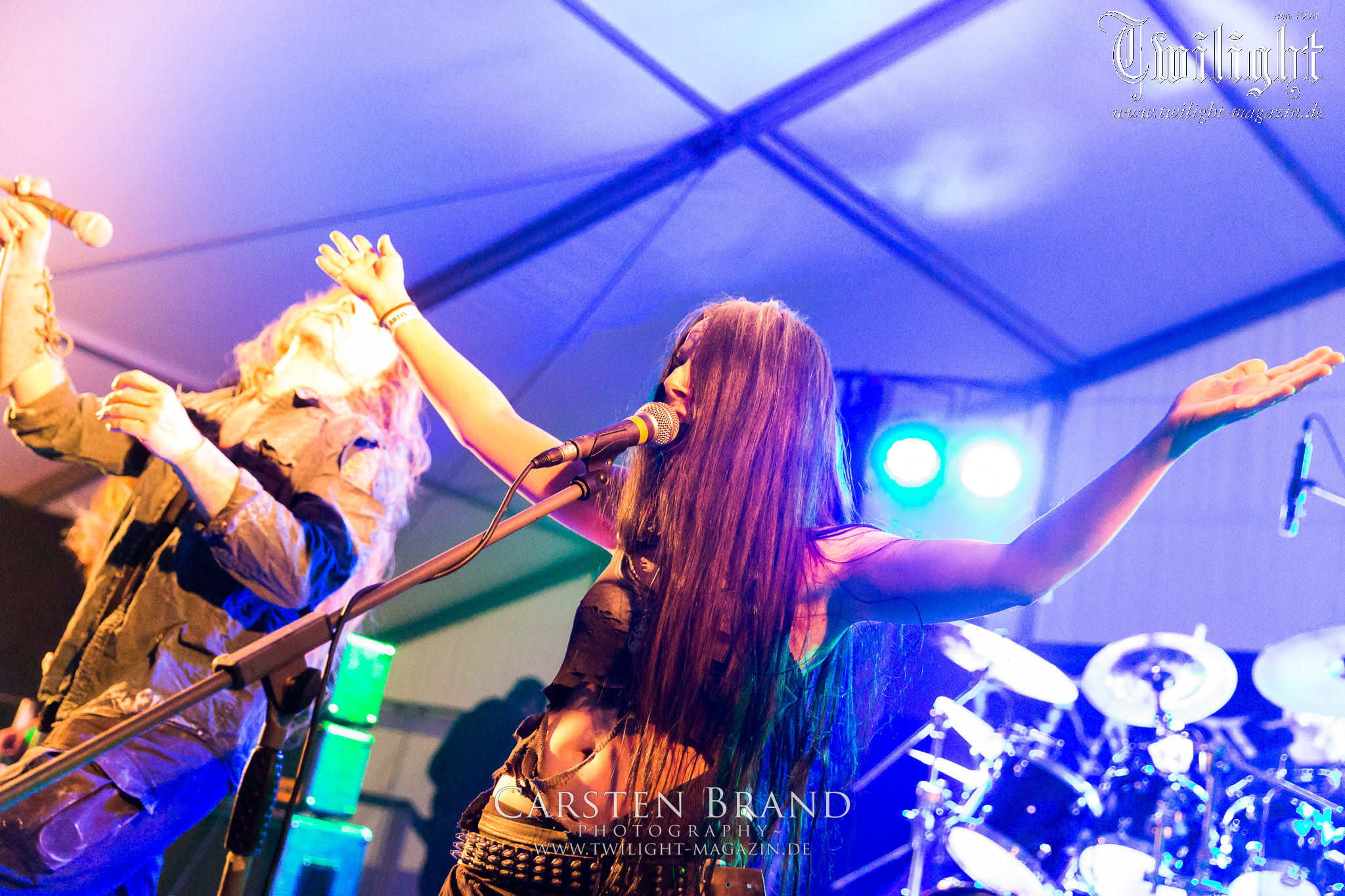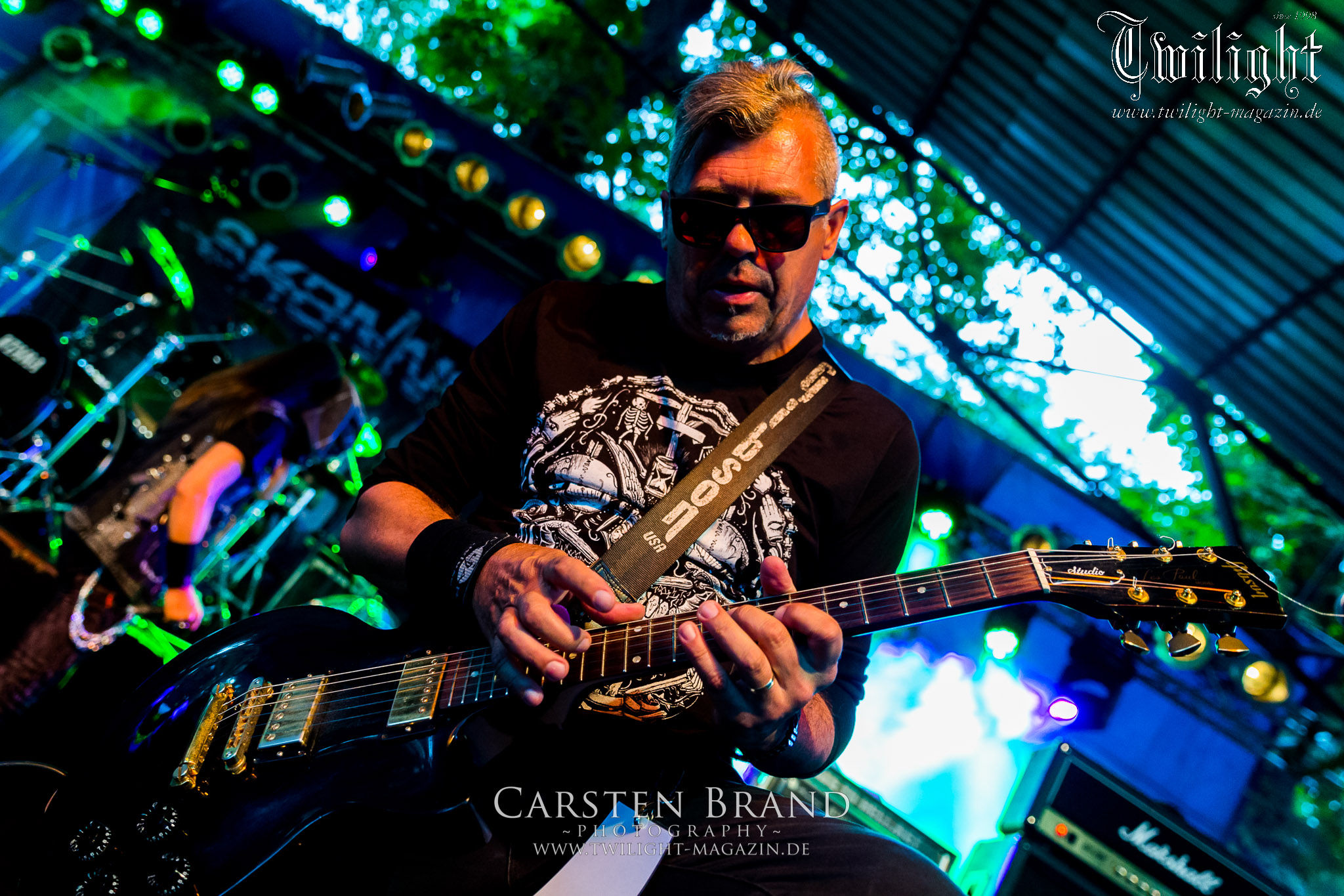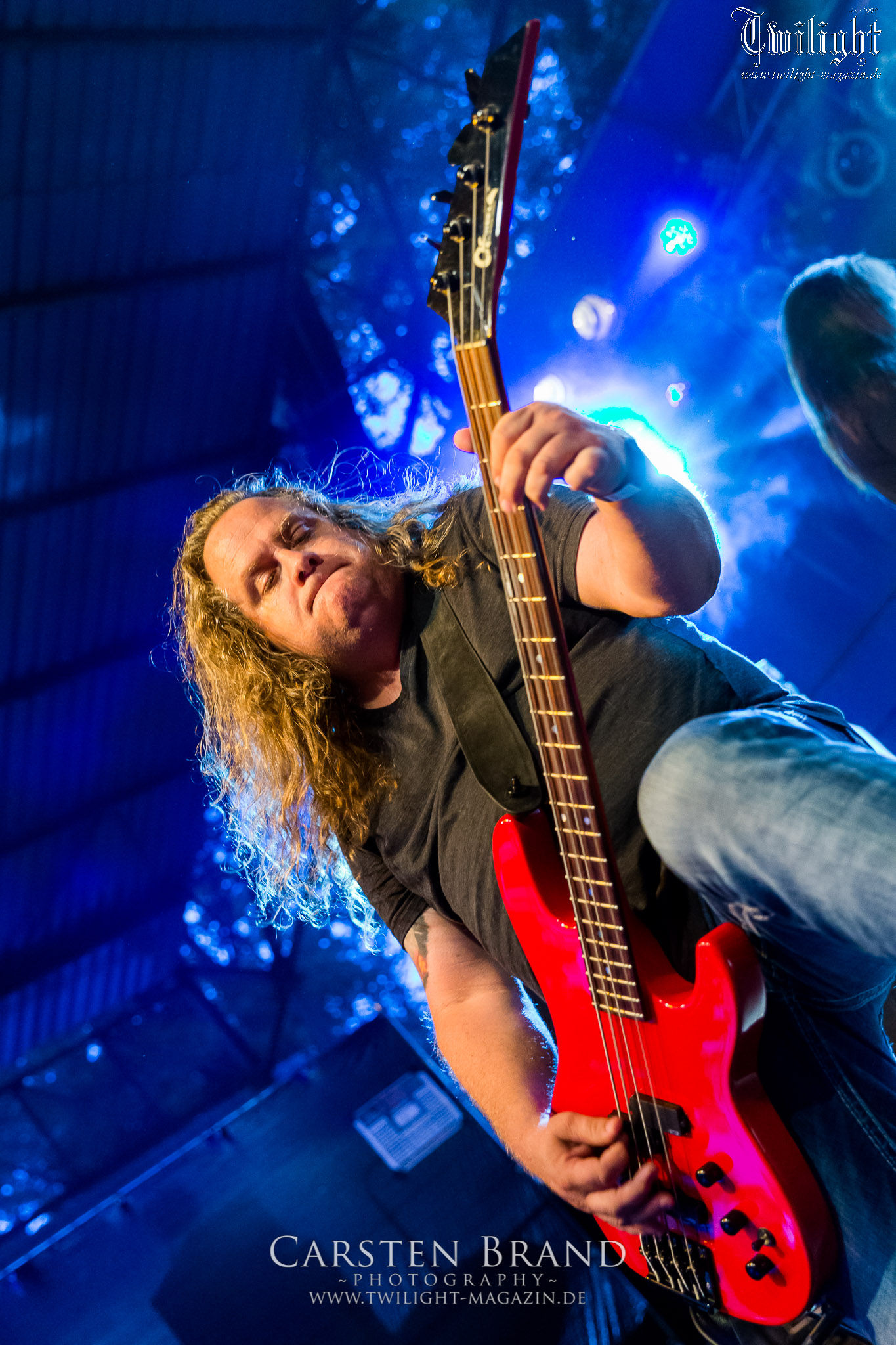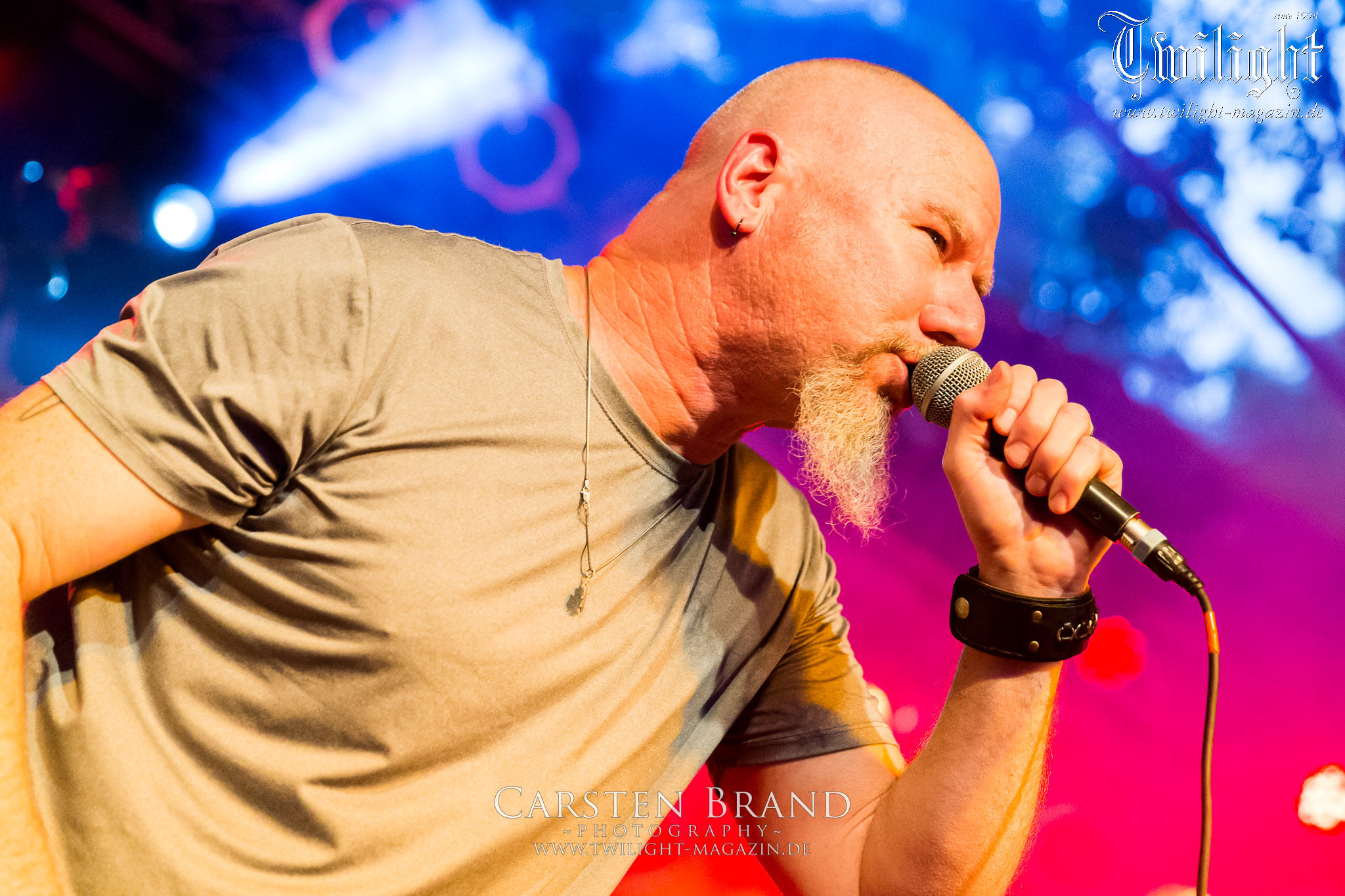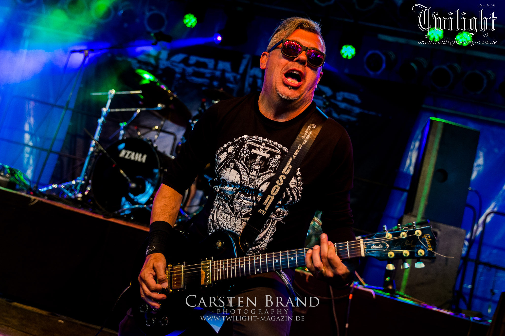 Zeit und Spielplan sind mittlerweile voran geschritten und schließlich wird auf der Hauptbühne mit Dark Sky Choir der Betrieb planmäßig wieder aufgenommen. Was an der einen Stelle für Klarheit sorgt, bedeutet im Zelt Ungewissheit und wirft immer wieder Fragen auf, da eigentlich nur klar ist, dass die Auftritte von SYLVANE und CRYPTS OF DESPAIR in die Timeline der Zeltbühne eingeschoben werden sollen, wobei Wandar wohl ihren Headliner-Status behalten sollen. Eine konkrete, aktualisierte Running Order wird aber weder online veröffentlicht und auch ein Aushang findet sich nirgends. Und das lässt verständlicherweise bei jenen, die sich vor allem auf die Gigs im Zelt gefreut hatten ordentlich Unmut und Ärger aufkommen. Ich nehme es sportlich und konzentriere mich auf die Hauptbühne. Ich bin nicht unbedingt glühender Verehrer von US-Heavy Metal aber DARK SKY CHOIR wissen mich live durchaus mit ihrer Frische, den technischen Finessen und einer ambitionierten Performance zu überzeugen. Die Mucke der Amis klingt modern, heavy und ist dabei teilweise sogar sehr straight und fast tanzbar. Ein leichter Thrash-Einschlag führt zu einer härtetechnischen Aufwertung, genauso wie das Organ von Brian Allen, der nicht nur klare Töne aus seiner Kehle holt, sondern dabei auch herrlich rauh klingen kann. Die Fähigkeiten der Instrumentalfraktion und das Zusammenspiel sind beeindruckend. Über Entertainer-Qualitäten verfügen alle Mitglieder. Eine Scheibe werde ich mir wohl nicht ins Regal stellen aber der Auftritt ist am Ende sehr viel mehr als nur eine Horizonterweiterung.