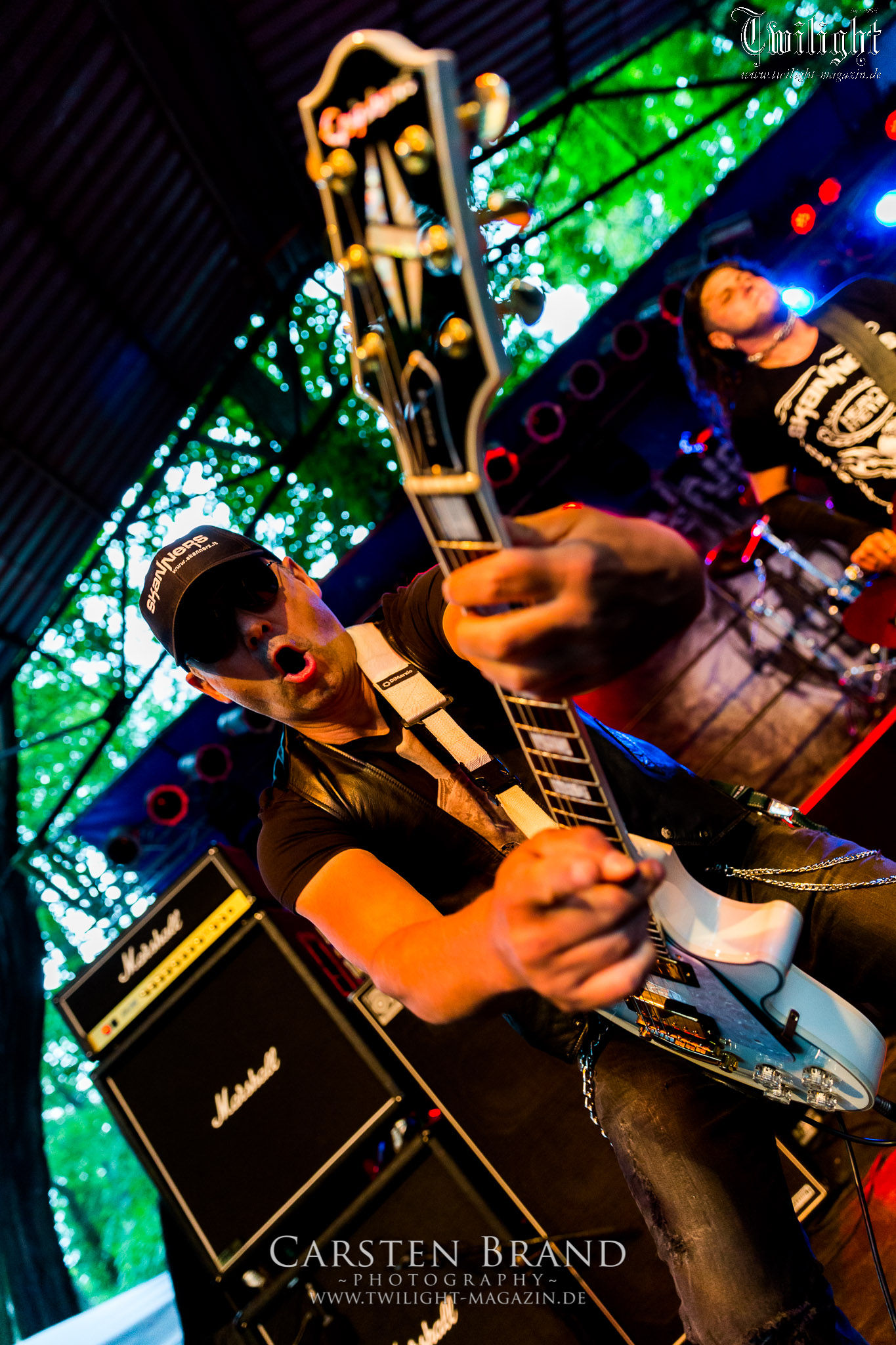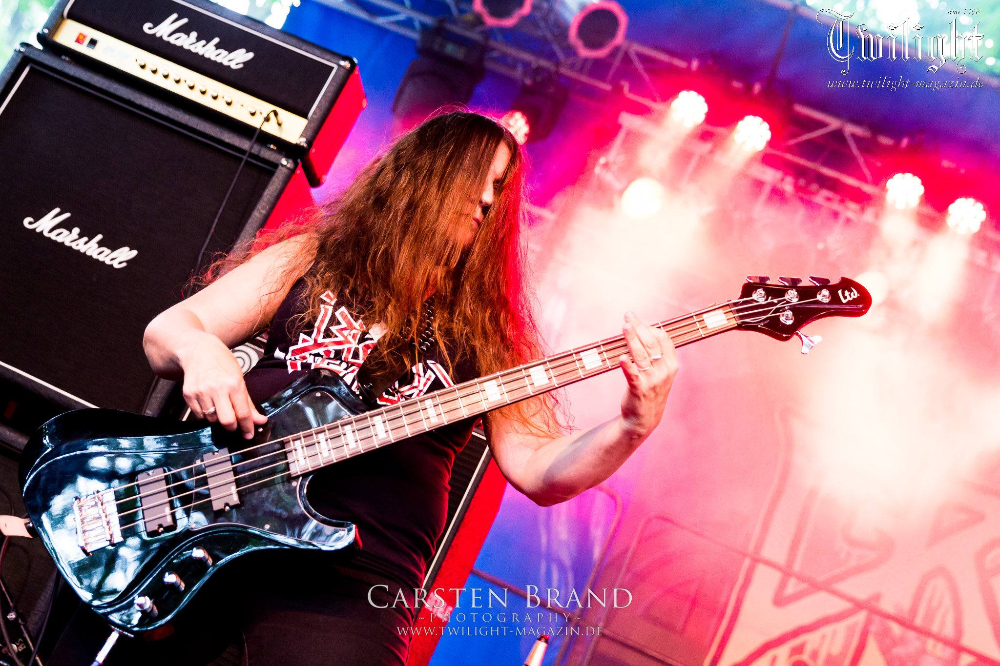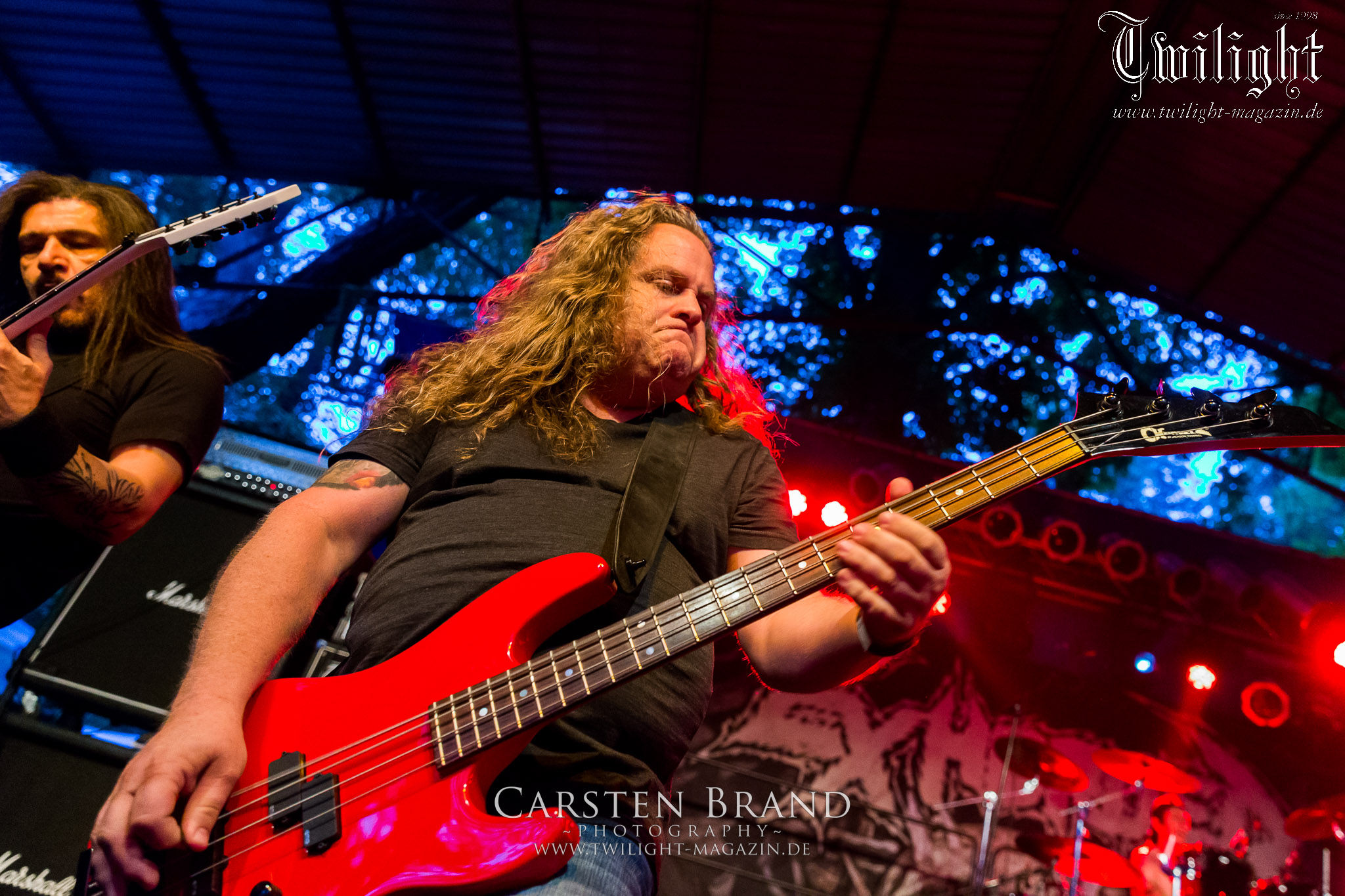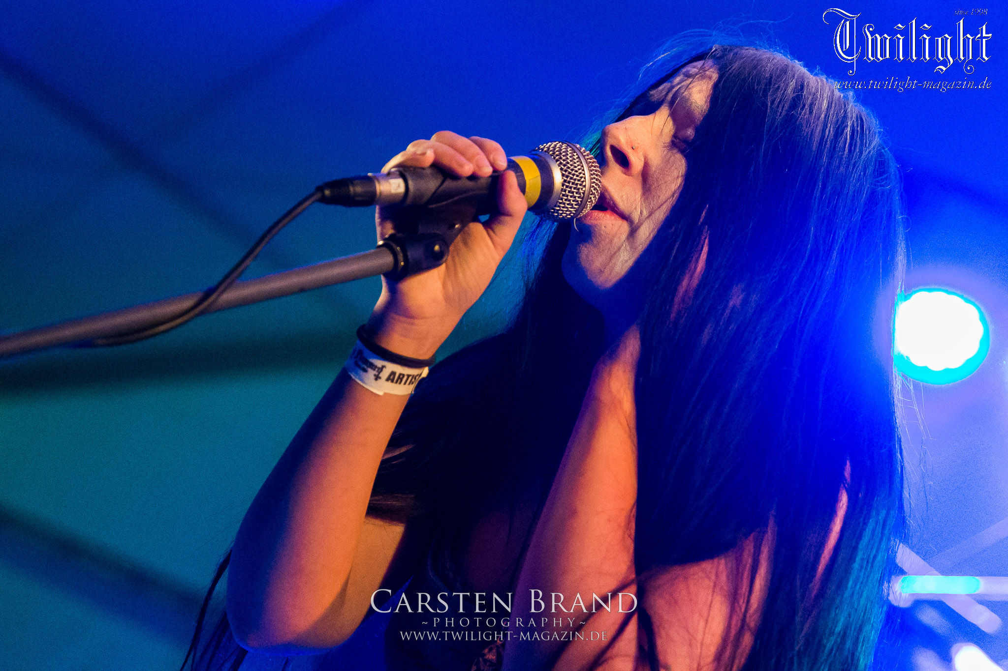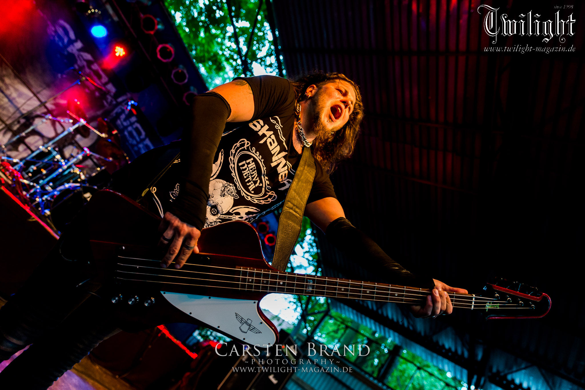 Zeit und Spielplan sind mittlerweile voran geschritten und schließlich wird auf der Hauptbühne mit Dark Sky Choir der Betrieb planmäßig wieder aufgenommen. Was an der einen Stelle für Klarheit sorgt, bedeutet im Zelt Ungewissheit und wirft immer wieder Fragen auf, da eigentlich nur klar ist, dass die Auftritte von SYLVANE und CRYPTS OF DESPAIR in die Timeline der Zeltbühne eingeschoben werden sollen, wobei Wandar wohl ihren Headliner-Status behalten sollen. Eine konkrete, aktualisierte Running Order wird aber weder online veröffentlicht und auch ein Aushang findet sich nirgends. Und das lässt verständlicherweise bei jenen, die sich vor allem auf die Gigs im Zelt gefreut hatten ordentlich Unmut und Ärger aufkommen. Ich nehme es sportlich und konzentriere mich auf die Hauptbühne. Ich bin nicht unbedingt glühender Verehrer von US-Heavy Metal aber DARK SKY CHOIR wissen mich live durchaus mit ihrer Frische, den technischen Finessen und einer ambitionierten Performance zu überzeugen. Die Mucke der Amis klingt modern, heavy und ist dabei teilweise sogar sehr straight und fast tanzbar. Ein leichter Thrash-Einschlag führt zu einer härtetechnischen Aufwertung, genauso wie das Organ von Brian Allen, der nicht nur klare Töne aus seiner Kehle holt, sondern dabei auch herrlich rauh klingen kann. Die Fähigkeiten der Instrumentalfraktion und das Zusammenspiel sind beeindruckend. Über Entertainer-Qualitäten verfügen alle Mitglieder. Eine Scheibe werde ich mir wohl nicht ins Regal stellen aber der Auftritt ist am Ende sehr viel mehr als nur eine Horizonterweiterung.