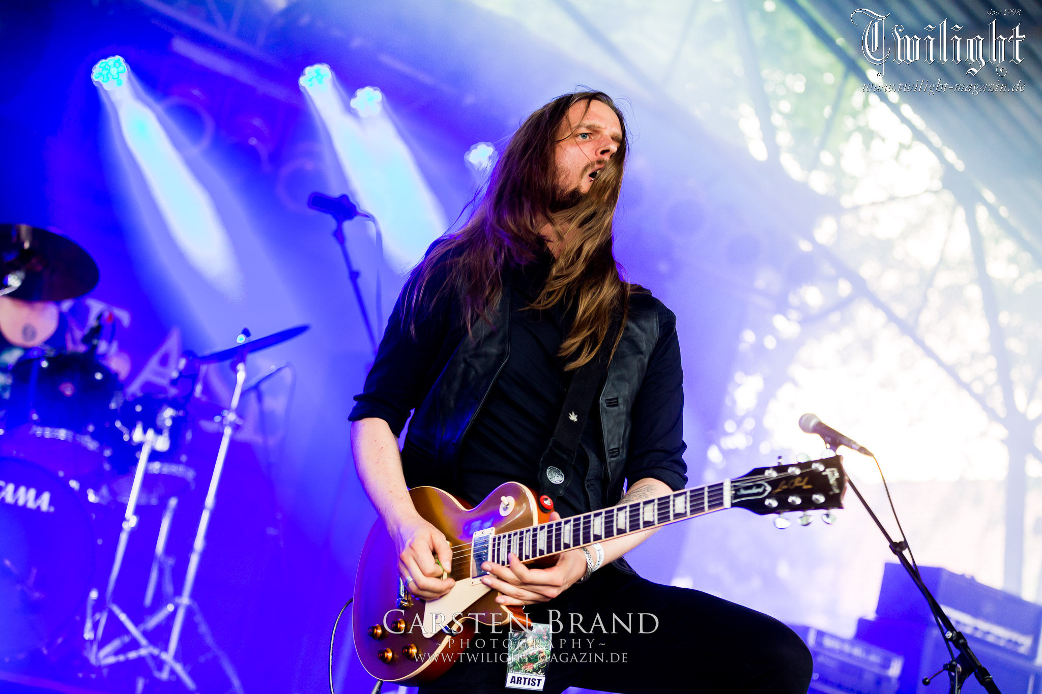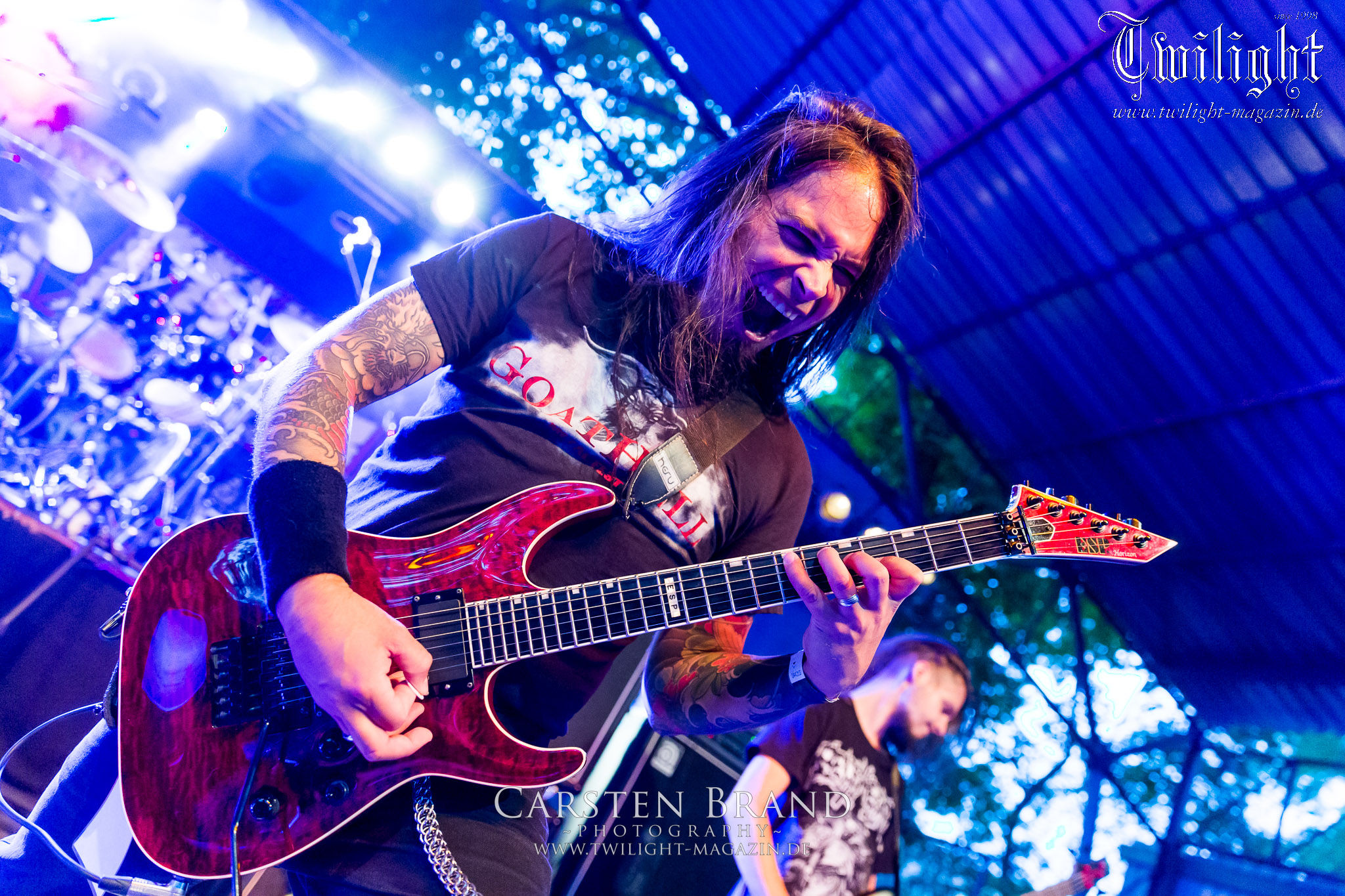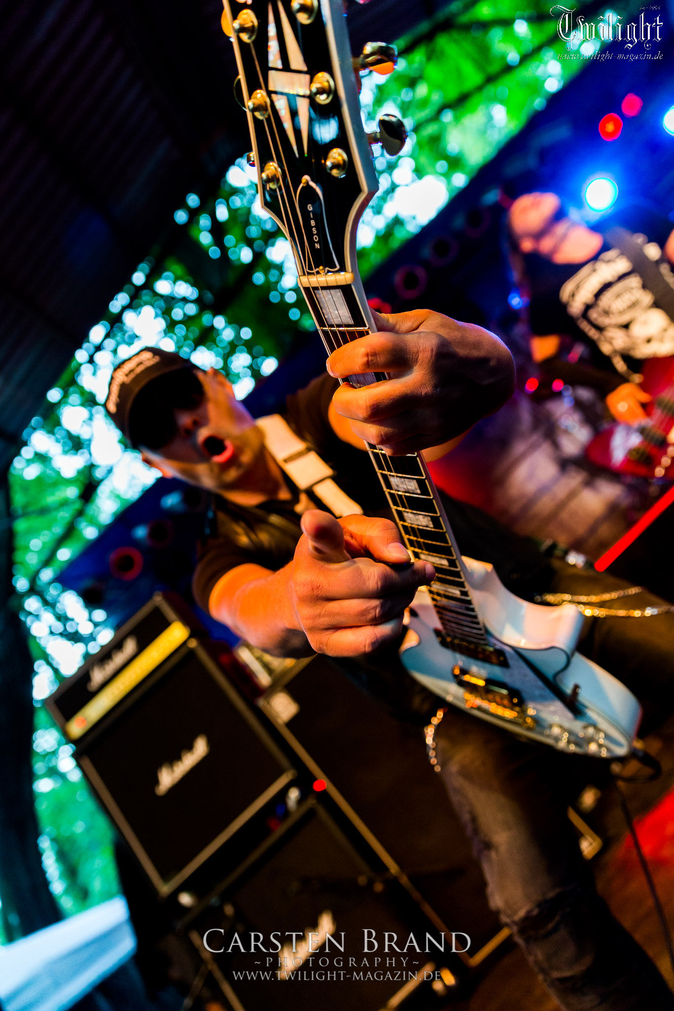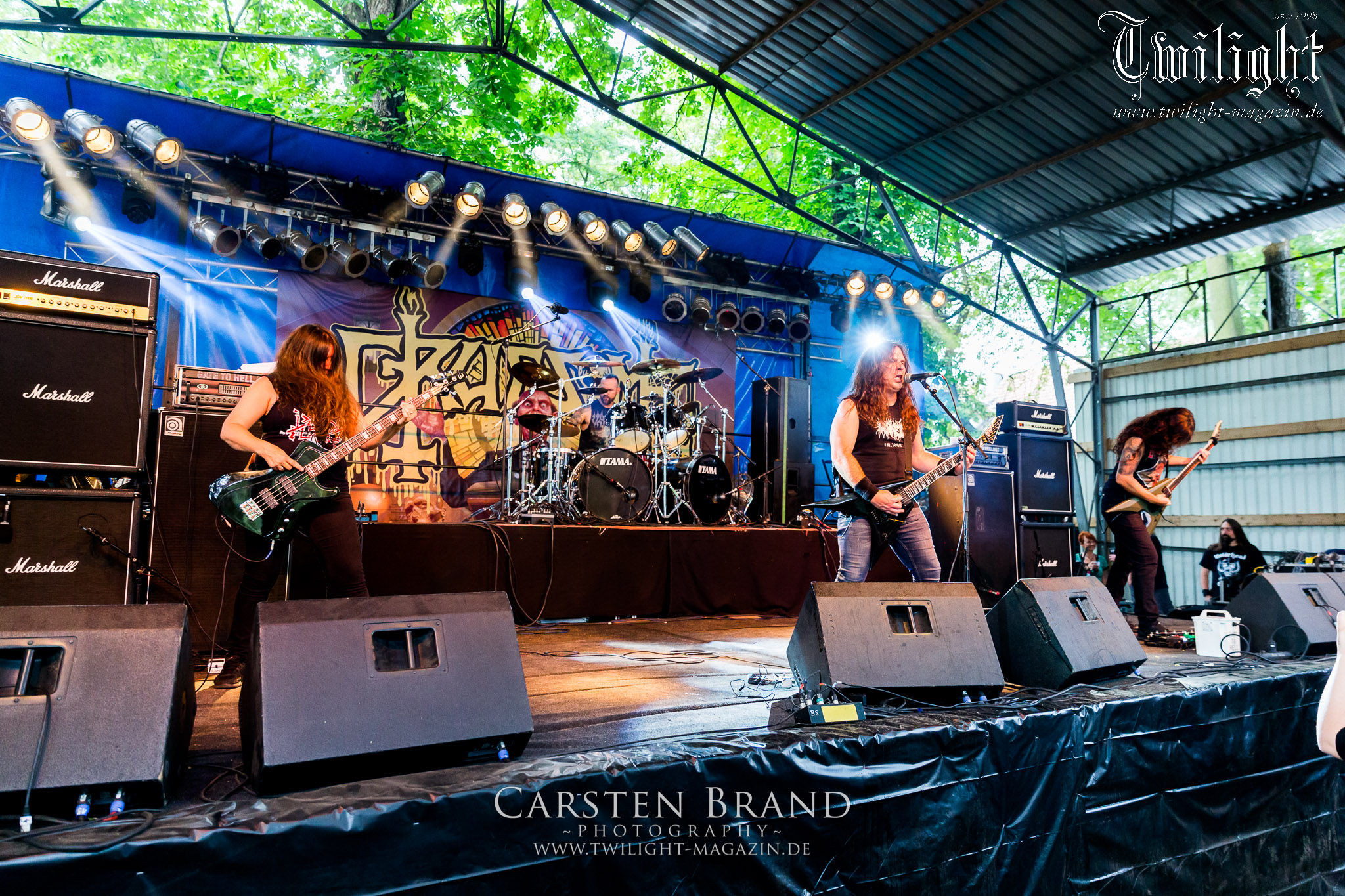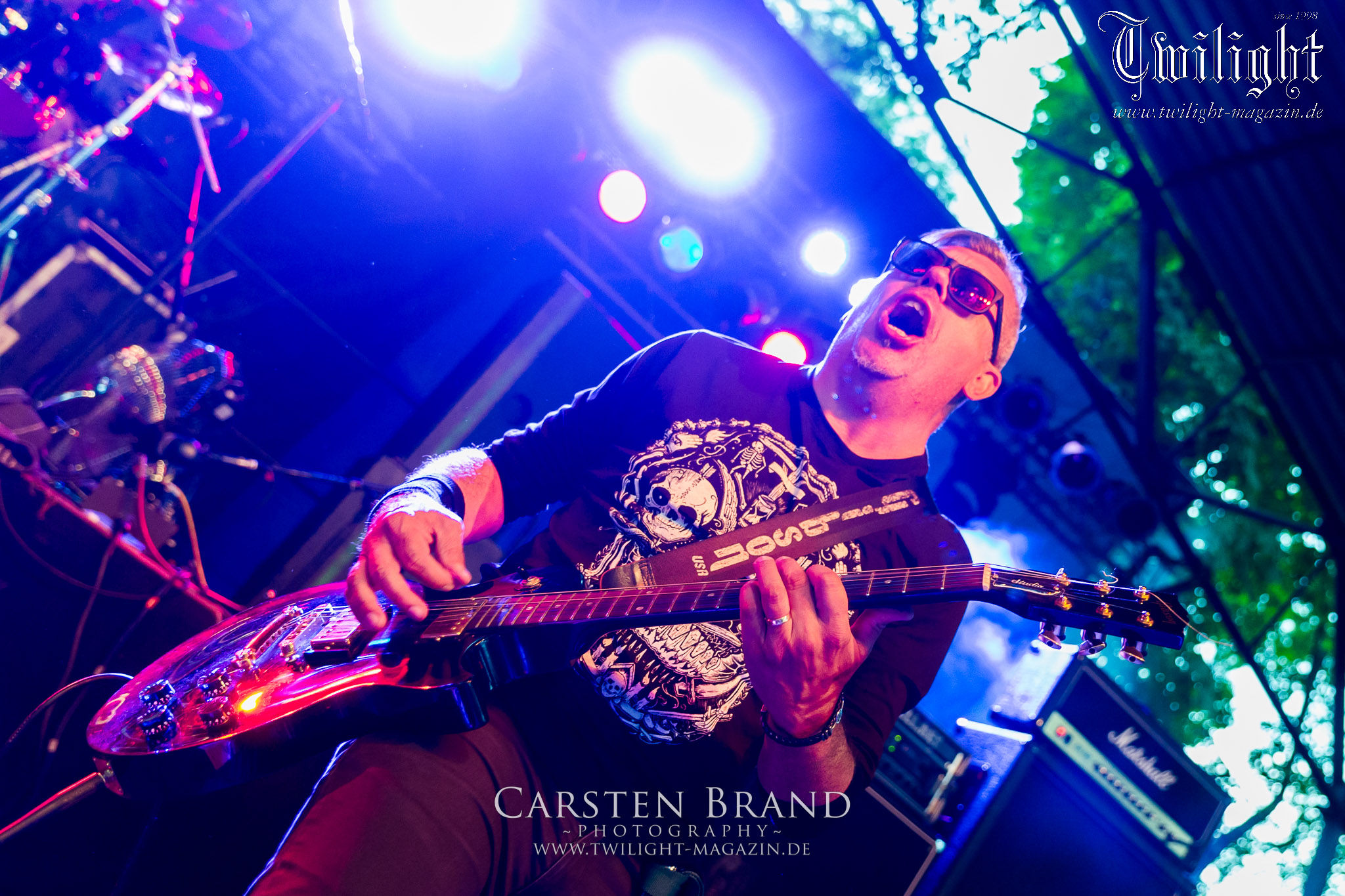 Zeit und Spielplan sind mittlerweile voran geschritten und schließlich wird auf der Hauptbühne mit Dark Sky Choir der Betrieb planmäßig wieder aufgenommen. Was an der einen Stelle für Klarheit sorgt, bedeutet im Zelt Ungewissheit und wirft immer wieder Fragen auf, da eigentlich nur klar ist, dass die Auftritte von SYLVANE und CRYPTS OF DESPAIR in die Timeline der Zeltbühne eingeschoben werden sollen, wobei Wandar wohl ihren Headliner-Status behalten sollen. Eine konkrete, aktualisierte Running Order wird aber weder online veröffentlicht und auch ein Aushang findet sich nirgends. Und das lässt verständlicherweise bei jenen, die sich vor allem auf die Gigs im Zelt gefreut hatten ordentlich Unmut und Ärger aufkommen. Ich nehme es sportlich und konzentriere mich auf die Hauptbühne. Ich bin nicht unbedingt glühender Verehrer von US-Heavy Metal aber DARK SKY CHOIR wissen mich live durchaus mit ihrer Frische, den technischen Finessen und einer ambitionierten Performance zu überzeugen. Die Mucke der Amis klingt modern, heavy und ist dabei teilweise sogar sehr straight und fast tanzbar. Ein leichter Thrash-Einschlag führt zu einer härtetechnischen Aufwertung, genauso wie das Organ von Brian Allen, der nicht nur klare Töne aus seiner Kehle holt, sondern dabei auch herrlich rauh klingen kann. Die Fähigkeiten der Instrumentalfraktion und das Zusammenspiel sind beeindruckend. Über Entertainer-Qualitäten verfügen alle Mitglieder. Eine Scheibe werde ich mir wohl nicht ins Regal stellen aber der Auftritt ist am Ende sehr viel mehr als nur eine Horizonterweiterung.