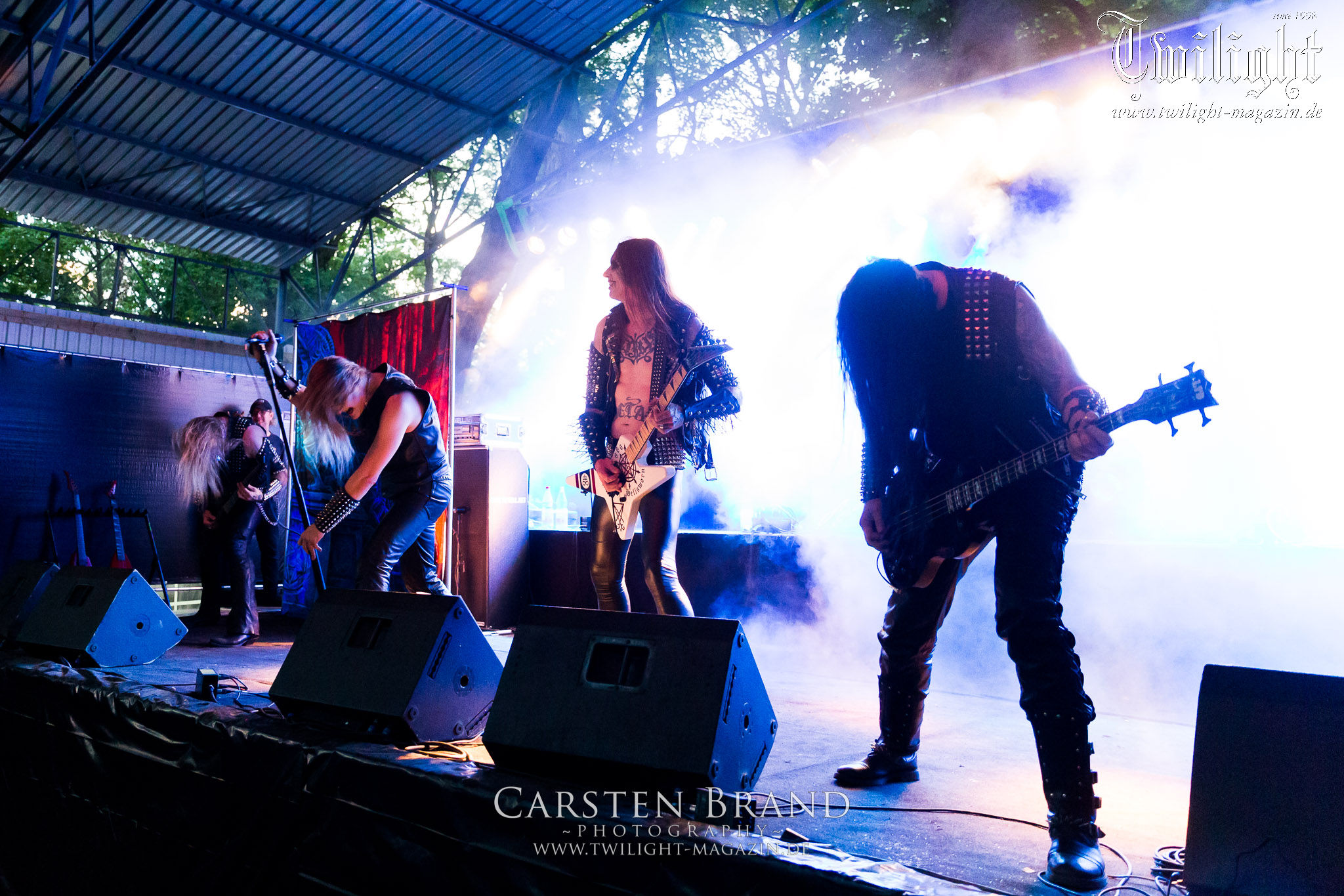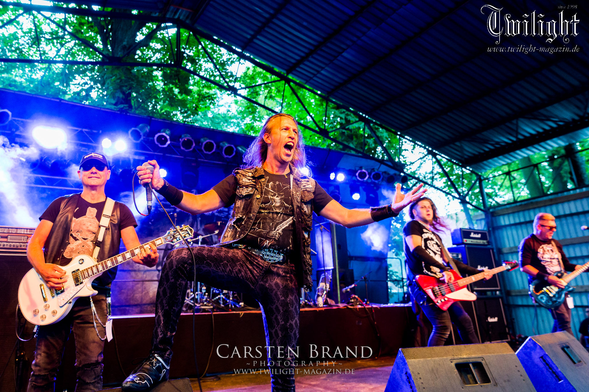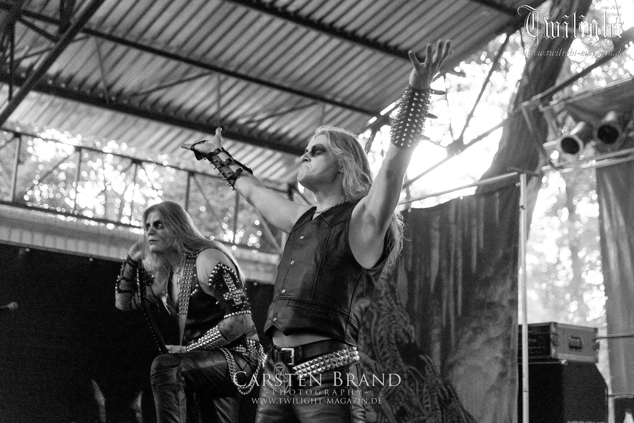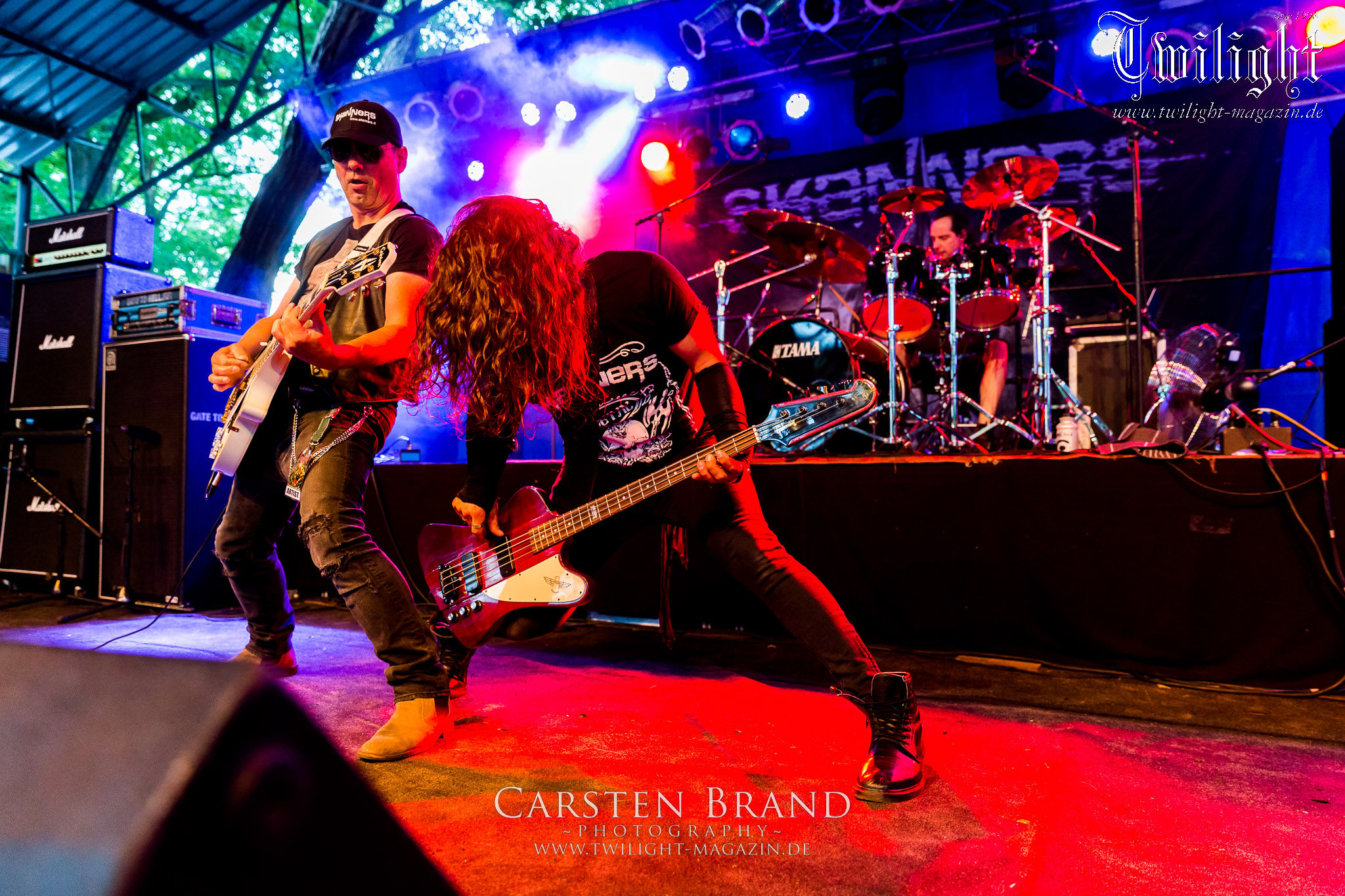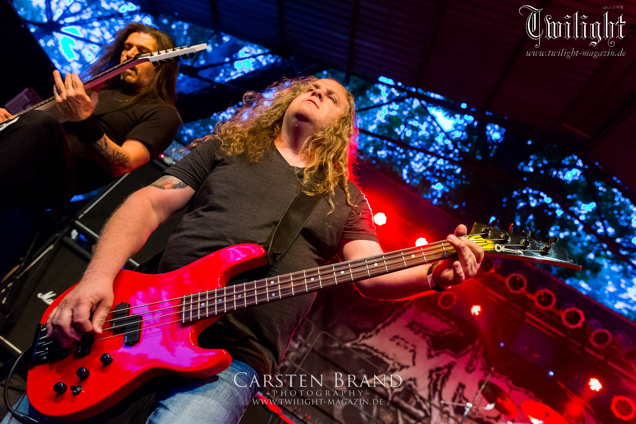 Zeit und Spielplan sind mittlerweile voran geschritten und schließlich wird auf der Hauptbühne mit Dark Sky Choir der Betrieb planmäßig wieder aufgenommen. Was an der einen Stelle für Klarheit sorgt, bedeutet im Zelt Ungewissheit und wirft immer wieder Fragen auf, da eigentlich nur klar ist, dass die Auftritte von SYLVANE und CRYPTS OF DESPAIR in die Timeline der Zeltbühne eingeschoben werden sollen, wobei Wandar wohl ihren Headliner-Status behalten sollen. Eine konkrete, aktualisierte Running Order wird aber weder online veröffentlicht und auch ein Aushang findet sich nirgends. Und das lässt verständlicherweise bei jenen, die sich vor allem auf die Gigs im Zelt gefreut hatten ordentlich Unmut und Ärger aufkommen. Ich nehme es sportlich und konzentriere mich auf die Hauptbühne. Ich bin nicht unbedingt glühender Verehrer von US-Heavy Metal aber DARK SKY CHOIR wissen mich live durchaus mit ihrer Frische, den technischen Finessen und einer ambitionierten Performance zu überzeugen. Die Mucke der Amis klingt modern, heavy und ist dabei teilweise sogar sehr straight und fast tanzbar. Ein leichter Thrash-Einschlag führt zu einer härtetechnischen Aufwertung, genauso wie das Organ von Brian Allen, der nicht nur klare Töne aus seiner Kehle holt, sondern dabei auch herrlich rauh klingen kann. Die Fähigkeiten der Instrumentalfraktion und das Zusammenspiel sind beeindruckend. Über Entertainer-Qualitäten verfügen alle Mitglieder. Eine Scheibe werde ich mir wohl nicht ins Regal stellen aber der Auftritt ist am Ende sehr viel mehr als nur eine Horizonterweiterung.
