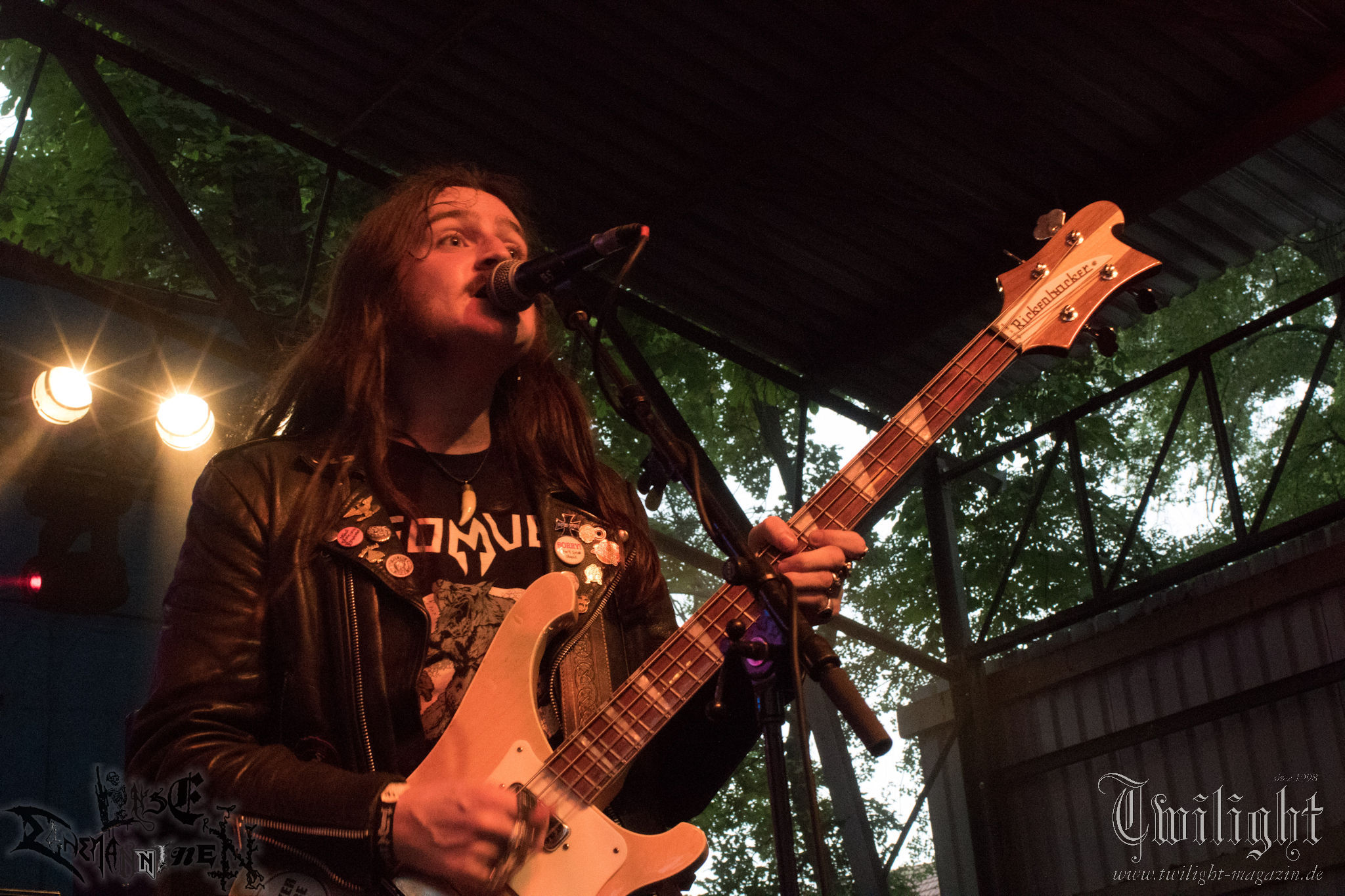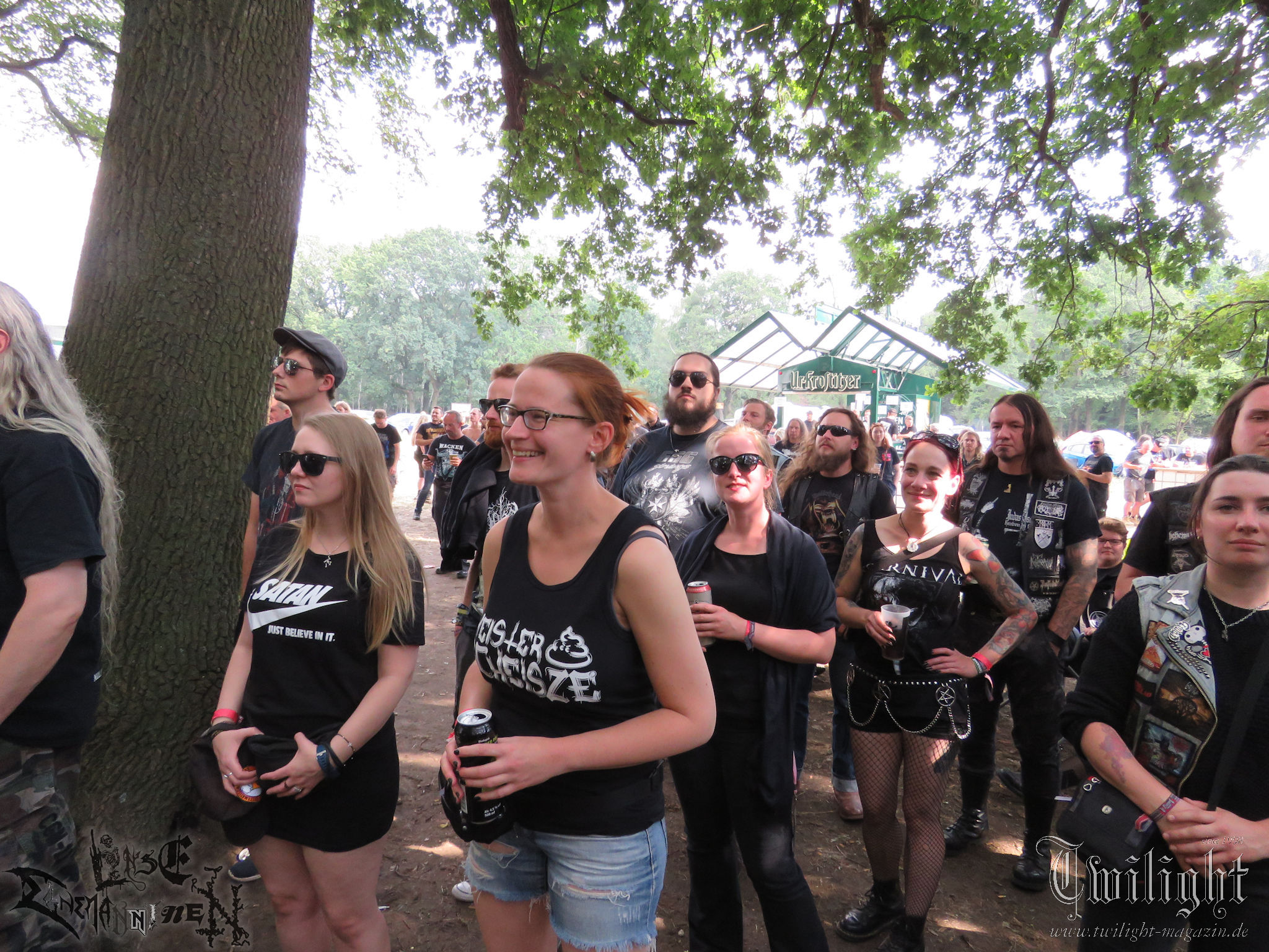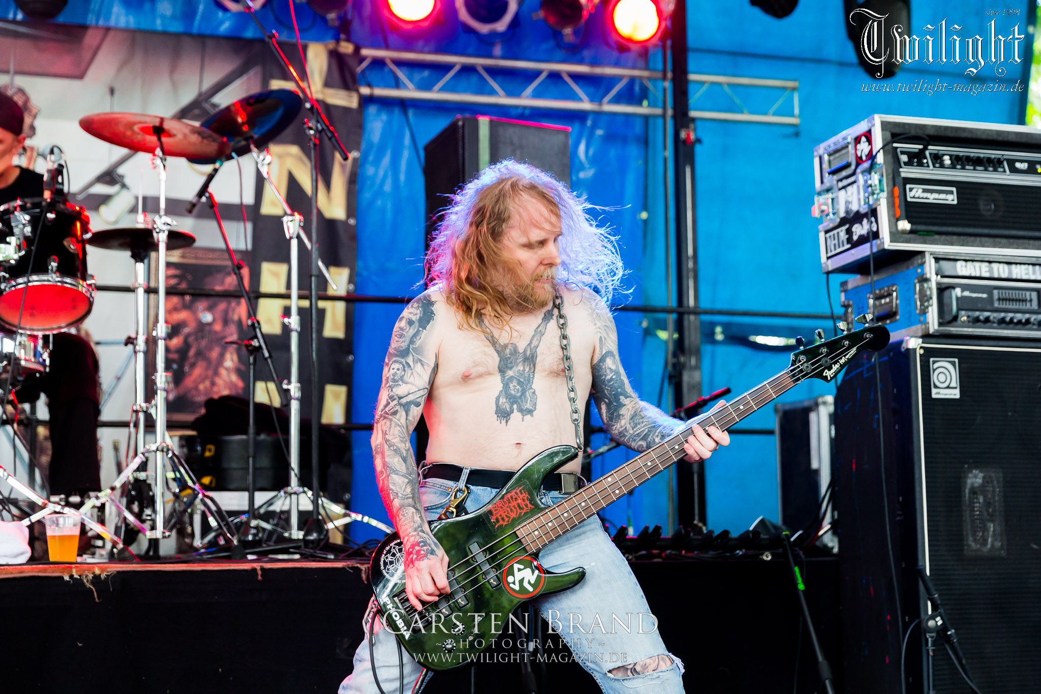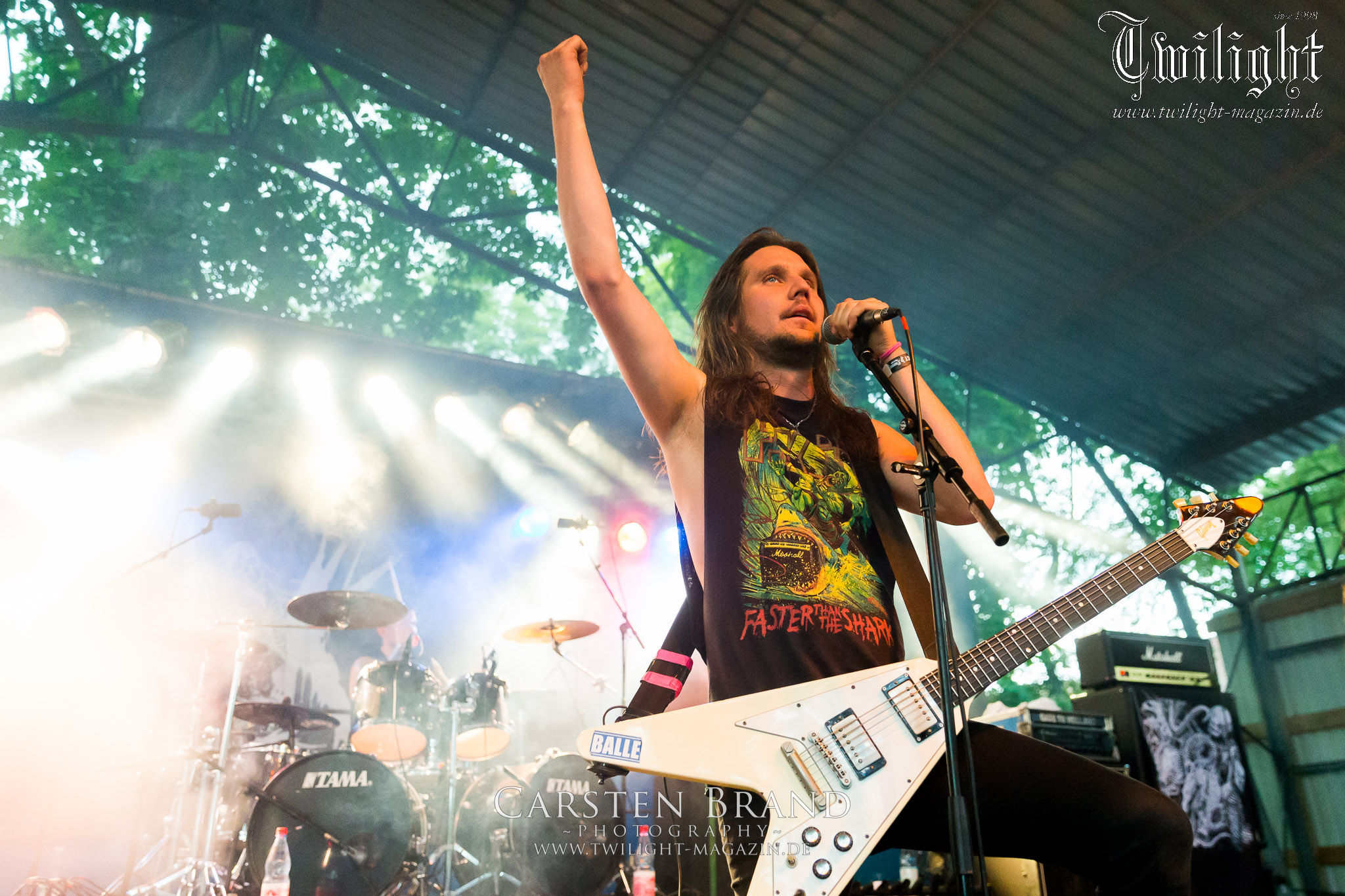 Die deutschen Death-Grind- und Underground-Urgesteine heißen die Besucher am frühen Abend mit einer ordentlichen Soundbreitseite der alten, technischen Todesmetall-Schule willkommen. Wie im letzten Jahr wird die Gartenparty auf der Hauptbühne und nicht im Zelt eröffnet, was nicht zuletzt am erneut gewachsenen Besucherinteresse liegt. WIEGEDOOD lassen danach wohl die meisten Black Metal - Herzen höher schlagen. Die Belgier, die mittlerweile bei Century Media unter gekommen sind liefern eine Lehrstunde in Sachen Nihilismus und musikalisch primitiver, schnörkelloser wie schlichter Raserei. Nicht erst seit dem Party.San Open Air 2017, bei dem ASOMVEL einen kongenialen Set zum Frühschoppen hinlegten, sind die Briten mehr als ein Geheimtipp. Nicht nur in optischer Hinsicht sind Asomvel das Trio, dass das Erbe von Lemmy & Co. mit Würde und Respekt angetreten hat, obwohl es die Band mittlerweile auch schon eine halbe Ewigkeit gibt. Das Trio ist Röck & Röll pur und weiß nicht nur mit dem Material das aktuellen Albums "World Shaker" in bester Motörhead-Manier zu überzeugen. Für mich DER Gig des Donnerstags und einer der herausragendsten des Festivals. Hoffentlich legen die Briten bald mal eine Tour nach.