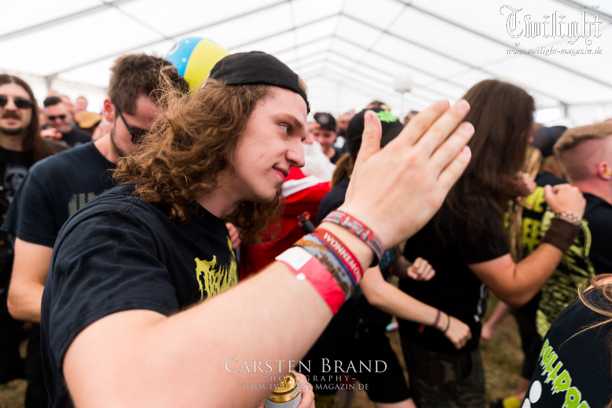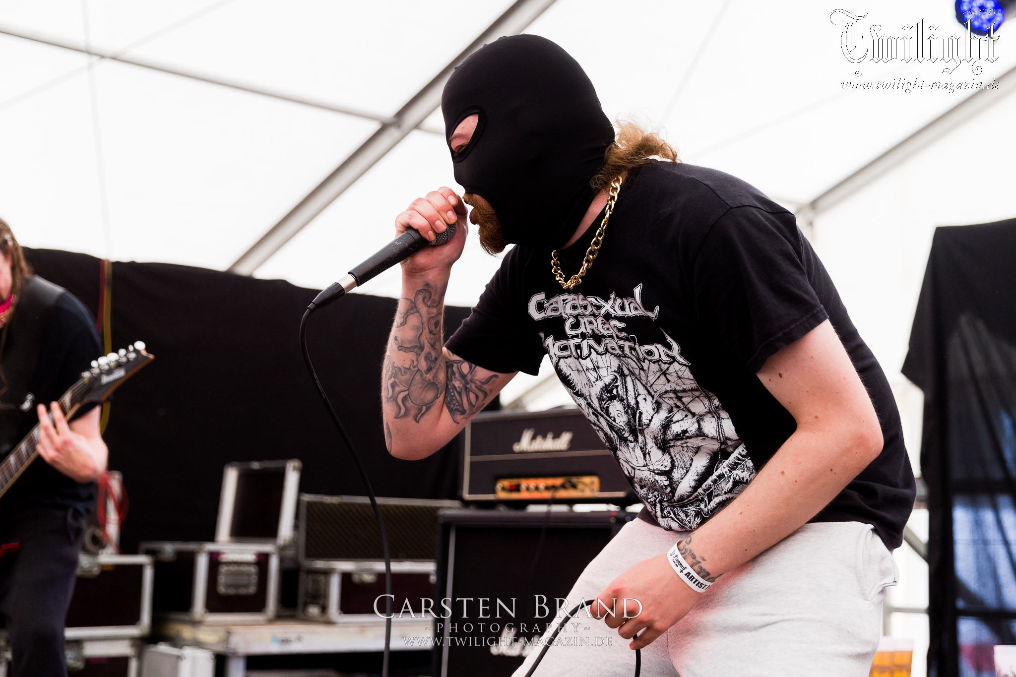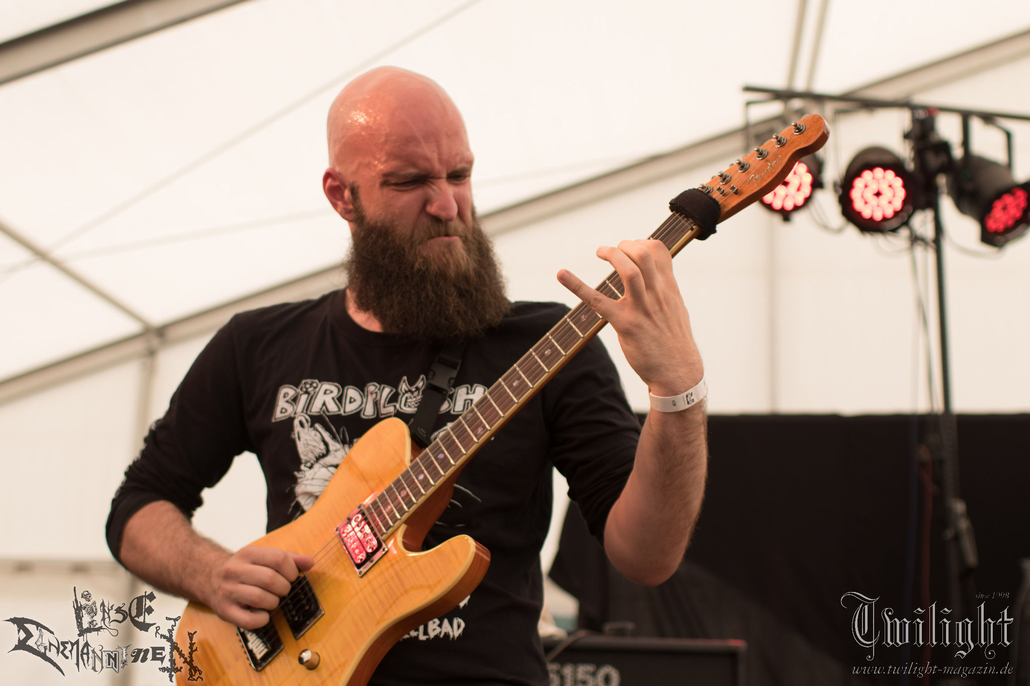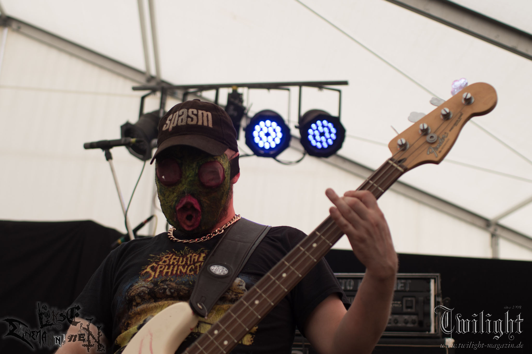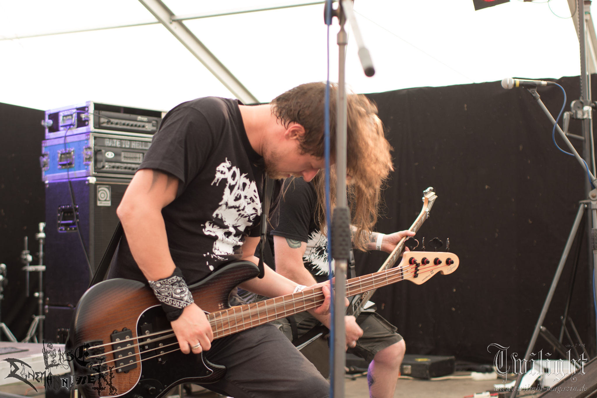 Nach Frühstück und Dusche steht bei mir noch ein Interview mit den Jungs von Atomwinter an, welches ihr später noch im Twilight zu lesen bekommt. Anschließend schaffe ich es gerade noch rechtzeitig vor die Hauptbühne, wo GUTSLIT mit knochentrockener Brutalo-Keule das Festival-Finale einleuten. Die morgendlichen Sportmuffel kreiseln ihre Meter ausgelassen im Circle-Pit runter und gehen somit dem klassischen metallischen Frühsport nach. Abgesehen davon, dass mich die technisch versierten Gutslit rein musikalisch zwar stilistisch nicht umhauen, nehme ich aber die Erkenntnis mit, das ambitionierter Death-Grind selbst in Indien gespielt wird.