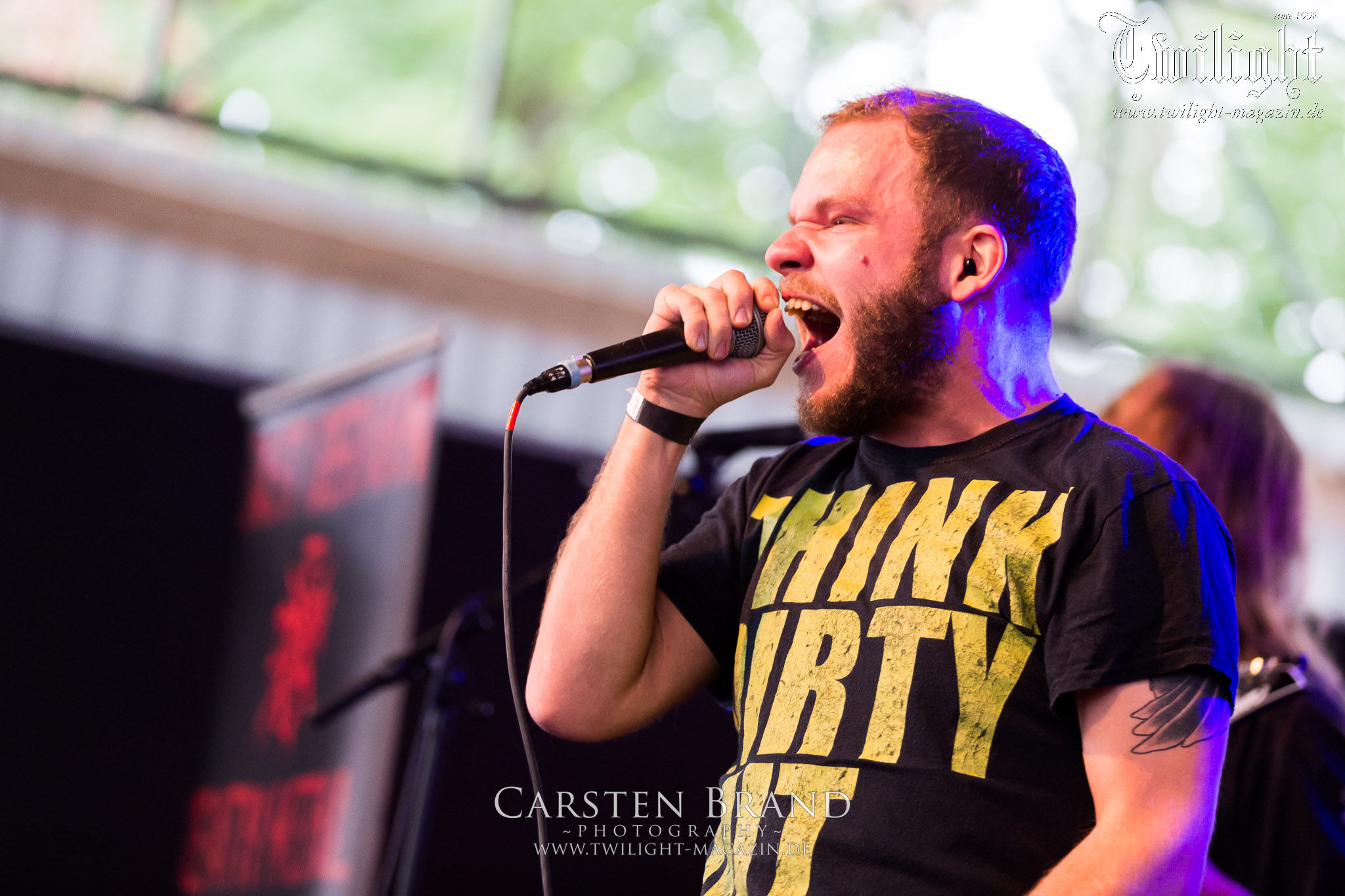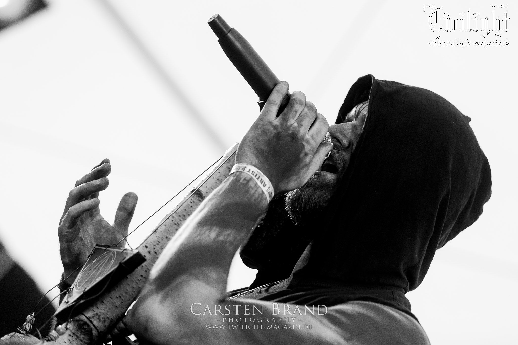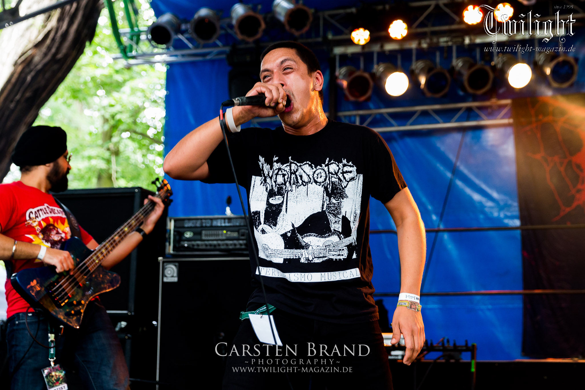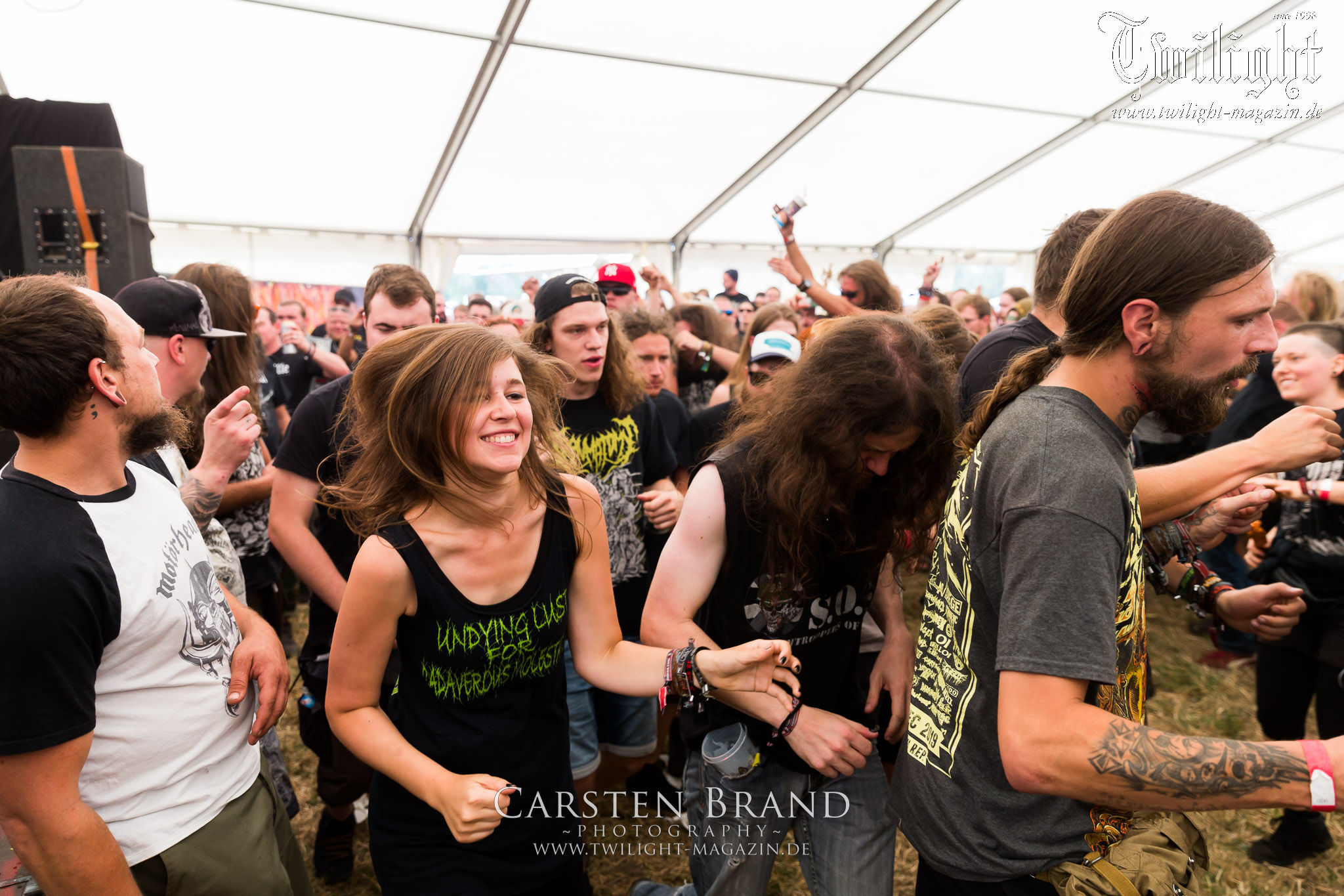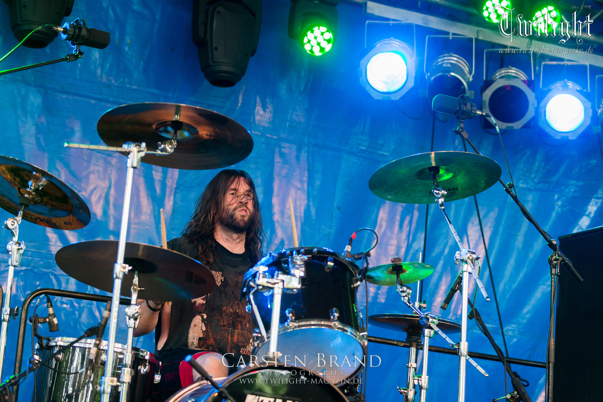Nach Frühstück und Dusche steht bei mir noch ein Interview mit den Jungs von Atomwinter an, welches ihr später noch im Twilight zu lesen bekommt. Anschließend schaffe ich es gerade noch rechtzeitig vor die Hauptbühne, wo GUTSLIT mit knochentrockener Brutalo-Keule das Festival-Finale einleuten. Die morgendlichen Sportmuffel kreiseln ihre Meter ausgelassen im Circle-Pit runter und gehen somit dem klassischen metallischen Frühsport nach. Abgesehen davon, dass mich die technisch versierten Gutslit rein musikalisch zwar stilistisch nicht umhauen, nehme ich aber die Erkenntnis mit, das ambitionierter Death-Grind selbst in Indien gespielt wird.