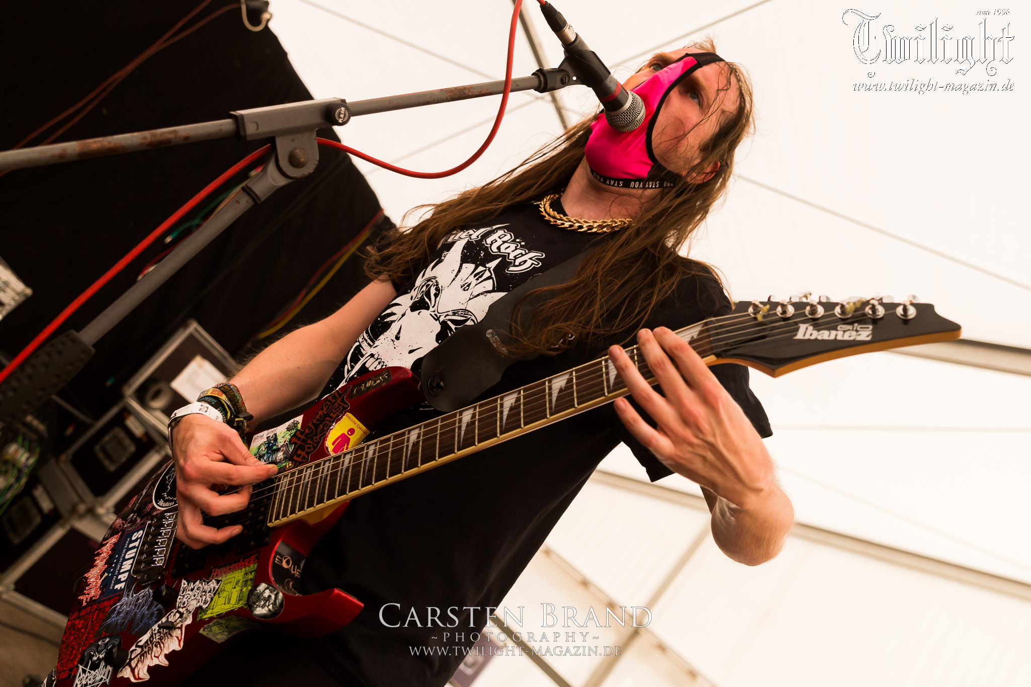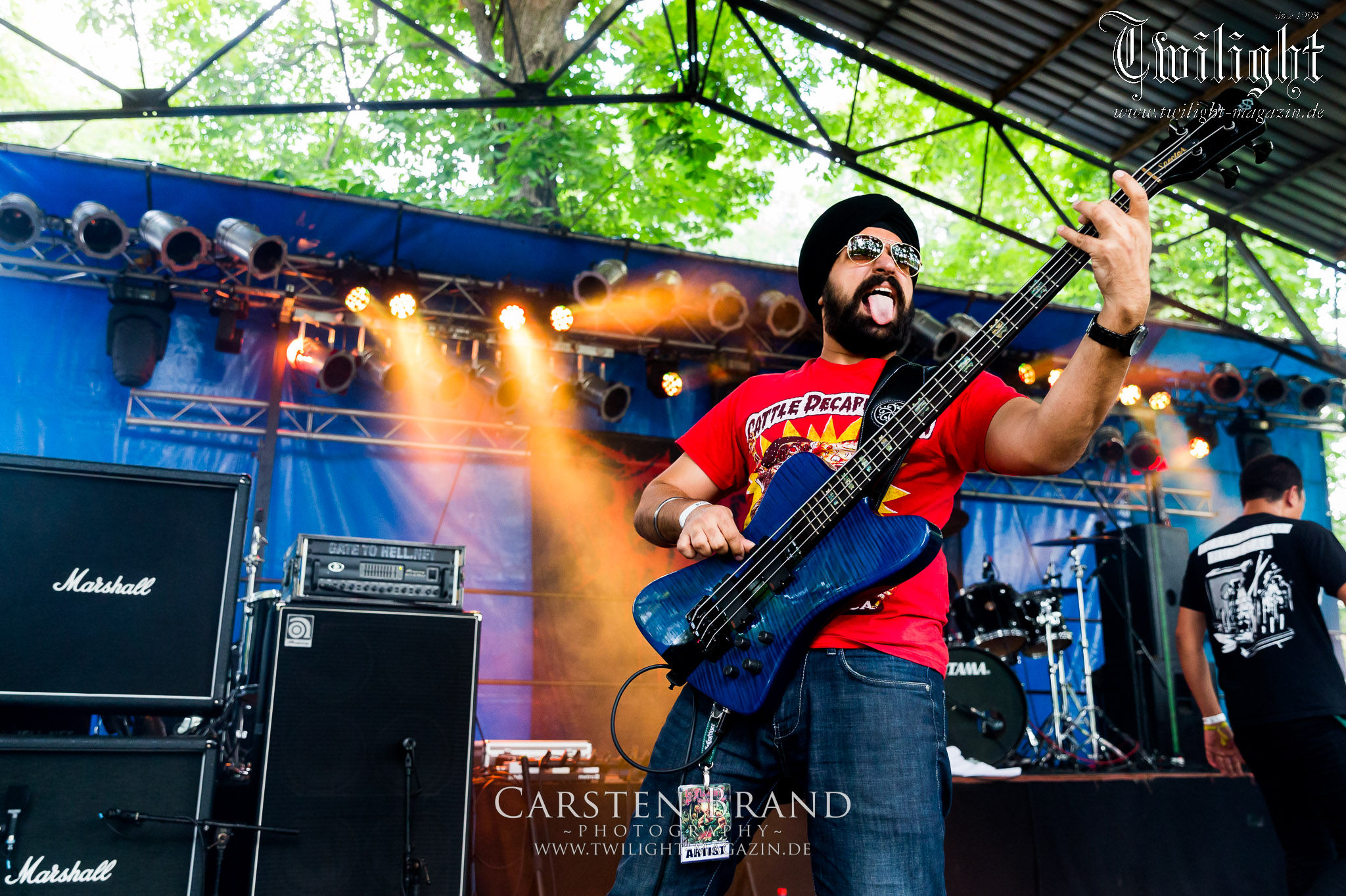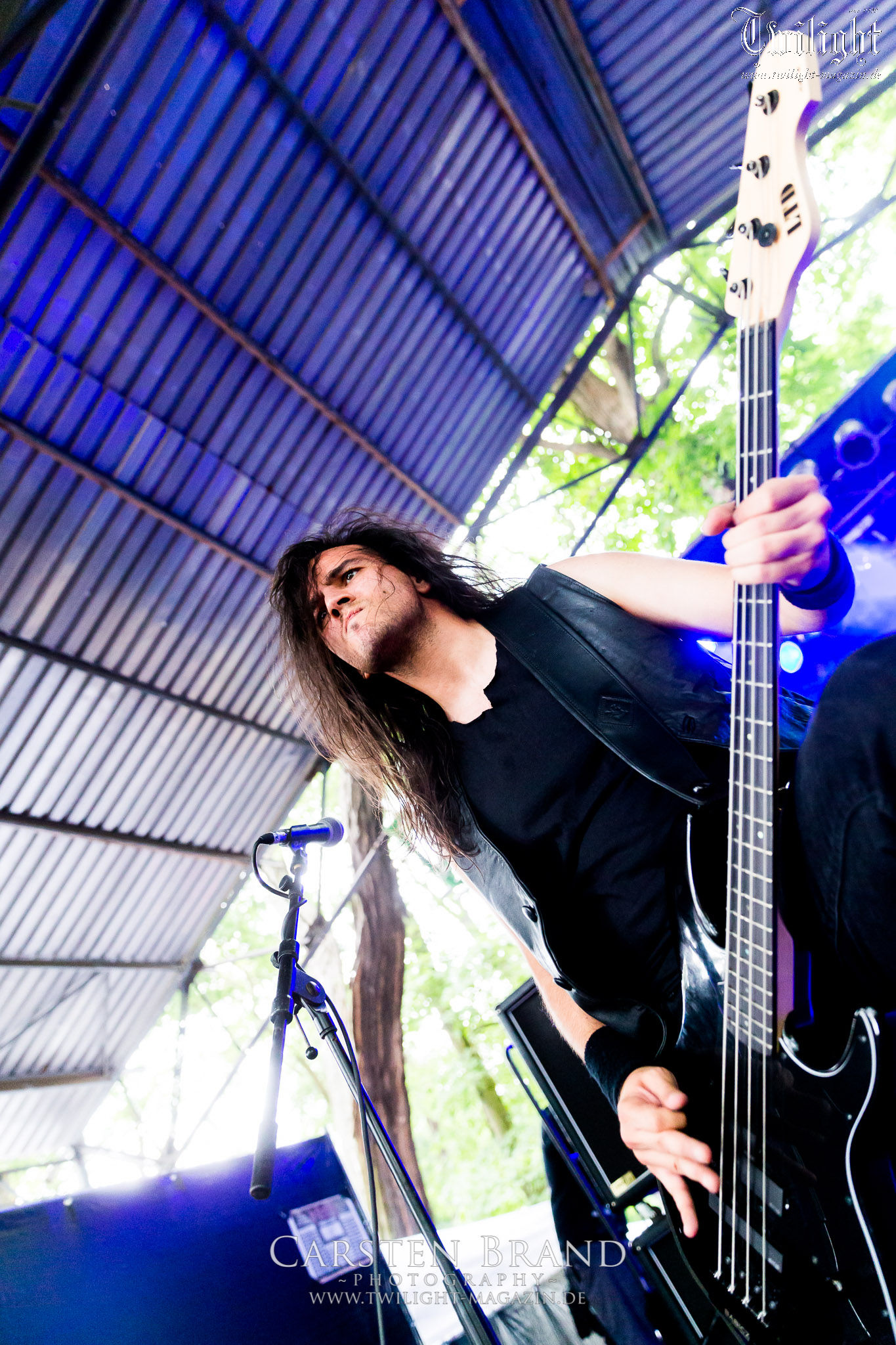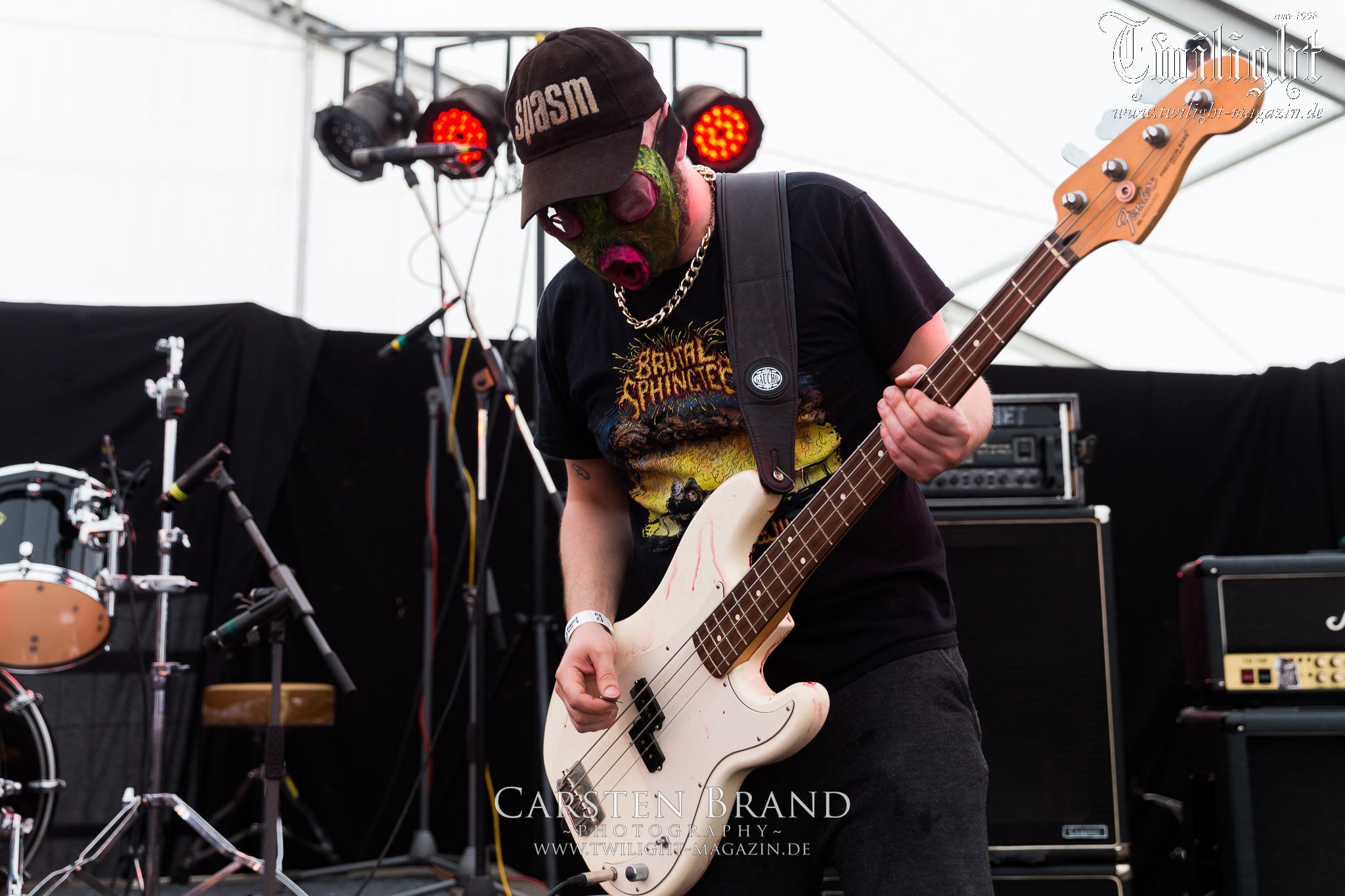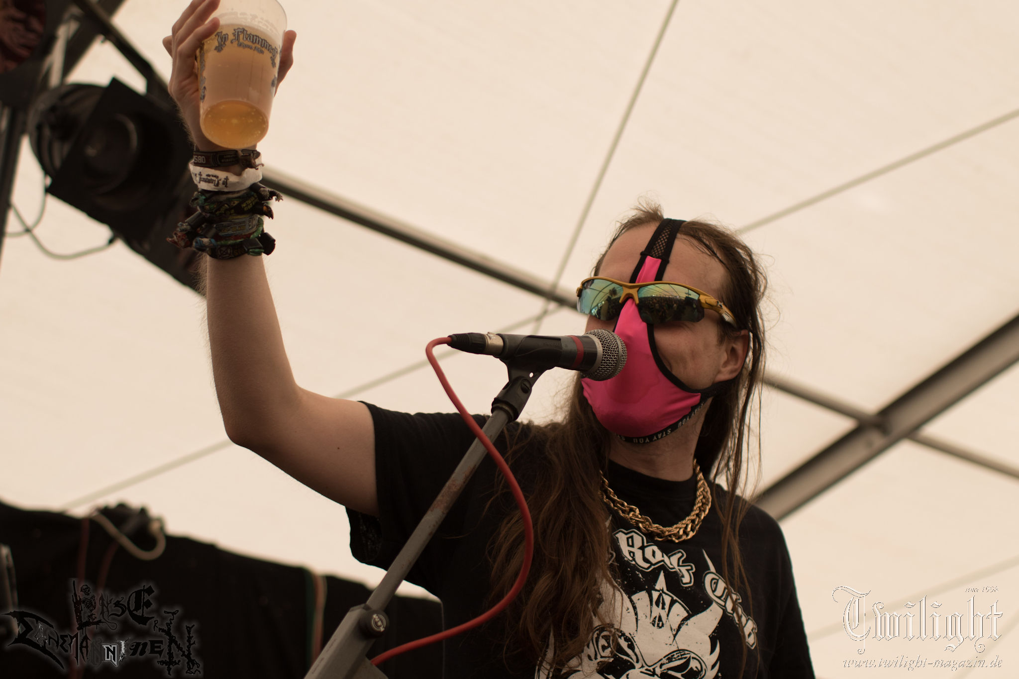 Nach Frühstück und Dusche steht bei mir noch ein Interview mit den Jungs von Atomwinter an, welches ihr später noch im Twilight zu lesen bekommt. Anschließend schaffe ich es gerade noch rechtzeitig vor die Hauptbühne, wo GUTSLIT mit knochentrockener Brutalo-Keule das Festival-Finale einleuten. Die morgendlichen Sportmuffel kreiseln ihre Meter ausgelassen im Circle-Pit runter und gehen somit dem klassischen metallischen Frühsport nach. Abgesehen davon, dass mich die technisch versierten Gutslit rein musikalisch zwar stilistisch nicht umhauen, nehme ich aber die Erkenntnis mit, das ambitionierter Death-Grind selbst in Indien gespielt wird.