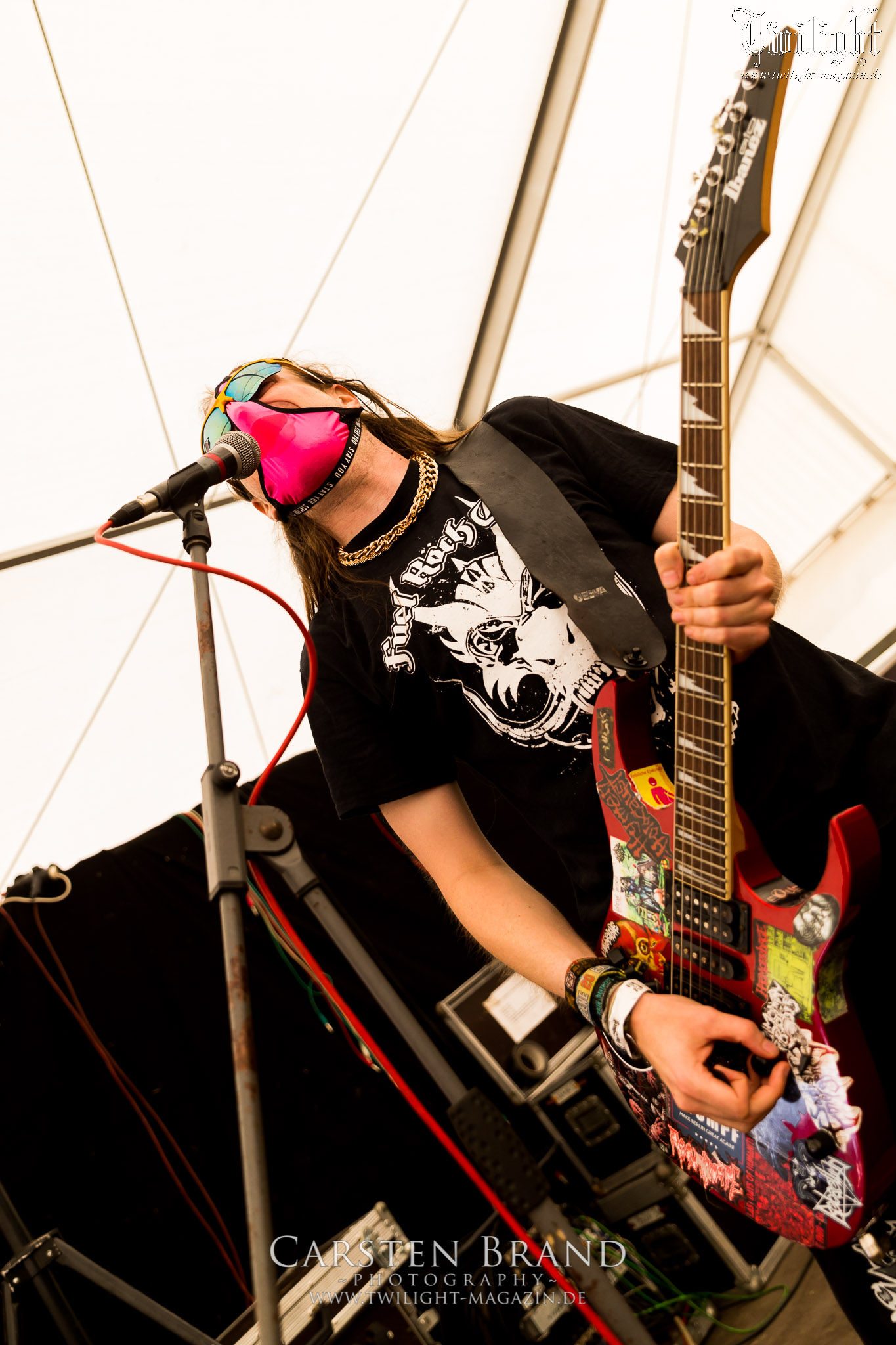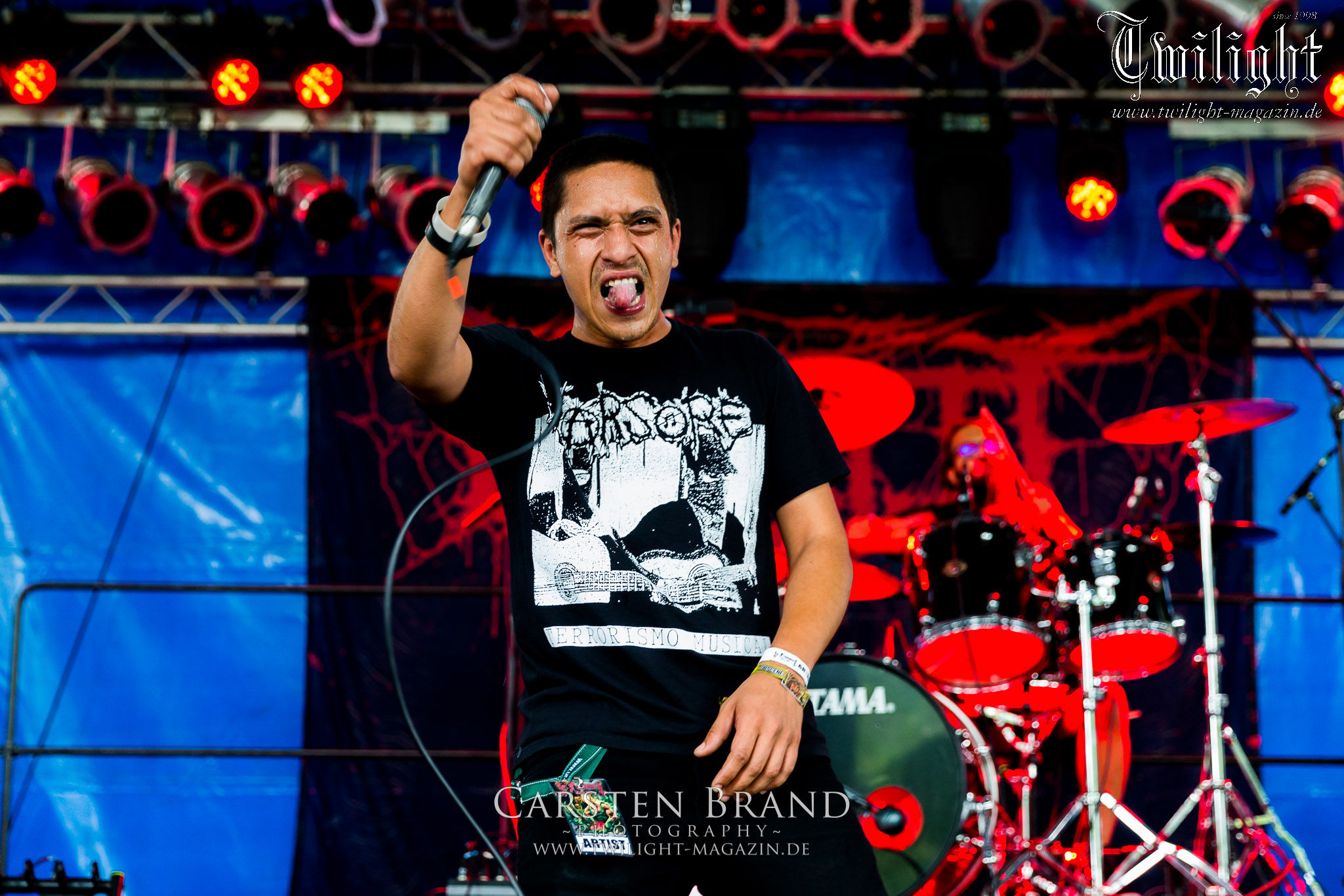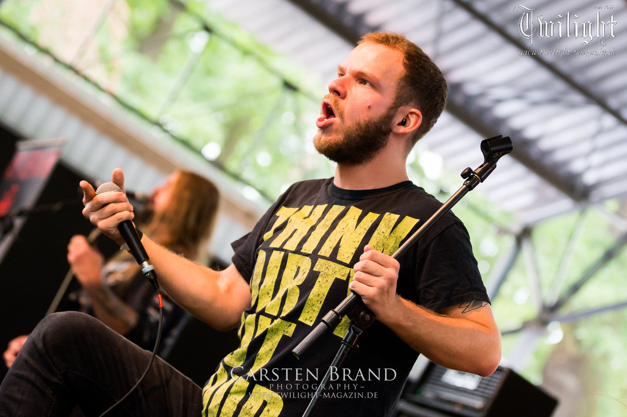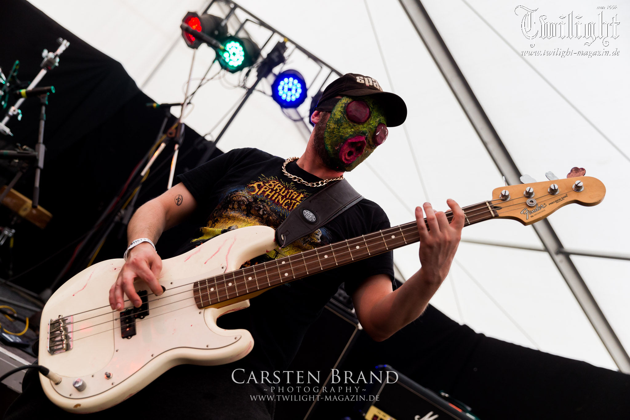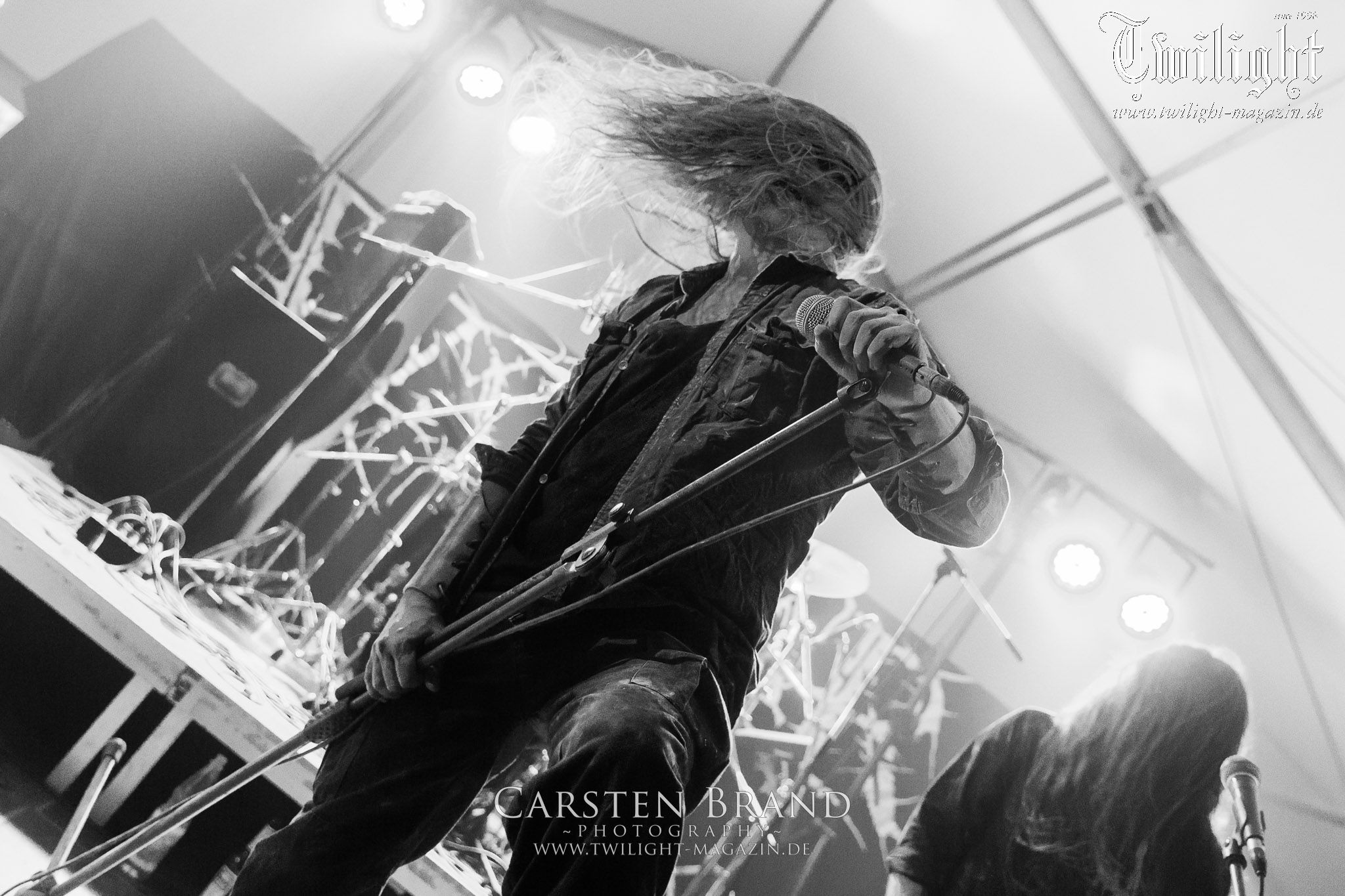 Nach Frühstück und Dusche steht bei mir noch ein Interview mit den Jungs von Atomwinter an, welches ihr später noch im Twilight zu lesen bekommt. Anschließend schaffe ich es gerade noch rechtzeitig vor die Hauptbühne, wo GUTSLIT mit knochentrockener Brutalo-Keule das Festival-Finale einleuten. Die morgendlichen Sportmuffel kreiseln ihre Meter ausgelassen im Circle-Pit runter und gehen somit dem klassischen metallischen Frühsport nach. Abgesehen davon, dass mich die technisch versierten Gutslit rein musikalisch zwar stilistisch nicht umhauen, nehme ich aber die Erkenntnis mit, das ambitionierter Death-Grind selbst in Indien gespielt wird.