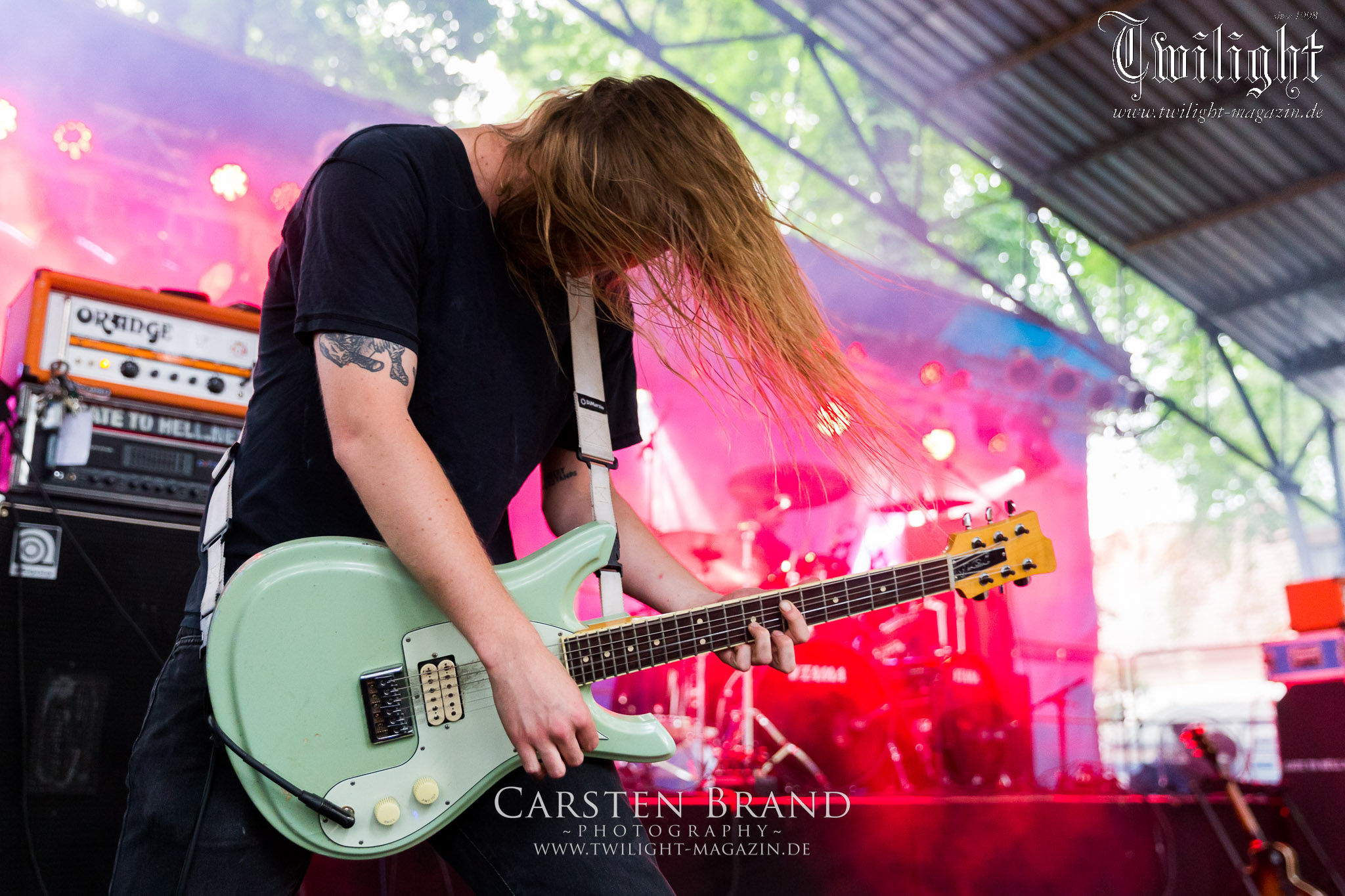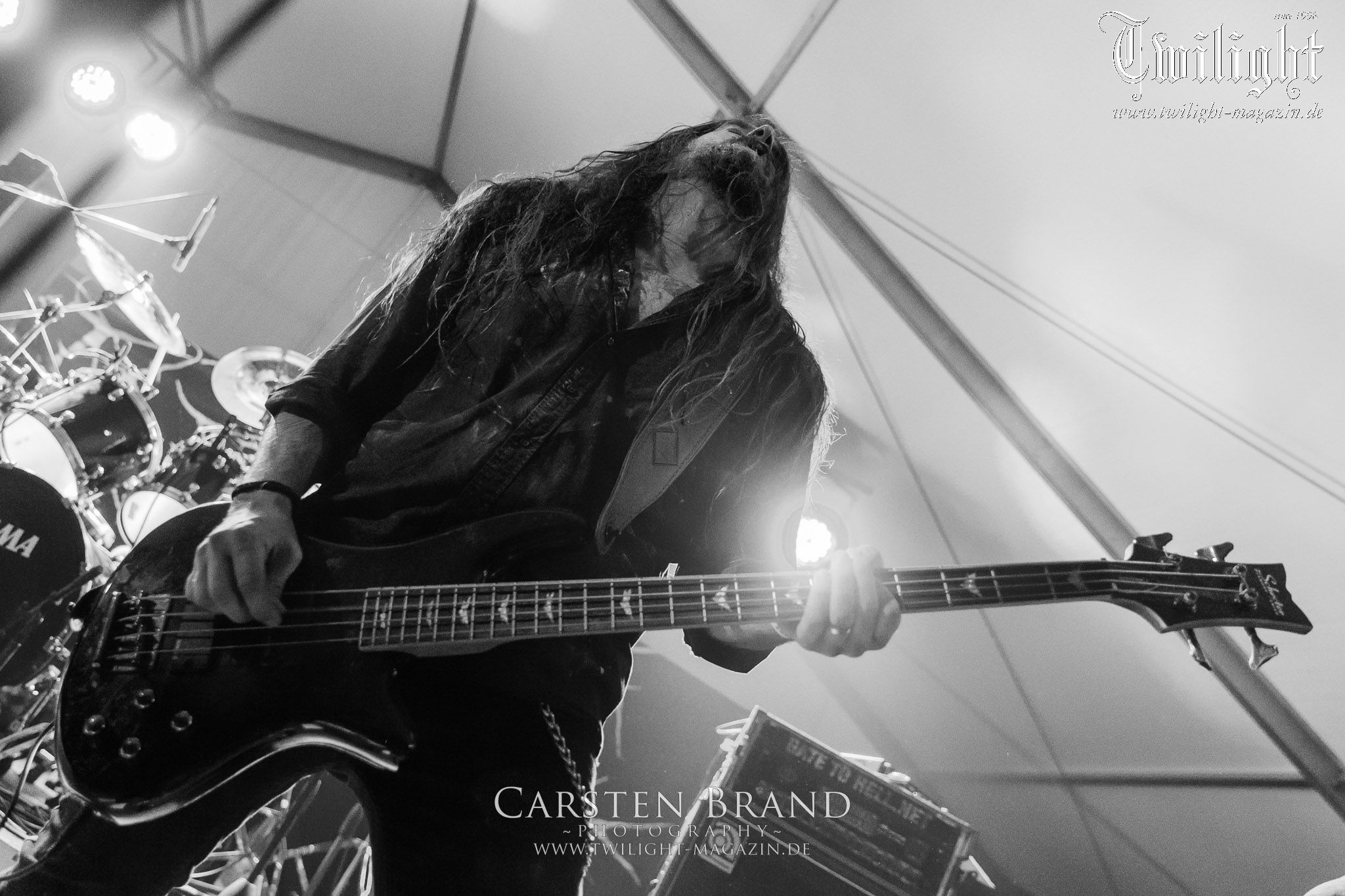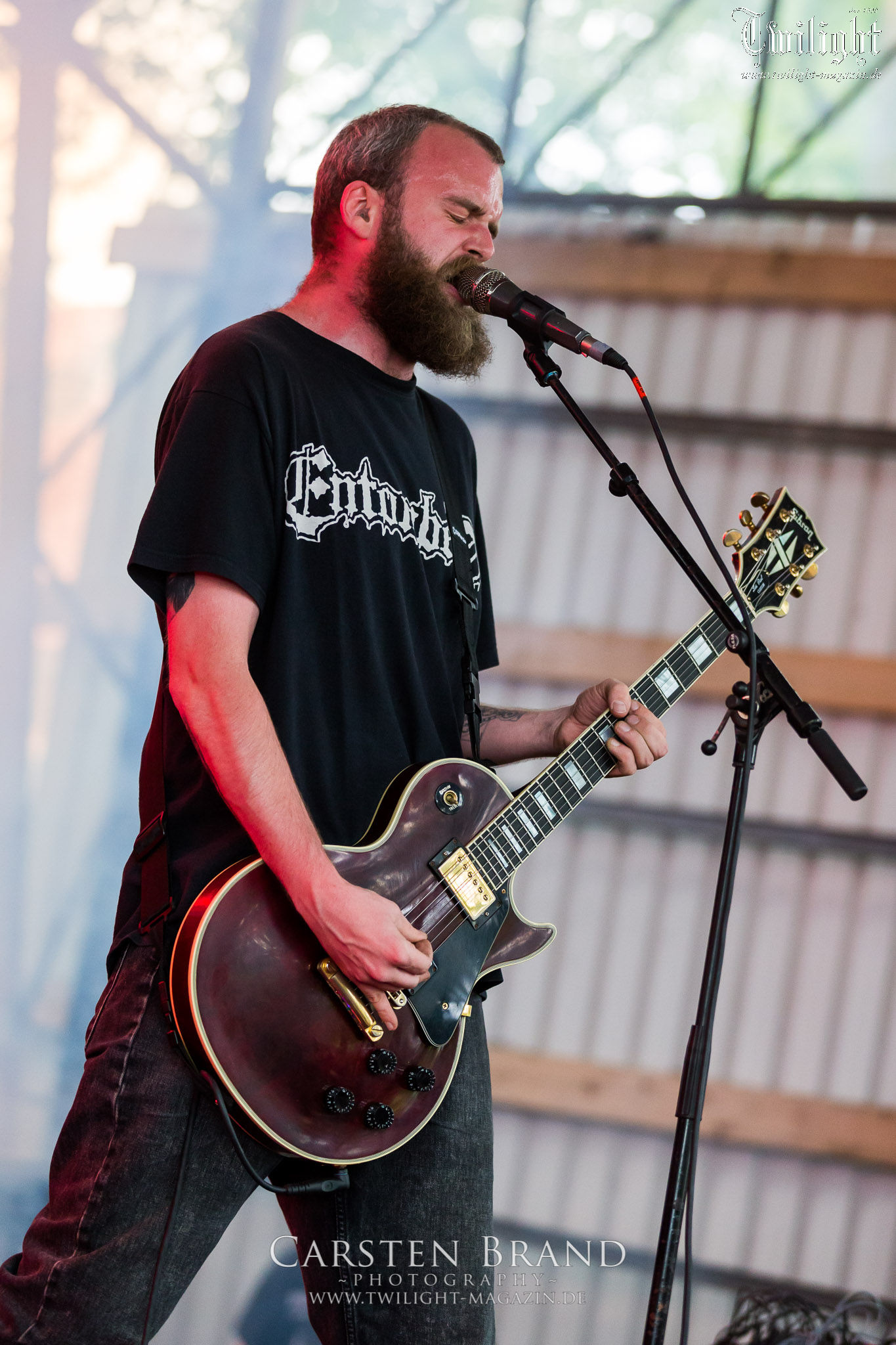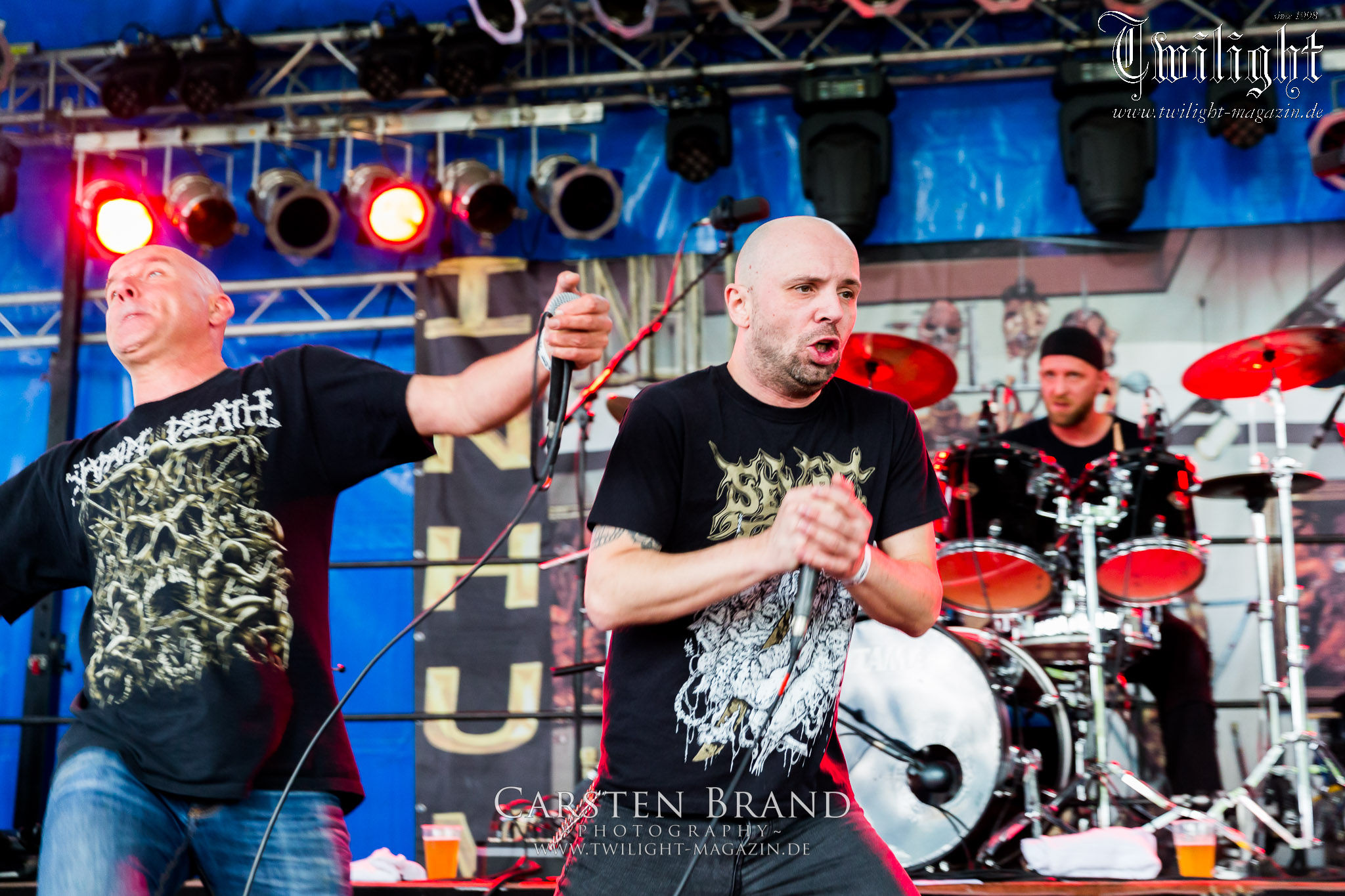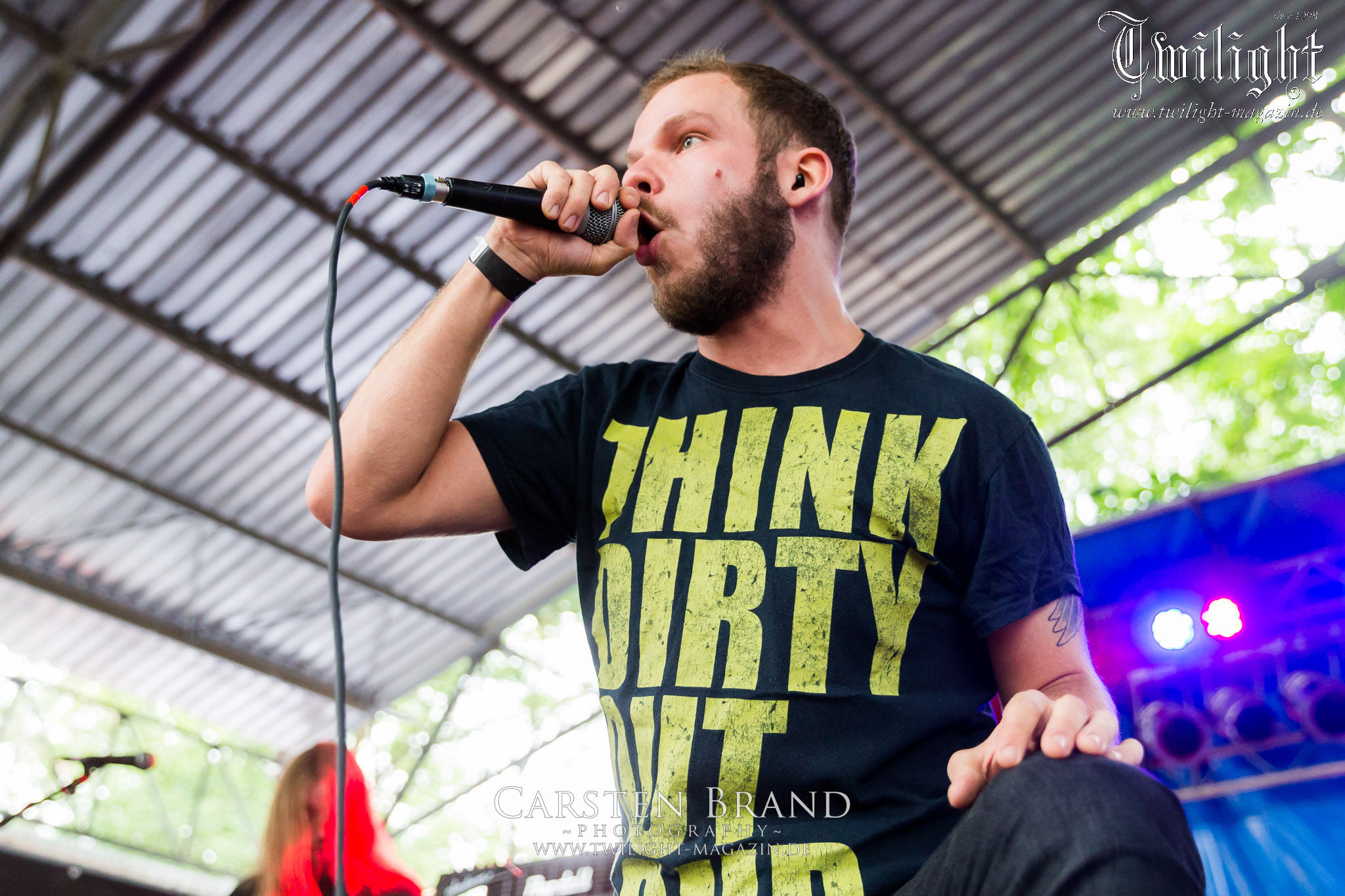 Nach Frühstück und Dusche steht bei mir noch ein Interview mit den Jungs von Atomwinter an, welches ihr später noch im Twilight zu lesen bekommt. Anschließend schaffe ich es gerade noch rechtzeitig vor die Hauptbühne, wo GUTSLIT mit knochentrockener Brutalo-Keule das Festival-Finale einleuten. Die morgendlichen Sportmuffel kreiseln ihre Meter ausgelassen im Circle-Pit runter und gehen somit dem klassischen metallischen Frühsport nach. Abgesehen davon, dass mich die technisch versierten Gutslit rein musikalisch zwar stilistisch nicht umhauen, nehme ich aber die Erkenntnis mit, das ambitionierter Death-Grind selbst in Indien gespielt wird.