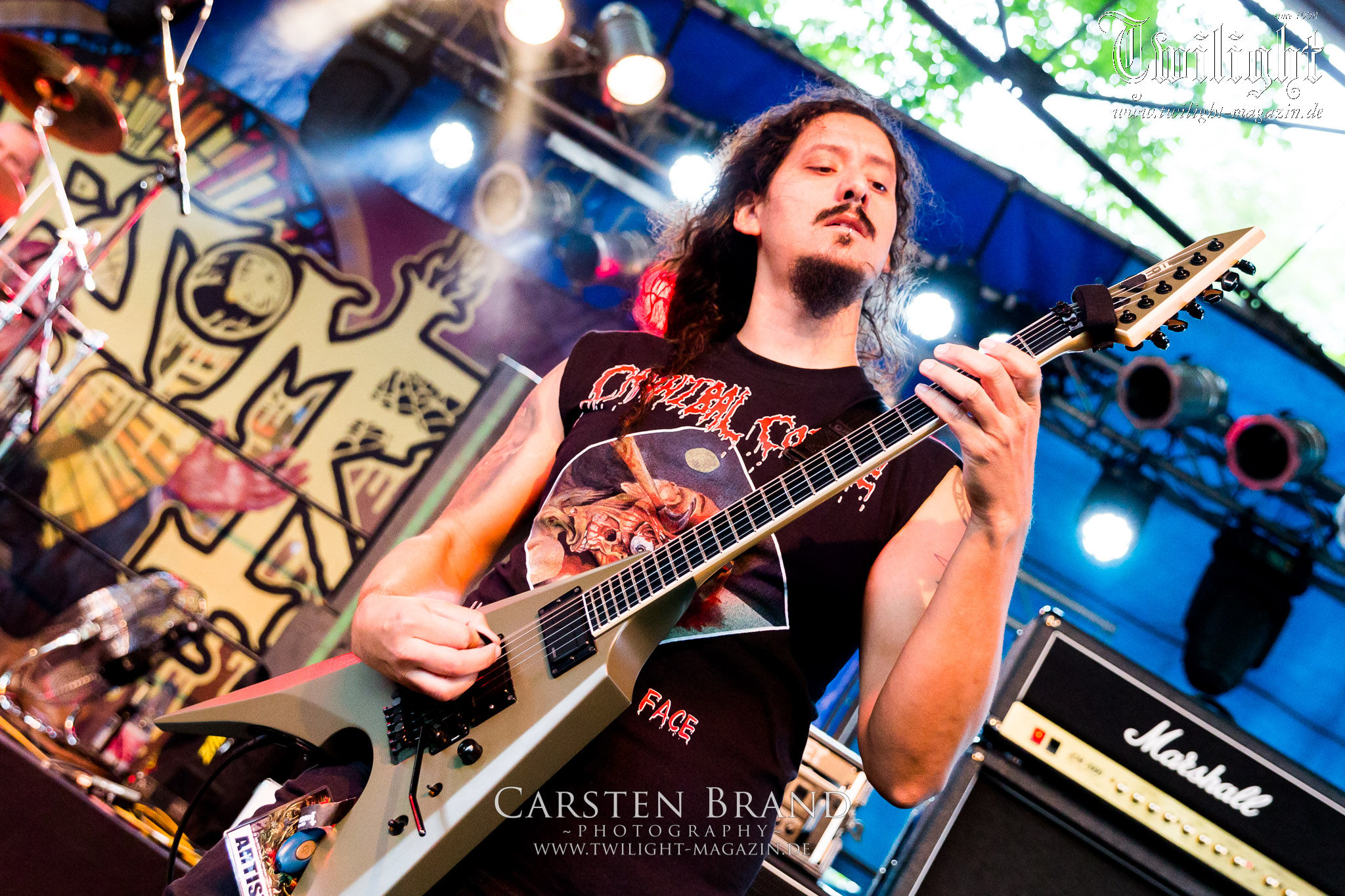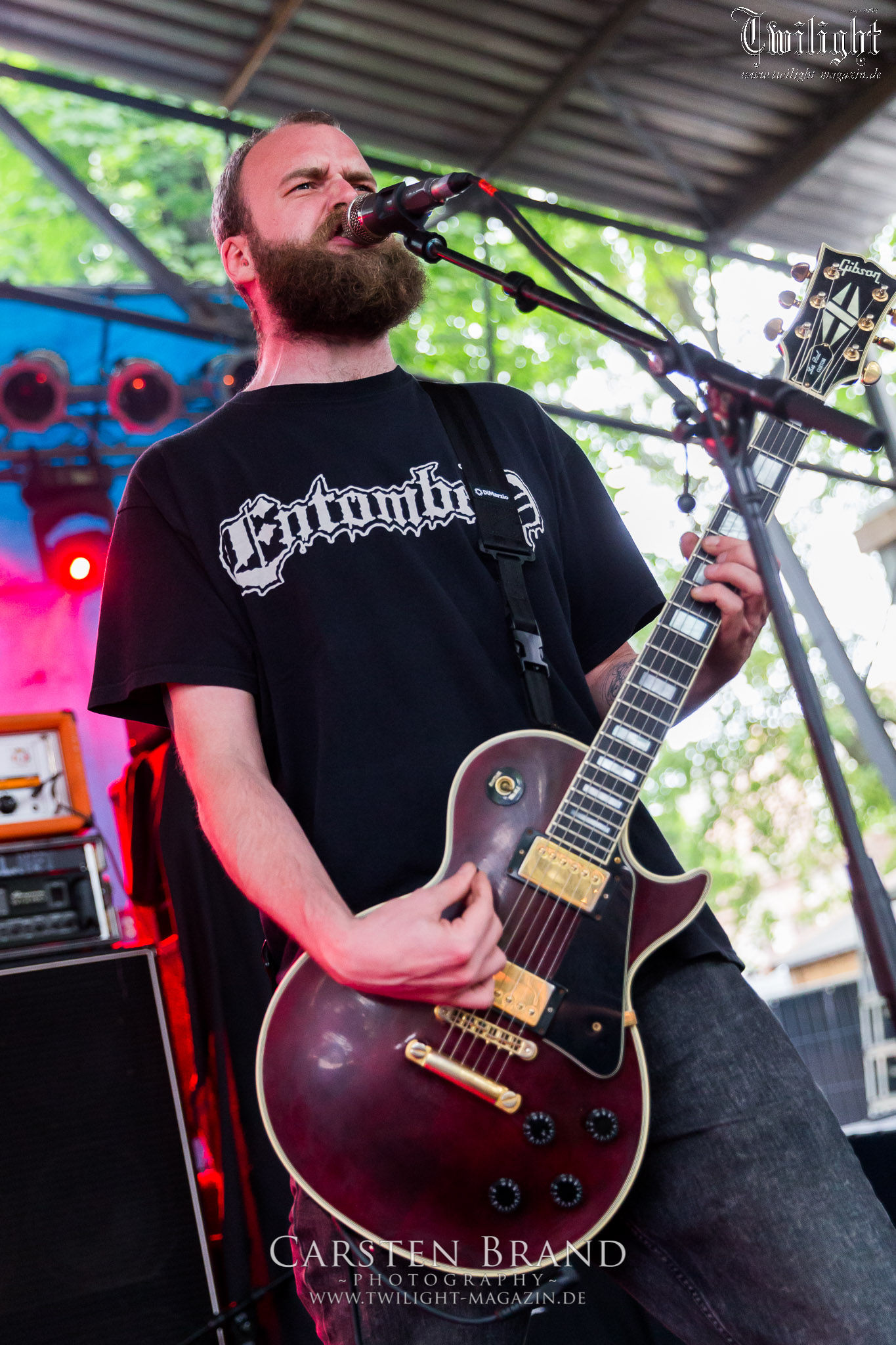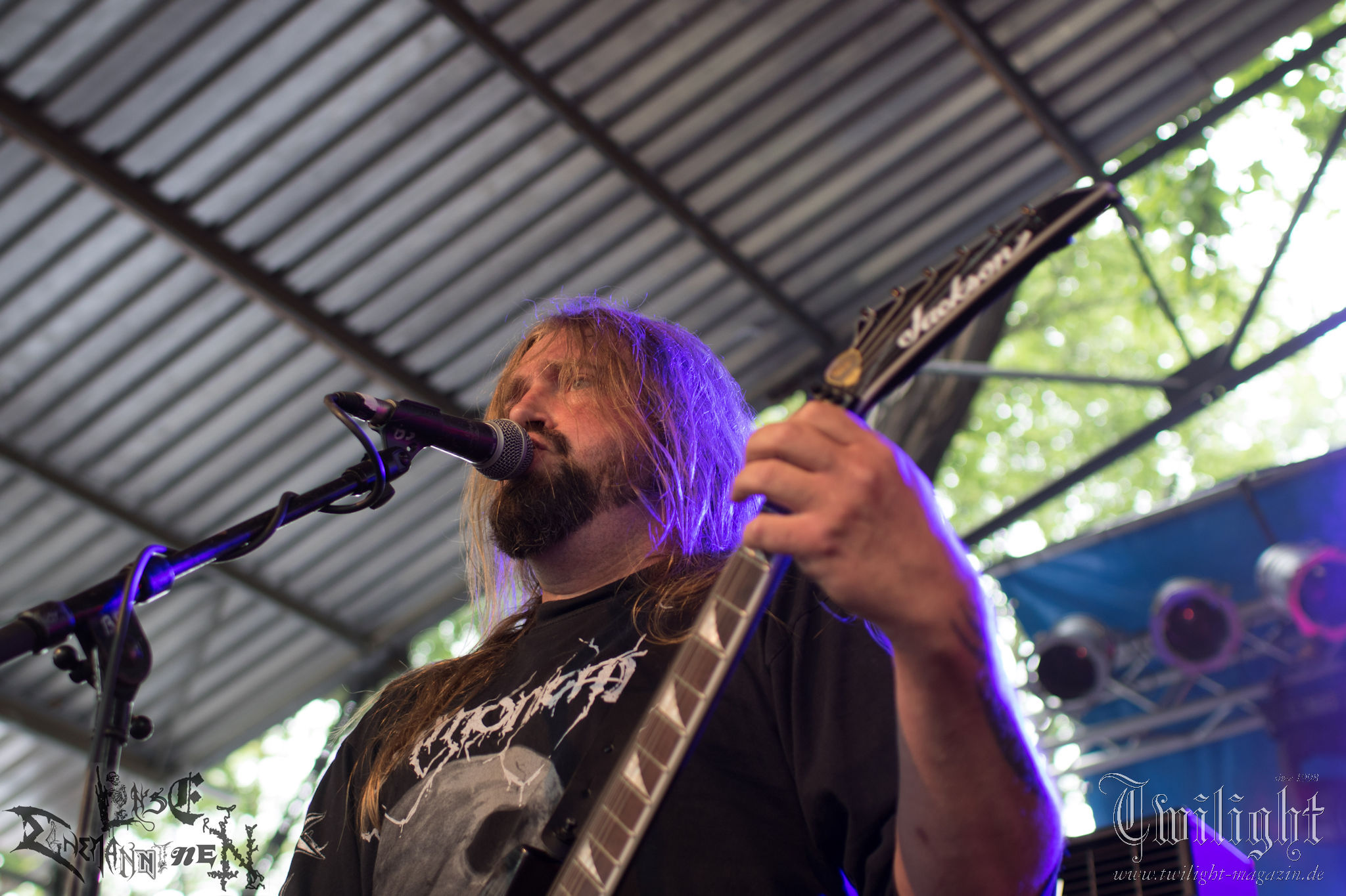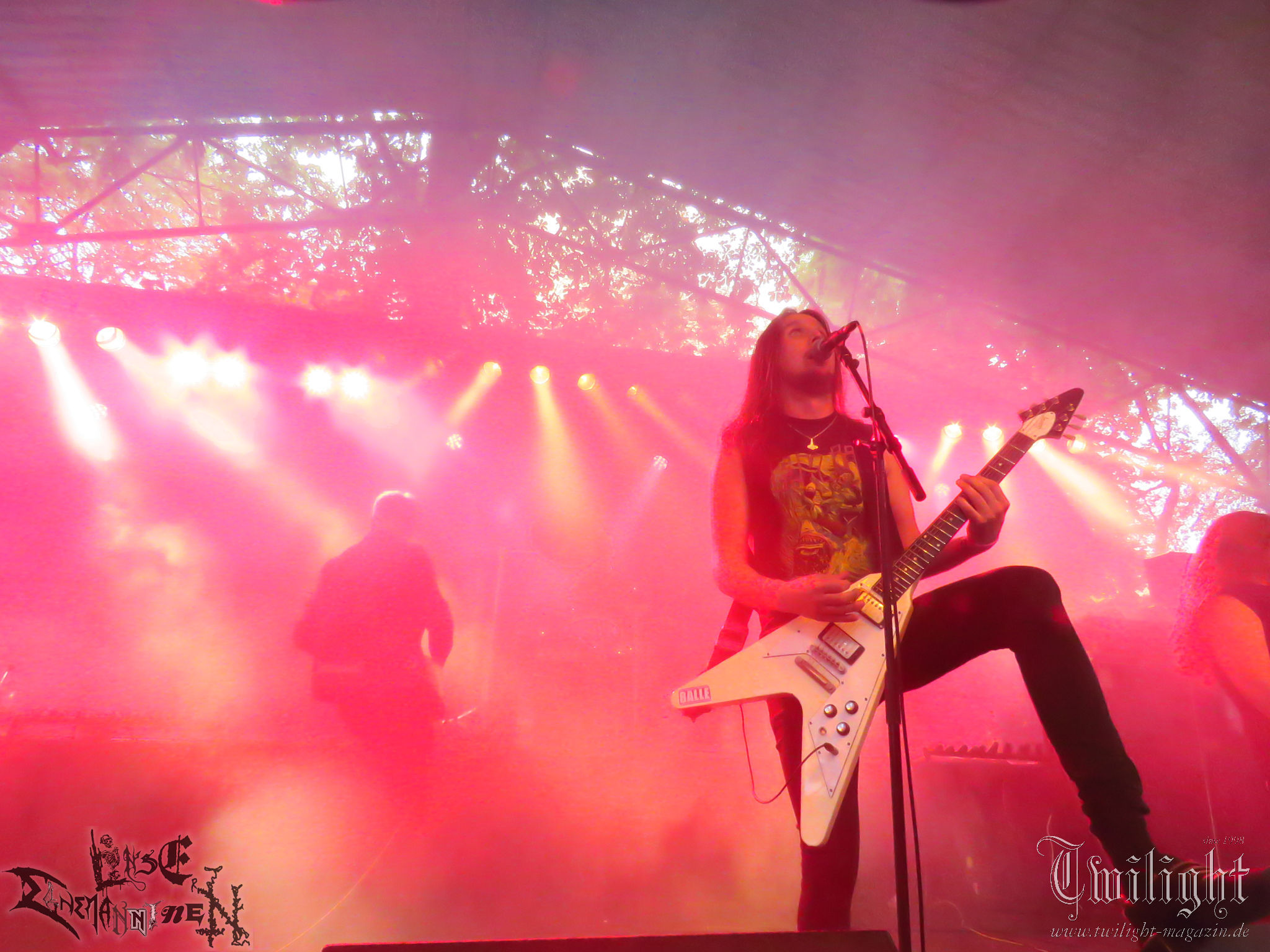 CONAN fallen bei mir anschließend durch. Das zwar simple und auf das Wesentlichste reduzierte Gebräu aus Stoner, Doom und Drone ist zwar soundmäßig fett aber mir auf Dauer einfach zu eintönig und zu langweilig. Das sieht das Publikum vor der Bühne erwartungsgemäß anders und feiert die Briten ordentlich ab. Es ist beängstigend , wie lebendig nahe GRUESOME ihren musikalischen Vorbildern Death kommen und dabei mit eigenen Songs das Vermächtnis von Chuck Schuldiner weiter tragen, die des Death Metal - Visionärs würdig gewesen wären. Gruesome sind weit weg von einer Kopie oder gar einem Abklatsch und stehen für Todesmetall der alten Schule, der dreckig, ranzig, technisch versiert und bis zur letzten Note durchkomponiert ist und vor der Hauptbühne voll auf die Zwölf geht. Was Gruesome hier zelebrieren ist wahrlich ein mitreißendes Hohelied an den amerikanischen Death Metal der alten Schule.