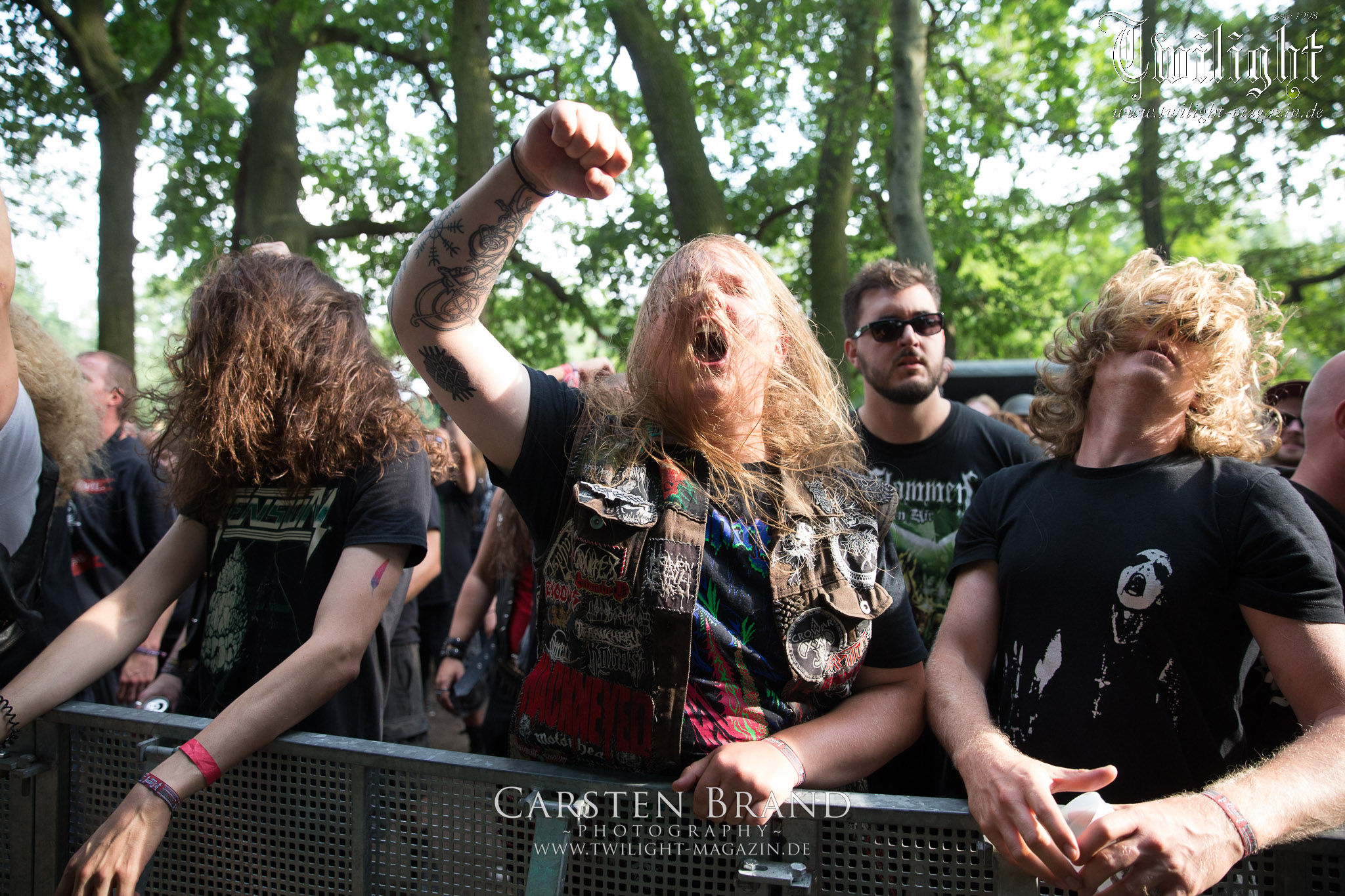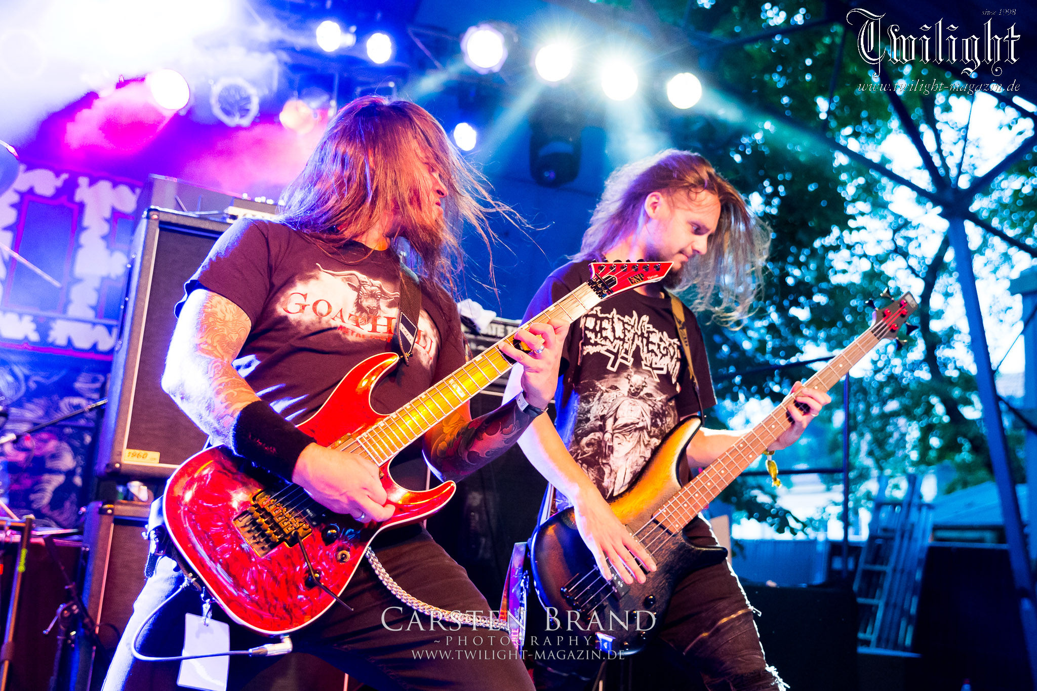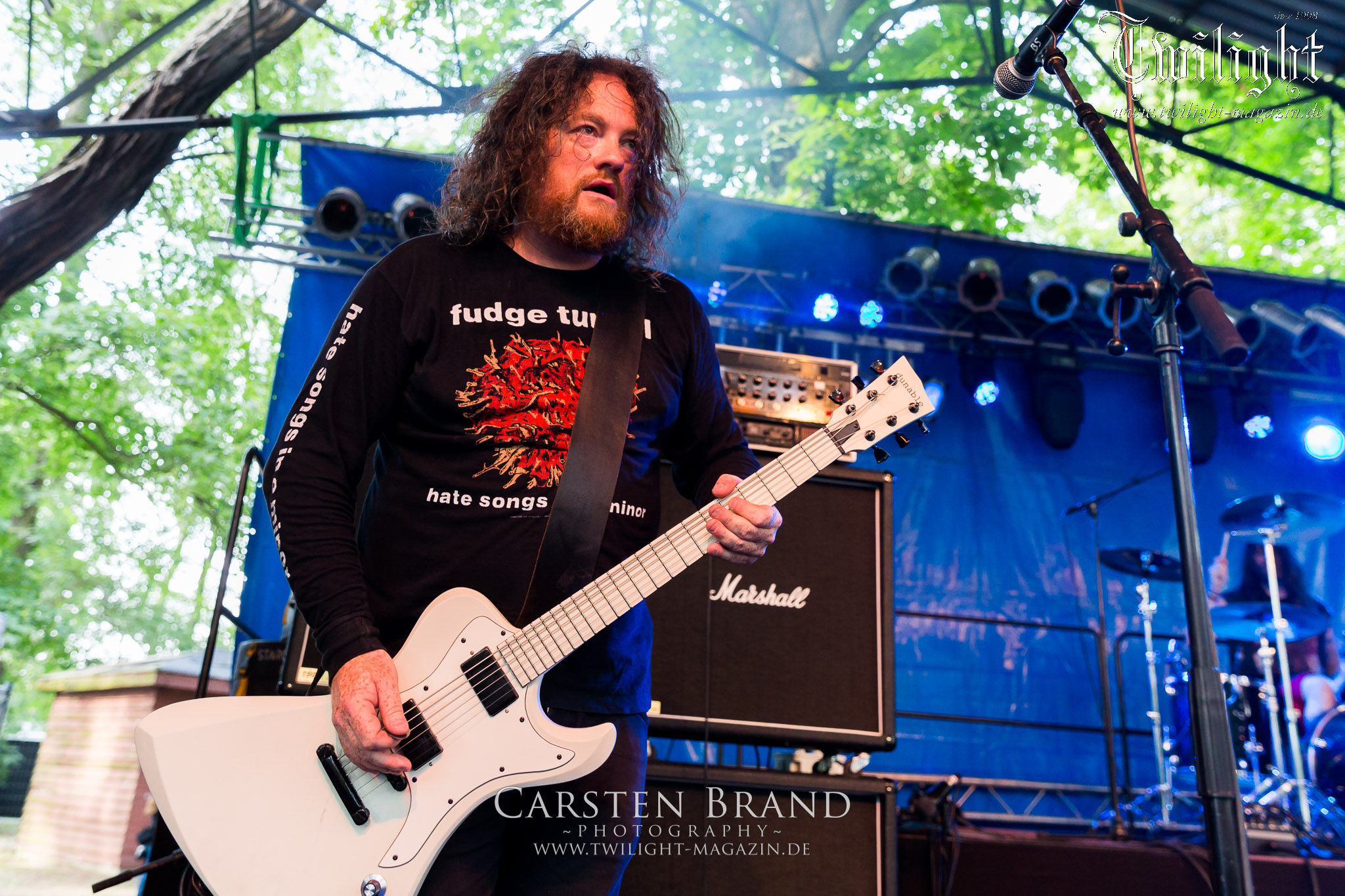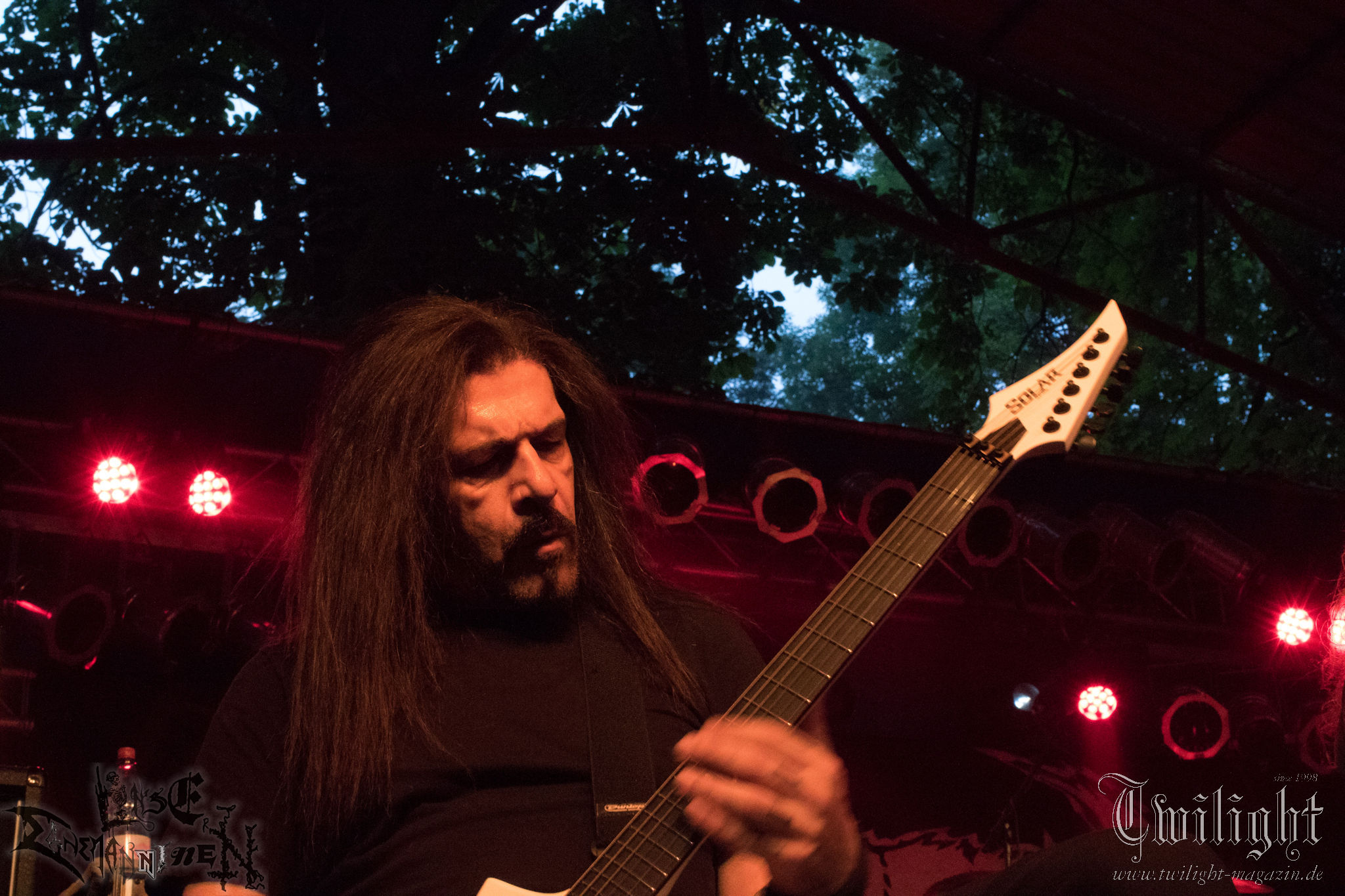 CONAN fallen bei mir anschließend durch. Das zwar simple und auf das Wesentlichste reduzierte Gebräu aus Stoner, Doom und Drone ist zwar soundmäßig fett aber mir auf Dauer einfach zu eintönig und zu langweilig. Das sieht das Publikum vor der Bühne erwartungsgemäß anders und feiert die Briten ordentlich ab. Es ist beängstigend , wie lebendig nahe GRUESOME ihren musikalischen Vorbildern Death kommen und dabei mit eigenen Songs das Vermächtnis von Chuck Schuldiner weiter tragen, die des Death Metal - Visionärs würdig gewesen wären. Gruesome sind weit weg von einer Kopie oder gar einem Abklatsch und stehen für Todesmetall der alten Schule, der dreckig, ranzig, technisch versiert und bis zur letzten Note durchkomponiert ist und vor der Hauptbühne voll auf die Zwölf geht. Was Gruesome hier zelebrieren ist wahrlich ein mitreißendes Hohelied an den amerikanischen Death Metal der alten Schule.