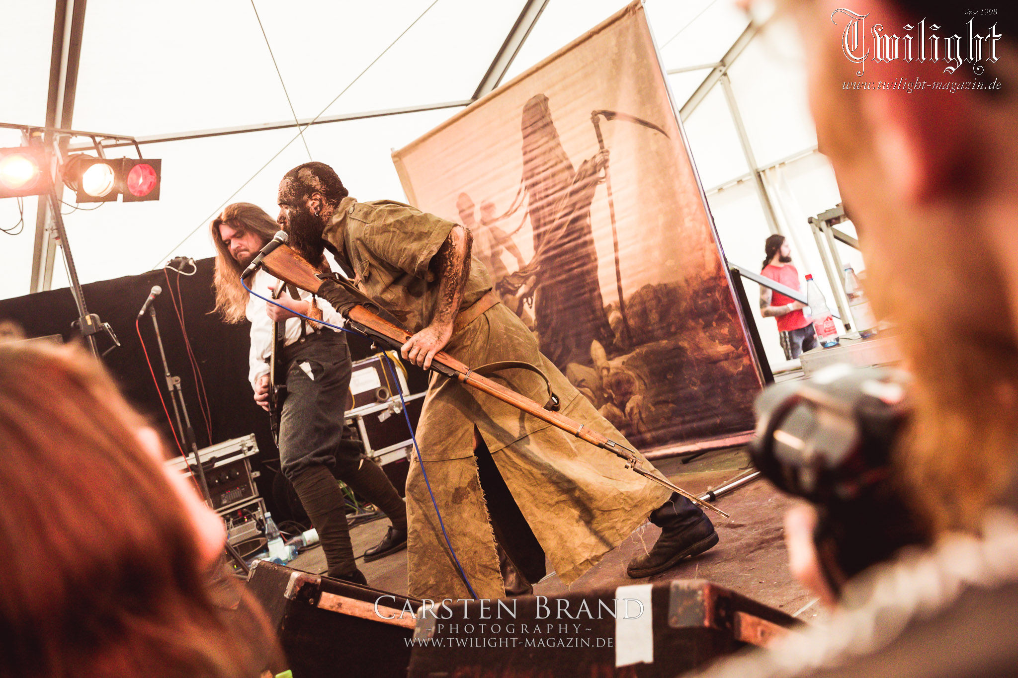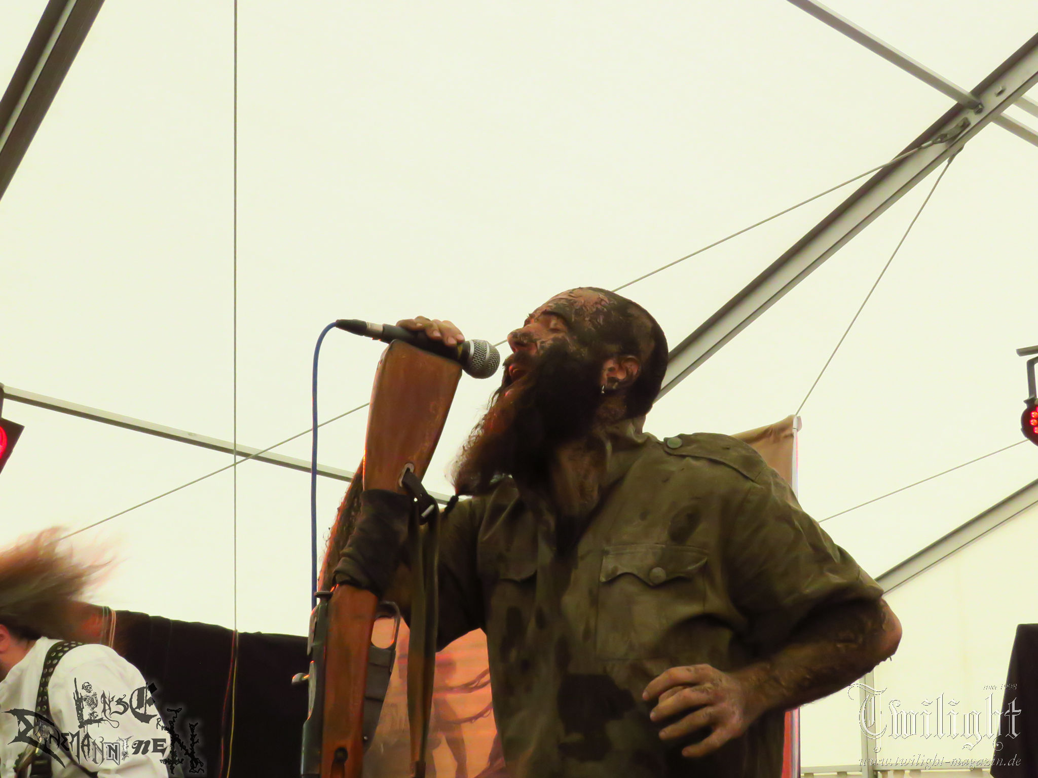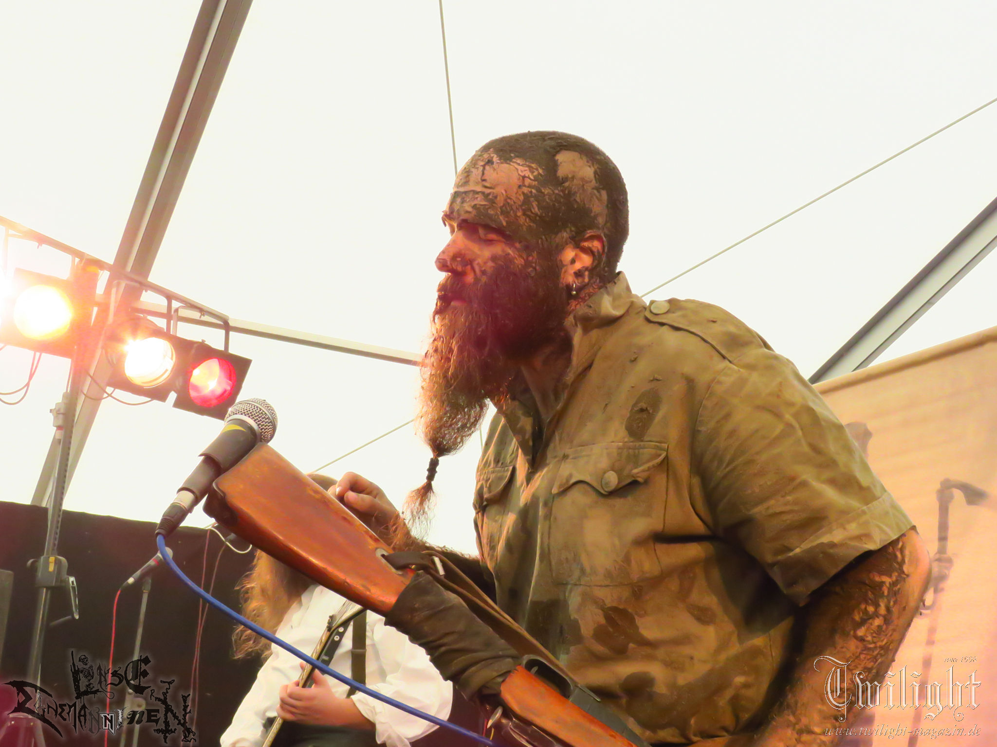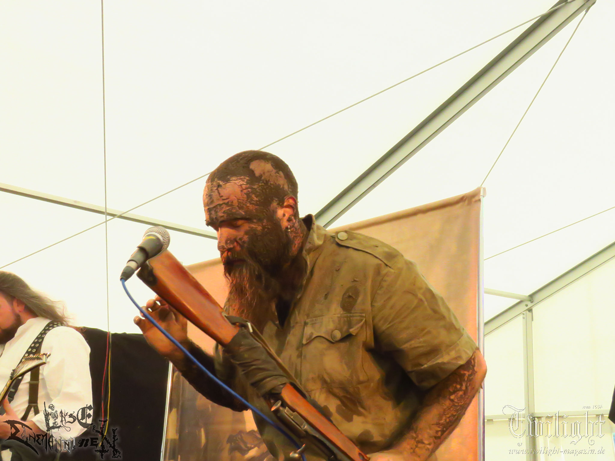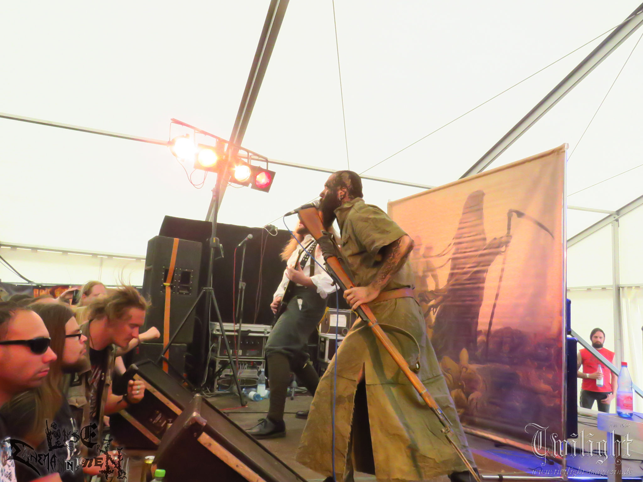 In aller Munde sind zur Zeit 1914 aus der Ukraine, deren Lyric-Video zum Epos "A Hundred Day Offensive" aus dem jüngst veröffentlichten Album "Blind Leading The Blind" in der Szene schon fast viral ging. Dementsprechend ist das Zelt proppenvoll, als die Band ihren Set startet. Während sich die Instrumental-Fraktion uniformiert im Hintergrund hält und ein unbarmherziges musikalisches Trommelfeuer über den Köpfen des Publikums niedergeht, scheint der Sänger direkt aus einem schlammigen Schützengraben der unzähligen Materialschlachten des WK l auferstanden zu sein. Der Mann durchlebt und durchleidet die Geschichten, die er besingt, in beängstigender Art und Weise. Und abgesehen davon, dass ich den Gesang aufgrund der eingeschränkten Variabilität auf dem Album für mich als Schwachpunkt ausgemacht hatte, wächst der Herr, der bei 1914 die Rolle des Oberleutnants Ditmar Kumarberg einnimmt, nicht nur stimmlich über sich hinaus. Konzeptionell ist das, was 1914 auf die Beine stellen zwar nicht sonderlich innovativ aber die Art und Weise, wie sie das vermeintlich abgedroschene Thema Krieg musikalisch umsetzen, ist fesselnd und packend. Noch dazu, weil man hier die Anhänger von Asphyx, God Dethroned, Bolt Thrower und Deinonychus gleichermaßen bedient. Denn genau das ist die Schnittmenge, in der sich 1914 stilistisch bewegen. Nach diesem beeindruckenden Auftritt bin ich gespannt, welche Entwicklung diese Band nehmen wird.