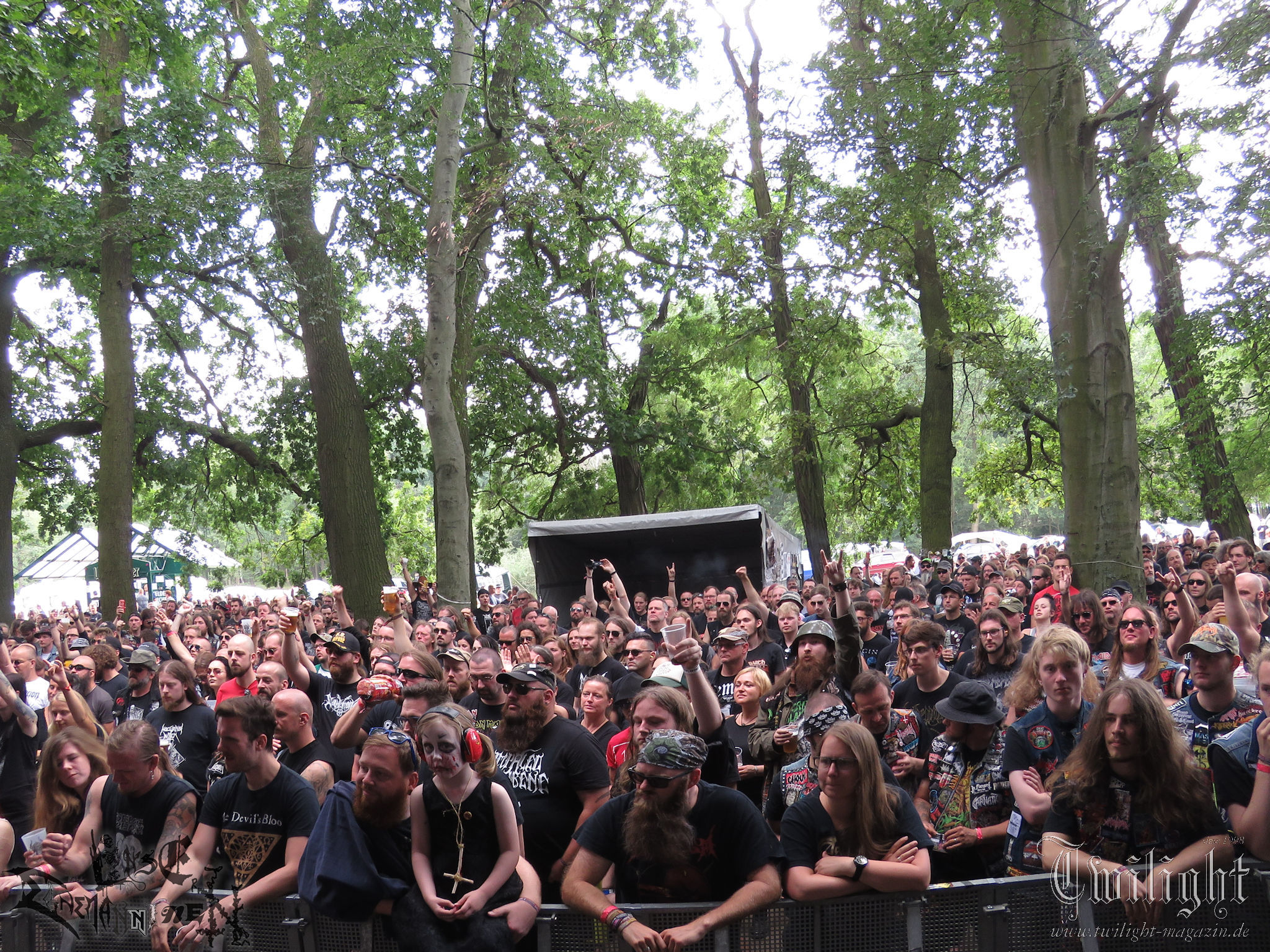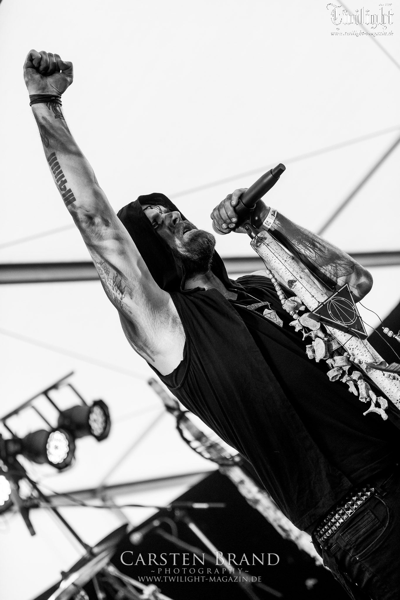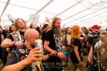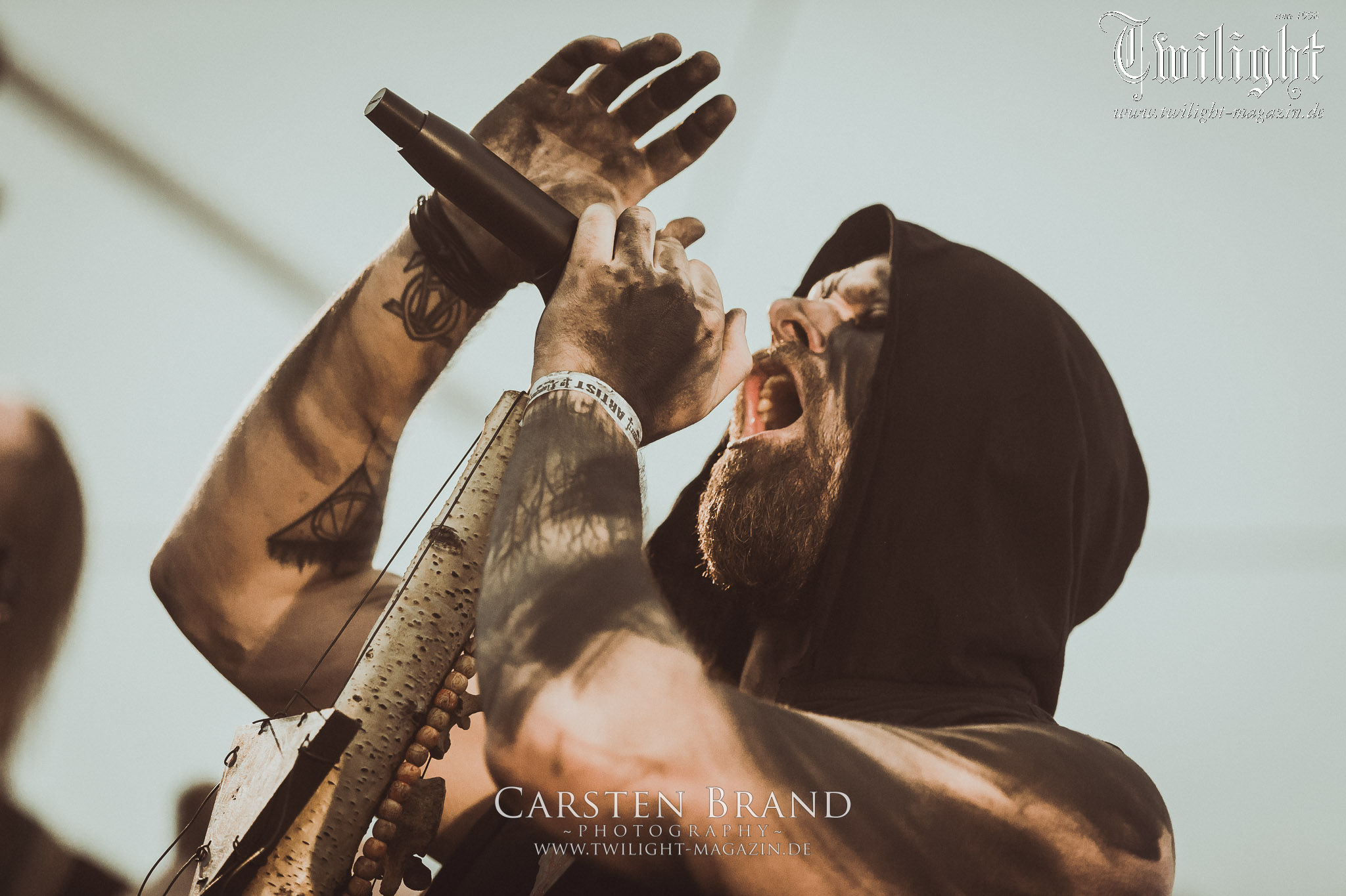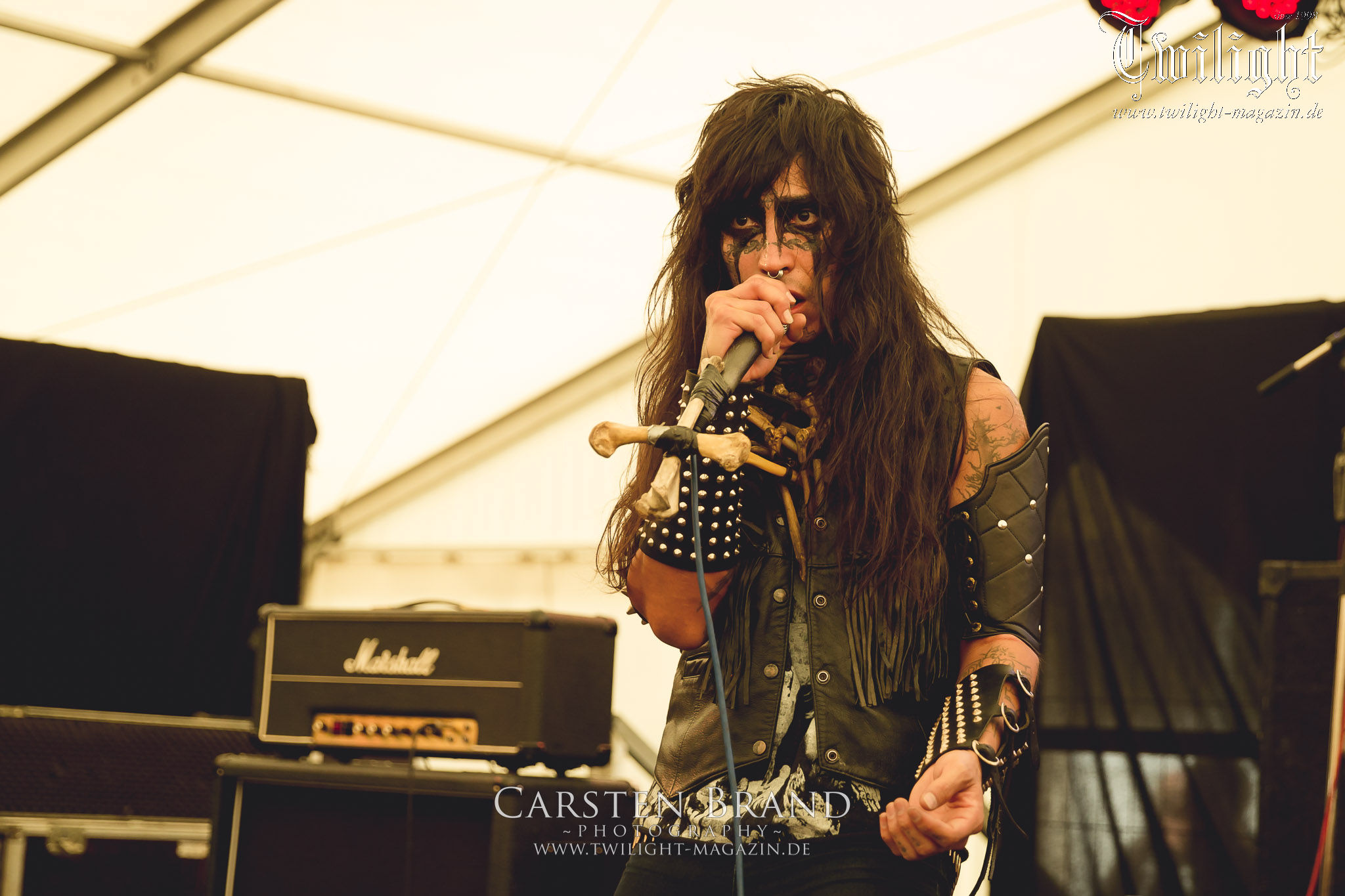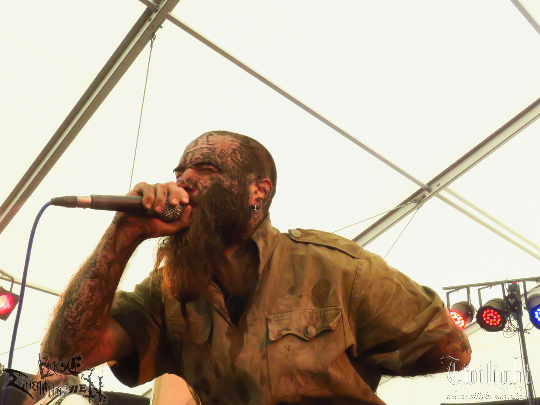 In aller Munde sind zur Zeit 1914 aus der Ukraine, deren Lyric-Video zum Epos "A Hundred Day Offensive" aus dem jüngst veröffentlichten Album "Blind Leading The Blind" in der Szene schon fast viral ging. Dementsprechend ist das Zelt proppenvoll, als die Band ihren Set startet. Während sich die Instrumental-Fraktion uniformiert im Hintergrund hält und ein unbarmherziges musikalisches Trommelfeuer über den Köpfen des Publikums niedergeht, scheint der Sänger direkt aus einem schlammigen Schützengraben der unzähligen Materialschlachten des WK l auferstanden zu sein. Der Mann durchlebt und durchleidet die Geschichten, die er besingt, in beängstigender Art und Weise. Und abgesehen davon, dass ich den Gesang aufgrund der eingeschränkten Variabilität auf dem Album für mich als Schwachpunkt ausgemacht hatte, wächst der Herr, der bei 1914 die Rolle des Oberleutnants Ditmar Kumarberg einnimmt, nicht nur stimmlich über sich hinaus. Konzeptionell ist das, was 1914 auf die Beine stellen zwar nicht sonderlich innovativ aber die Art und Weise, wie sie das vermeintlich abgedroschene Thema Krieg musikalisch umsetzen, ist fesselnd und packend. Noch dazu, weil man hier die Anhänger von Asphyx, God Dethroned, Bolt Thrower und Deinonychus gleichermaßen bedient. Denn genau das ist die Schnittmenge, in der sich 1914 stilistisch bewegen. Nach diesem beeindruckenden Auftritt bin ich gespannt, welche Entwicklung diese Band nehmen wird.