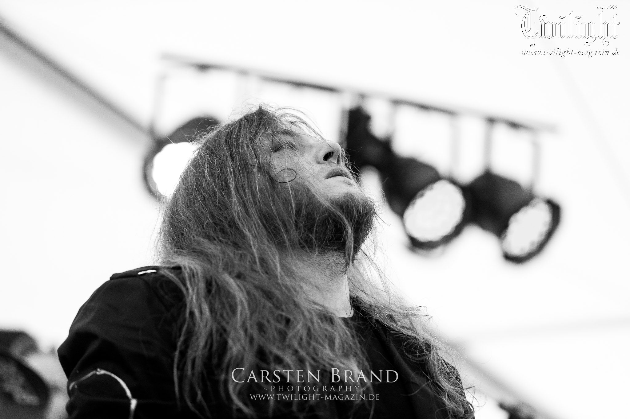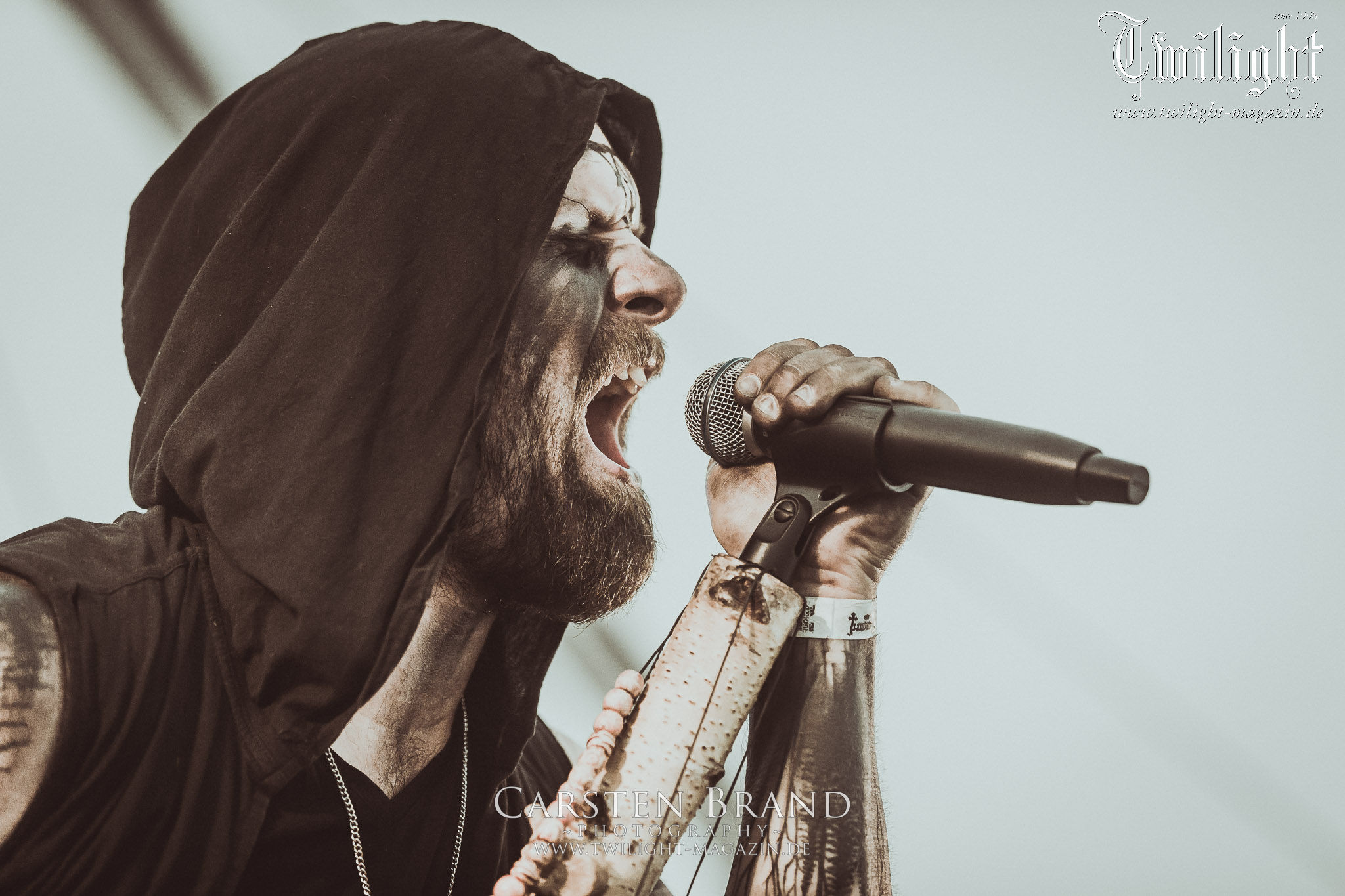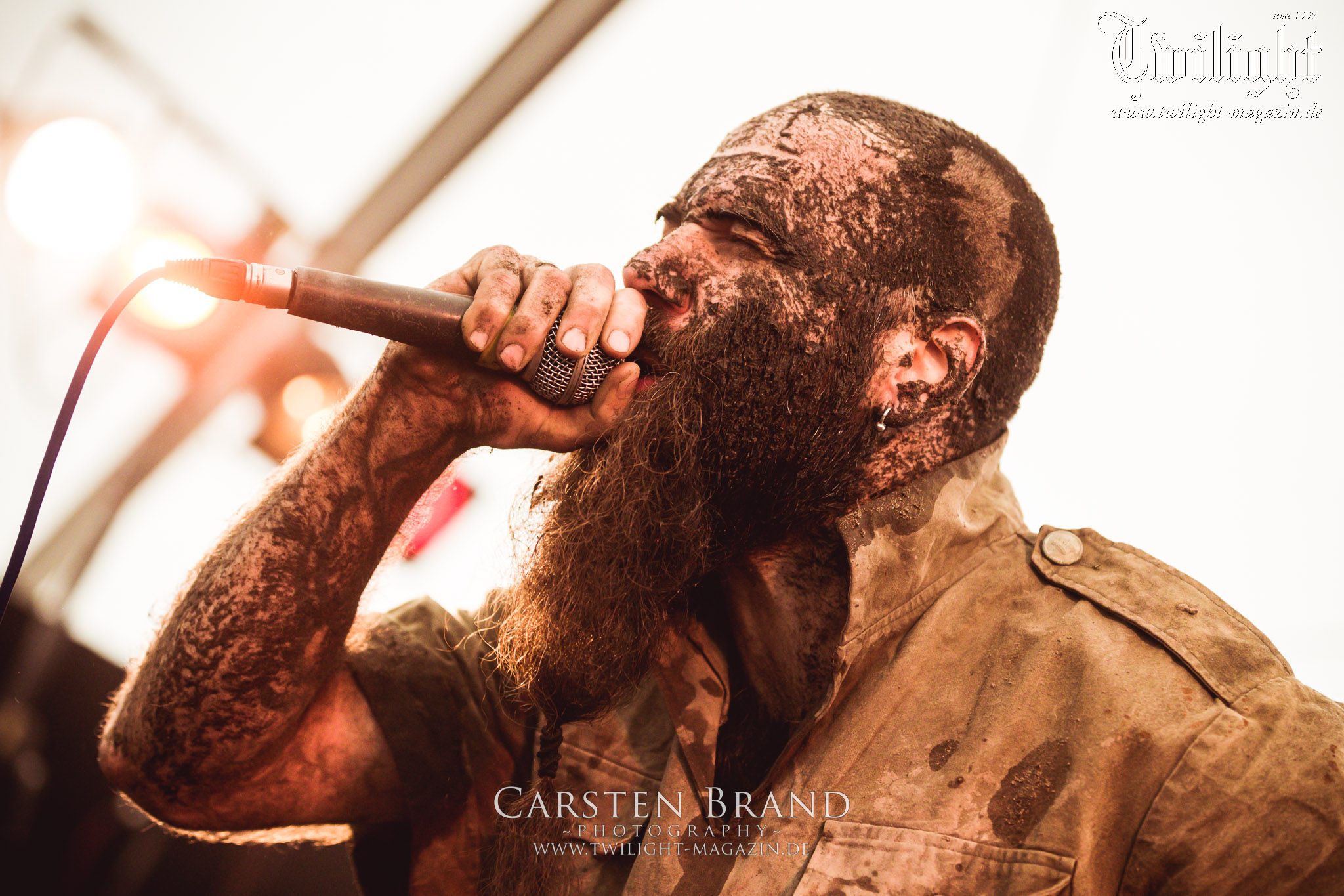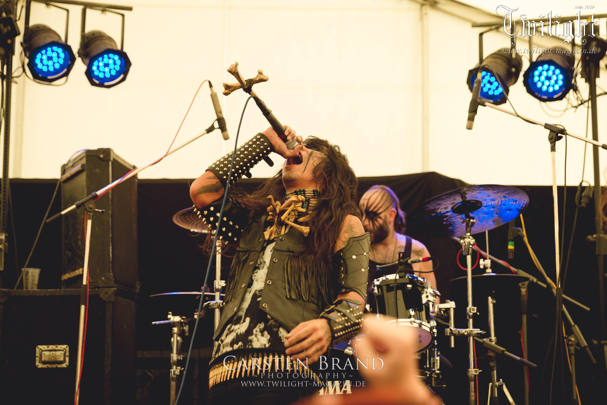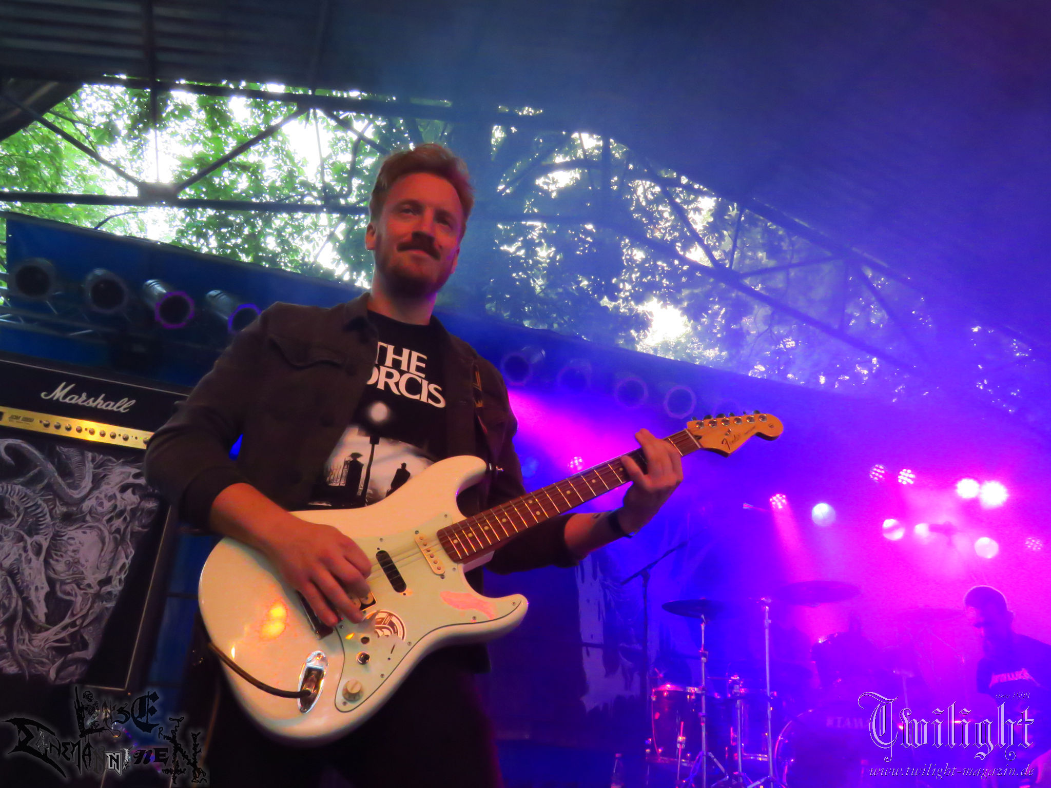 In aller Munde sind zur Zeit 1914 aus der Ukraine, deren Lyric-Video zum Epos "A Hundred Day Offensive" aus dem jüngst veröffentlichten Album "Blind Leading The Blind" in der Szene schon fast viral ging. Dementsprechend ist das Zelt proppenvoll, als die Band ihren Set startet. Während sich die Instrumental-Fraktion uniformiert im Hintergrund hält und ein unbarmherziges musikalisches Trommelfeuer über den Köpfen des Publikums niedergeht, scheint der Sänger direkt aus einem schlammigen Schützengraben der unzähligen Materialschlachten des WK l auferstanden zu sein. Der Mann durchlebt und durchleidet die Geschichten, die er besingt, in beängstigender Art und Weise. Und abgesehen davon, dass ich den Gesang aufgrund der eingeschränkten Variabilität auf dem Album für mich als Schwachpunkt ausgemacht hatte, wächst der Herr, der bei 1914 die Rolle des Oberleutnants Ditmar Kumarberg einnimmt, nicht nur stimmlich über sich hinaus. Konzeptionell ist das, was 1914 auf die Beine stellen zwar nicht sonderlich innovativ aber die Art und Weise, wie sie das vermeintlich abgedroschene Thema Krieg musikalisch umsetzen, ist fesselnd und packend. Noch dazu, weil man hier die Anhänger von Asphyx, God Dethroned, Bolt Thrower und Deinonychus gleichermaßen bedient. Denn genau das ist die Schnittmenge, in der sich 1914 stilistisch bewegen. Nach diesem beeindruckenden Auftritt bin ich gespannt, welche Entwicklung diese Band nehmen wird.