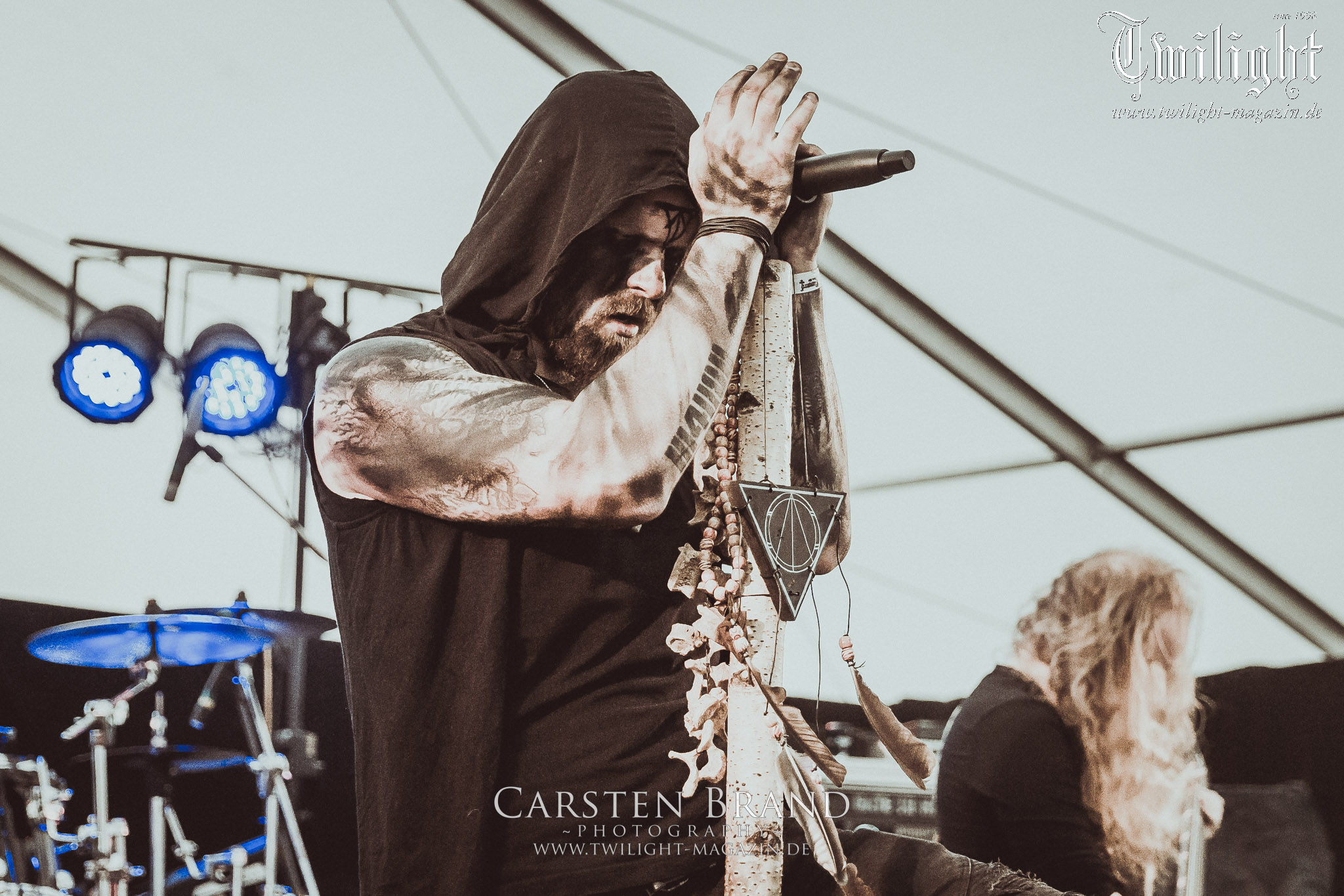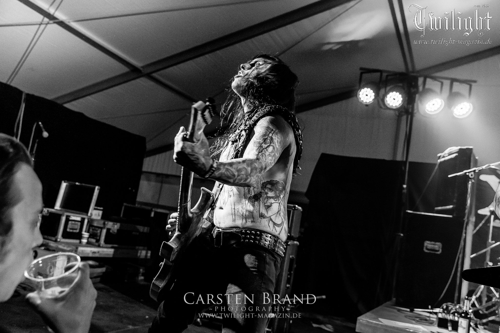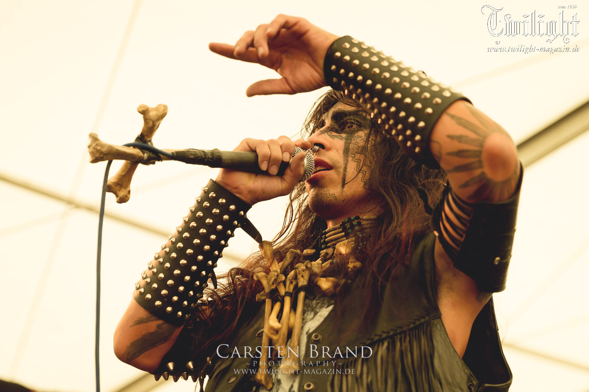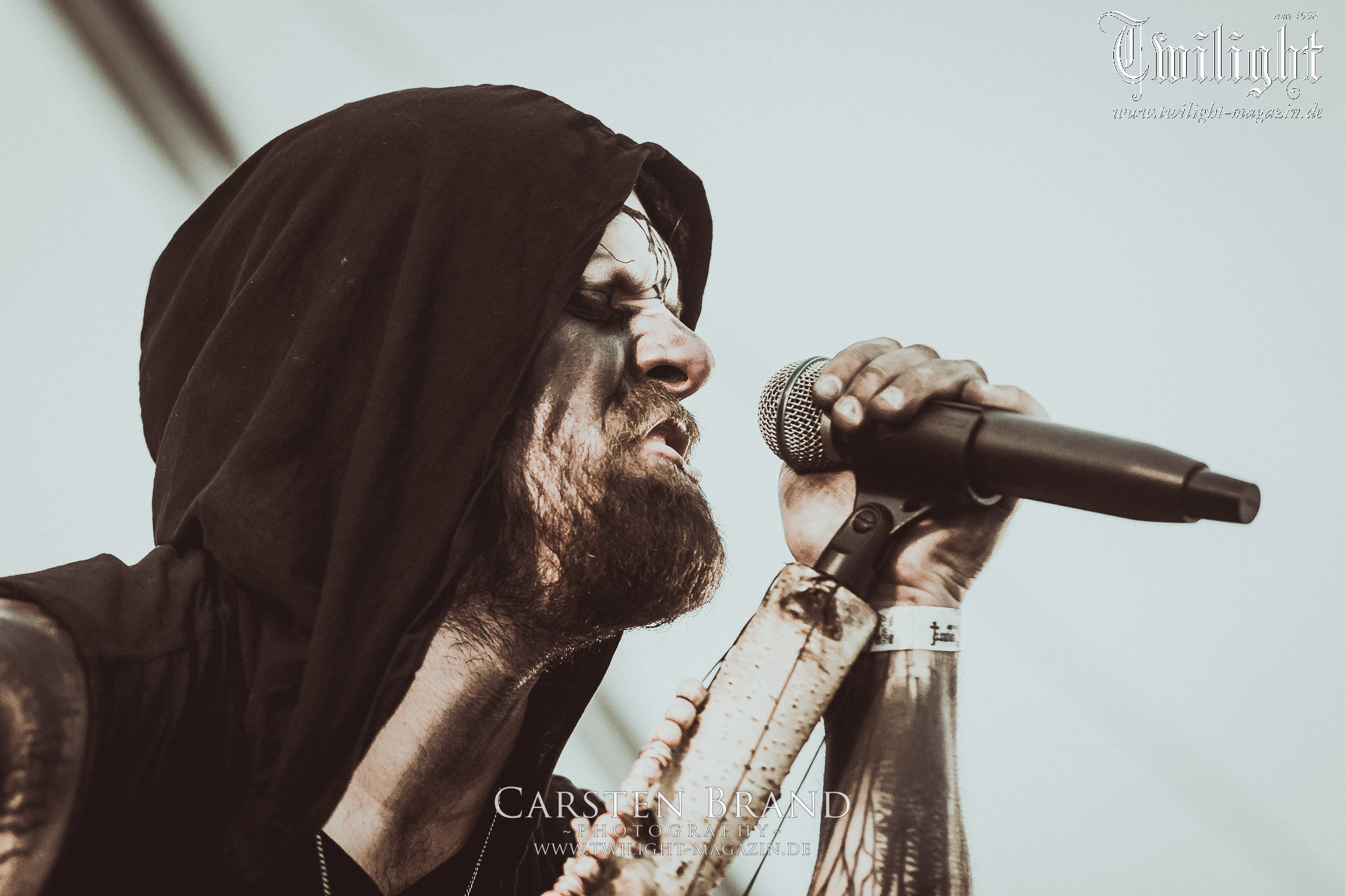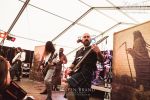 In aller Munde sind zur Zeit 1914 aus der Ukraine, deren Lyric-Video zum Epos "A Hundred Day Offensive" aus dem jüngst veröffentlichten Album "Blind Leading The Blind" in der Szene schon fast viral ging. Dementsprechend ist das Zelt proppenvoll, als die Band ihren Set startet. Während sich die Instrumental-Fraktion uniformiert im Hintergrund hält und ein unbarmherziges musikalisches Trommelfeuer über den Köpfen des Publikums niedergeht, scheint der Sänger direkt aus einem schlammigen Schützengraben der unzähligen Materialschlachten des WK l auferstanden zu sein. Der Mann durchlebt und durchleidet die Geschichten, die er besingt, in beängstigender Art und Weise. Und abgesehen davon, dass ich den Gesang aufgrund der eingeschränkten Variabilität auf dem Album für mich als Schwachpunkt ausgemacht hatte, wächst der Herr, der bei 1914 die Rolle des Oberleutnants Ditmar Kumarberg einnimmt, nicht nur stimmlich über sich hinaus. Konzeptionell ist das, was 1914 auf die Beine stellen zwar nicht sonderlich innovativ aber die Art und Weise, wie sie das vermeintlich abgedroschene Thema Krieg musikalisch umsetzen, ist fesselnd und packend. Noch dazu, weil man hier die Anhänger von Asphyx, God Dethroned, Bolt Thrower und Deinonychus gleichermaßen bedient. Denn genau das ist die Schnittmenge, in der sich 1914 stilistisch bewegen. Nach diesem beeindruckenden Auftritt bin ich gespannt, welche Entwicklung diese Band nehmen wird.