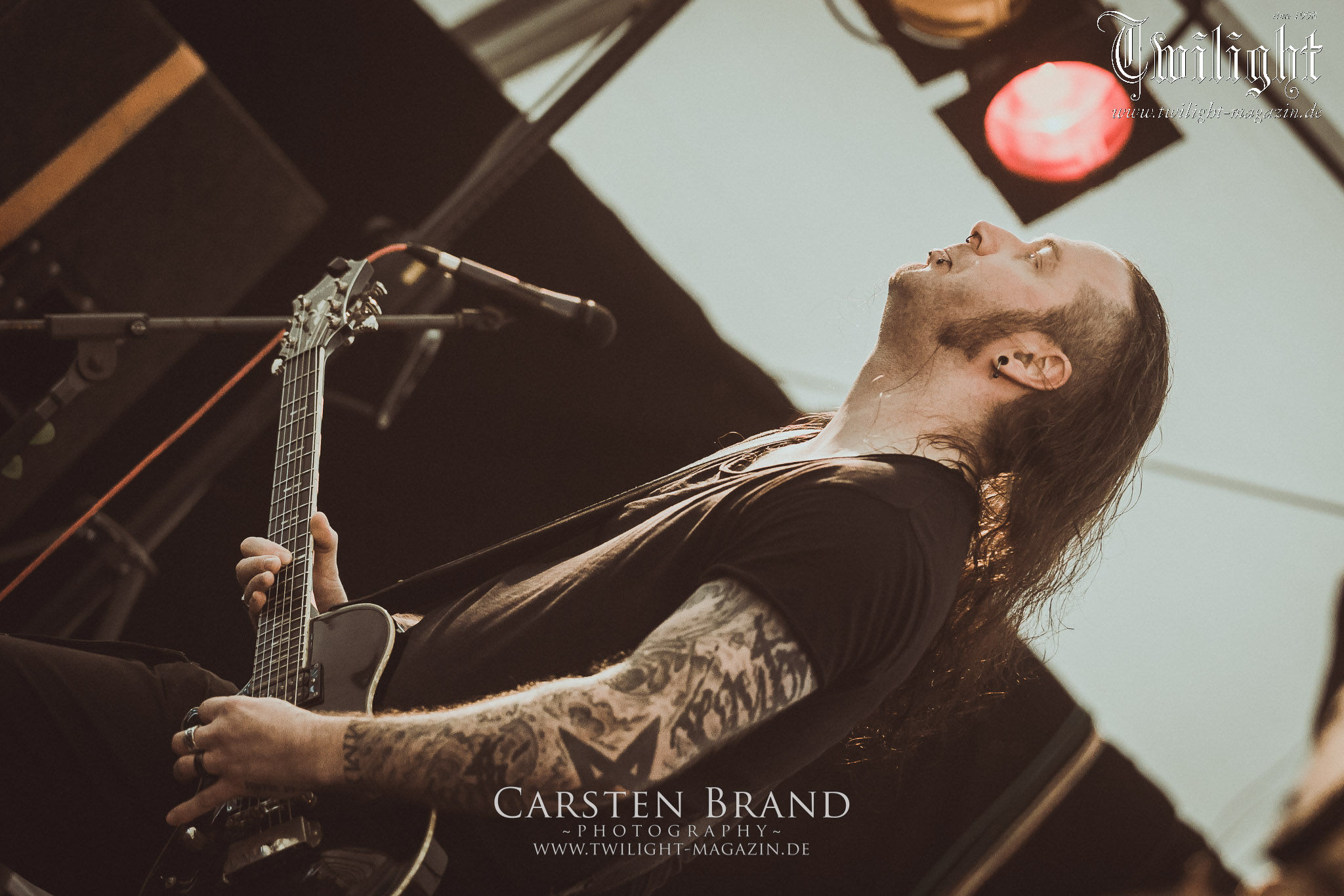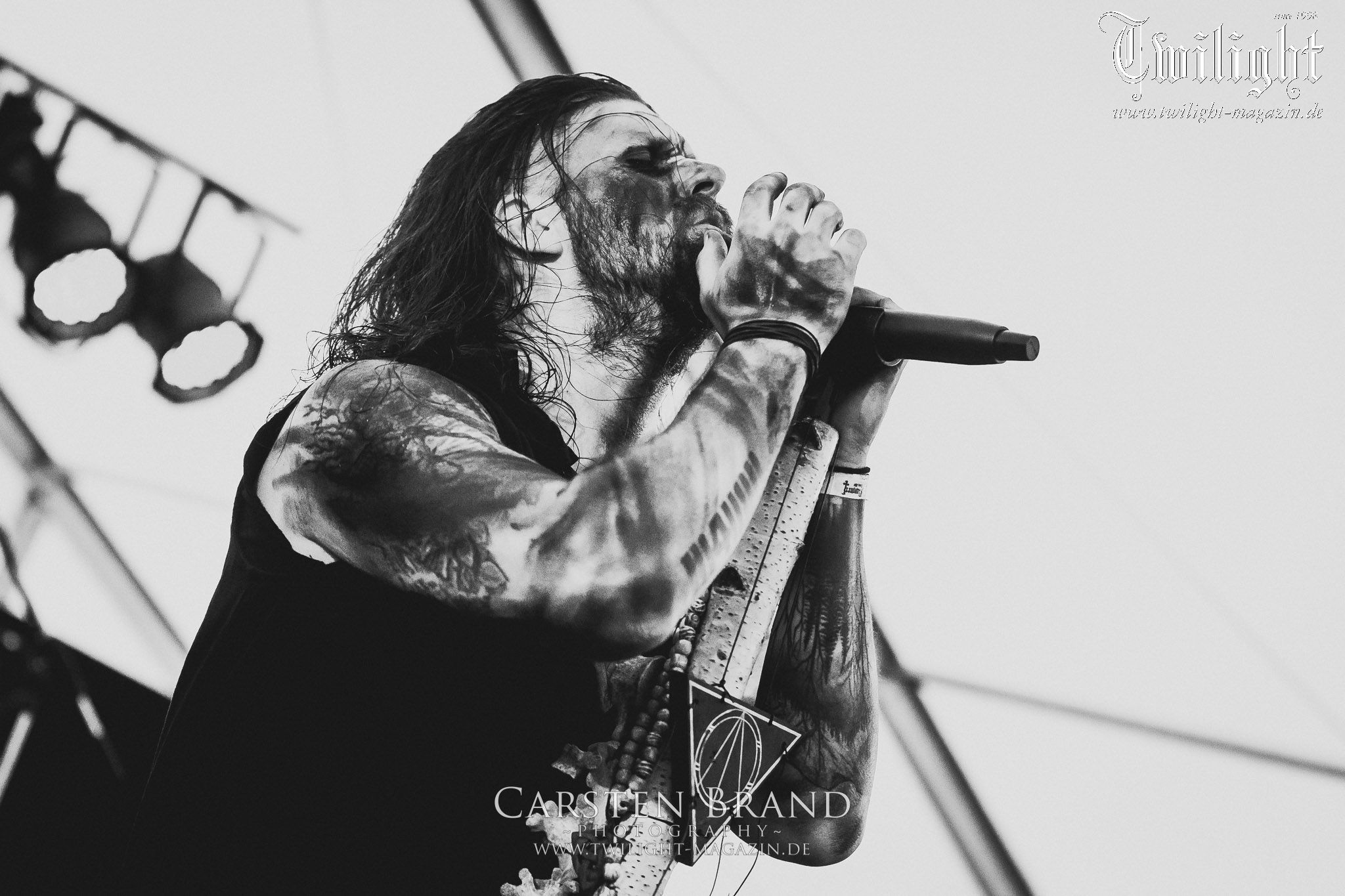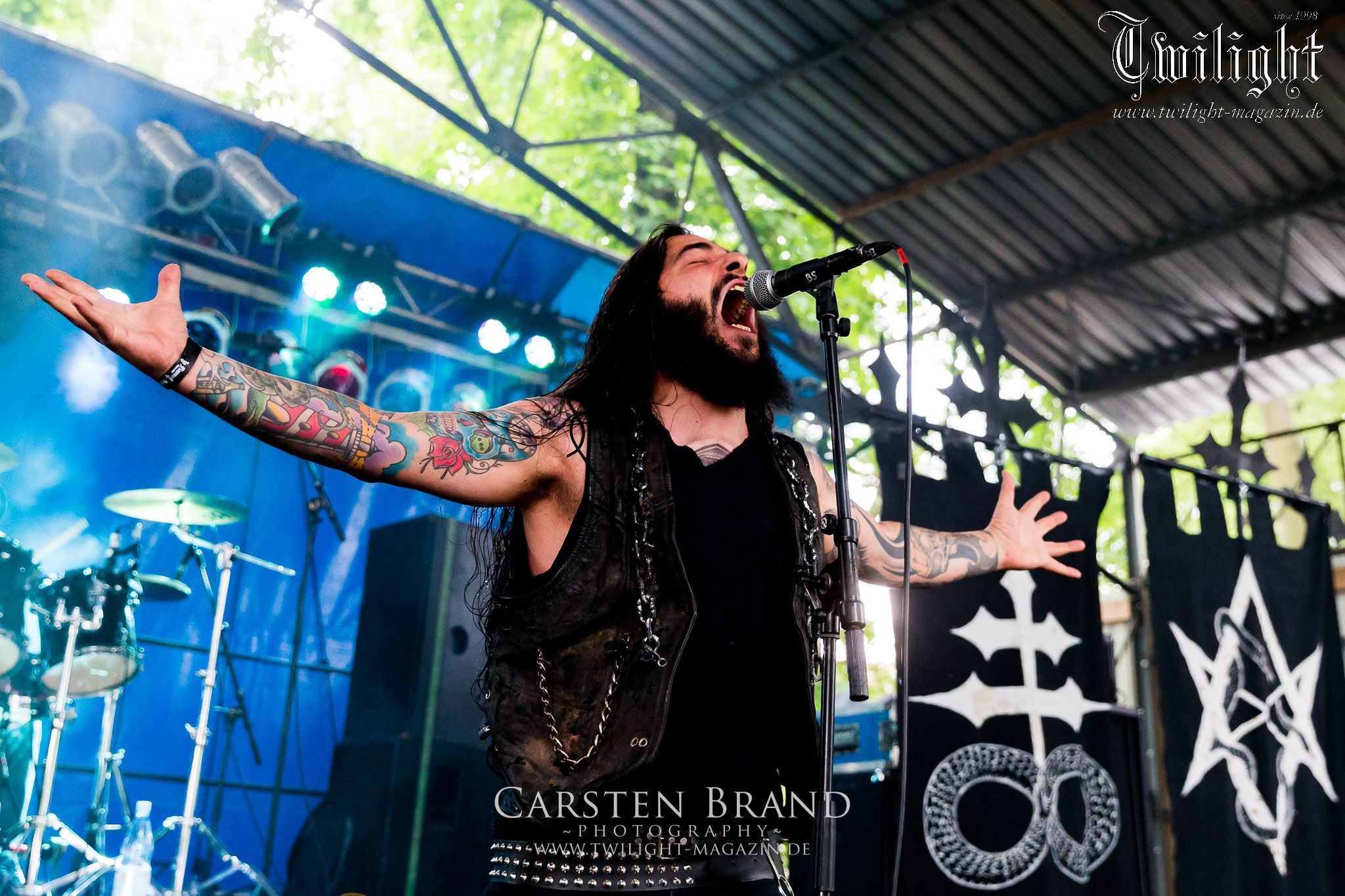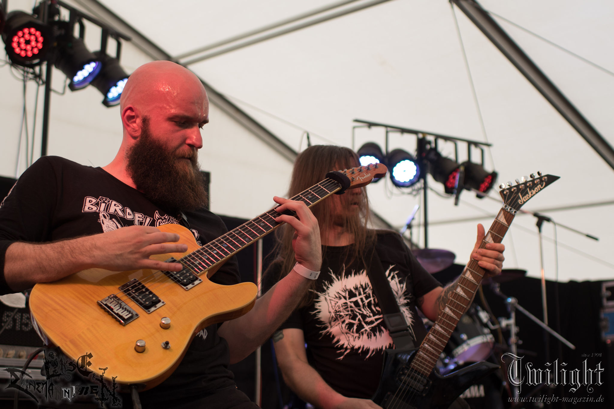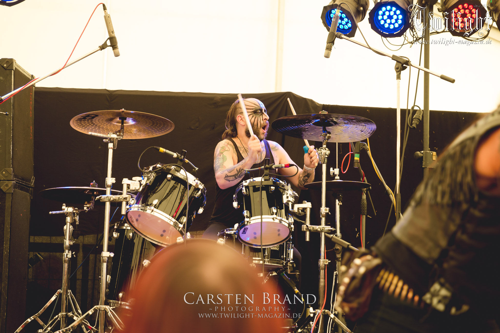 In aller Munde sind zur Zeit 1914 aus der Ukraine, deren Lyric-Video zum Epos "A Hundred Day Offensive" aus dem jüngst veröffentlichten Album "Blind Leading The Blind" in der Szene schon fast viral ging. Dementsprechend ist das Zelt proppenvoll, als die Band ihren Set startet. Während sich die Instrumental-Fraktion uniformiert im Hintergrund hält und ein unbarmherziges musikalisches Trommelfeuer über den Köpfen des Publikums niedergeht, scheint der Sänger direkt aus einem schlammigen Schützengraben der unzähligen Materialschlachten des WK l auferstanden zu sein. Der Mann durchlebt und durchleidet die Geschichten, die er besingt, in beängstigender Art und Weise. Und abgesehen davon, dass ich den Gesang aufgrund der eingeschränkten Variabilität auf dem Album für mich als Schwachpunkt ausgemacht hatte, wächst der Herr, der bei 1914 die Rolle des Oberleutnants Ditmar Kumarberg einnimmt, nicht nur stimmlich über sich hinaus. Konzeptionell ist das, was 1914 auf die Beine stellen zwar nicht sonderlich innovativ aber die Art und Weise, wie sie das vermeintlich abgedroschene Thema Krieg musikalisch umsetzen, ist fesselnd und packend. Noch dazu, weil man hier die Anhänger von Asphyx, God Dethroned, Bolt Thrower und Deinonychus gleichermaßen bedient. Denn genau das ist die Schnittmenge, in der sich 1914 stilistisch bewegen. Nach diesem beeindruckenden Auftritt bin ich gespannt, welche Entwicklung diese Band nehmen wird.