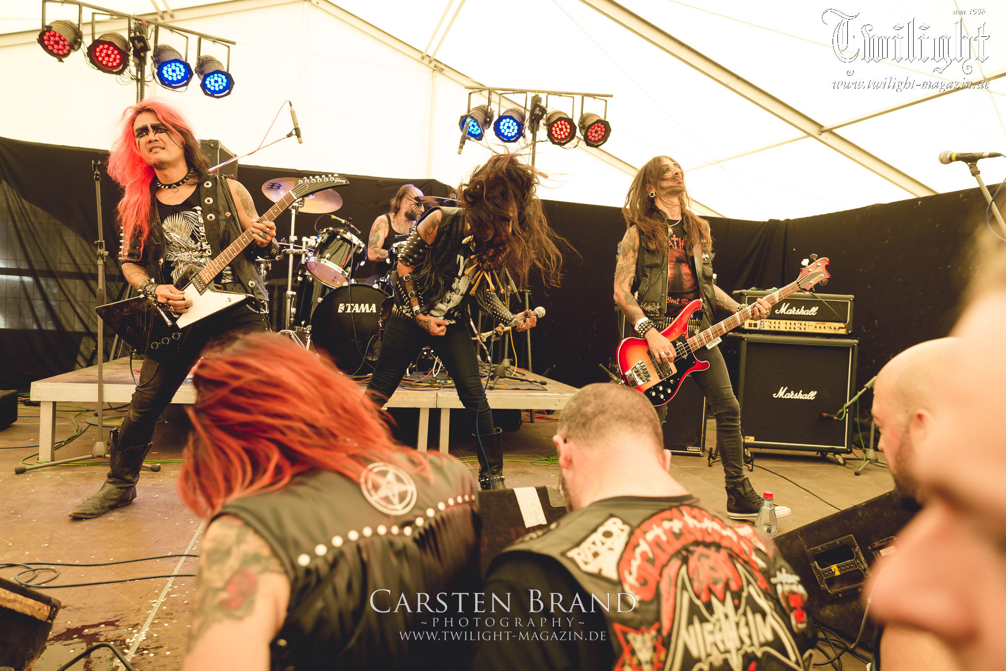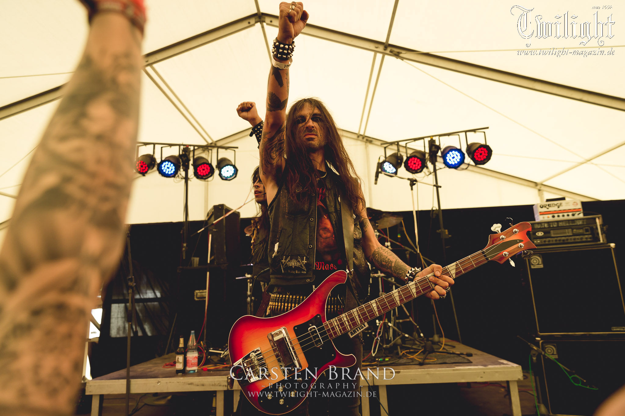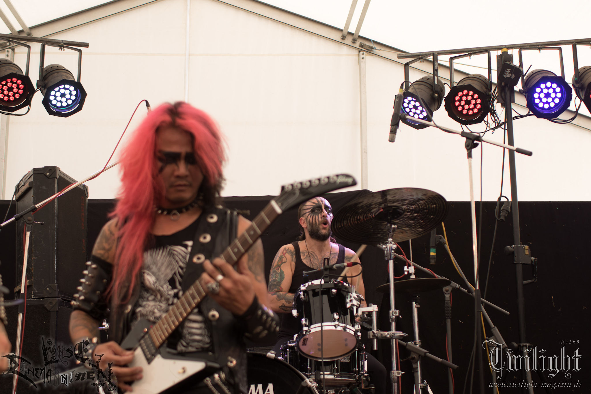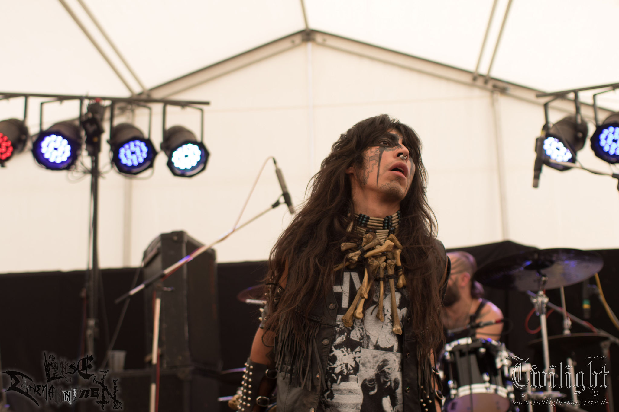 Auch die in Berlin beheimatete multinationale Truppe von INDIAN NIGHTMARE tritt anschließend im Zelt an. Zwar konnte mich das aktuelle Zweitwerk "By Ancient Force" aufgrund des fehlenden Überraschungseffektes des Debuts "Taking Back The Land" bisher noch nicht vollends überzeugen, dennoch ist die Truppe Live in den vergangenen zwei Jahren seit dem Frühschoppen-Auftritt beim Party.San Metal Open Air 2017 live zu einer echten Macht gereift. Die Band legt eine wahnsinnige Spielfreude an den Tag, mit der sie das kultige Gebräu aus Speed, Heavy, Thrash Metal und Punk von der Bühne hinab rotzt. An Pathos wird ebenso wenig gegeizt, wie mit Kritik am gesellschaftlich nicht nur gegenwärtig schiefliegendem Moralsystem. Der Fünfer verkörpert und schwitzt Metal aus jeder Pore. "War Metal Punks", "Betrayers", "Warlords", "Circles Of Fire" oder auch "Set The Spirit Free", um nur eine Auswahl zu nennen, zünden und reißen sofort mit. Hingabe, vor allem aber Leidensbereitschaft zeigt Drummer Lalo, der trotz körperlicher Einschränkungen, die er sich bei einem Hundebiss nur wenige Tage zuvor zugezogen hatte, durch den Gig prügelt. Indian Nightmare sorgen für einmal mehr und nachhaltig für Eindruck.