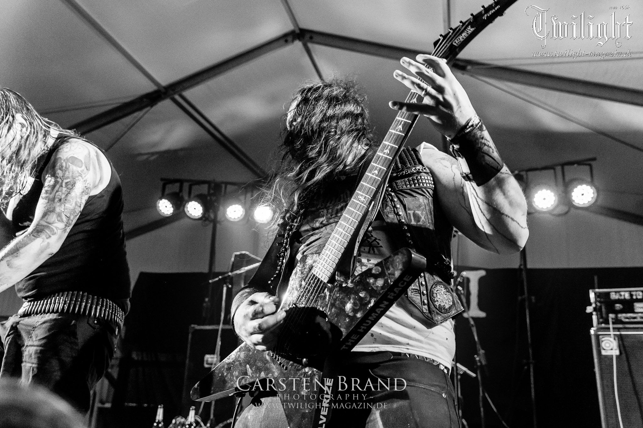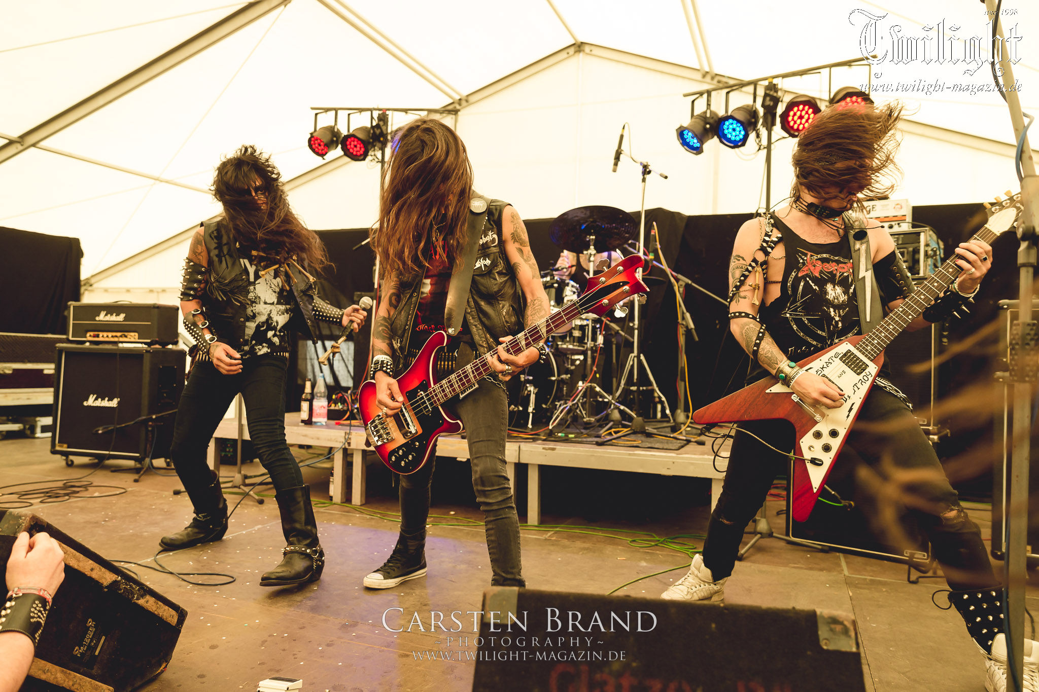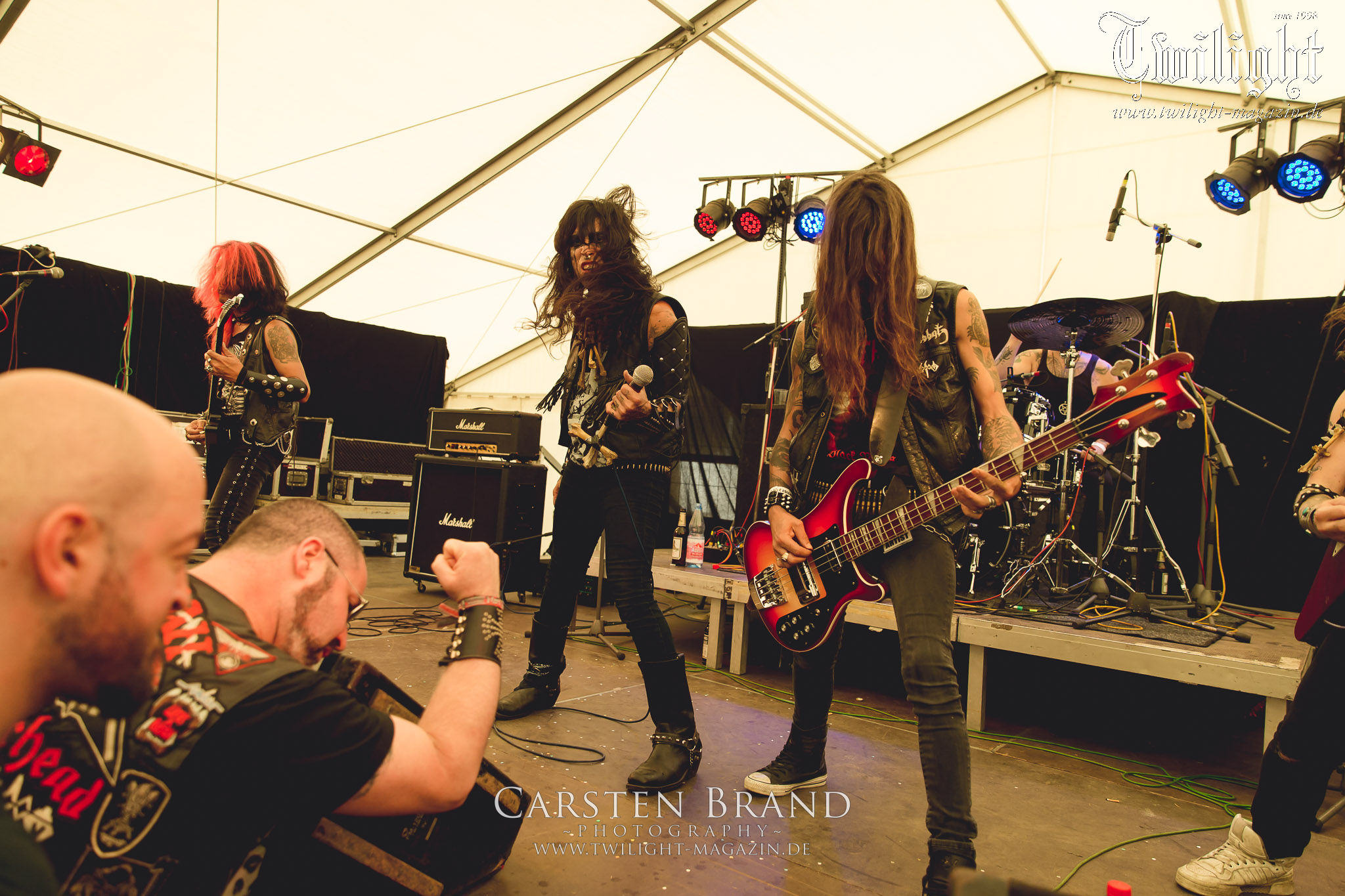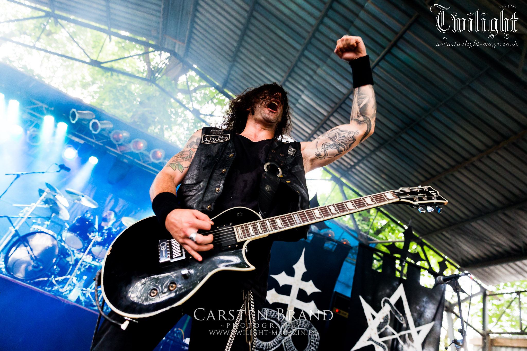 Auch die in Berlin beheimatete multinationale Truppe von INDIAN NIGHTMARE tritt anschließend im Zelt an. Zwar konnte mich das aktuelle Zweitwerk "By Ancient Force" aufgrund des fehlenden Überraschungseffektes des Debuts "Taking Back The Land" bisher noch nicht vollends überzeugen, dennoch ist die Truppe Live in den vergangenen zwei Jahren seit dem Frühschoppen-Auftritt beim Party.San Metal Open Air 2017 live zu einer echten Macht gereift. Die Band legt eine wahnsinnige Spielfreude an den Tag, mit der sie das kultige Gebräu aus Speed, Heavy, Thrash Metal und Punk von der Bühne hinab rotzt. An Pathos wird ebenso wenig gegeizt, wie mit Kritik am gesellschaftlich nicht nur gegenwärtig schiefliegendem Moralsystem. Der Fünfer verkörpert und schwitzt Metal aus jeder Pore. "War Metal Punks", "Betrayers", "Warlords", "Circles Of Fire" oder auch "Set The Spirit Free", um nur eine Auswahl zu nennen, zünden und reißen sofort mit. Hingabe, vor allem aber Leidensbereitschaft zeigt Drummer Lalo, der trotz körperlicher Einschränkungen, die er sich bei einem Hundebiss nur wenige Tage zuvor zugezogen hatte, durch den Gig prügelt. Indian Nightmare sorgen für einmal mehr und nachhaltig für Eindruck.