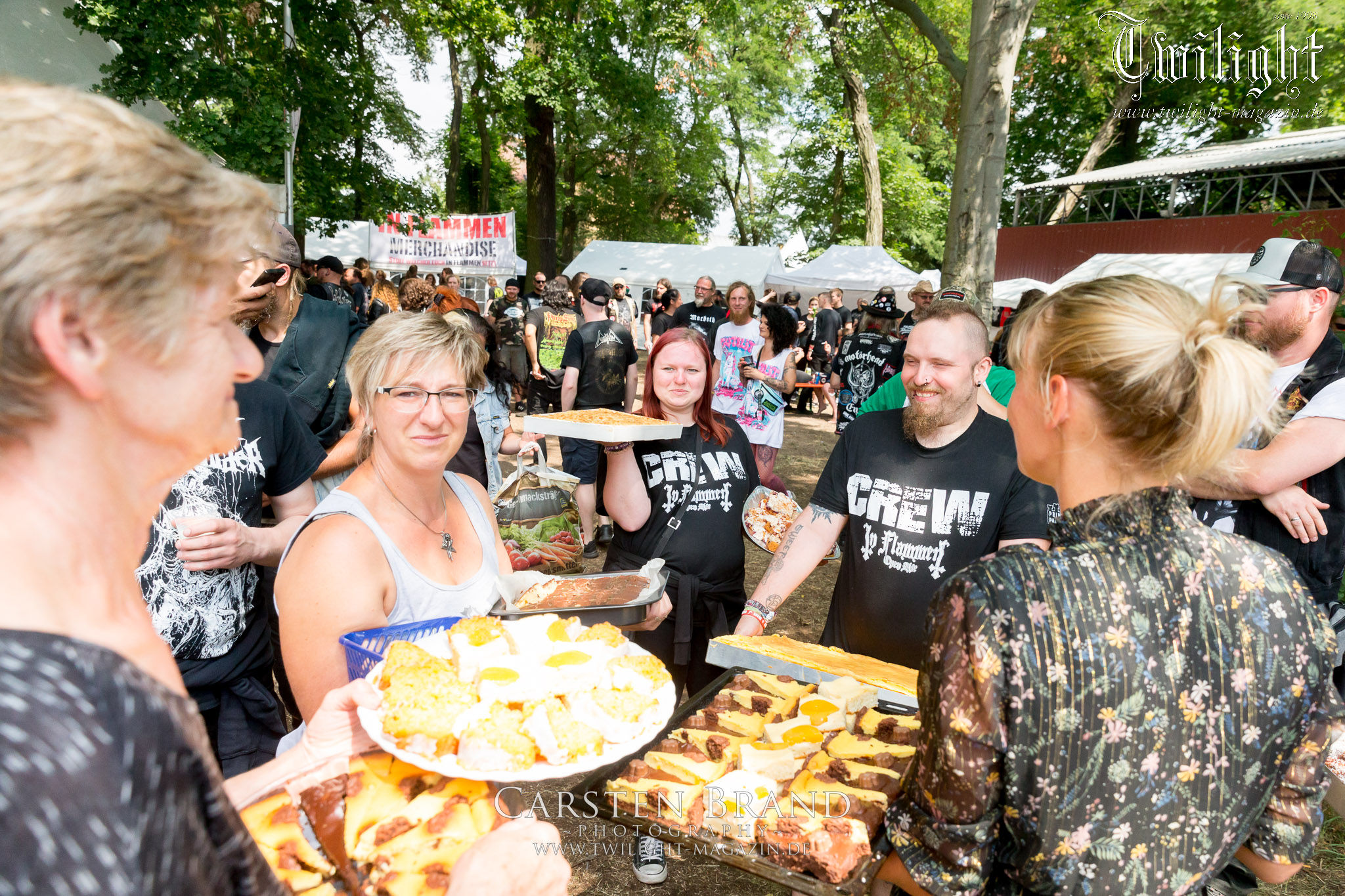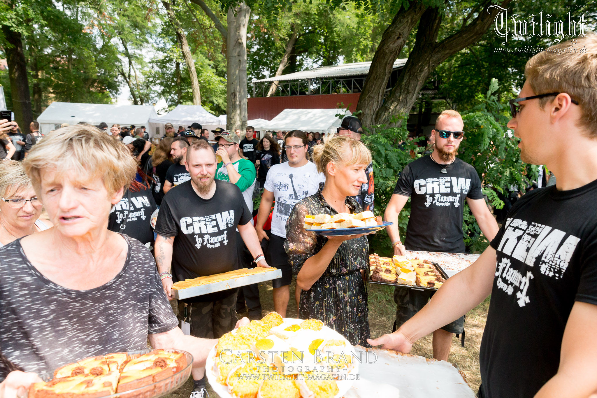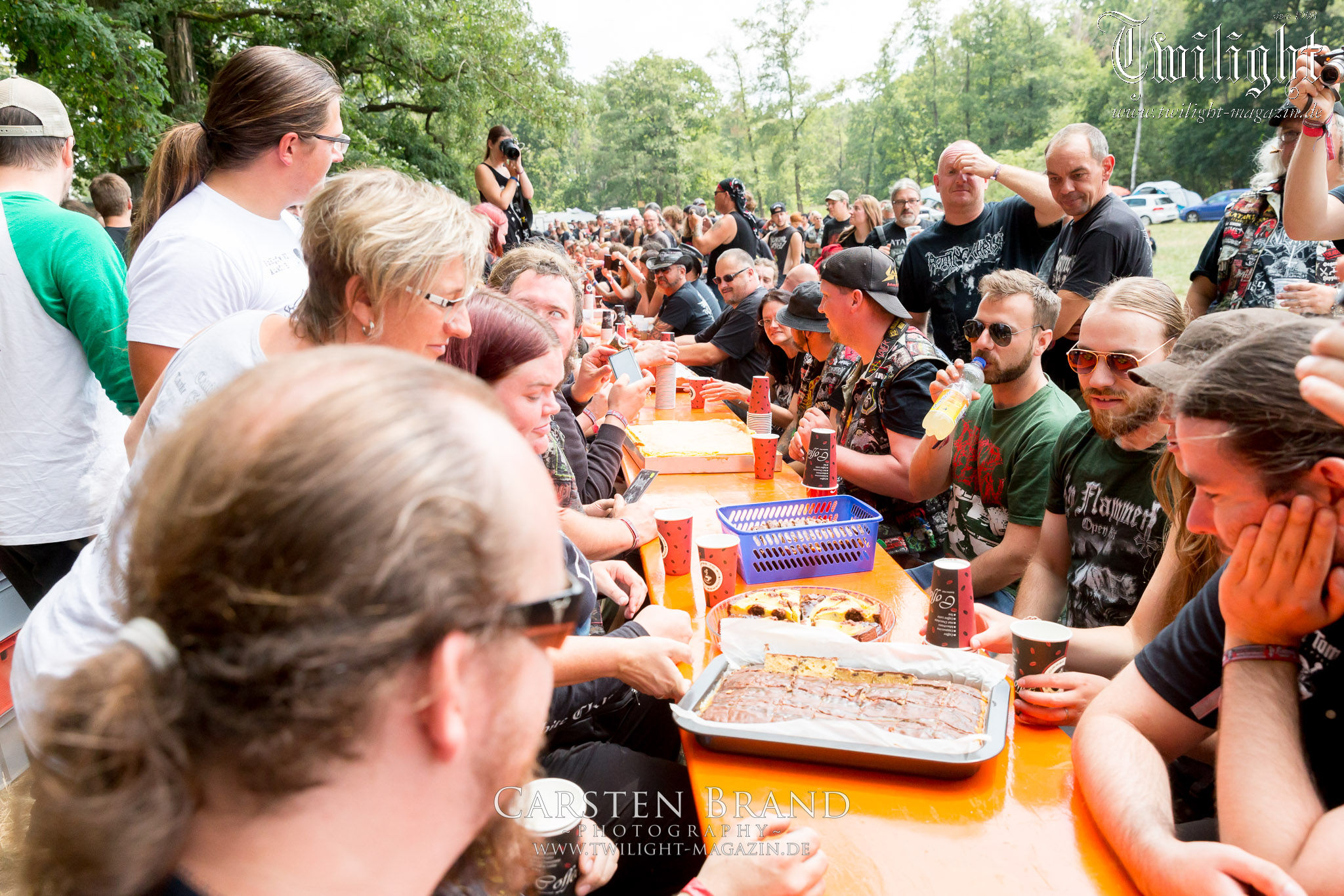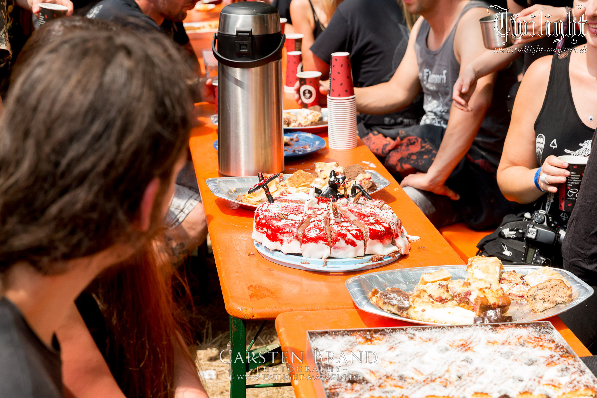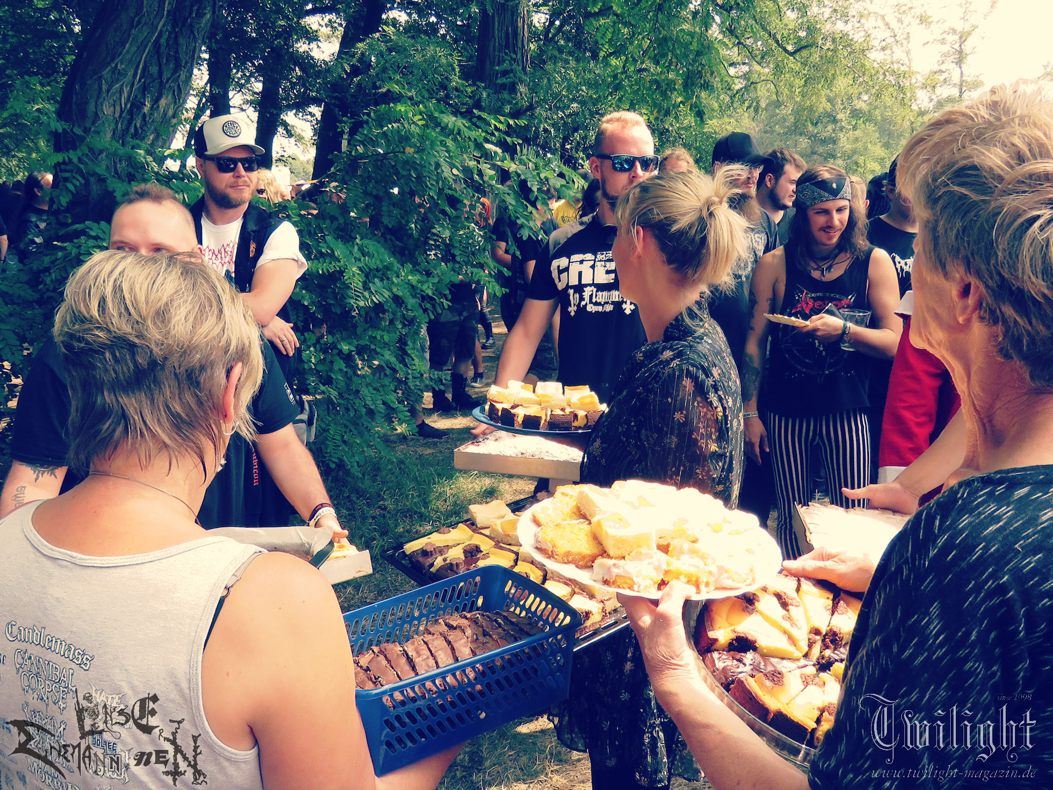 Mittlerweile ist nicht nur die Sonne am Horizont wieder aktiv, sondern die lange Kuchentafel bereits aufgebaut und man muss sich einmal mehr ranhalten, wenn man denn einen Platz an der Tafel ergattern möchte. Dennoch hat jeder die Chance auf einen Kaffee und ein Stück der begehrten, hausgemachten Backwaren. Erneut haben Veranstalter, Crew, Sponsoren und sonstige Helfer alle Register an den heimischen Backöfen gezogen. In diesen Momenten zeigt sich die Einzigartigkeit dieses "Rituals", bei dem es auf der überwiegend lauten Gartenparty ruhig und geradezu andächtig, wenn auch nicht weniger ausgelassen wird. Hier wird die Essenz des IN FLAMMEN OPEN AIR zelebriert.