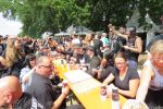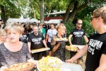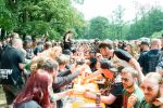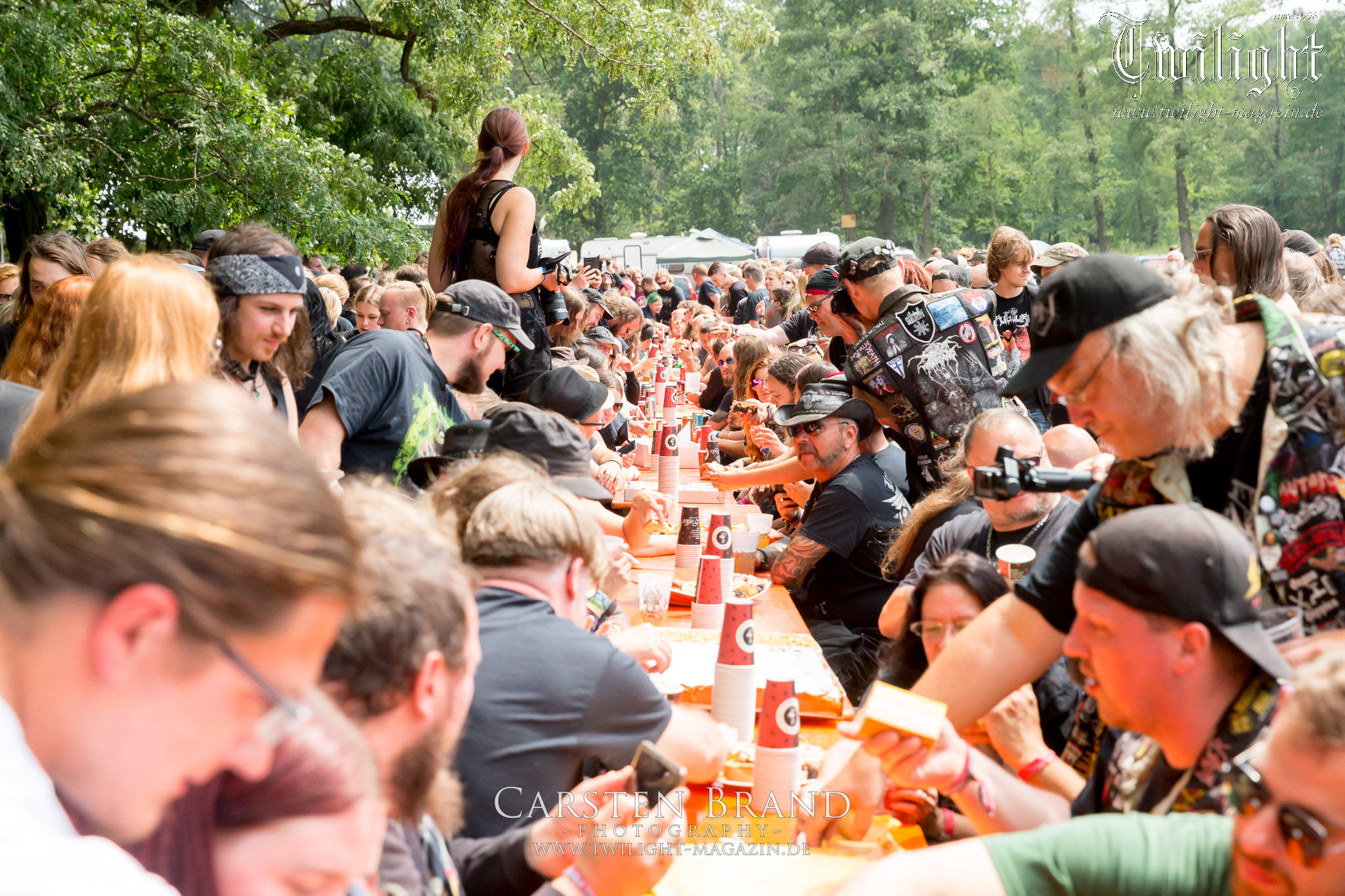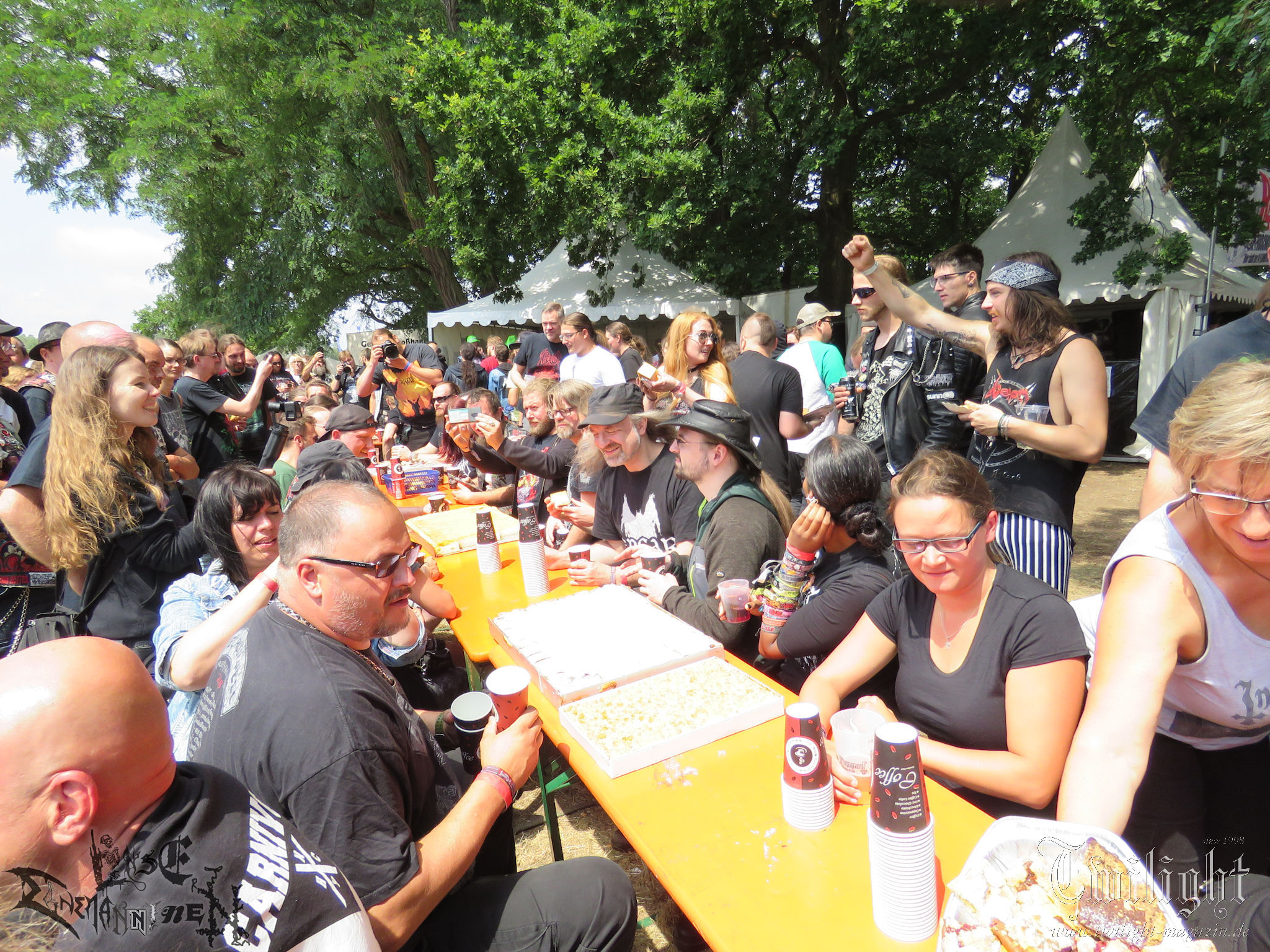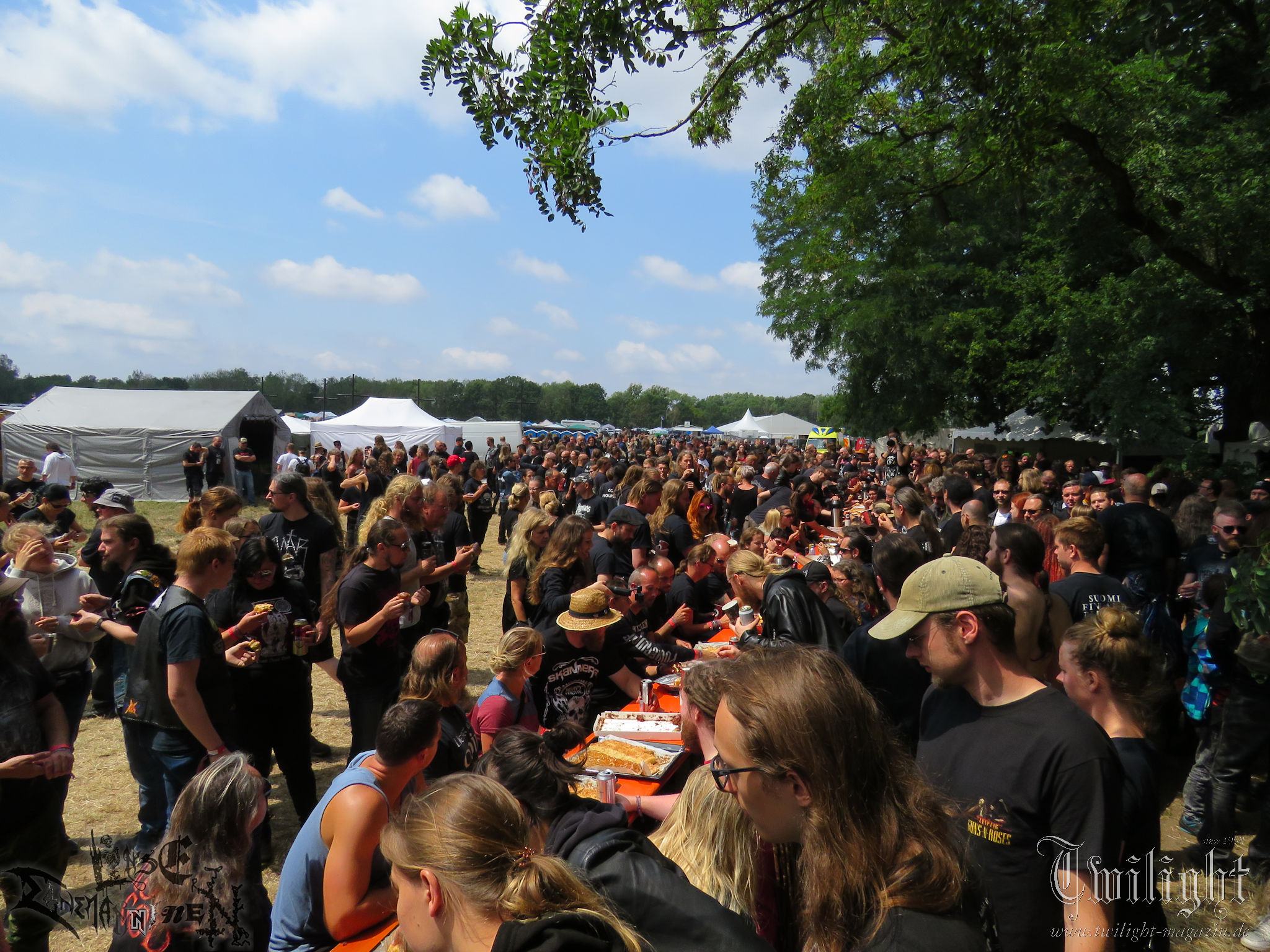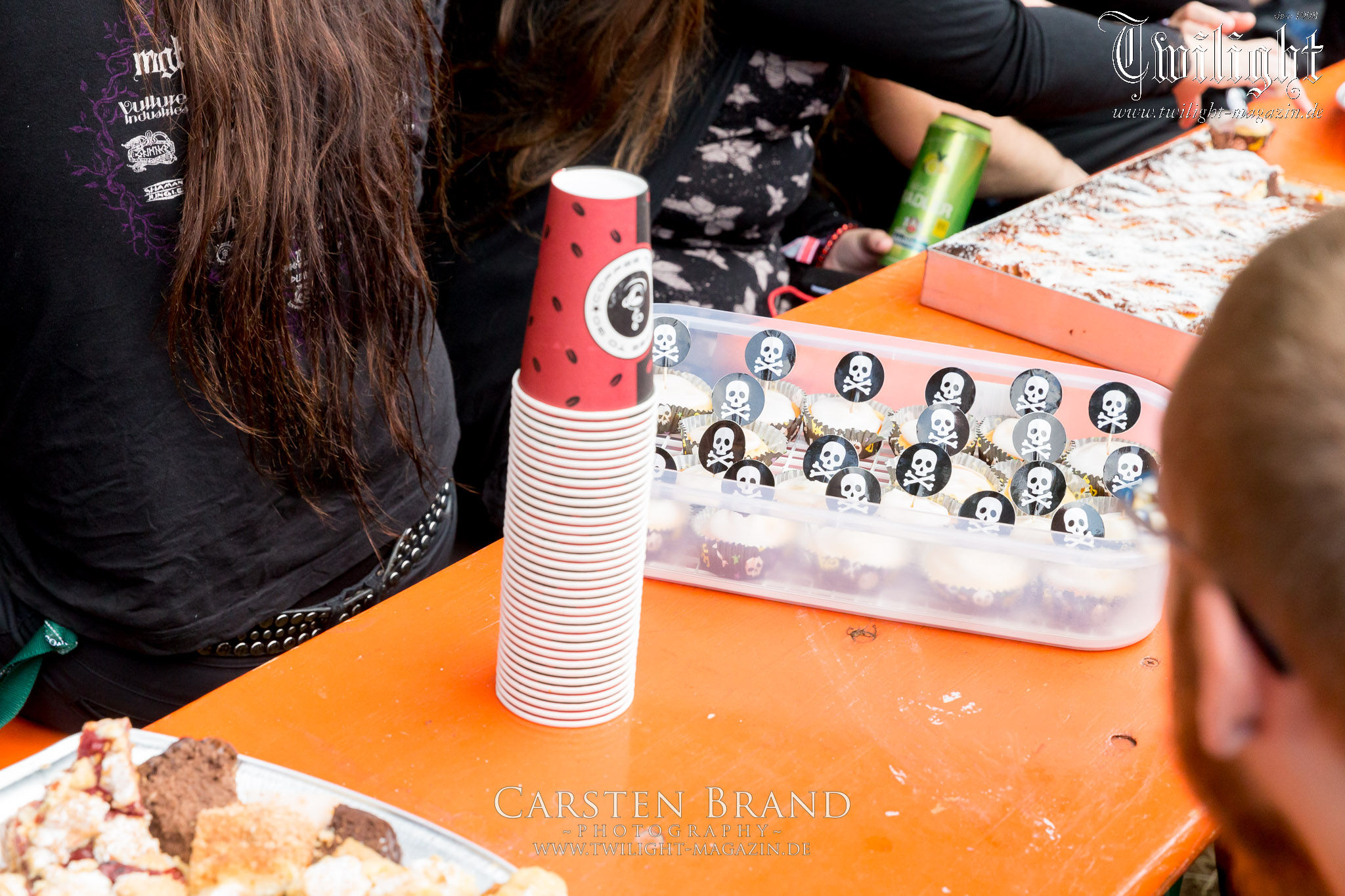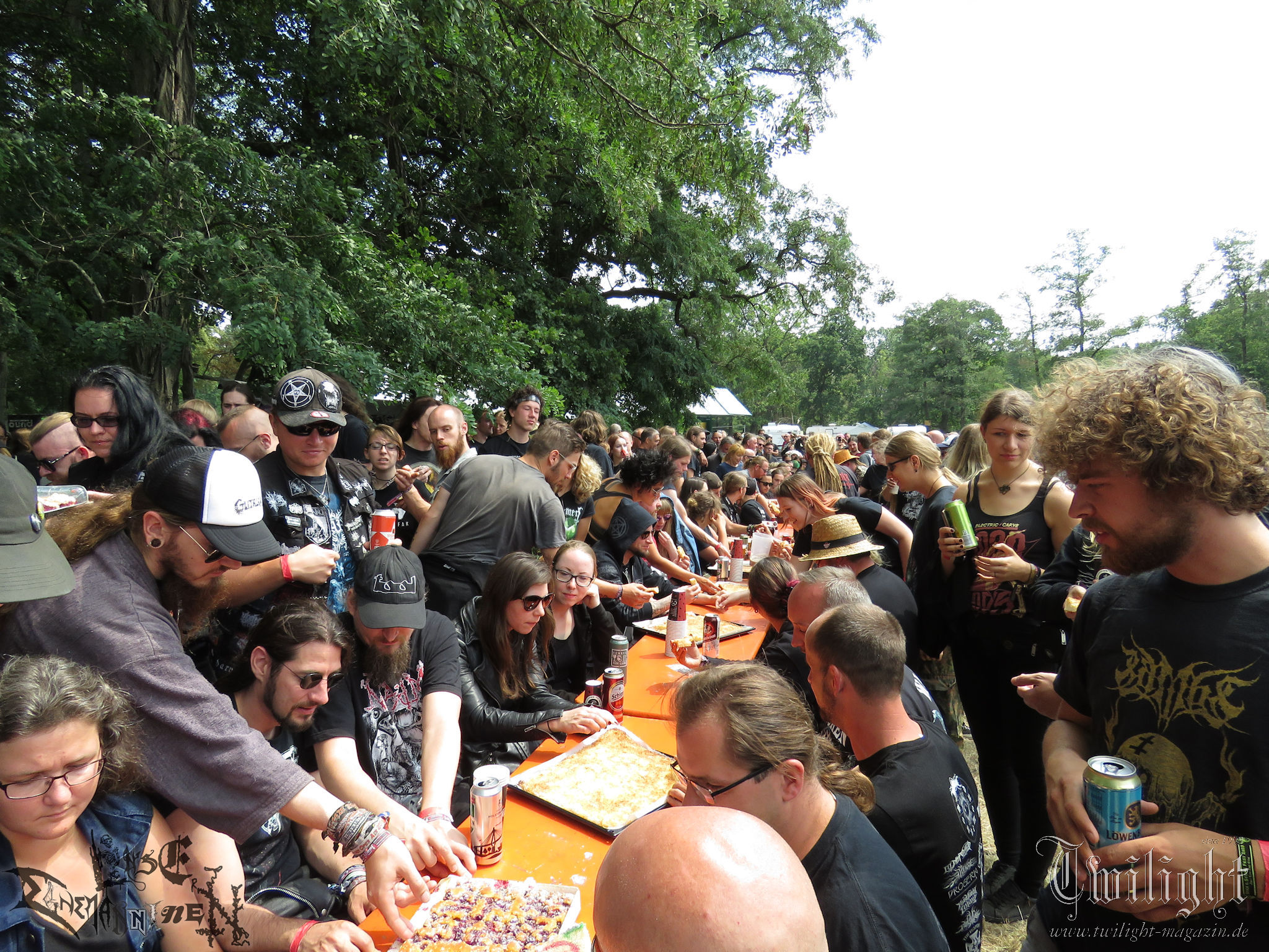 Mittlerweile ist nicht nur die Sonne am Horizont wieder aktiv, sondern die lange Kuchentafel bereits aufgebaut und man muss sich einmal mehr ranhalten, wenn man denn einen Platz an der Tafel ergattern möchte. Dennoch hat jeder die Chance auf einen Kaffee und ein Stück der begehrten, hausgemachten Backwaren. Erneut haben Veranstalter, Crew, Sponsoren und sonstige Helfer alle Register an den heimischen Backöfen gezogen. In diesen Momenten zeigt sich die Einzigartigkeit dieses "Rituals", bei dem es auf der überwiegend lauten Gartenparty ruhig und geradezu andächtig, wenn auch nicht weniger ausgelassen wird. Hier wird die Essenz des IN FLAMMEN OPEN AIR zelebriert.